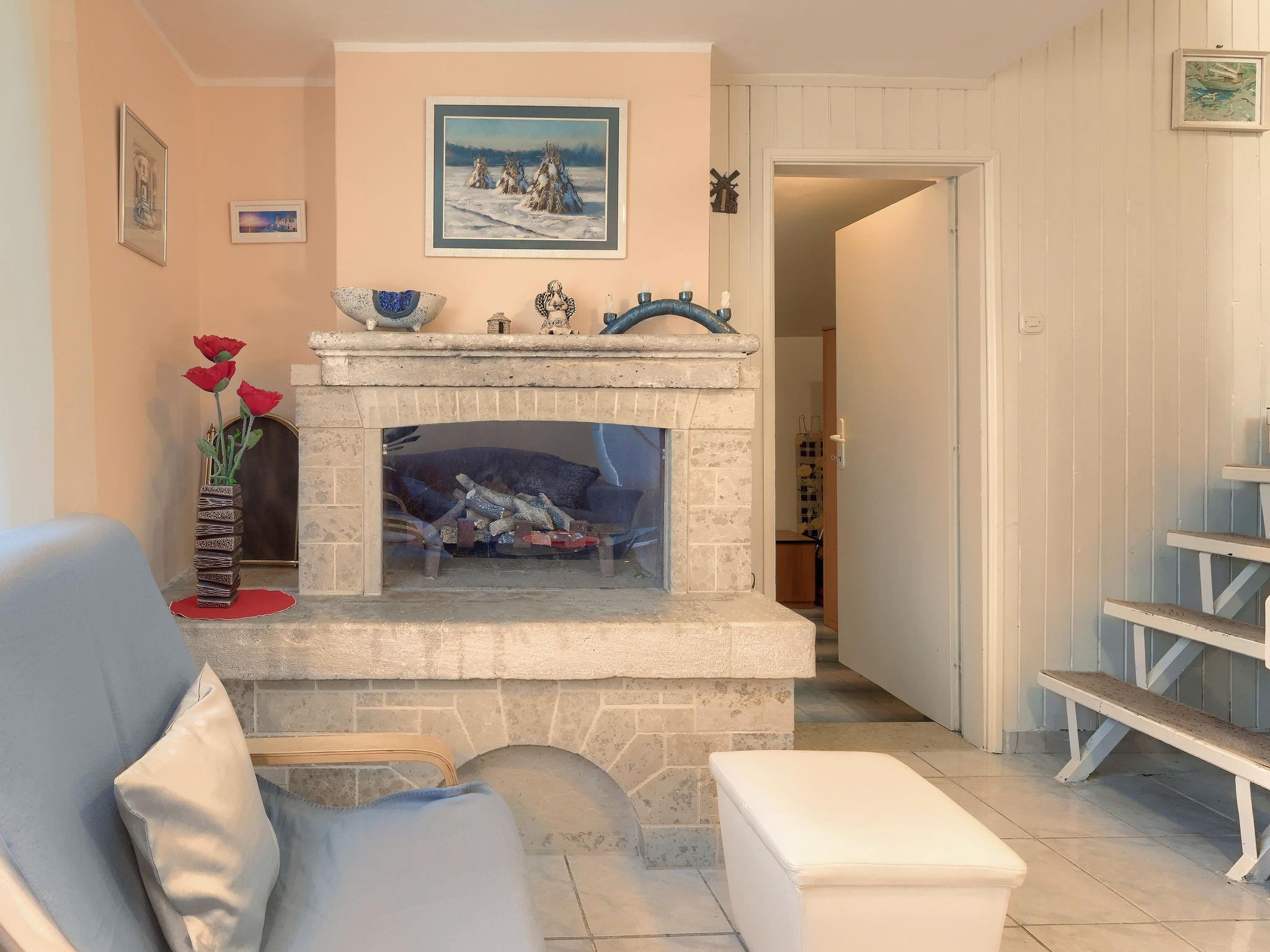 3-room house 60 m2 on 2 levels. Living/dining room with open-hearth fireplace (only for decoration), satellite TV (flat screen), DVD. Open kitchen (2 hot plates, oven, dishwasher, 2 gas rings, toaster, kettle, freezer, electric coffee machine). Shower/WC. Upper floor: entrance hall, ceiling height 185 cm with air conditioning. 2 rooms with sloping ceilings, ceiling height 120 - 185 cm, each room with 2 beds. No heating option. 2 terraces. Terrace furniture, deck chairs, box-room. Facilities: iron. Internet (WiFi, free). Please note: non-smoking house. Maximum 1 small pet/ dog allowed.