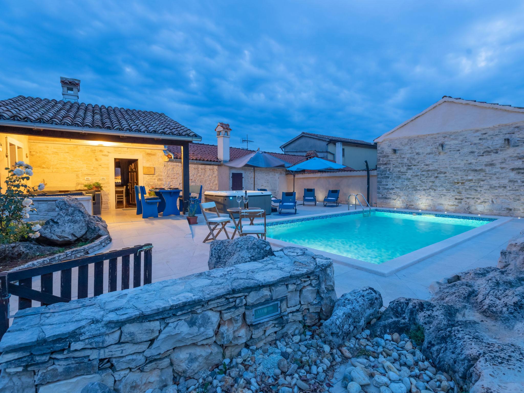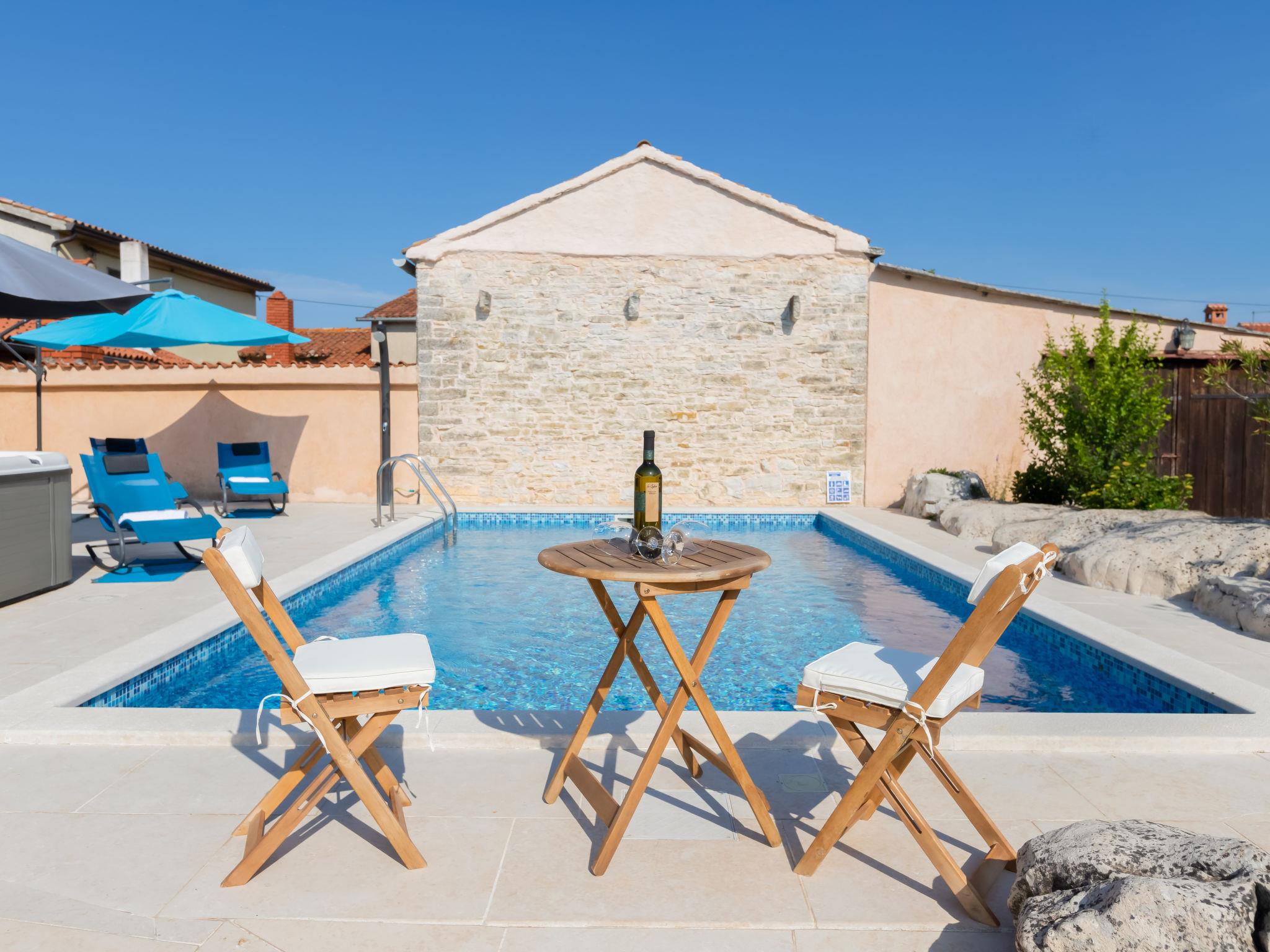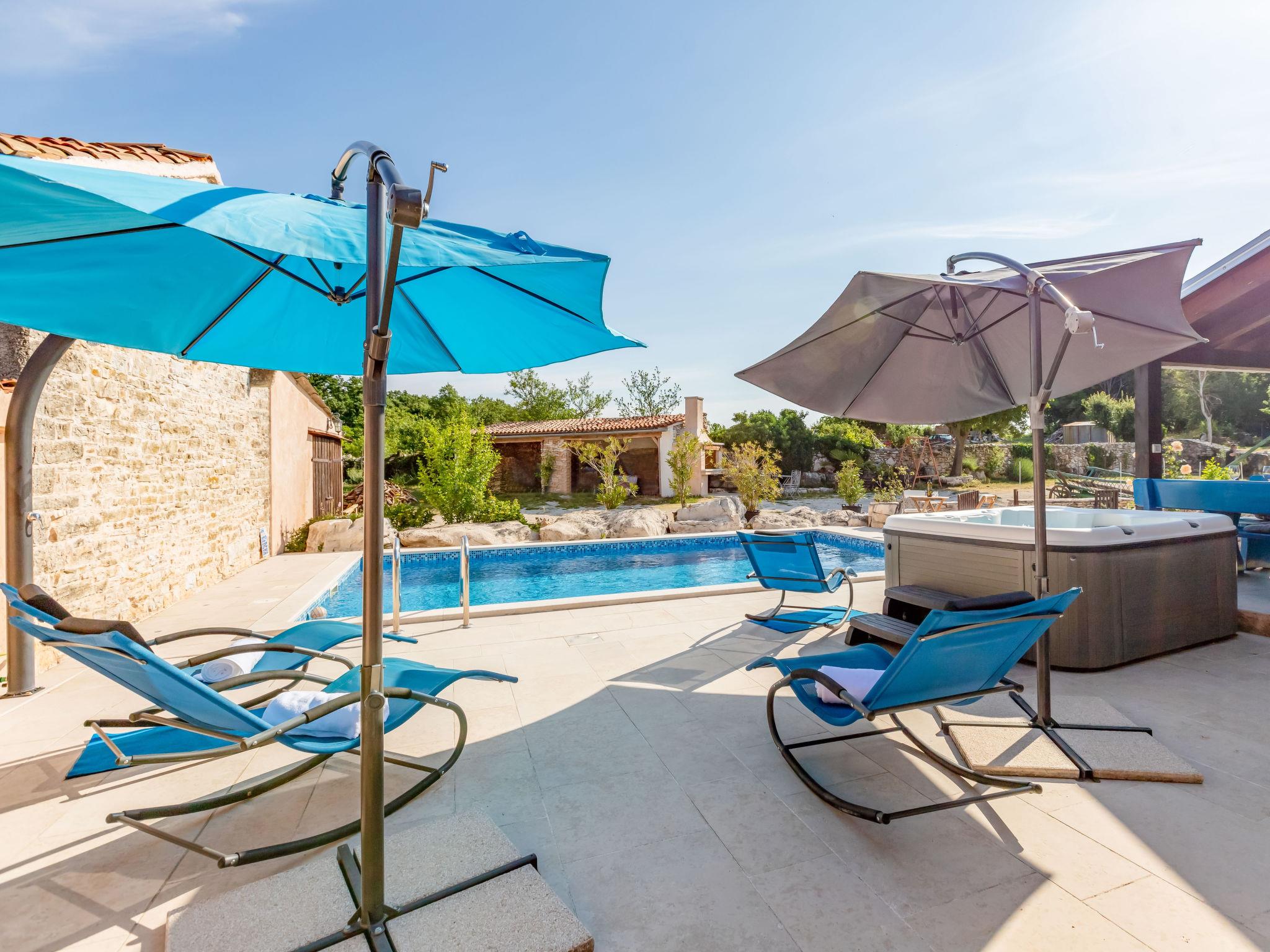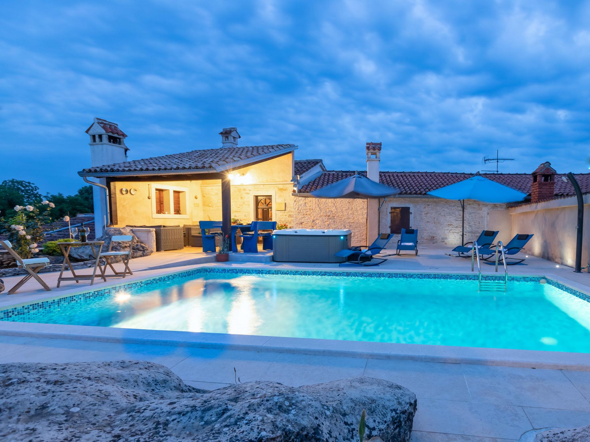 2-family house "Botra Maria". In the hamlet Gljušcici 7 km from the centre of Žminj, 25 km from the centre of Rovinj, 25 km from the sea. Private: property 1'000 m2 with wildlife garden, swimming pool angular (8 x 4 m, depth 135 cm, seasonal availability: 01.May. - 30.Sep.). Outdoor shower, hot tub, barbecue. In the house: internet access. Parking (for 3 cars) at the house on the premises. Shop 600 m, supermarket 1 km, bus stop 6.1 km, pebble beach 25 km, rocky beach 25 km. Marina 25 km. Please note: airfield 45 km from the property. Owner's tennis court with floodlights 200 m from the house (on request, extra).