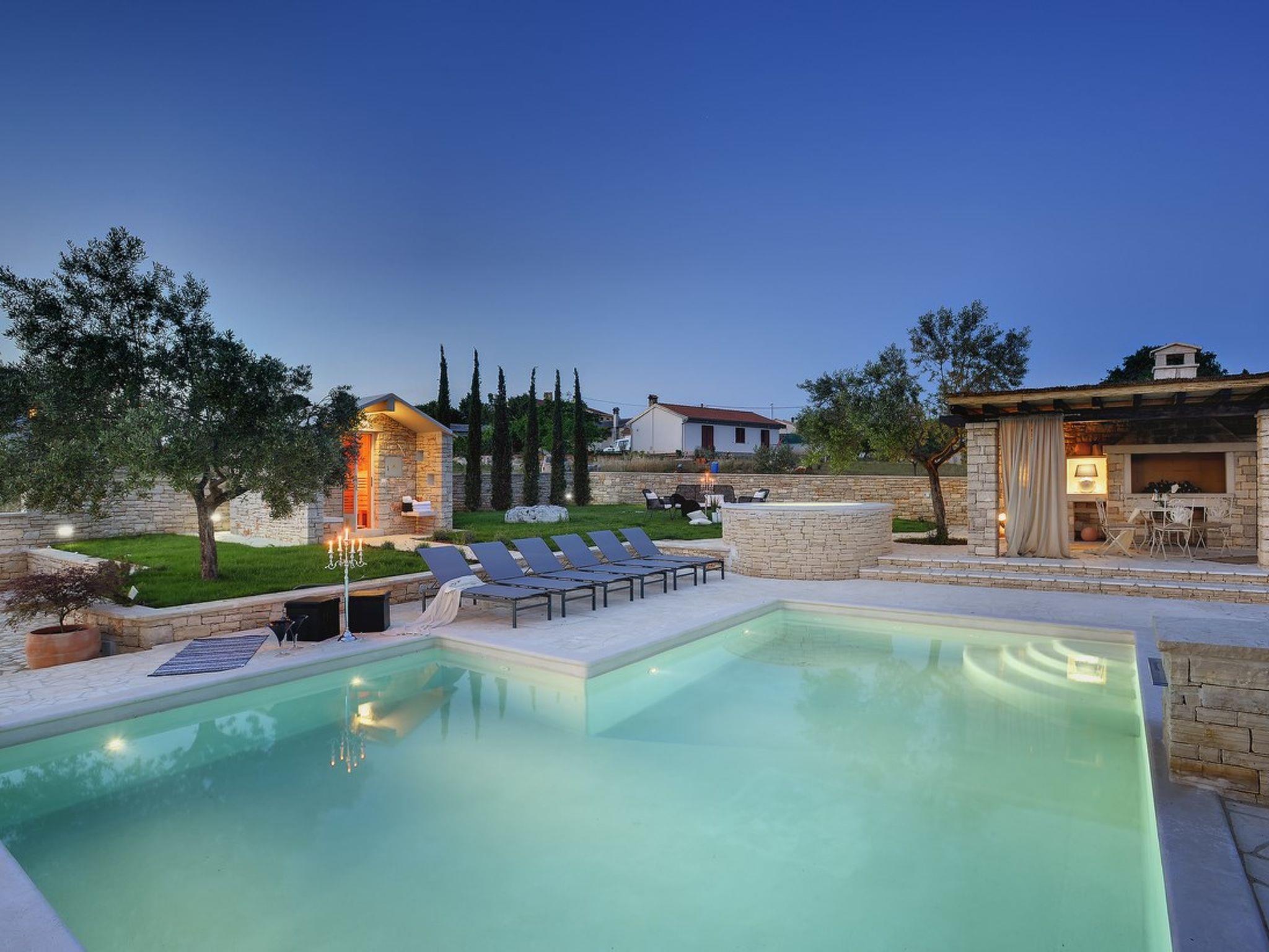 The name says it all, in fact Villa Paradiso is where you'll feel just like you're in heaven. This wonderful villa, located in Rovinjsko Selo, about 6 kilometers away from the enchanting town of Rovinj, is the perfect combination between glamour and comfort. Its classy design and full equipment will boost the quality of your vacation to the top. As soon as you enter the beautiful garden that surrounds the house you'll notice the spacious pool which is also heated, next to it you'll find a spot for relaxation with a jacuzzi and sauna, as well as a nice stone sun terrace with deck chairs where you can enjoy a glass of Istrian wine while you read your favourite book. There are also two nice covered terraces, each with barbecue, table and chairs where you can enjoy tasteful grilled meals. The interior is as magnificent as the outer part. It develops over two floors and it is characterized by the very fashionable design that dominates each room. On the ground floor there is the kitchen, living and dining room and a bathroom, while the upper floor features three bedrooms and a bathroom. Just beside the pool, there is a small stone house where the 4th bedroom and bathroom are located. It is perfect for those who want extra privacy and yet stay close to the family and friends with which they are on vacation. An additional advantage is that you jump into the pool directly after waking up! Villa Paradiso is available for rent all year around, and is especially nice to be booked in spring or autumn, when the cities are not so crowded with tourists and you can peacefully enjoy the charm of the beautiful Istrian cities or just relax in your own little heaven and enjoy the perks of a heated pool, jacuzzi and sauna. Use of the heated pool is possible upon request; water temperature up to 25 °C. A charger for an electric car is also available free of charge. So don't hesitate any longer and book your stay in the marvellous Villa Paradiso in Rovinjsko Selo and experience a vacation you'll never forget!