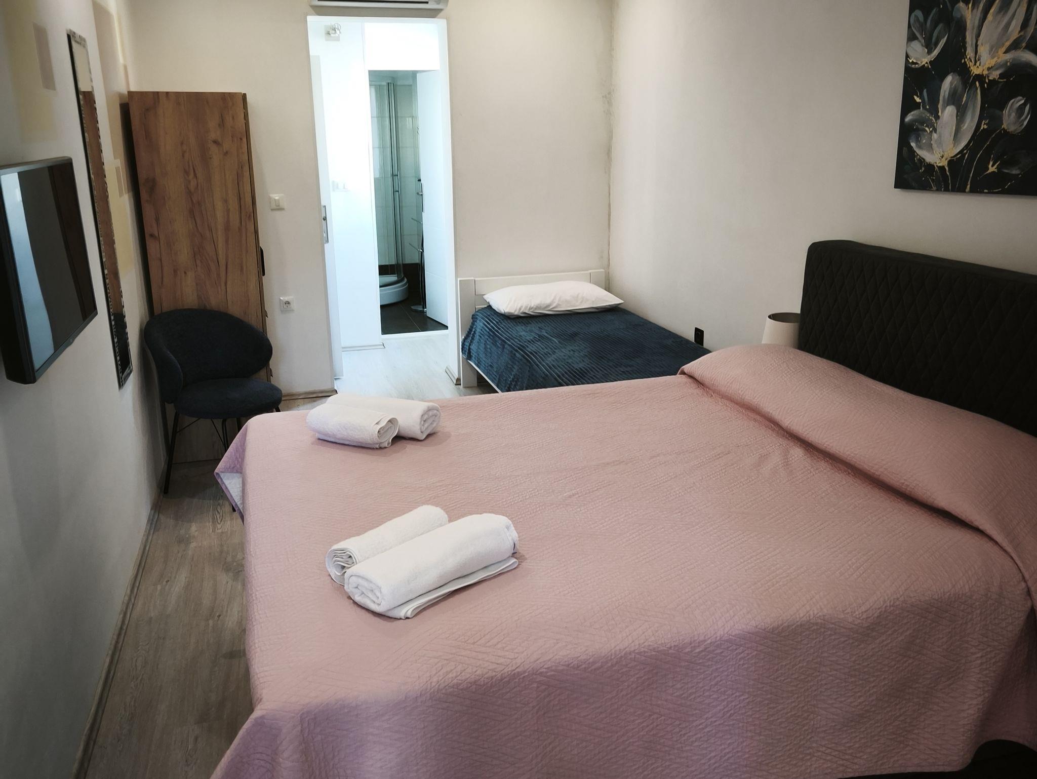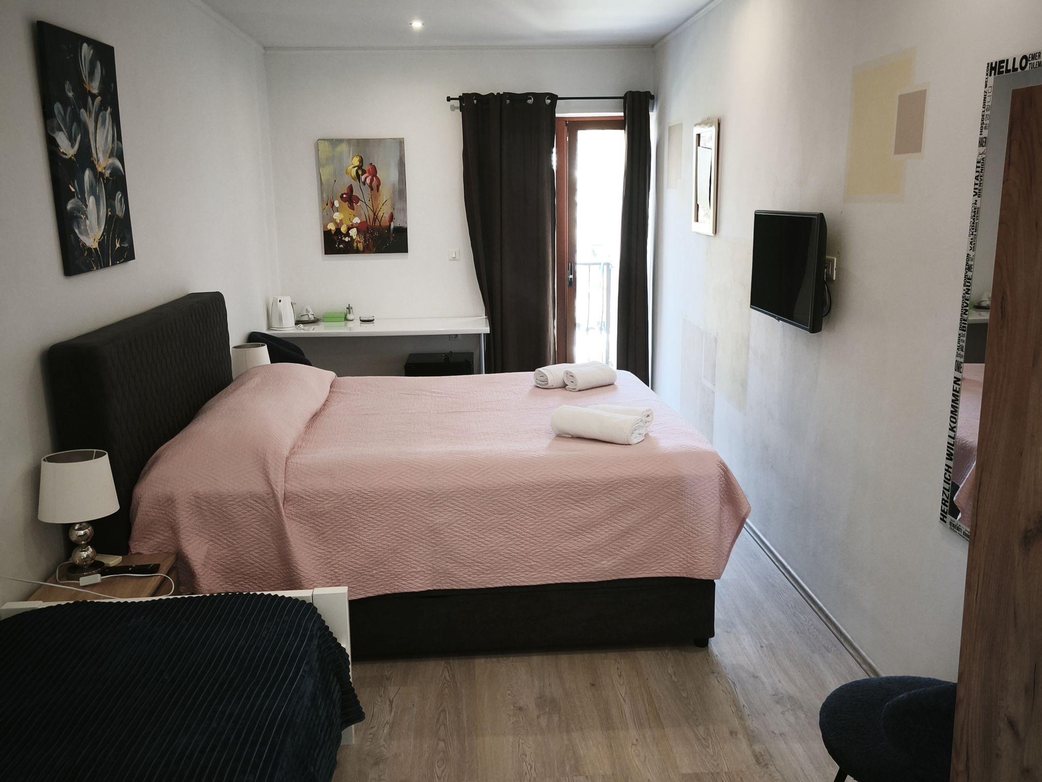 Zimmer bietet Platz für 3 Gäste. Die Betten sind in Schlafzimmern, die es 1 gibt, innerhalb einer Gesamtfläche von 27m2, angeordnet. Die Gäste haben einen eigenen Balkon zur Verfügung, auf der sie in warmen Sommernächten genießen können. In der Unterkunftseinheit besteht die Möglichkeit des Mitbringens von Haustieren gegen Aufpreis. Die reservierte Unterkunftseinheit ist ein Zimmer mit eigenem Badezimmer ohne die Möglichkeit der Nutzung einer Küche. IM PREIS INBEGRIFFEN: Kurtaxe, Frühstück, Endreinigung, Klimatisierung, Parkplatz, Internet, Föhn. UNVERBINDLICHE ZUSÄTZLICHE KOSTEN: Haustiere (10,00 € pro Nacht). Die Verfügbarkeit zusätzlicher Dienstleistungen in Ihrem reservierten Termin und die Preise derselben (falls nicht aufgeführt) müssen im Voraus überprüft werden. Zusätzliche Dienstleistungen die in der Zahlungsaufforderung nicht aufgeführt sind werden direkt beim Vermieter bezahlt, angenommen der Gast nutzt auch diese. Ermäßigung auf den Grundpreis: Gratistag 14=13 (bei einem Aufenthalt von 14 Tagen oder mehr erhalten Sie einen Gratistag für den Aufenthalt bis 31.12.26).