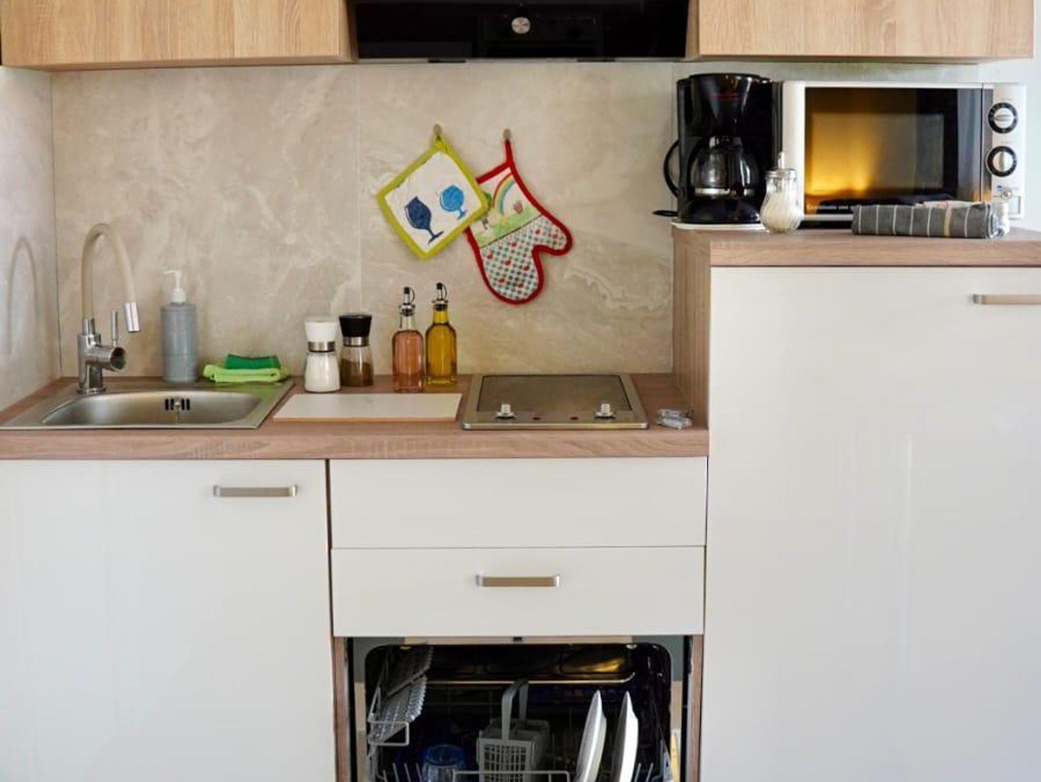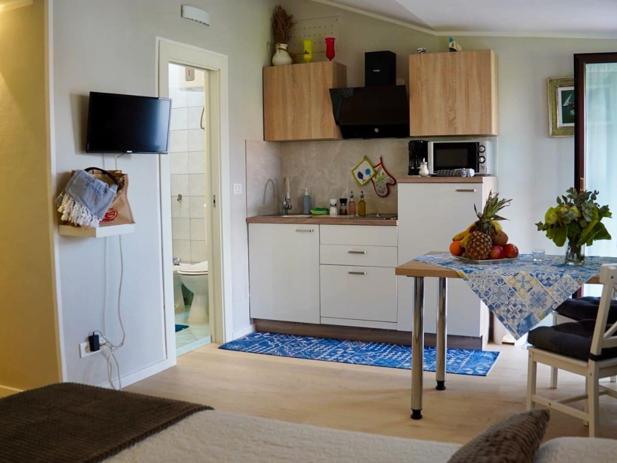 Studio bietet Platz für 2 Gäste. Die Betten sind in Schlafzimmern, die es 1 gibt, innerhalb einer Gesamtfläche von 28m2, angeordnet. Die Gäste haben eine eigene Terrasse zur Verfügung, auf der sie in warmen Sommernächten genießen können. Es ist erlaubt, Speisen auf dem Gemeinschafts-Grill vorzubereiten. In der Unterkunftseinheit besteht die Möglichkeit des Mitbringens von Haustieren gegen Aufpreis. IM PREIS INBEGRIFFEN: Kurtaxe, Endreinigung, Klimatisierung, Internet, Bügeleisen, Bügelbrett, Föhn. VERBINDLICHE ZUSÄTZLICHE KOSTEN: Aufzahlung für Kurzaufenthalte (prozentualer Zuschlag pro Nächtigungsanzahl: 30% - 1, 20% - 2, 10% - 3). UNVERBINDLICHE ZUSÄTZLICHE KOSTEN: Wäschewaschen (5,00 € Waschen), Boot (350,00 € pro Nacht), Haustiere (15,00 € pro Nacht), Fahrrad (12,00 € täglich (pro Stück)). Die Verfügbarkeit zusätzlicher Dienstleistungen in Ihrem reservierten Termin und die Preise derselben (falls nicht aufgeführt) müssen im Voraus überprüft werden. Zusätzliche Dienstleistungen die in der Zahlungsaufforderung nicht aufgeführt sind werden direkt beim Vermieter bezahlt, angenommen der Gast nutzt auch diese.