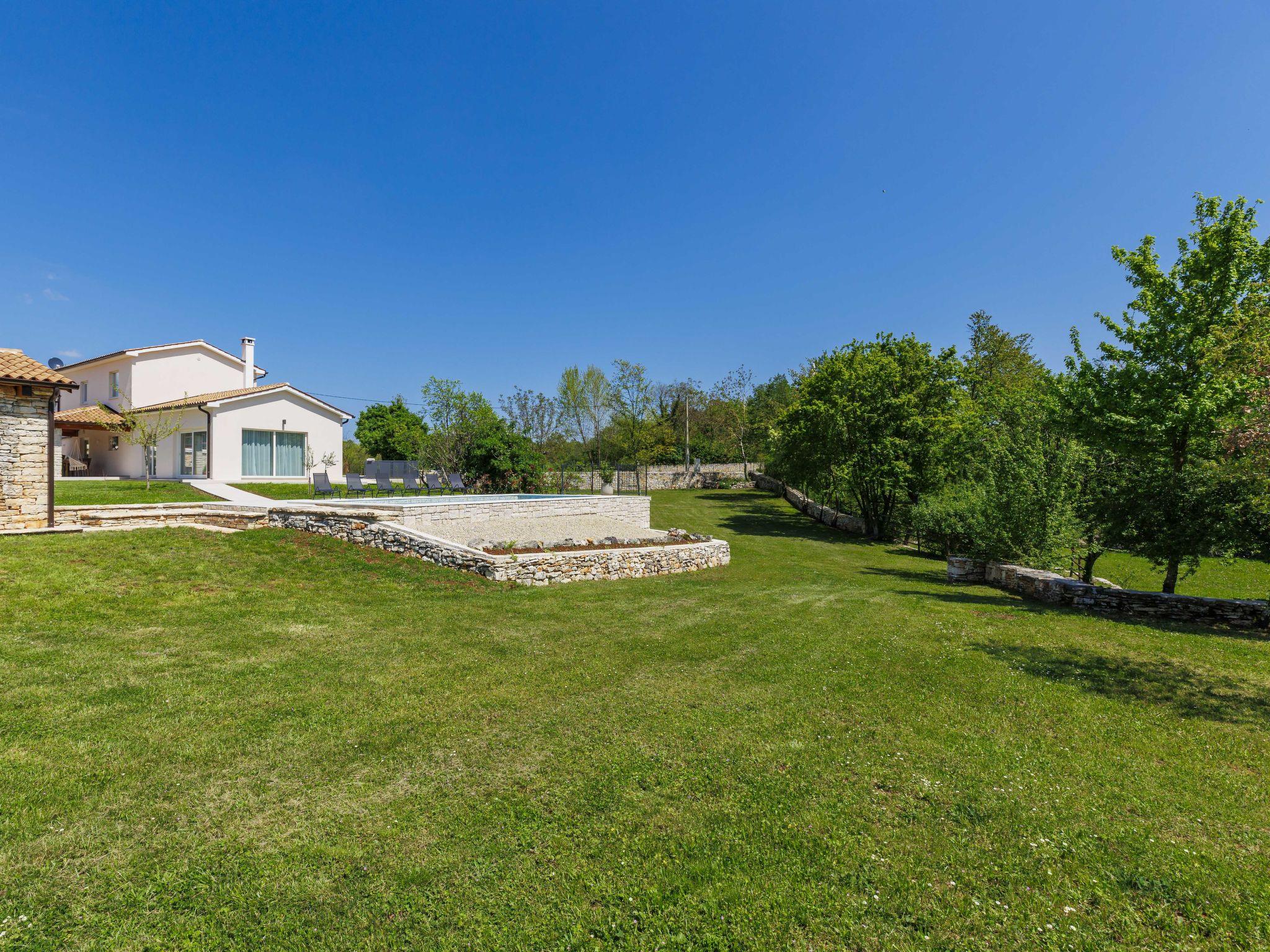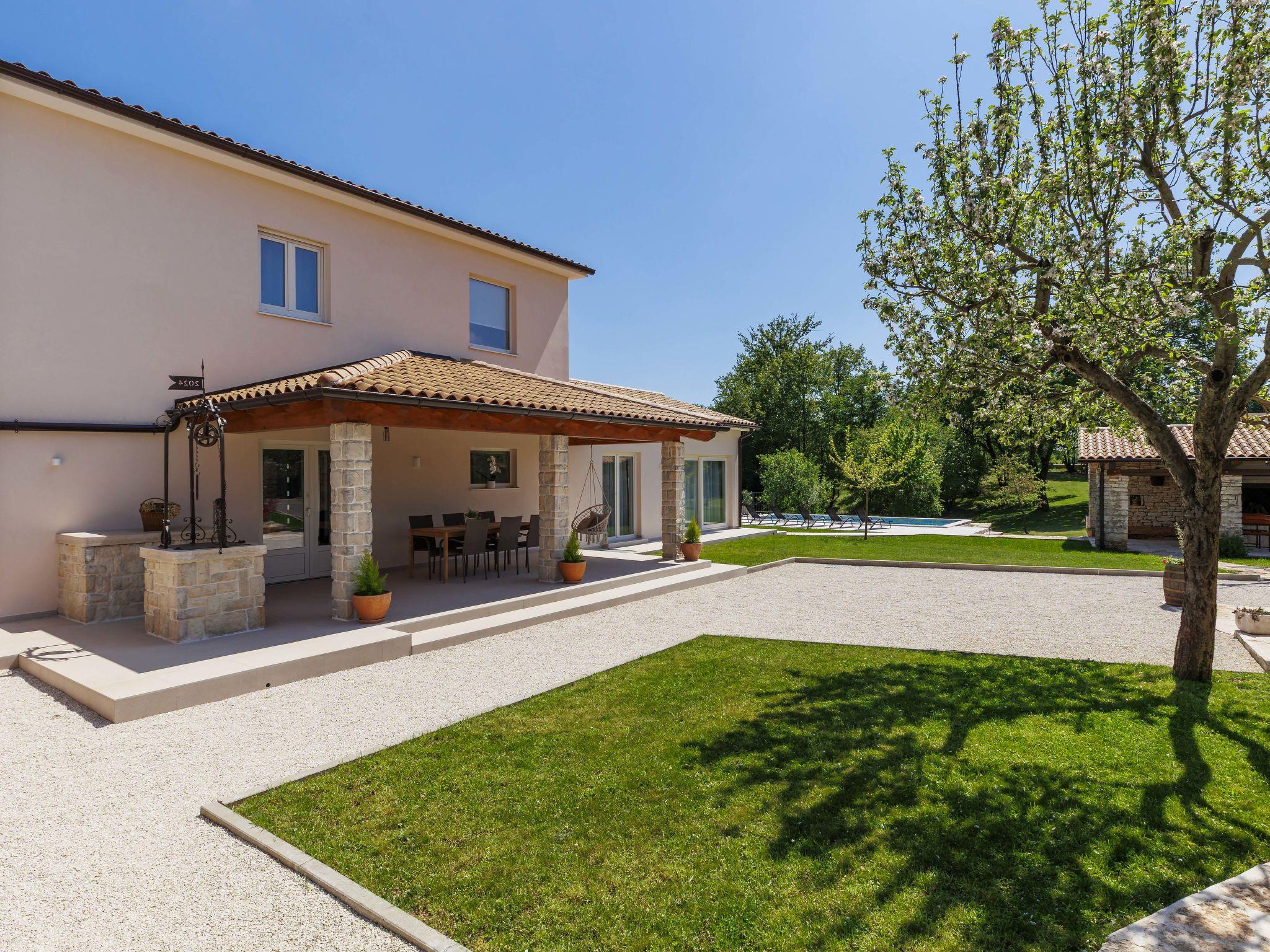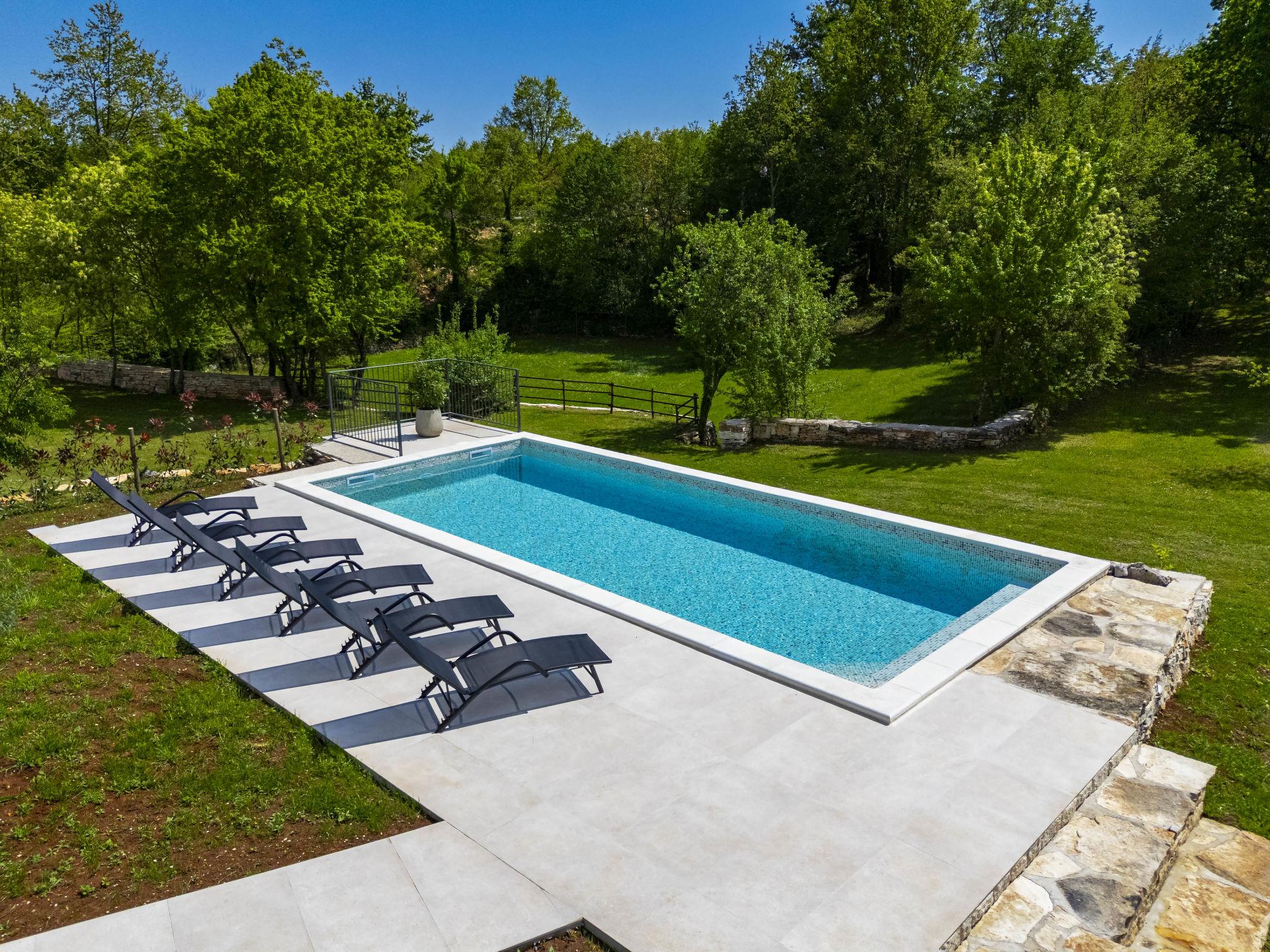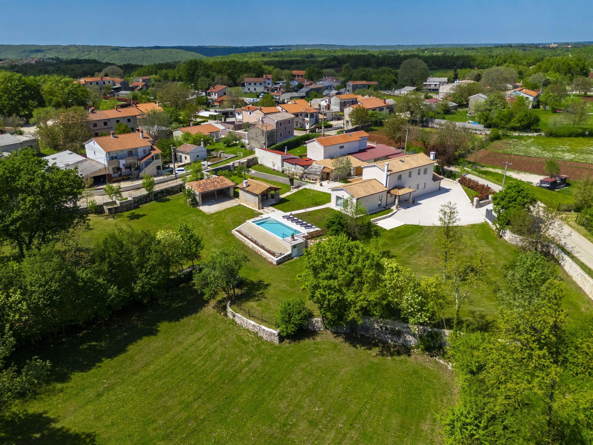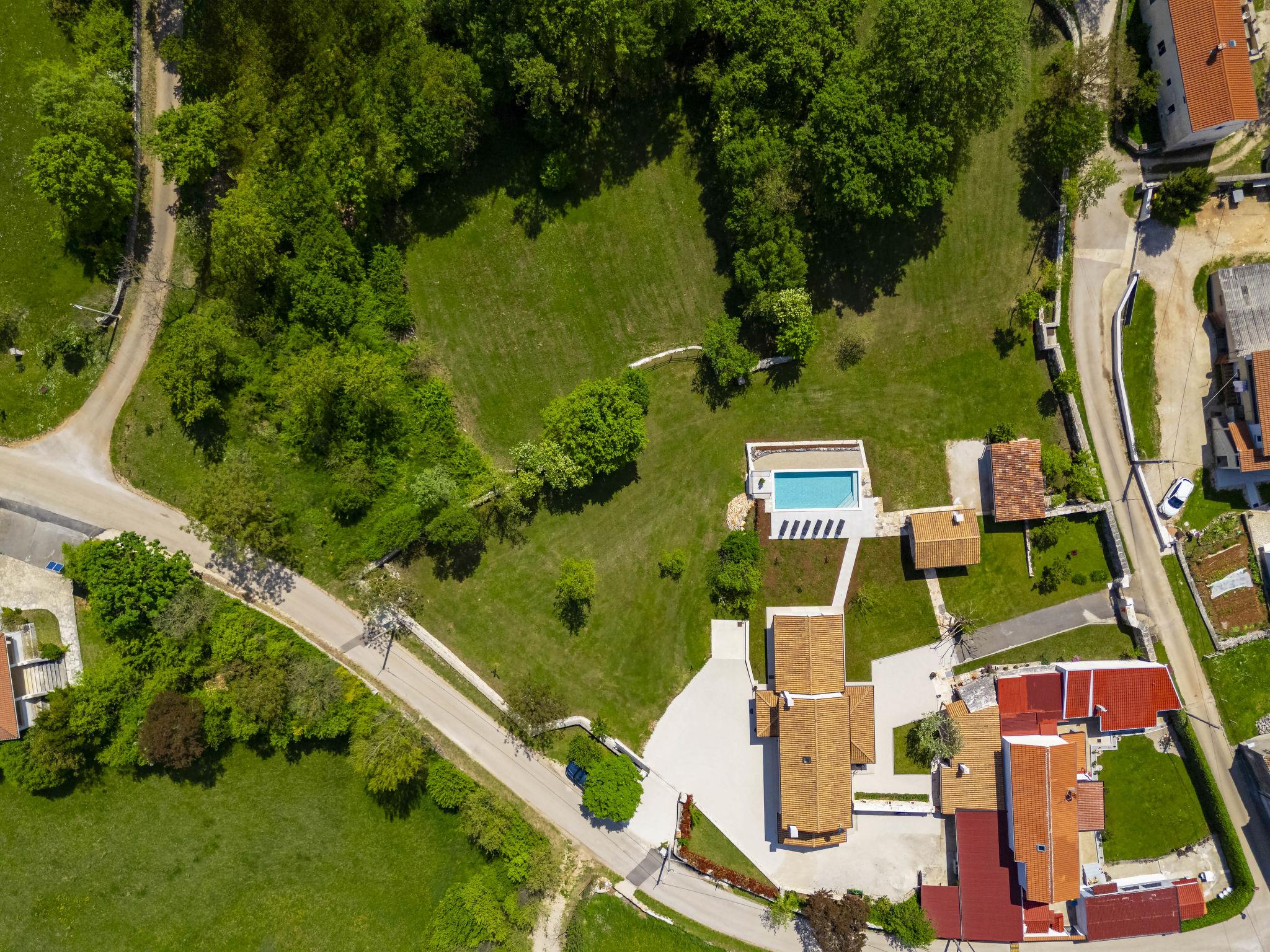 Modern, luxurious villa "Jolanda", 2 storeys, built in 2024. In the hamlet Pamici 4 km from the centre of Žminj, 25 km from the sea, 25 km from the beach. Private: property 7'000 m2 with lawn and trees, swimming pool angular (9 x 4 m, 36 m2, depth 140 cm, seasonal availability: 01.May. - 01.Oct.) with internal staircase. Outdoor shower, barbecue, barbecue house, children's playground (swing). In the house: internet access, washing machine. Parking (for 4 cars) at the house on the premises. Shop 2.8 km, supermarket 2.8 km, restaurant 3 km, bus stop 3.9 km, pebble beach 25 km. Nearby attractions: adventure park 20 km, zip line 15 km.