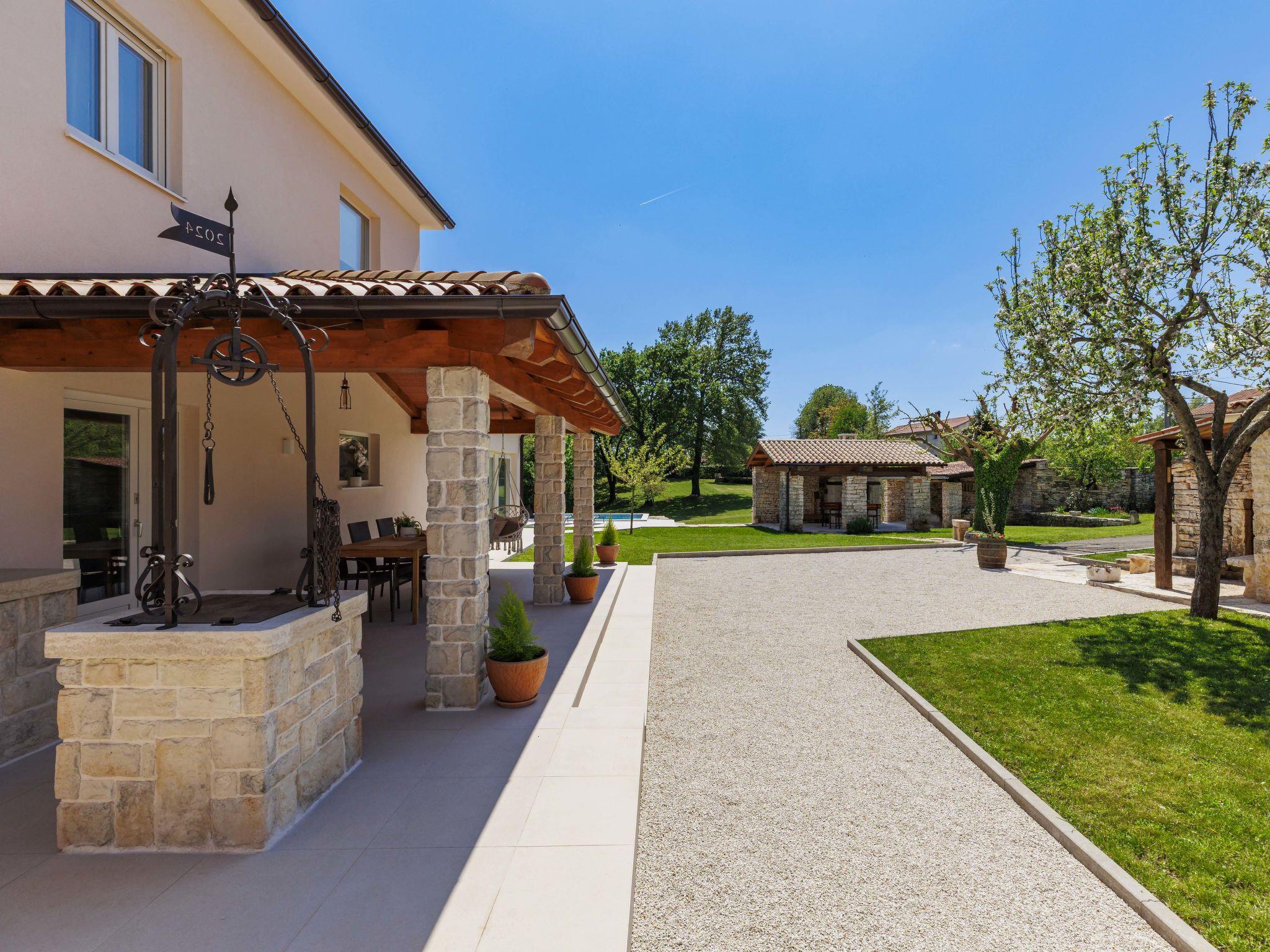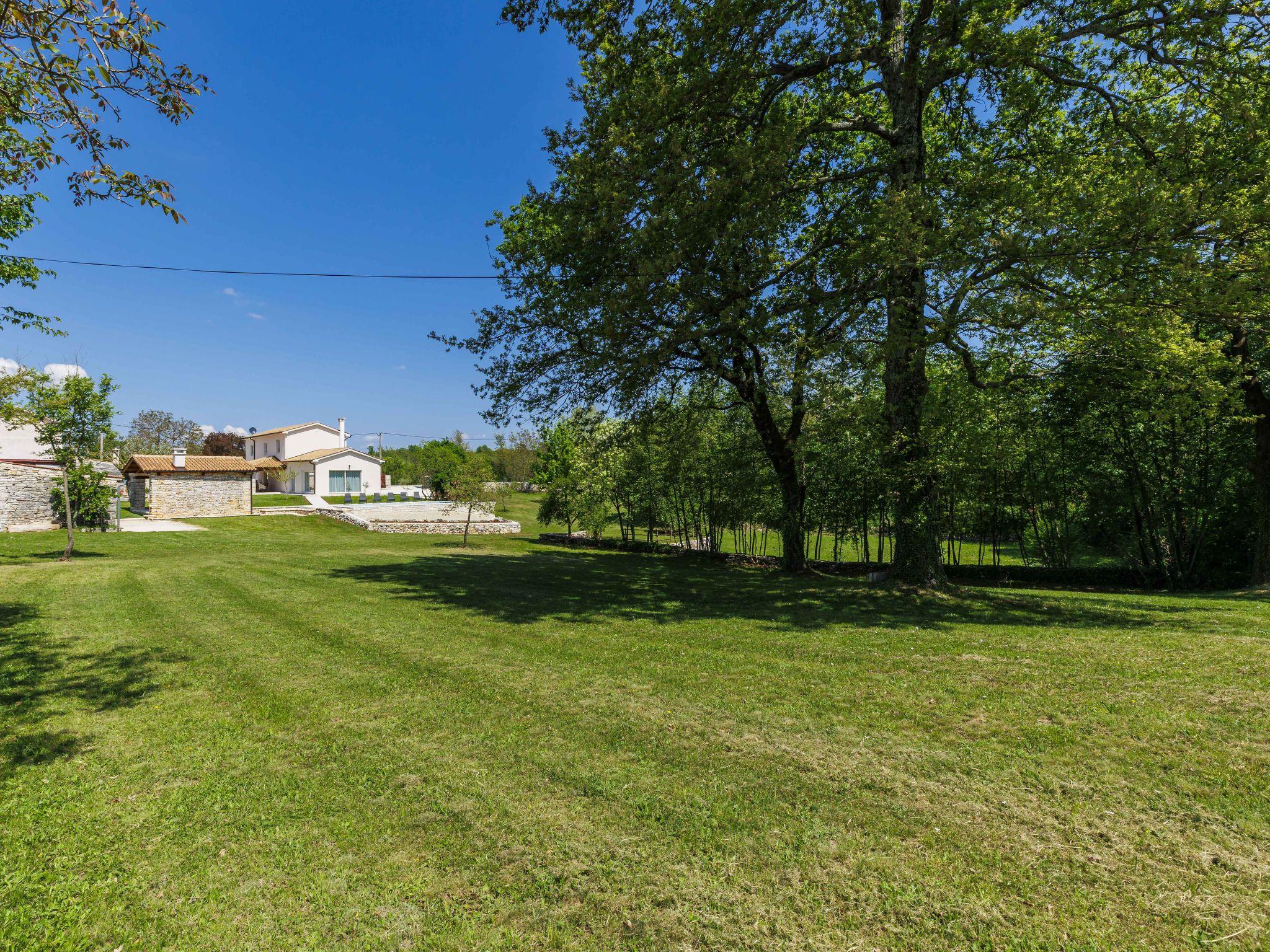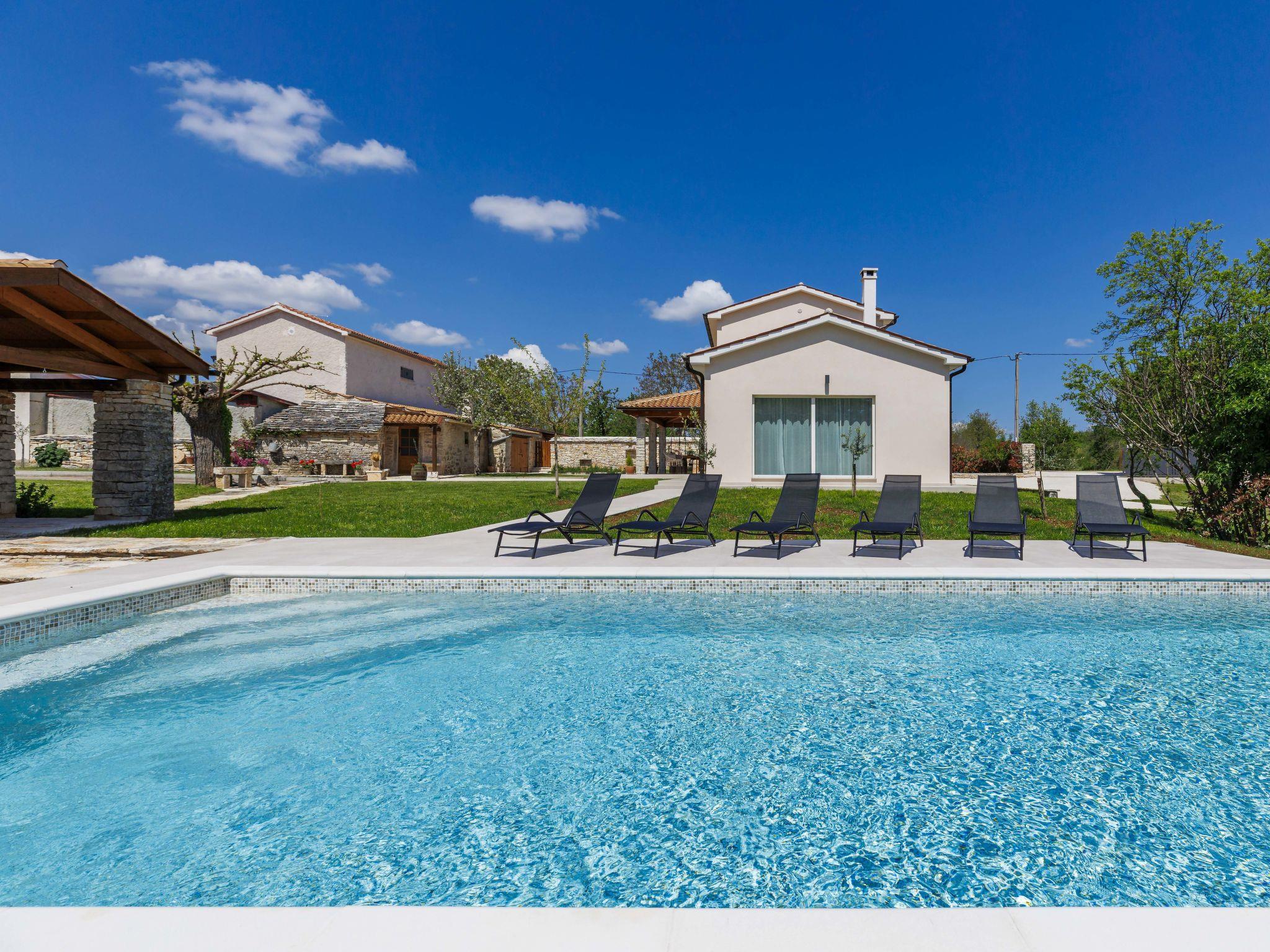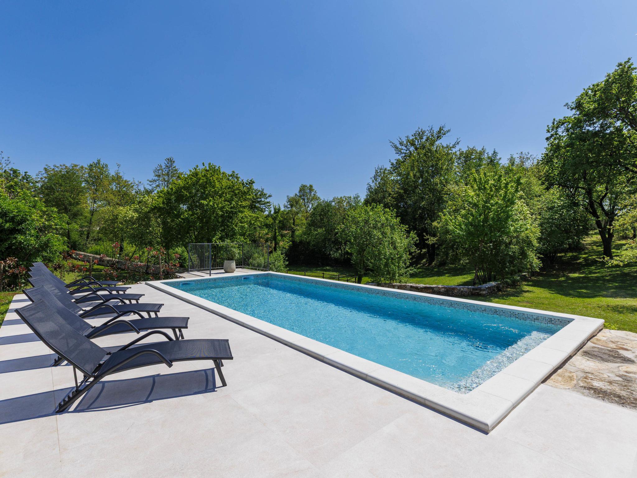 Modern, luxurious villa "Jolanda", 2 storeys, built in 2024. In the hamlet Pamici 4 km from the centre of Žminj, 25 km from the sea, 25 km from the beach. Private: property 7'000 m2 with lawn and trees, swimming pool angular (9 x 4 m, 36 m2, depth 140 cm, seasonal availability: 01.May. - 01.Oct.) with internal staircase. Outdoor shower, barbecue, barbecue house, children's playground (swing). In the house: internet access, washing machine. Parking (for 4 cars) at the house on the premises. Shop 2.8 km, supermarket 2.8 km, restaurant 3 km, bus stop 3.9 km, pebble beach 25 km. Nearby attractions: adventure park 20 km, zip line 15 km.
