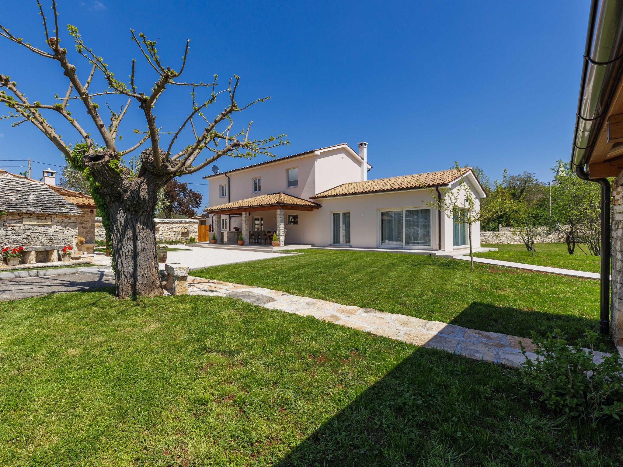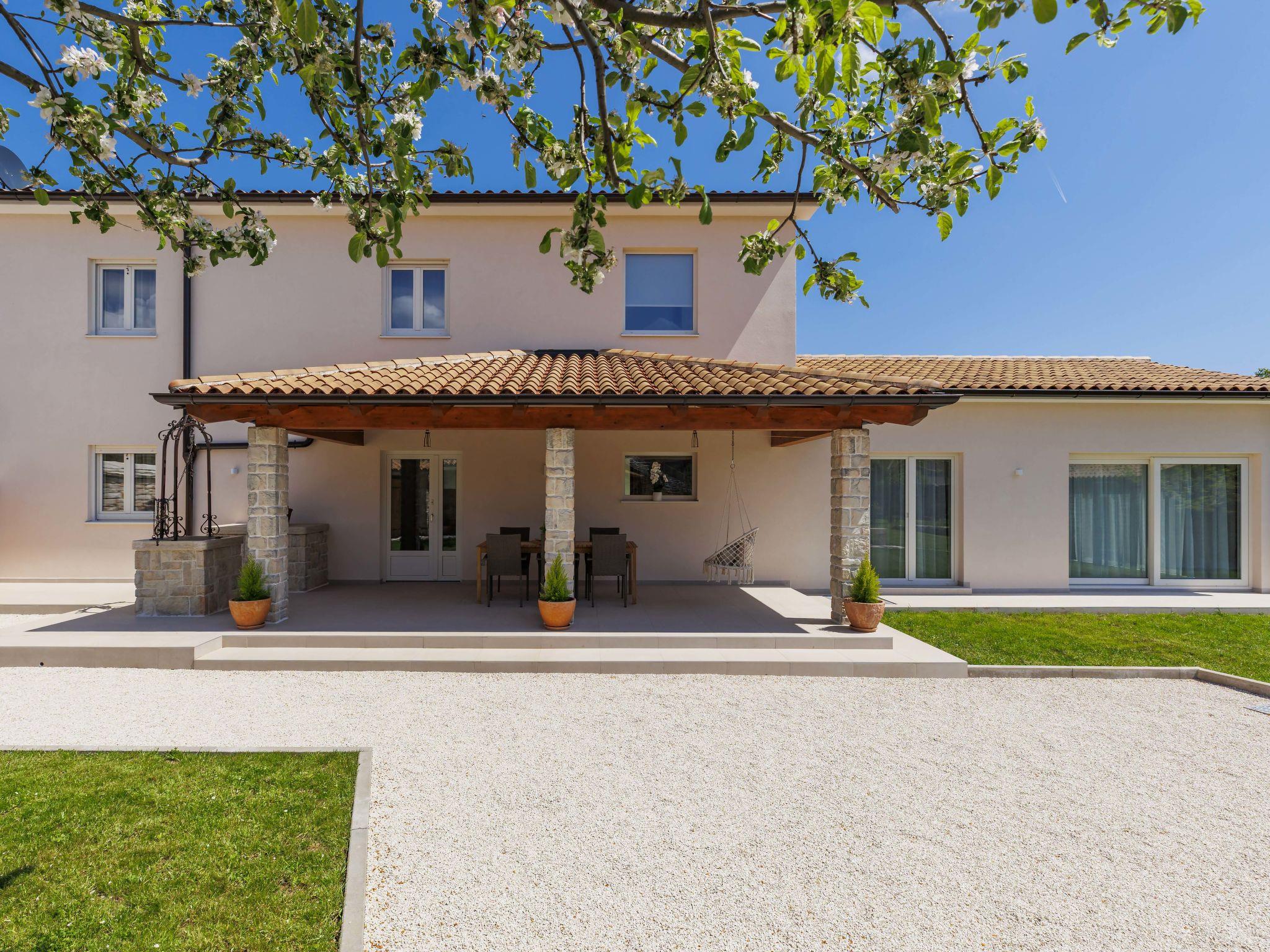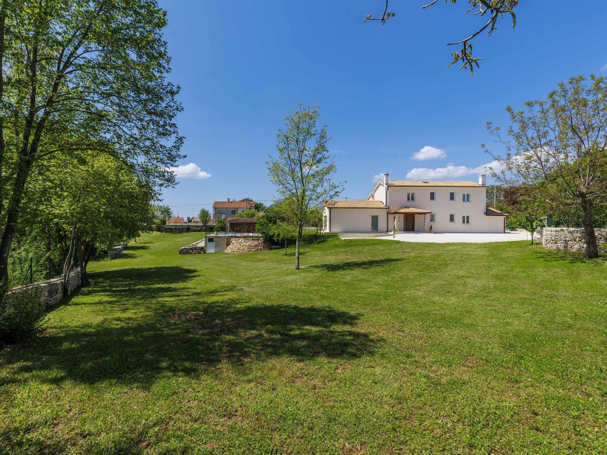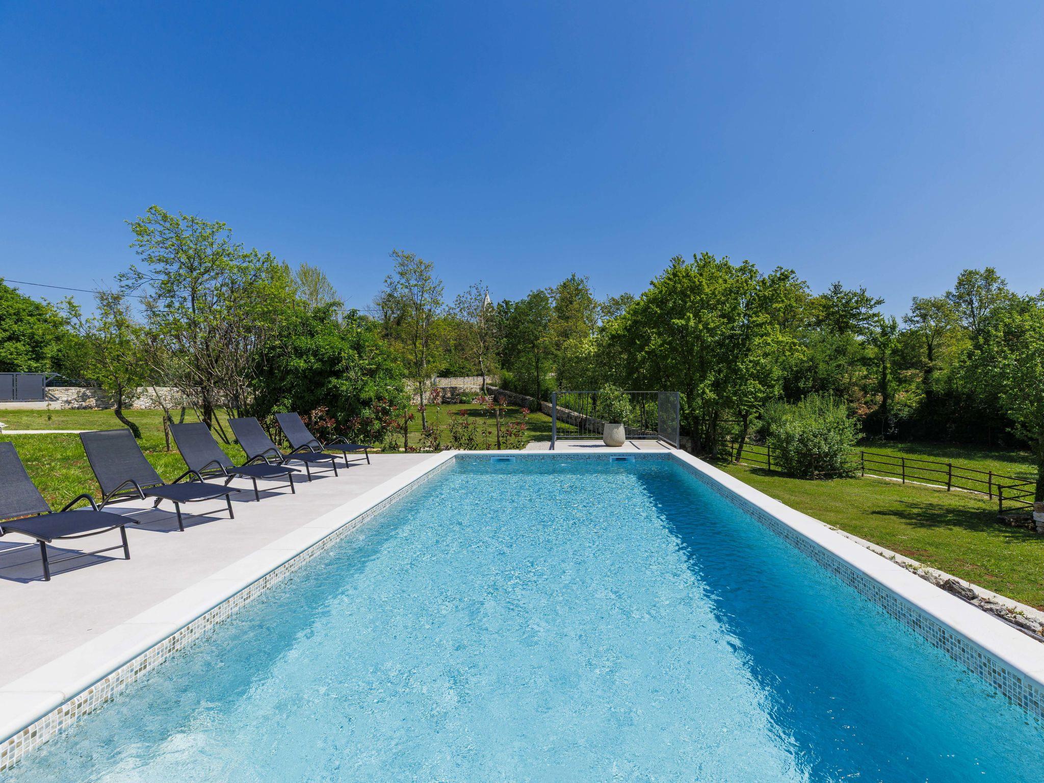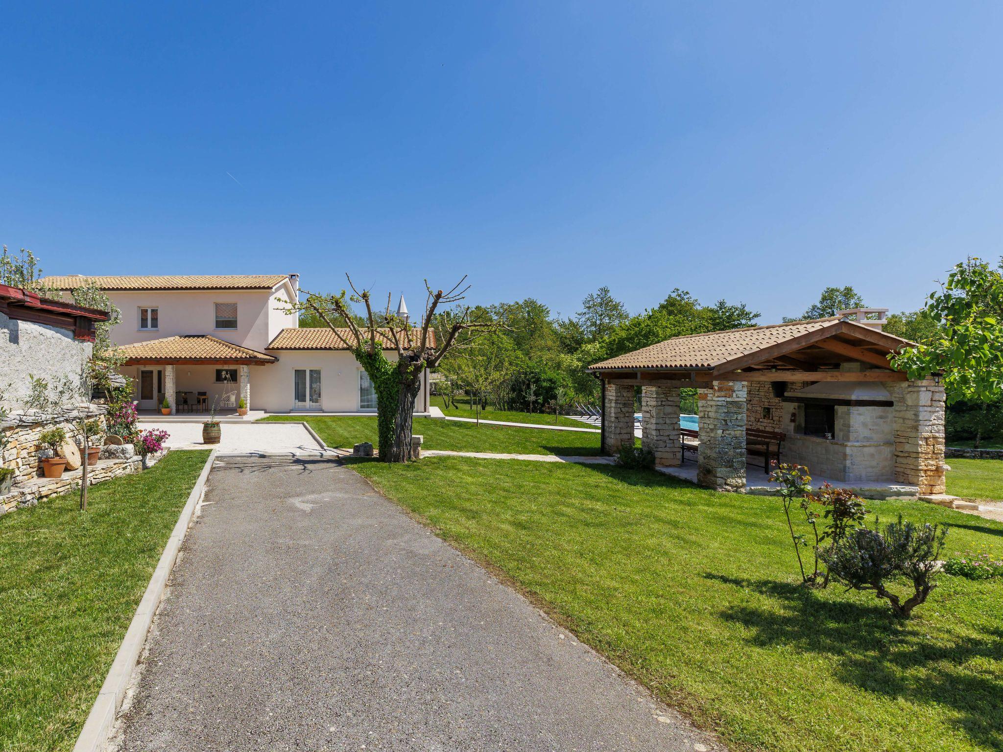 Modern, luxurious villa "Jolanda", 2 storeys, built in 2024. In the hamlet Pamici 4 km from the centre of Žminj, 25 km from the sea, 25 km from the beach. Private: property 7'000 m2 with lawn and trees, swimming pool angular (9 x 4 m, 36 m2, depth 140 cm, seasonal availability: 01.May. - 01.Oct.) with internal staircase. Outdoor shower, barbecue, barbecue house, children's playground (swing). In the house: internet access, washing machine. Parking (for 4 cars) at the house on the premises. Shop 2.8 km, supermarket 2.8 km, restaurant 3 km, bus stop 3.9 km, pebble beach 25 km. Nearby attractions: adventure park 20 km, zip line 15 km.