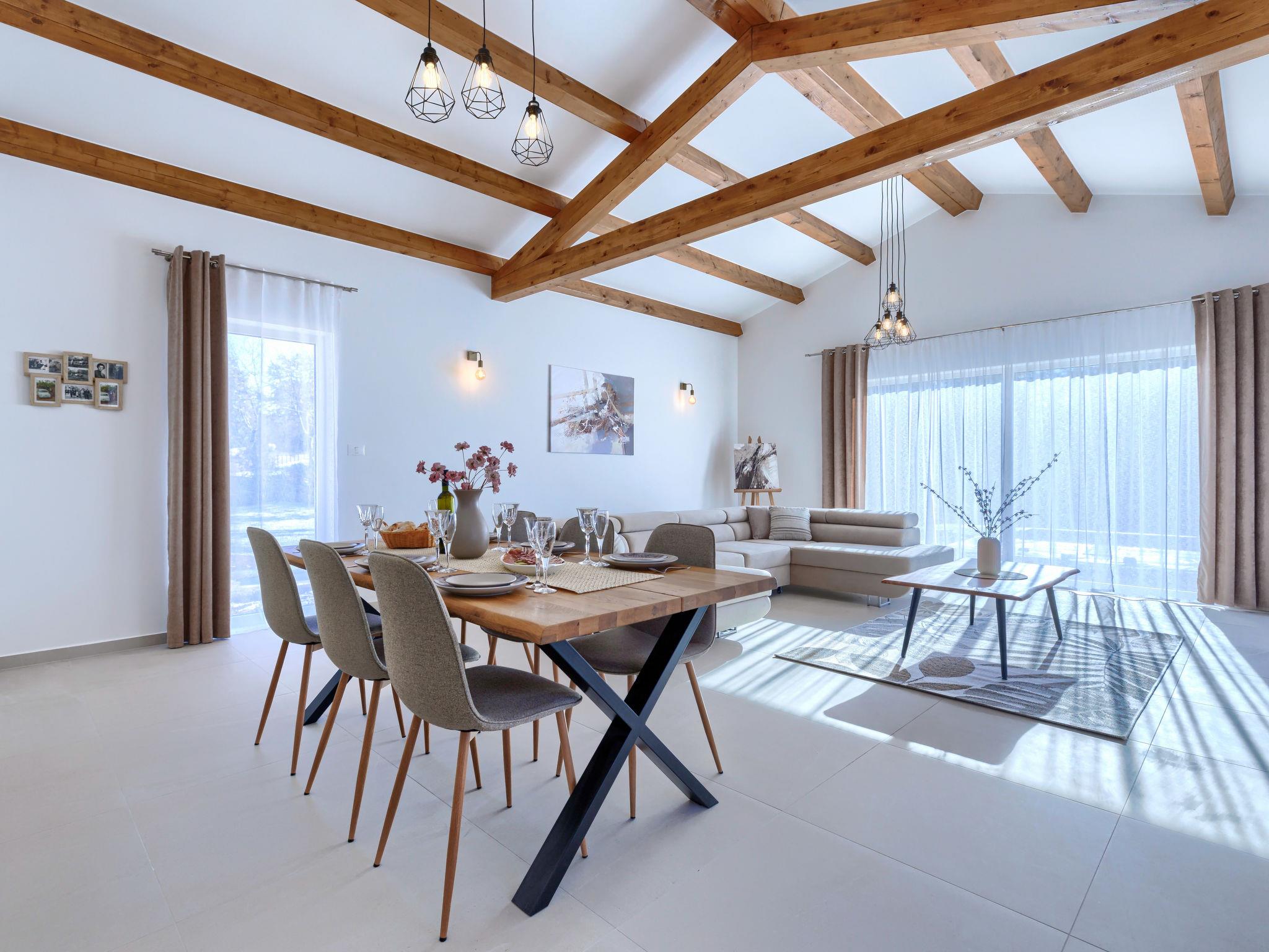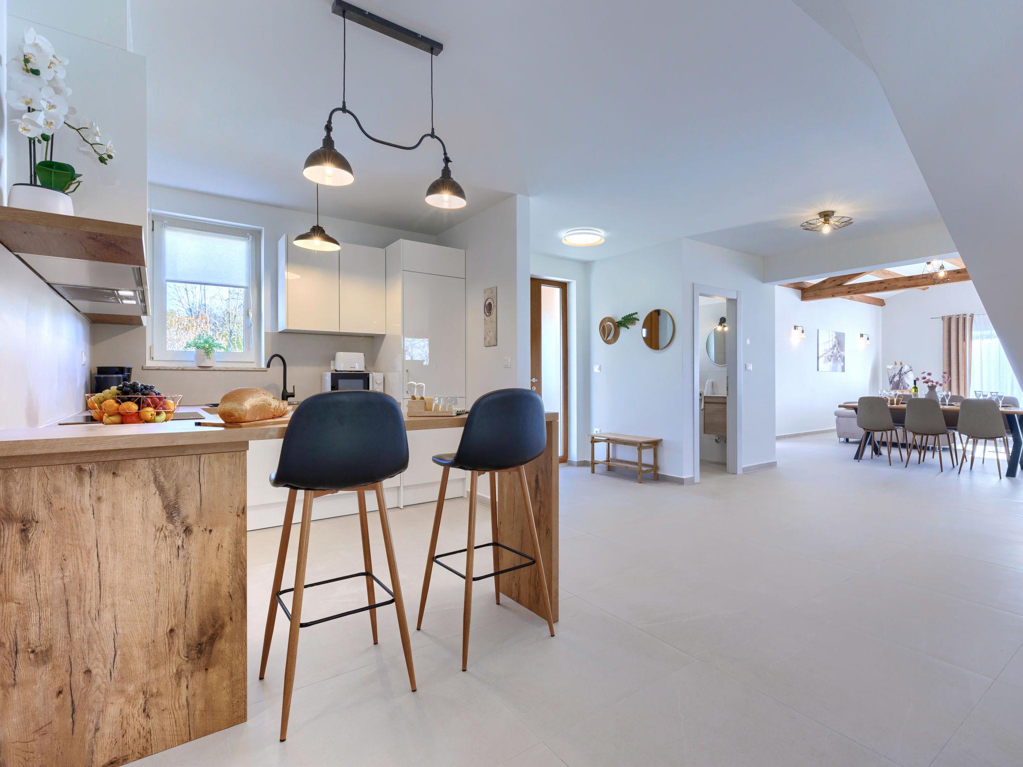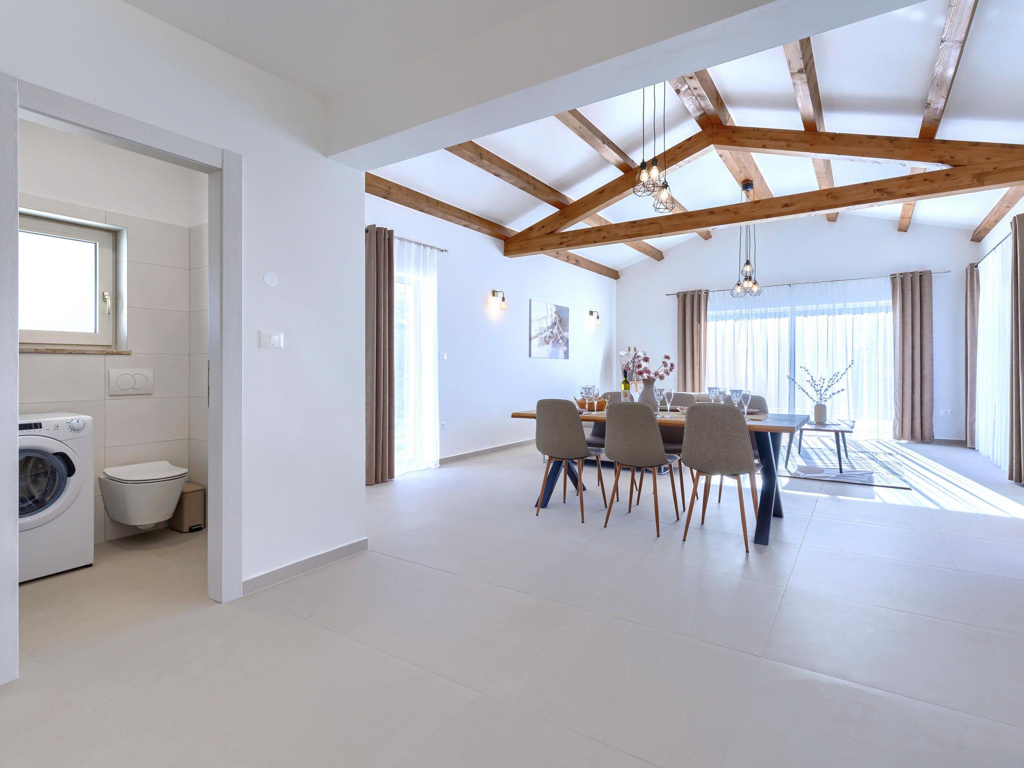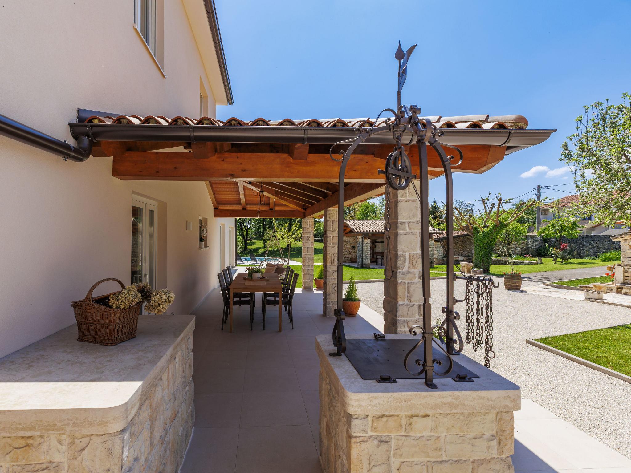 Modern, luxurious villa "Jolanda", 2 storeys, built in 2024. In the hamlet Pamici 4 km from the centre of Žminj, 25 km from the sea, 25 km from the beach. Private: property 7'000 m2 with lawn and trees, swimming pool angular (9 x 4 m, 36 m2, depth 140 cm, seasonal availability: 01.May. - 01.Oct.) with internal staircase. Outdoor shower, barbecue, barbecue house, children's playground (swing). In the house: internet access, washing machine. Parking (for 4 cars) at the house on the premises. Shop 2.8 km, supermarket 2.8 km, restaurant 3 km, bus stop 3.9 km, pebble beach 25 km. Nearby attractions: adventure park 20 km, zip line 15 km.