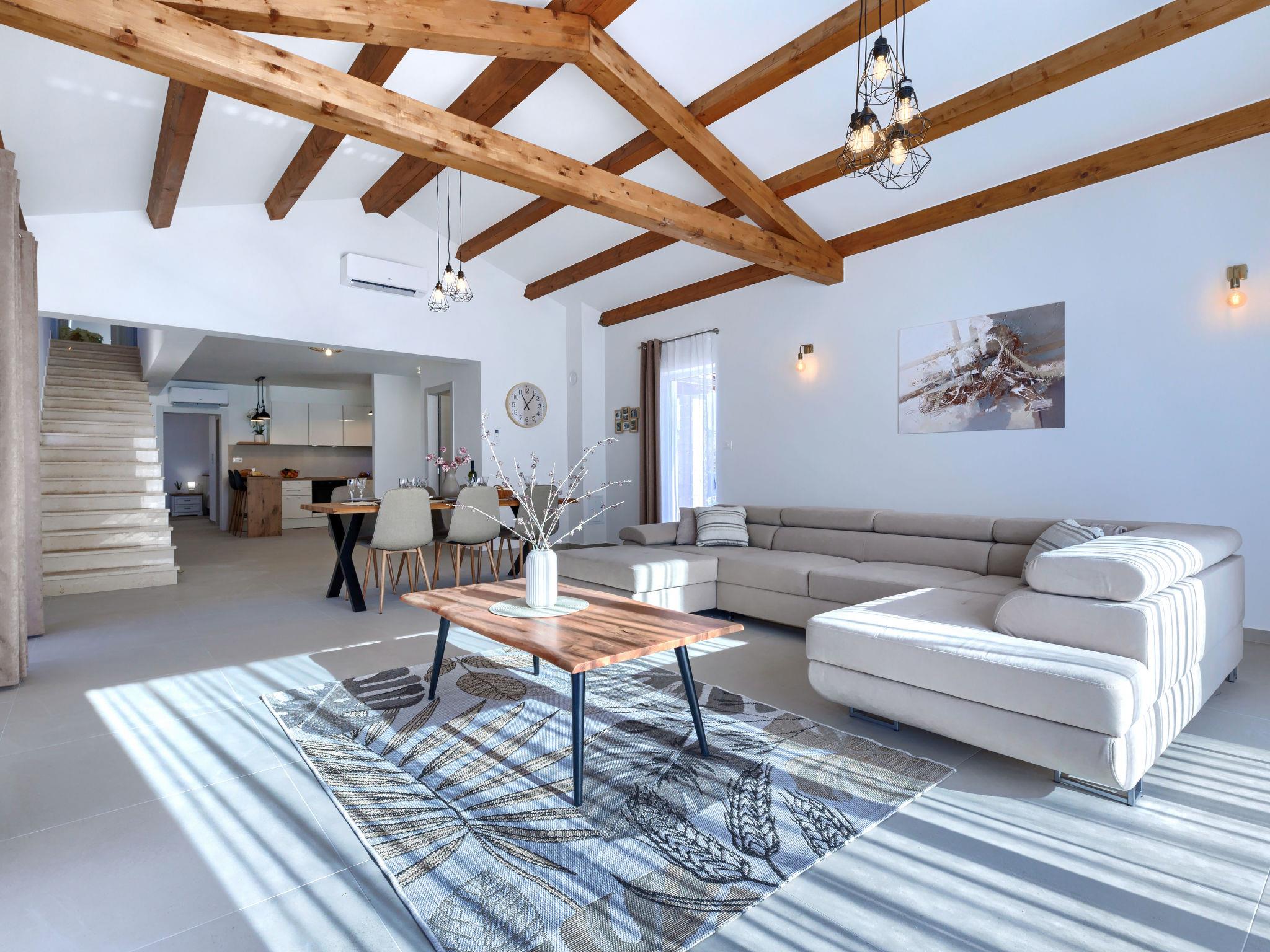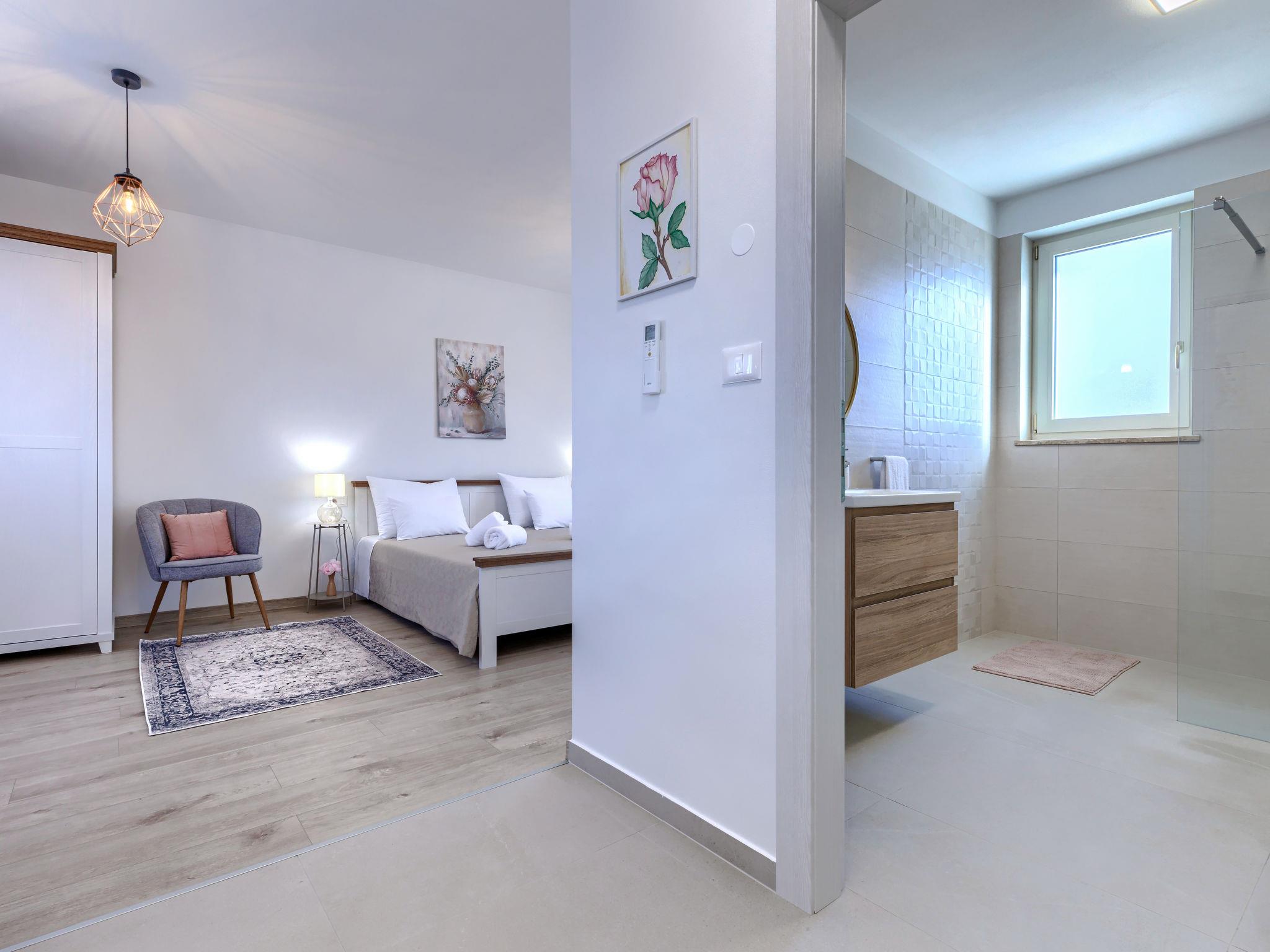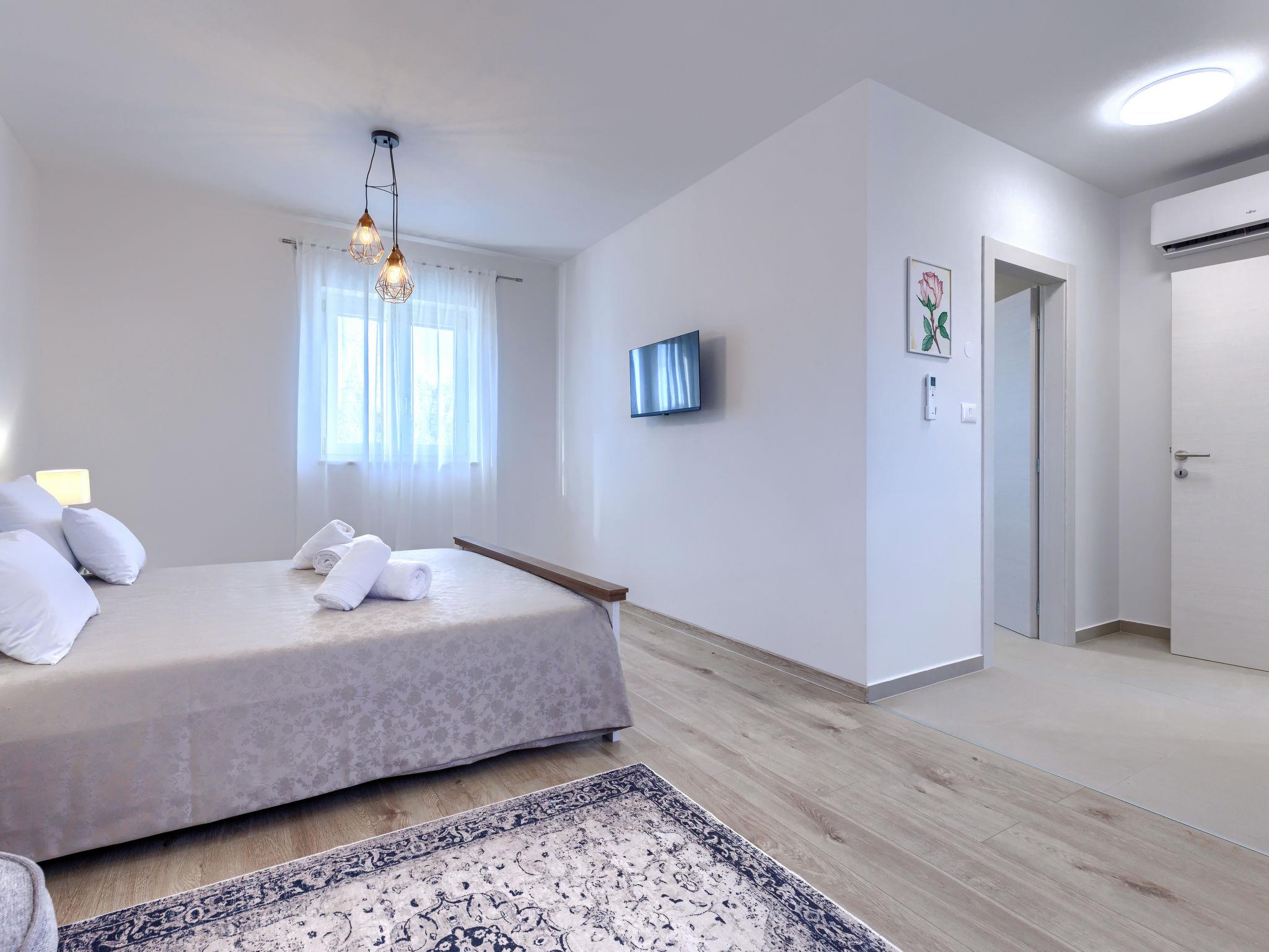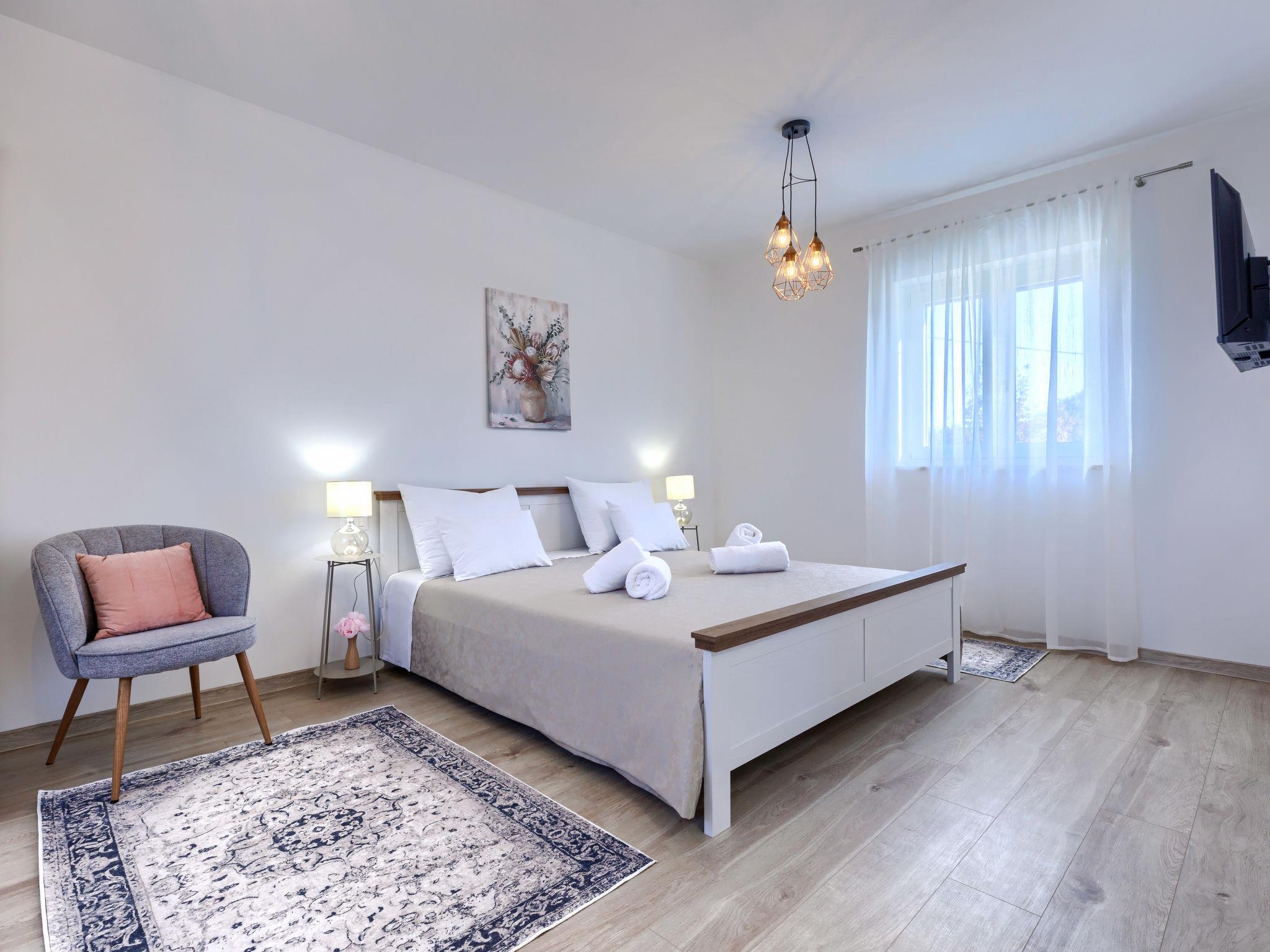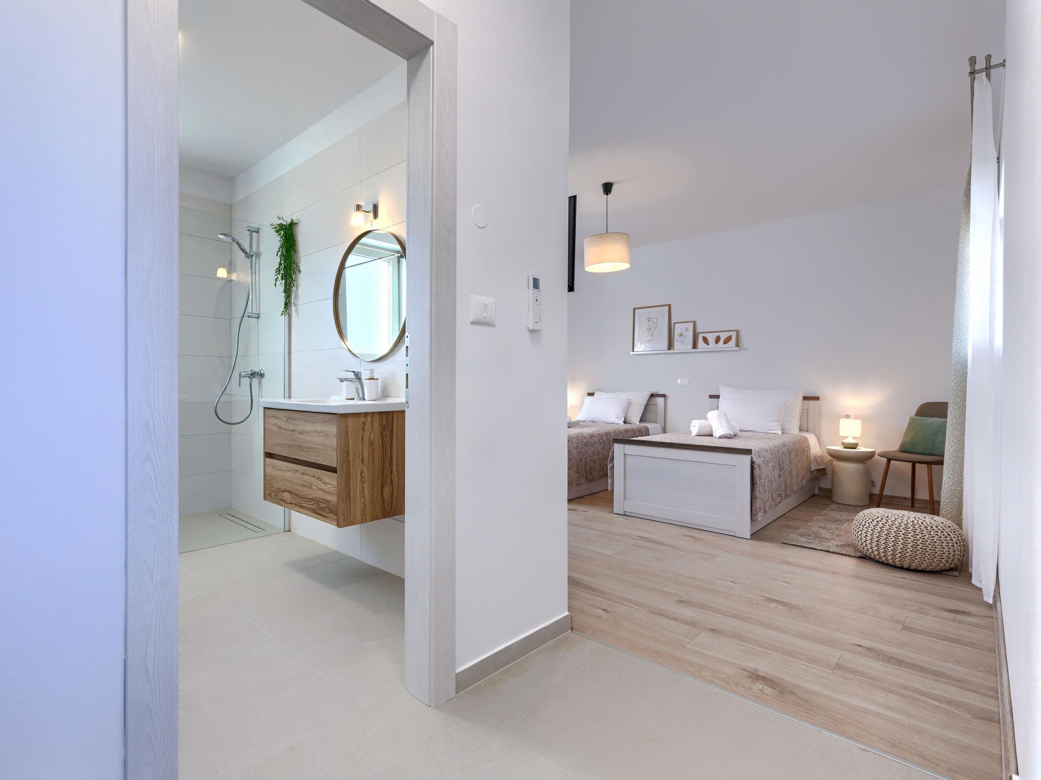 Modern, luxurious villa "Jolanda", 2 storeys, built in 2024. In the hamlet Pamici 4 km from the centre of Žminj, 25 km from the sea, 25 km from the beach. Private: property 7'000 m2 with lawn and trees, swimming pool angular (9 x 4 m, 36 m2, depth 140 cm, seasonal availability: 01.May. - 01.Oct.) with internal staircase. Outdoor shower, barbecue, barbecue house, children's playground (swing). In the house: internet access, washing machine. Parking (for 4 cars) at the house on the premises. Shop 2.8 km, supermarket 2.8 km, restaurant 3 km, bus stop 3.9 km, pebble beach 25 km. Nearby attractions: adventure park 20 km, zip line 15 km.