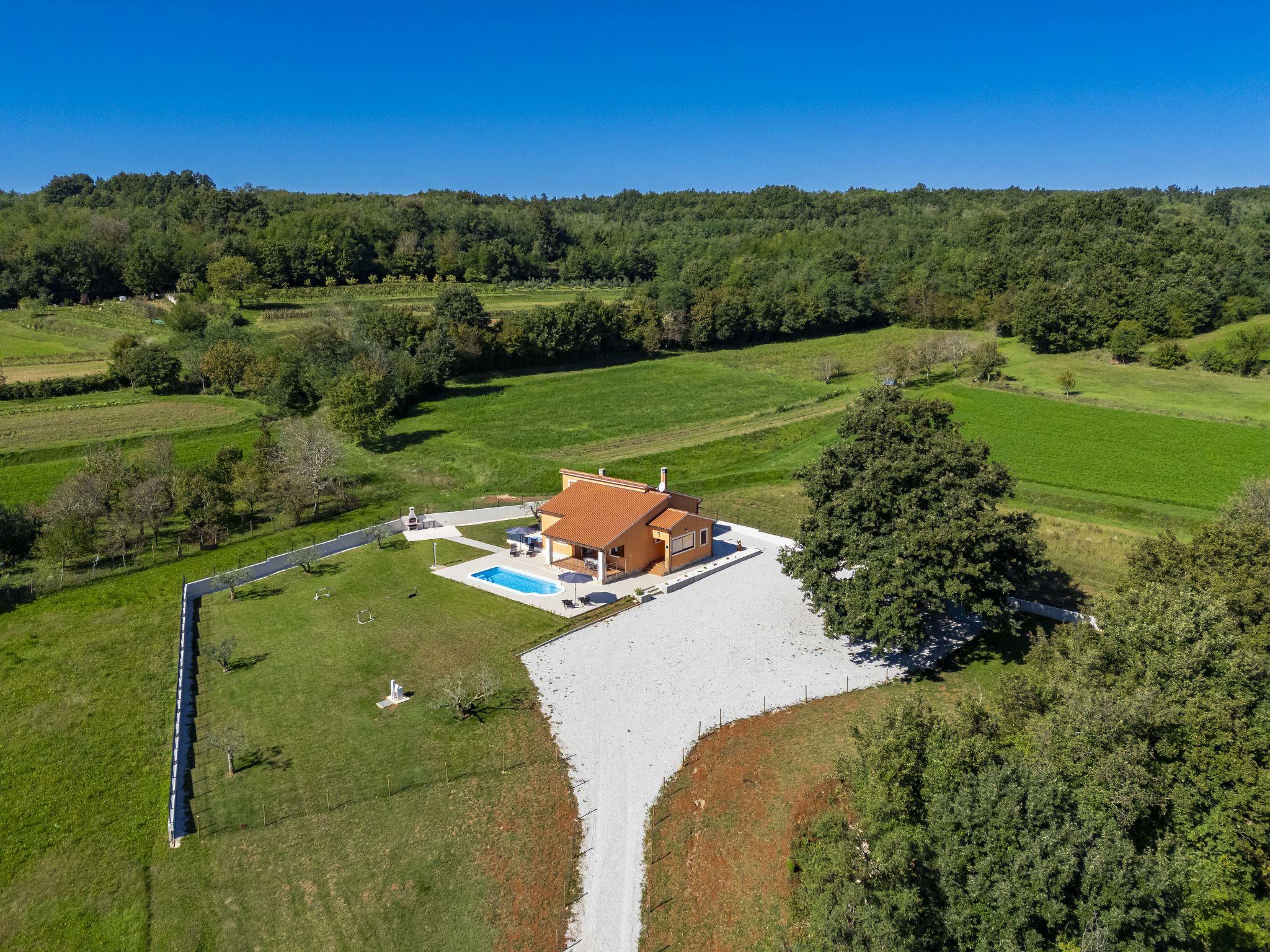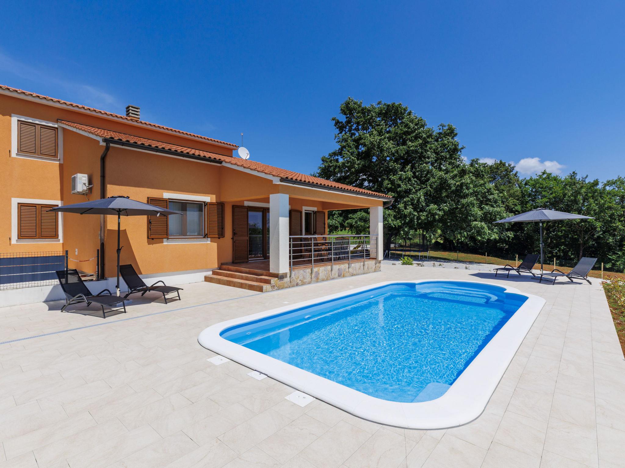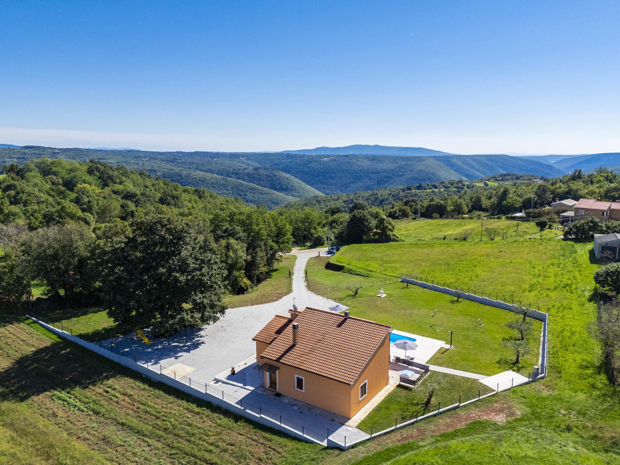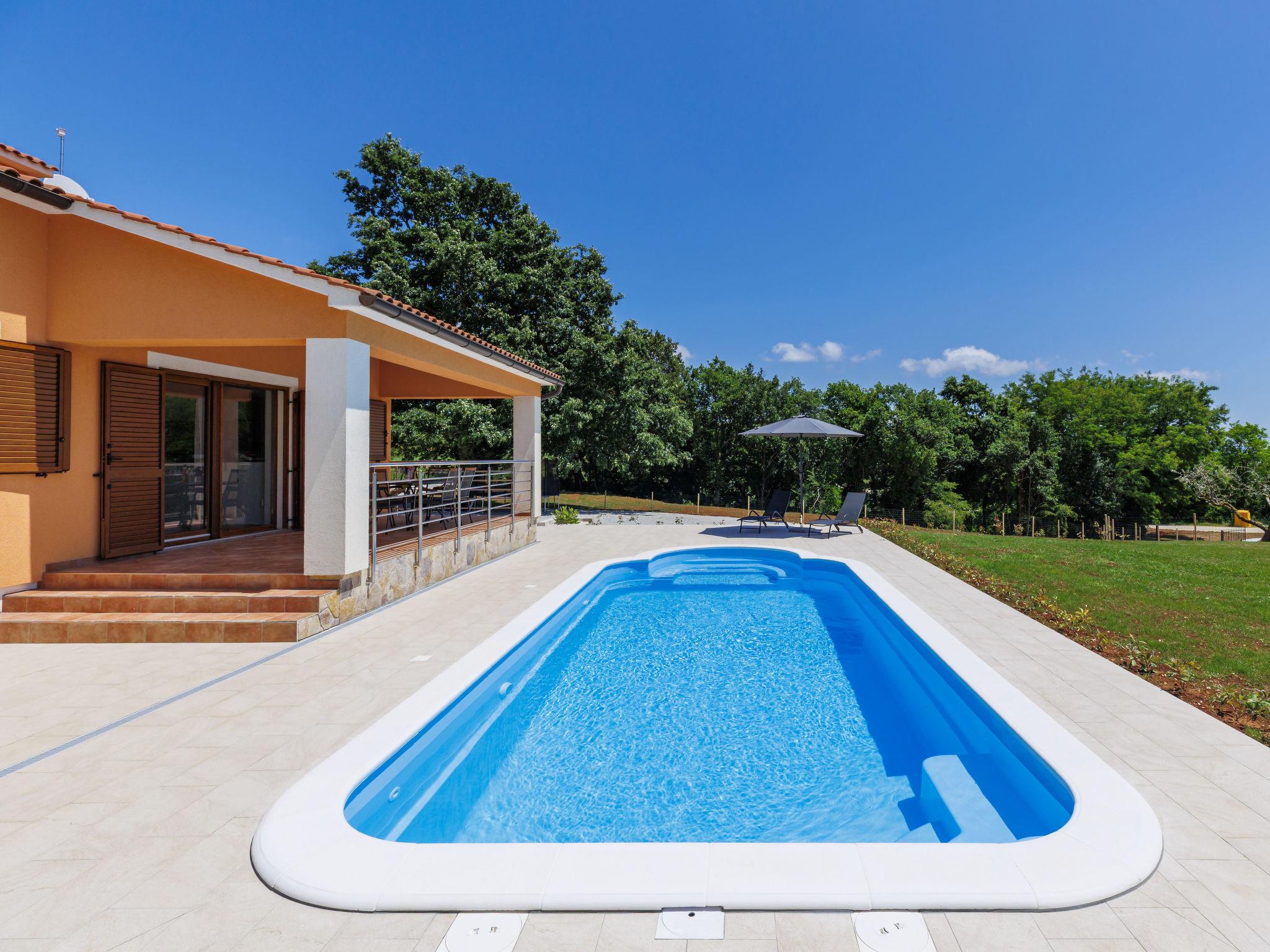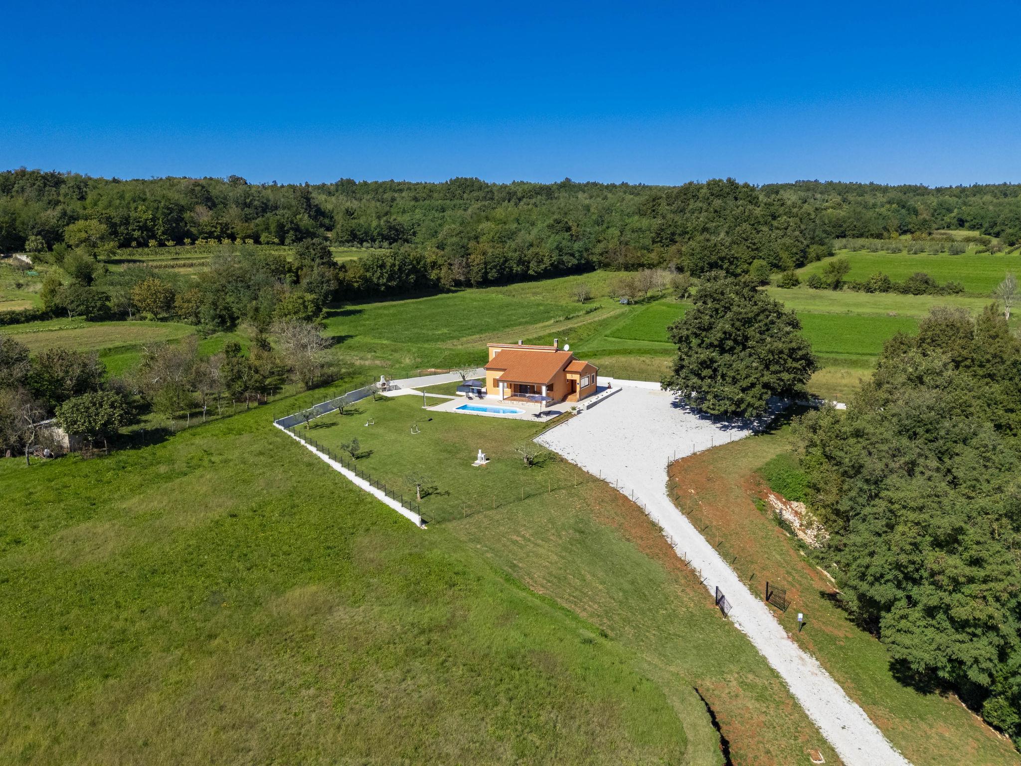Comfortable single-family house "Tina". In the hamlet Sutivanac 9 km from the centre of Žminj, in a quiet position, 20 km from the sea, in the countryside. Private: property 2'000 m2, beautiful garden with lawn and trees, swimming pool angular (9 x 3 m, 36 m2, depth 140 cm, seasonal availability: 01.May. - 01.Nov.) with internal staircase and salt-electrolysis pool-cleaning system. Outdoor shower, barbecue (swing). In the house: internet access, washing machine, tumble dryer. Parking (for 4 cars) at the house on the premises. Shop 170 m, restaurant 8 km, bus stop 9.2 km, pebble beach 20 km. Riding stable 6000 km. Please note: suitable for families. Groups of teenagers on request only. Airfield 33 km from the property.