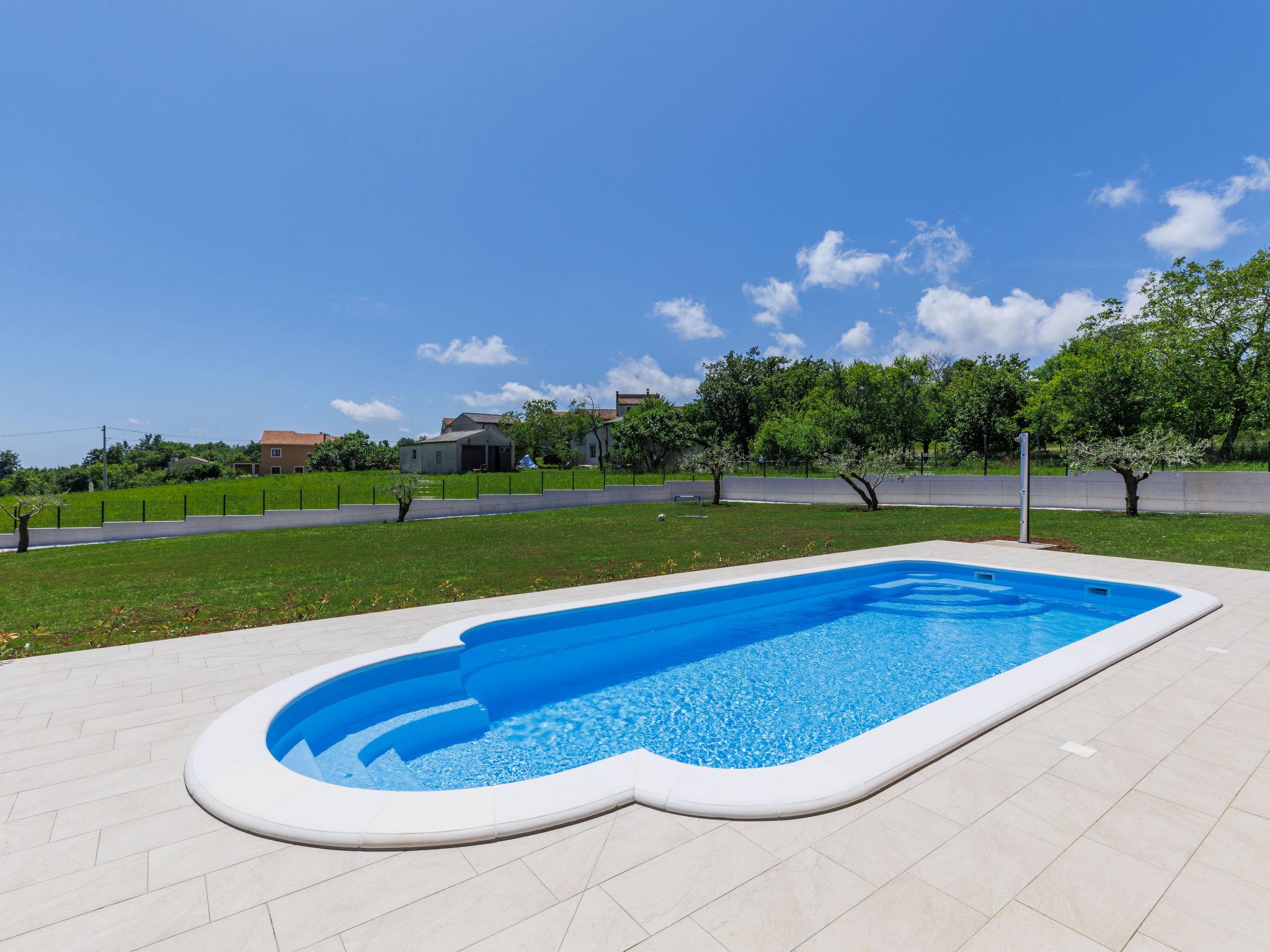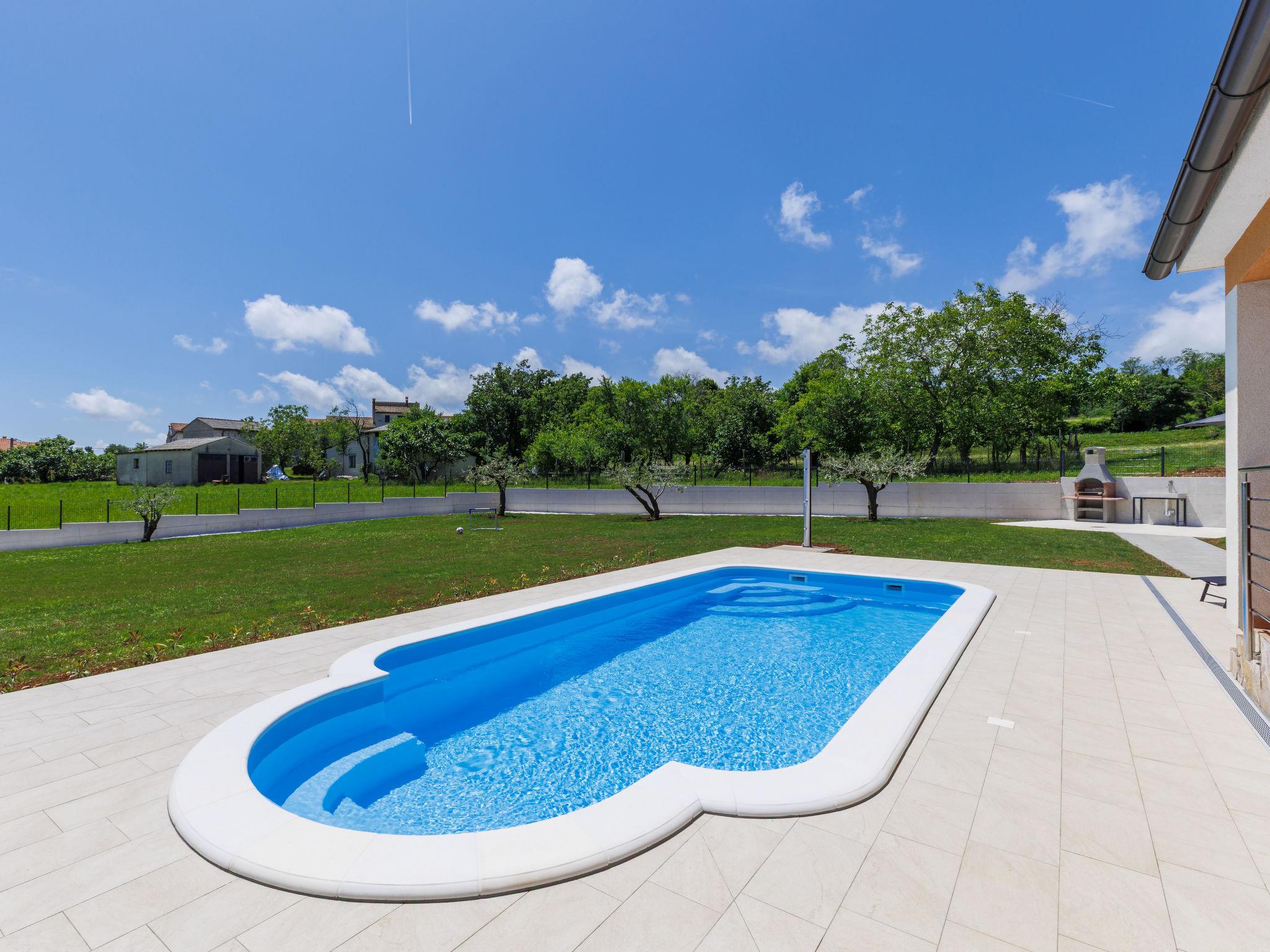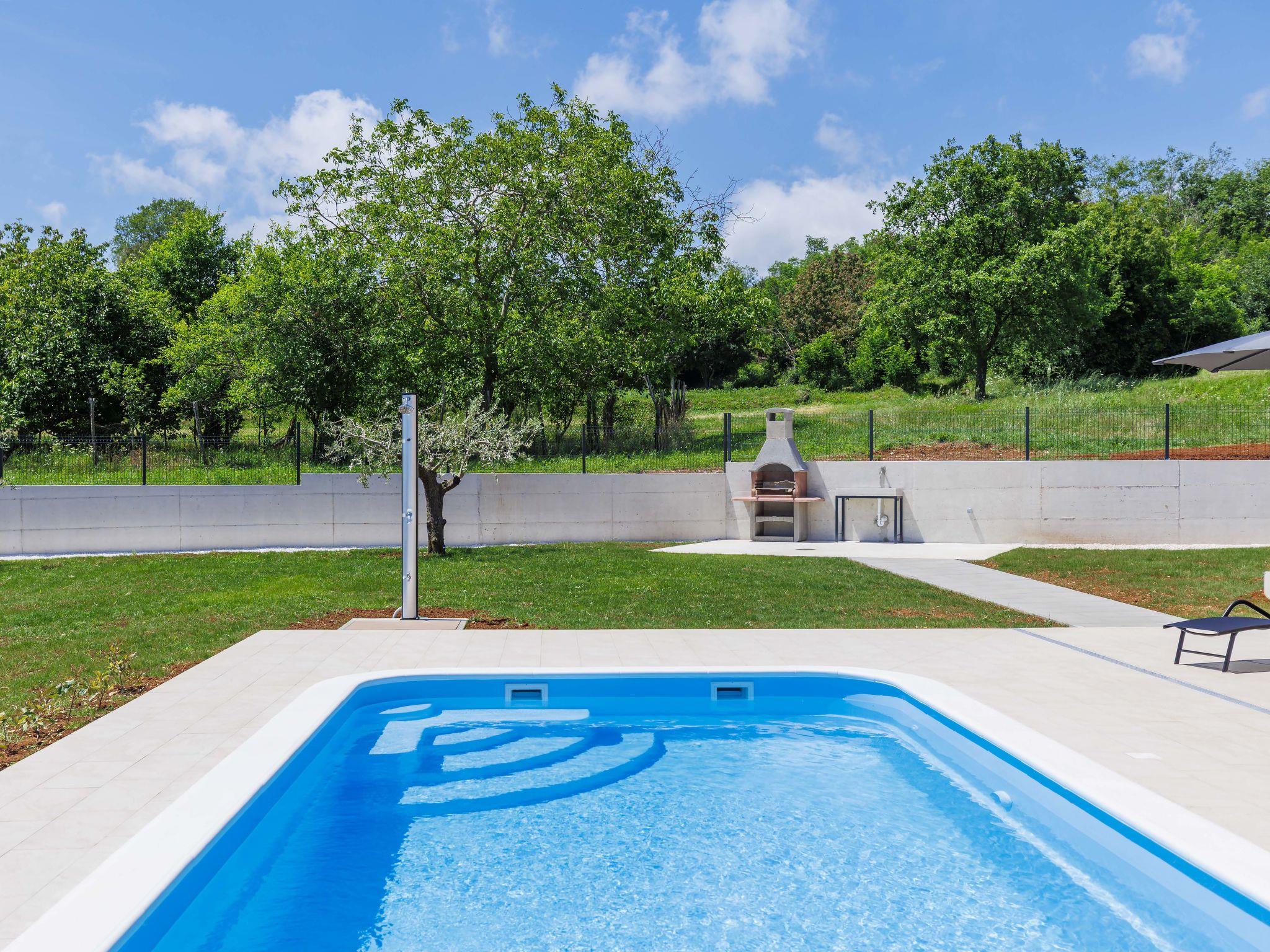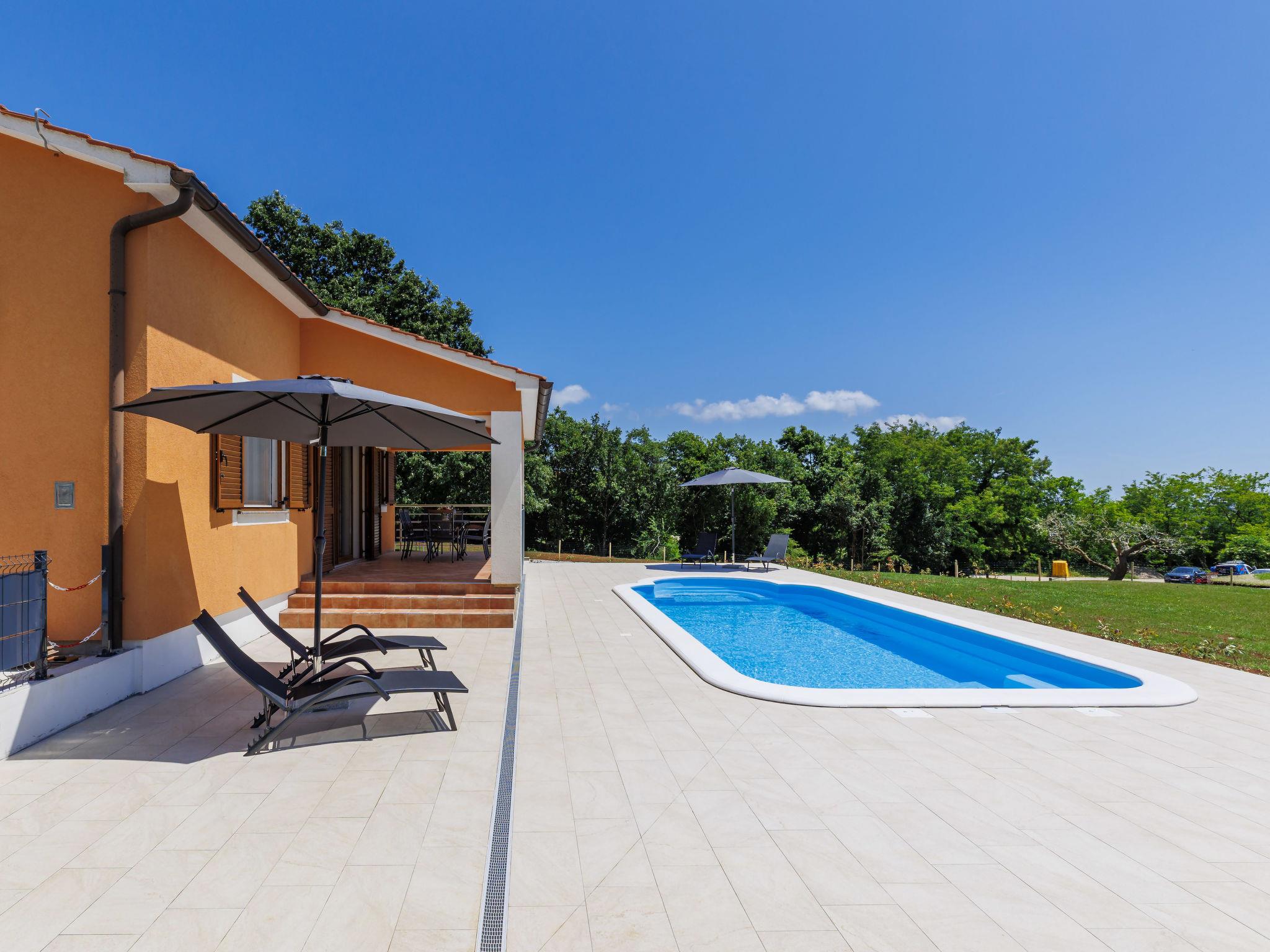 Comfortable single-family house "Tina". In the hamlet Sutivanac 9 km from the centre of Žminj, in a quiet position, 20 km from the sea, in the countryside. Private: property 2'000 m2, beautiful garden with lawn and trees, swimming pool angular (9 x 3 m, 36 m2, depth 140 cm, seasonal availability: 01.May. - 01.Nov.) with internal staircase and salt-electrolysis pool-cleaning system. Outdoor shower, barbecue (swing). In the house: internet access, washing machine, tumble dryer. Parking (for 4 cars) at the house on the premises. Shop 170 m, restaurant 8 km, bus stop 9.2 km, pebble beach 20 km. Riding stable 6000 km. Please note: suitable for families. Groups of teenagers on request only. Airfield 33 km from the property.
