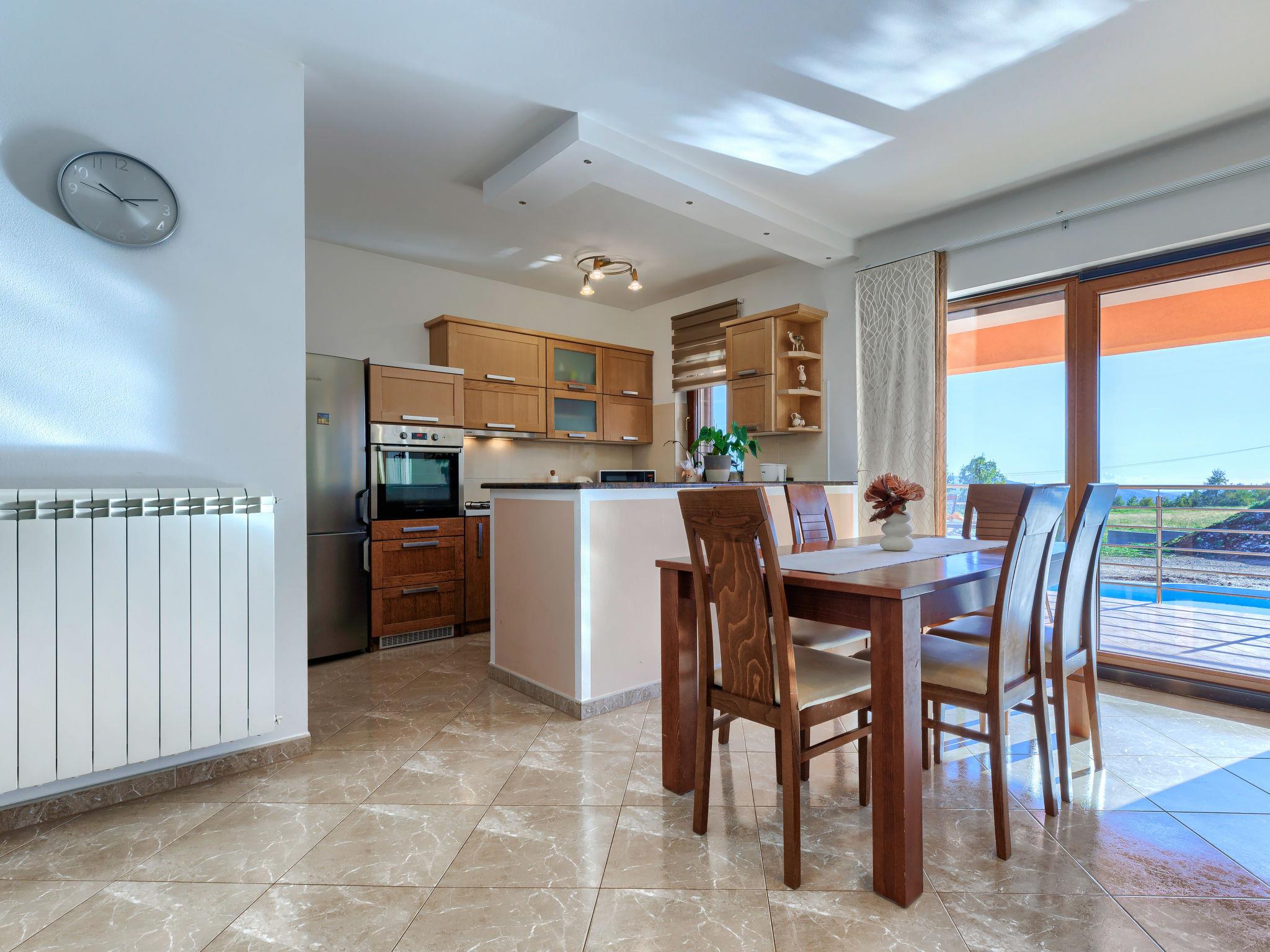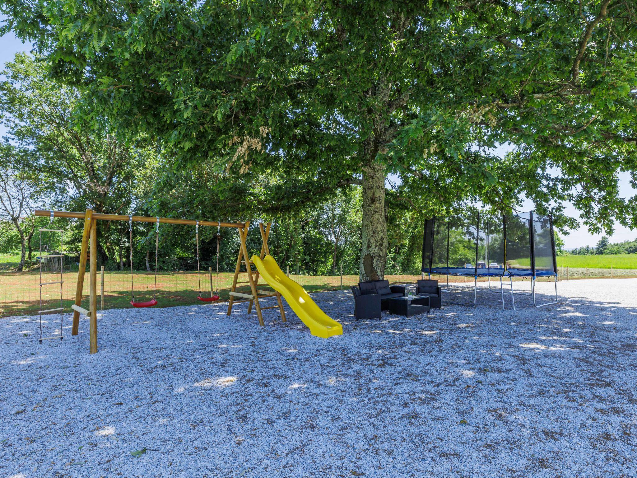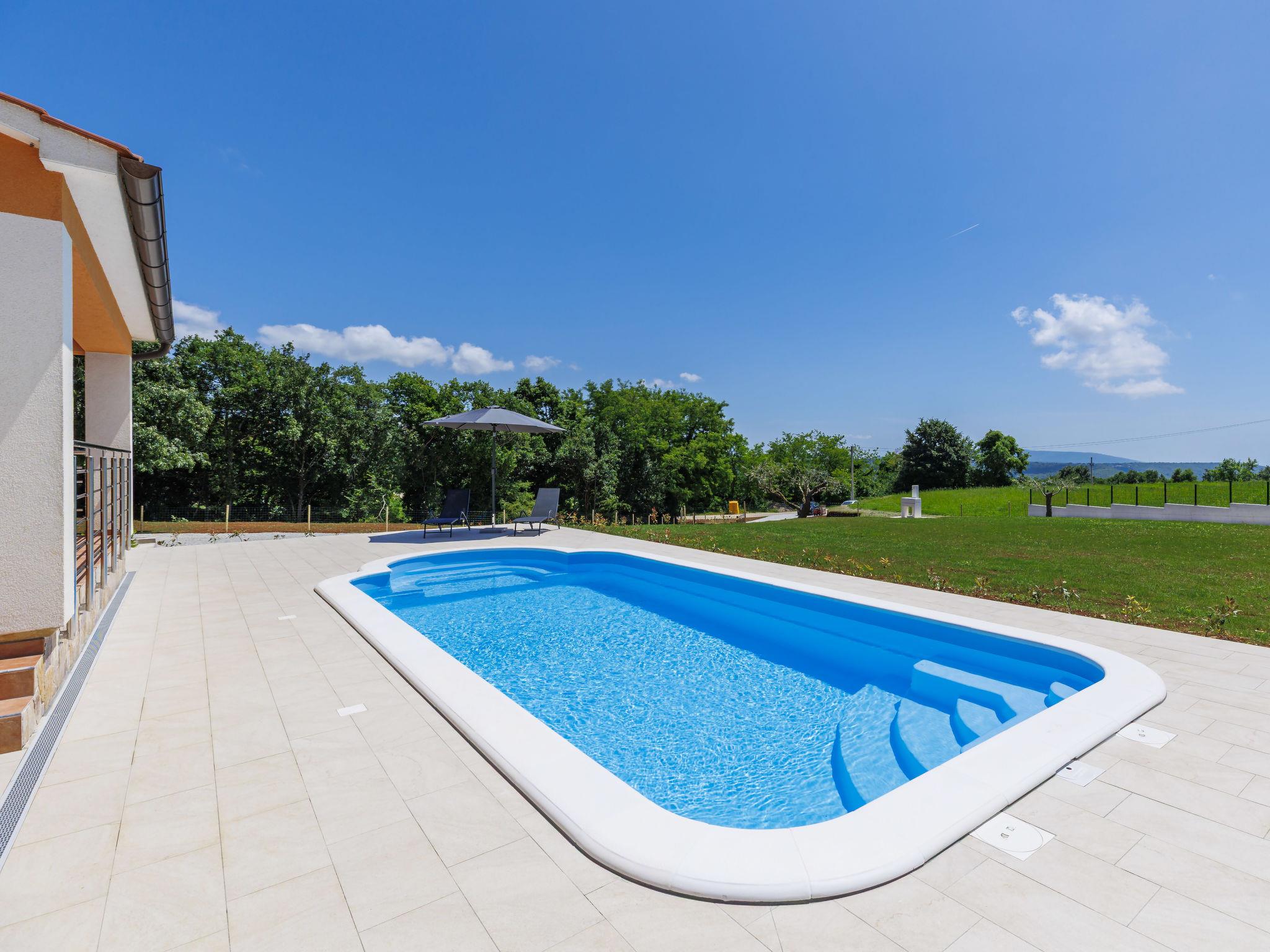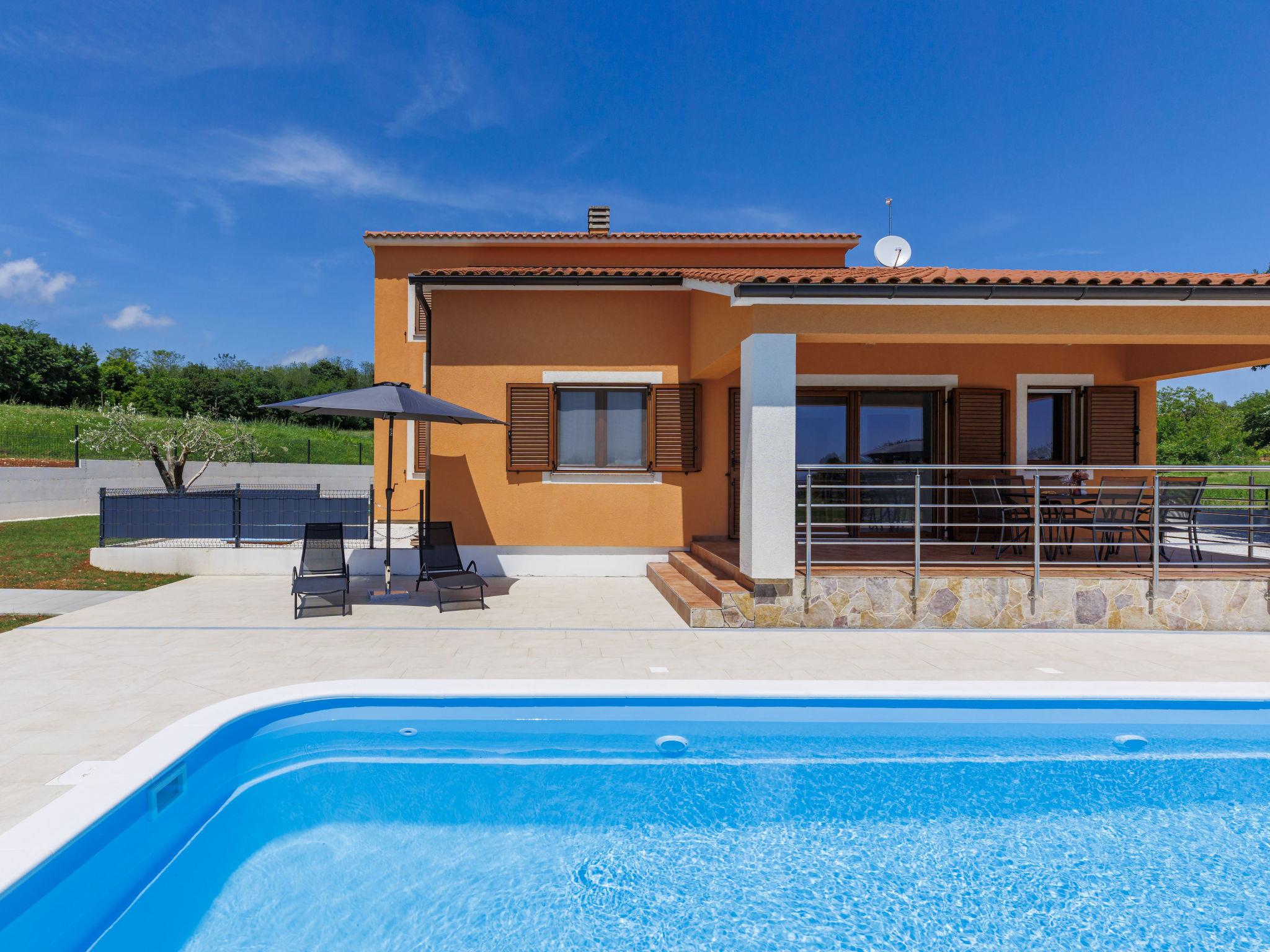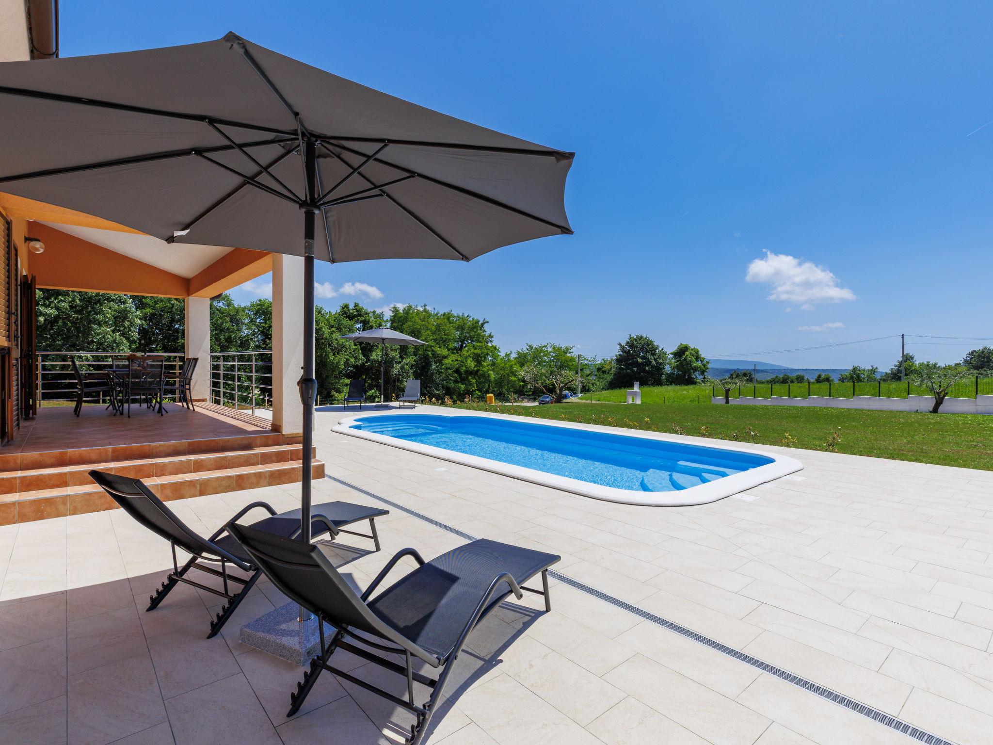Comfortable single-family house "Tina". In the hamlet Sutivanac 9 km from the centre of Žminj, in a quiet position, 20 km from the sea, in the countryside. Private: property 2'000 m2, beautiful garden with lawn and trees, swimming pool angular (9 x 3 m, 36 m2, depth 140 cm, seasonal availability: 01.May. - 01.Nov.) with internal staircase and salt-electrolysis pool-cleaning system. Outdoor shower, barbecue (swing). In the house: internet access, washing machine, tumble dryer. Parking (for 4 cars) at the house on the premises. Shop 170 m, restaurant 8 km, bus stop 9.2 km, pebble beach 20 km. Riding stable 6000 km. Please note: suitable for families. Groups of teenagers on request only. Airfield 33 km from the property.