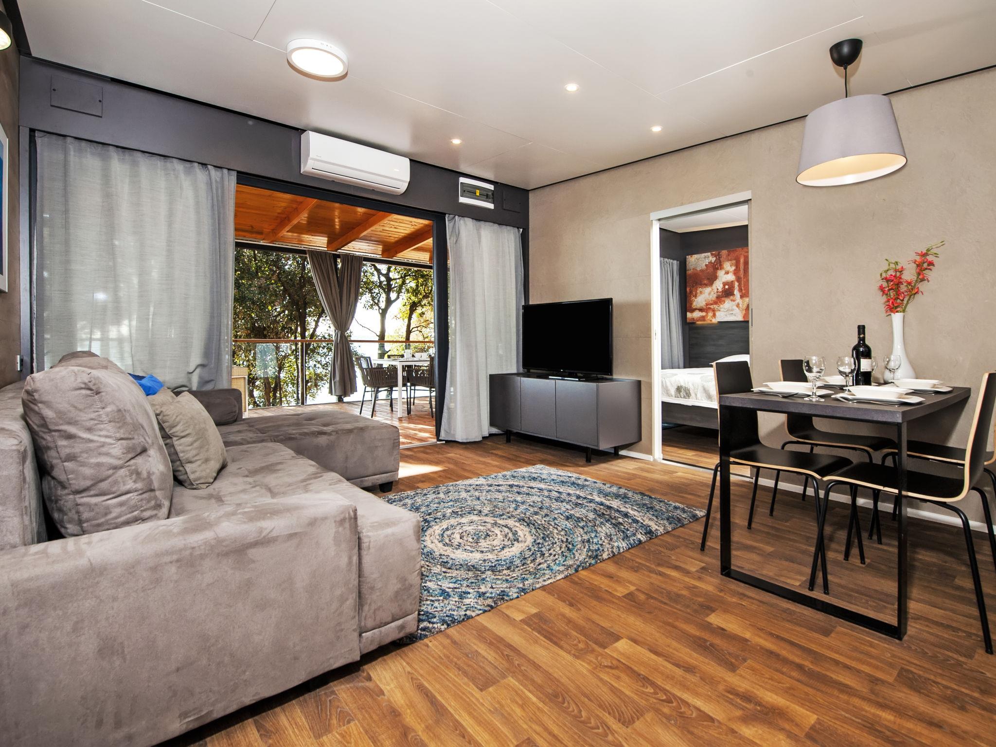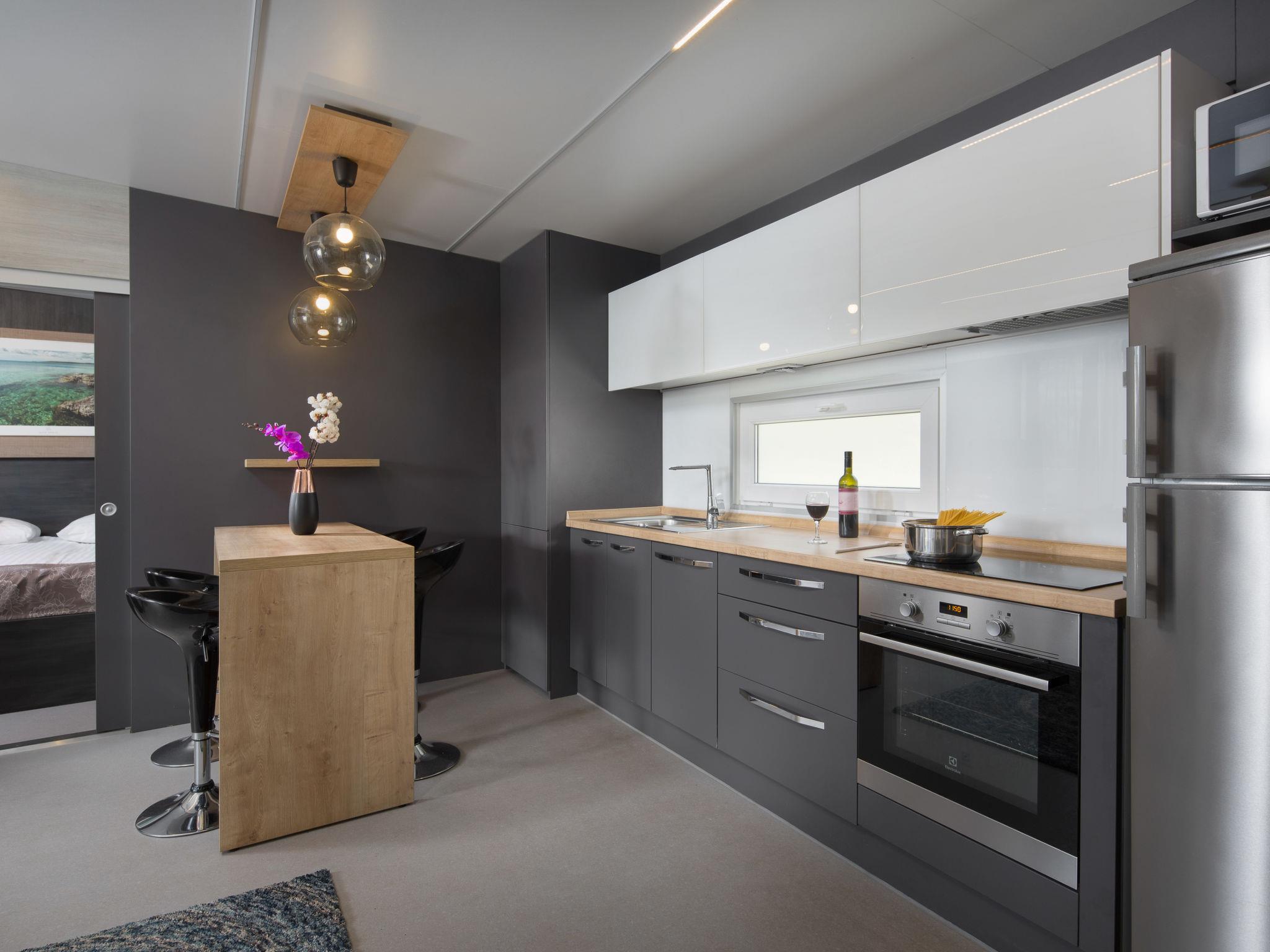 "Mobilhome Beach Villa", 3-room mobile home 50 m2. Living/dining room with 1 double sofabed and satellite TV (flat screen), air conditioning. Exit to the terrace. 1 room with 1 french bed. 1 room with 2 beds. Open kitchen (oven, dishwasher, 4 ceramic glass hob hotplates, microwave, electric coffee machine). 2 showers/WC. No heating option. Terrace 36 m2, roofed. Terrace furniture, deck chairs (2). Facilities: washing machine. Internet (WiFi, free). Please note: non-smoking house. Maximum 1 pet/ dog allowed.