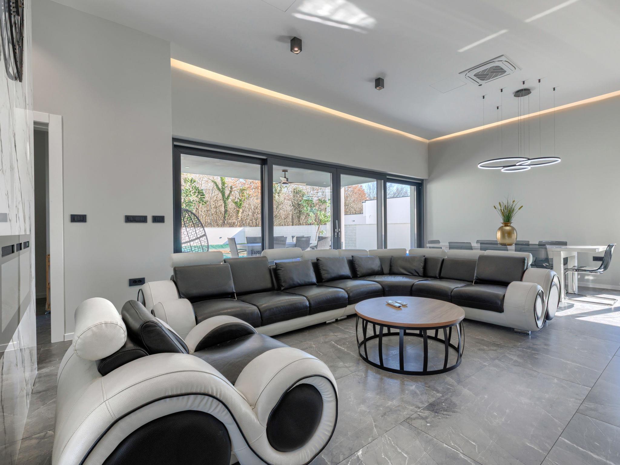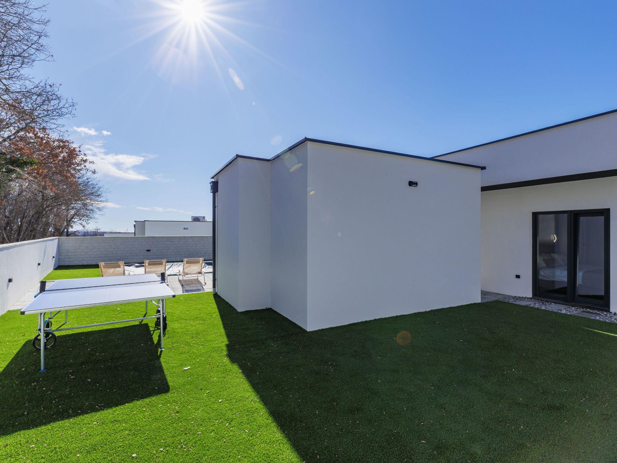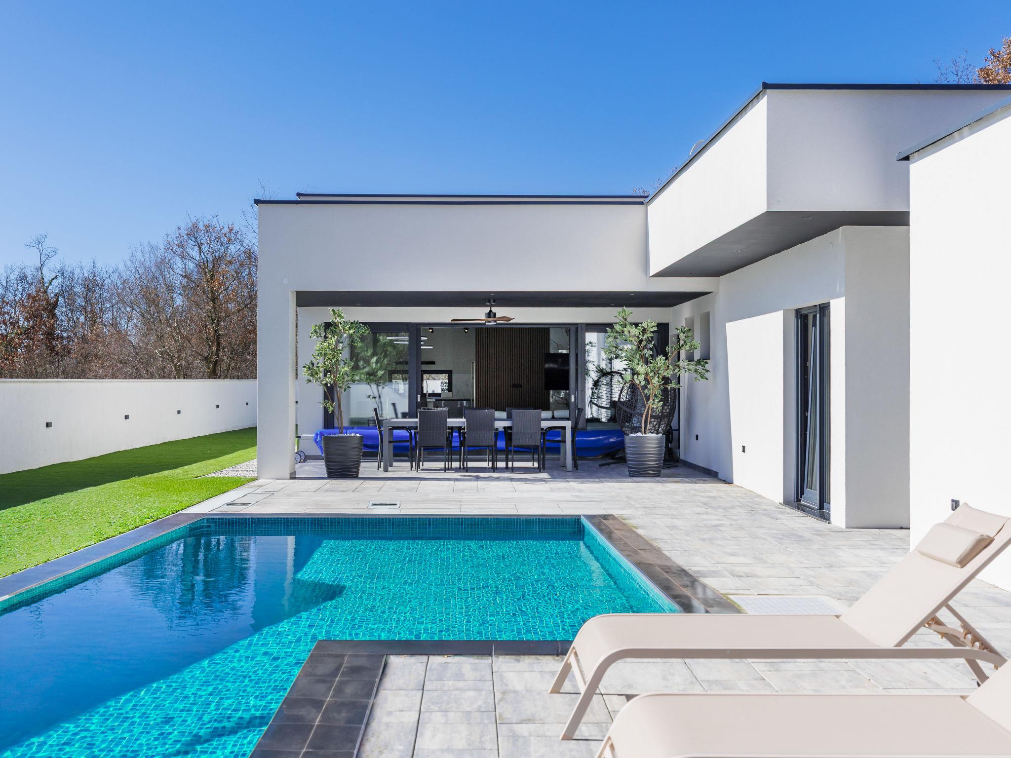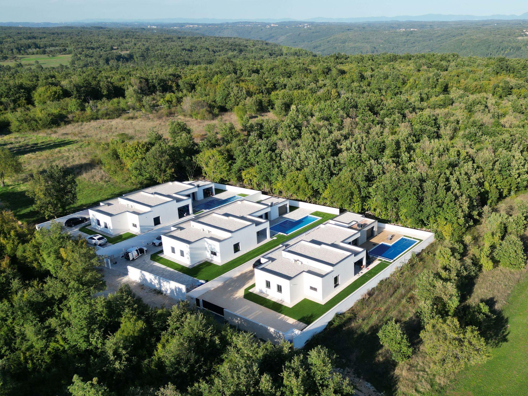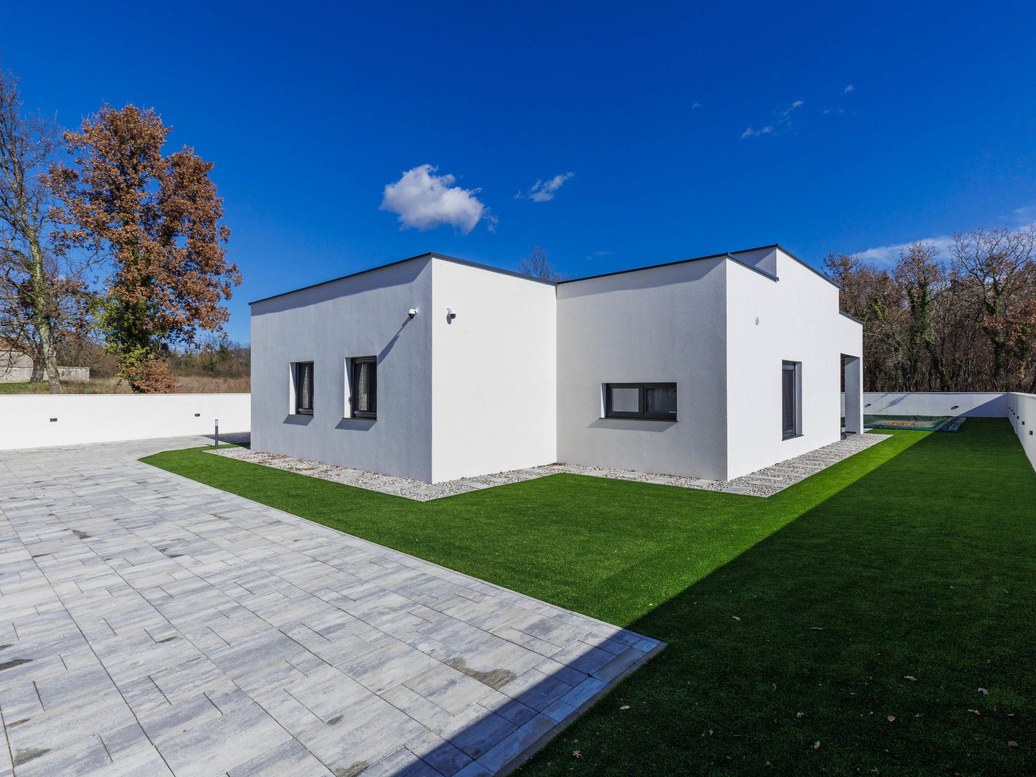 Modern villa "De Karlo", built in 2025. In the hamlet Ladici 9 km from the centre of Kanfanar, 26 km from the centre of Rovinj, 26 km from the sea. Private: property 908 m2 (fenced), swimming pool angular, heated (11 x 5 m, depth 140 cm, seasonal availability: 01.Mar. - 01.Dec.) with internal staircase and salt-electrolysis pool-cleaning system. Hot tub, pool house with fridge, shower and WC, table tennis, terrace (20 m2), garden furniture, barbecue. In the house: internet access, sauna, washing machine. Parking (for 4 cars) at the house on the premises. Shop 9 km, restaurant 5 km, bus stop 3 km, pebble beach 26 km. Groups of teenagers on request only. Swimming pool heated (extra). It is necessary to announce 7 days in advance if the pool heating is required.