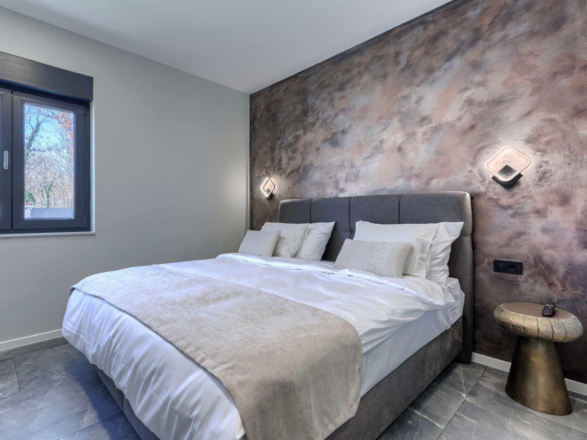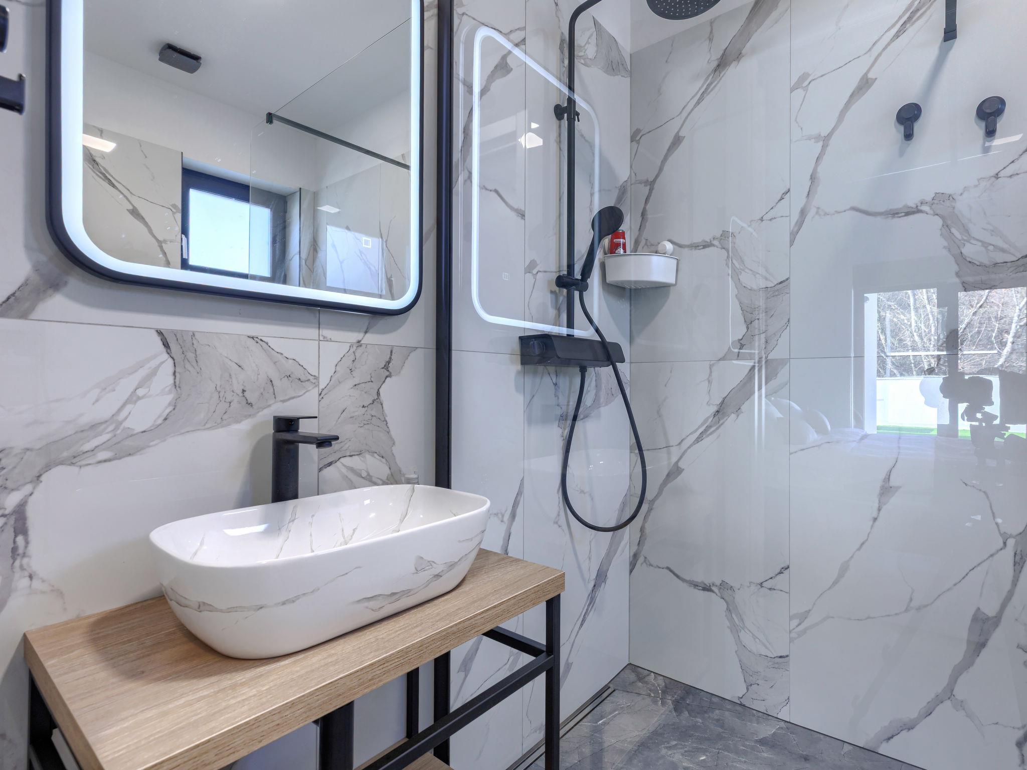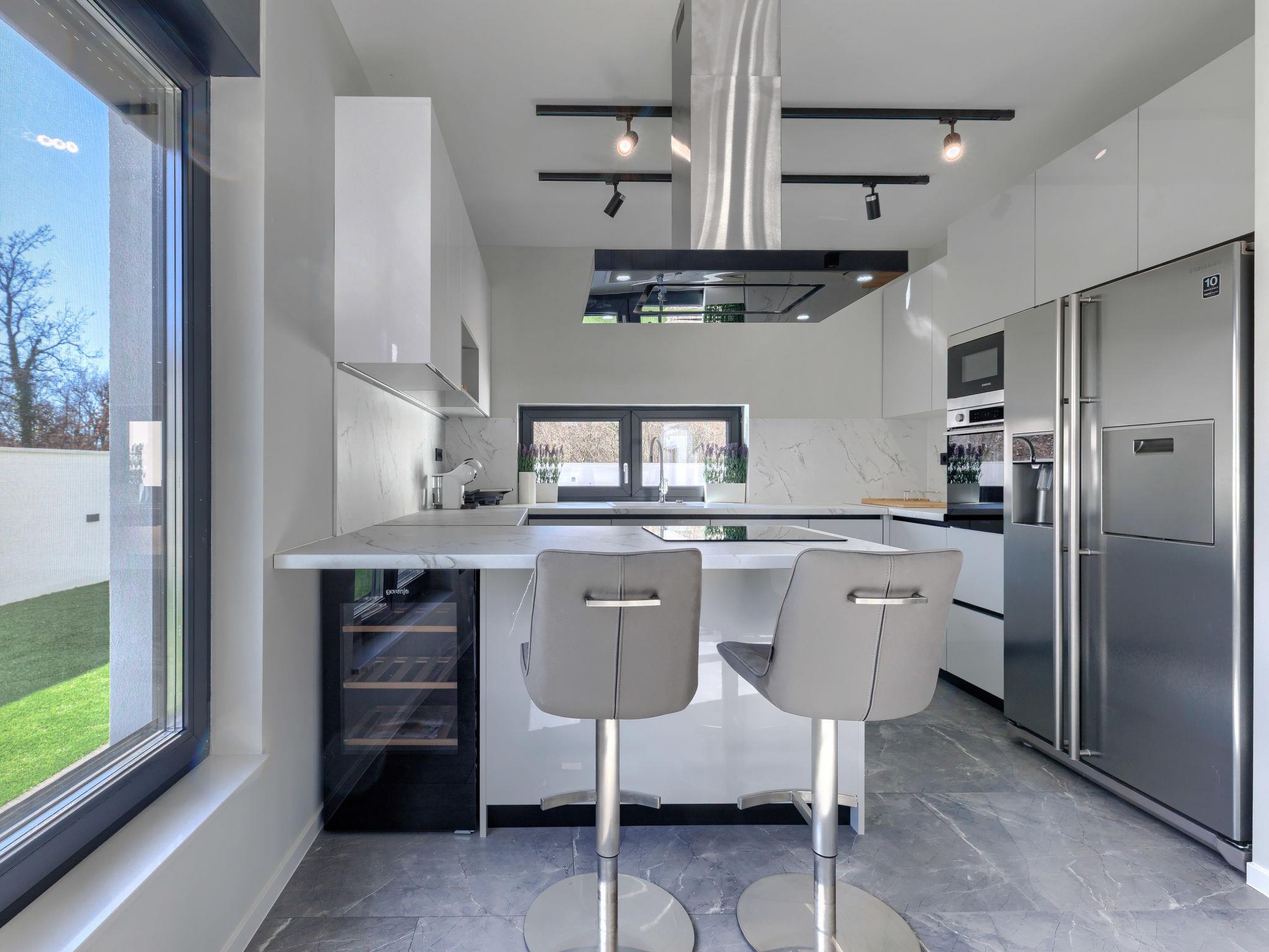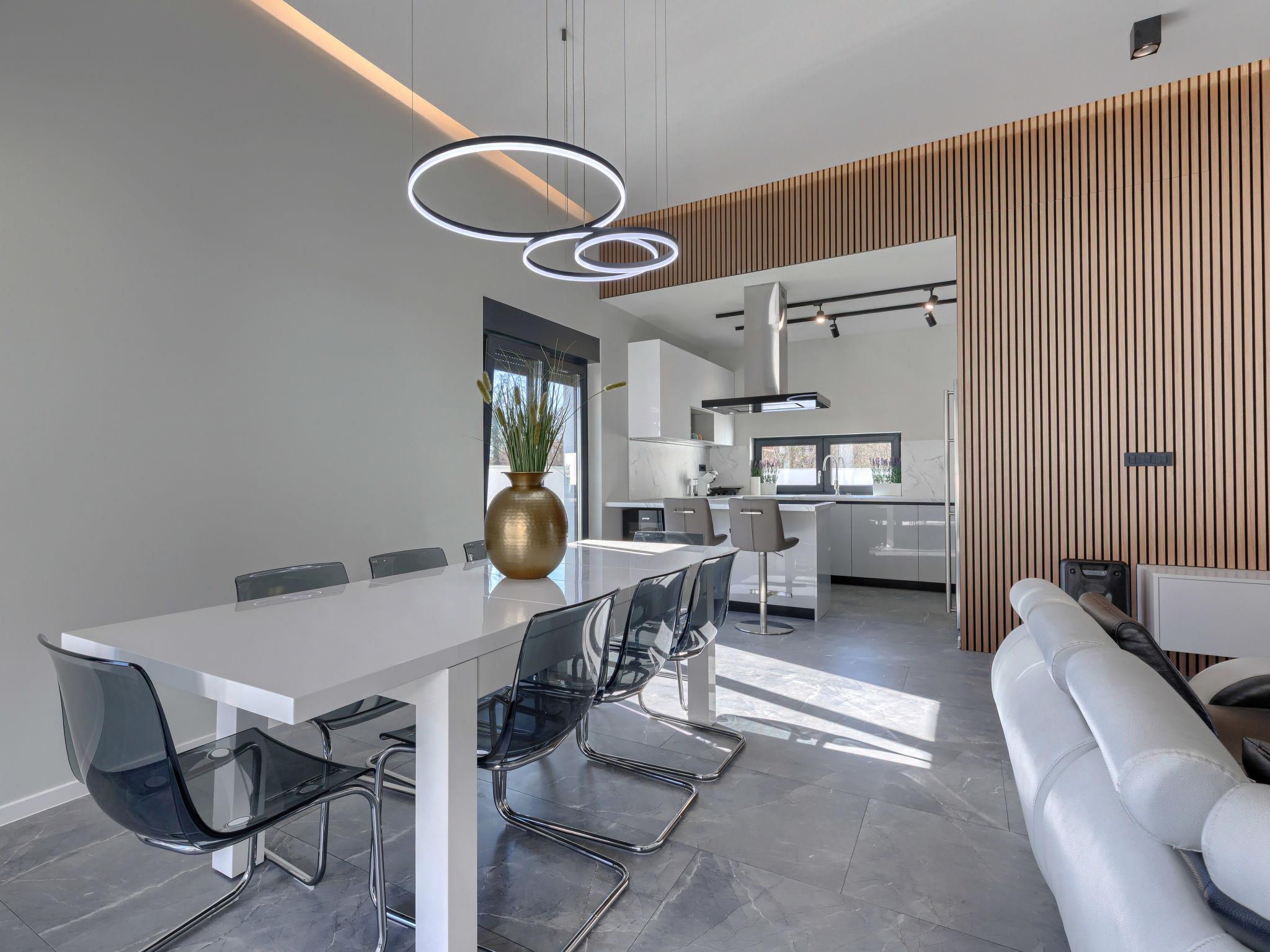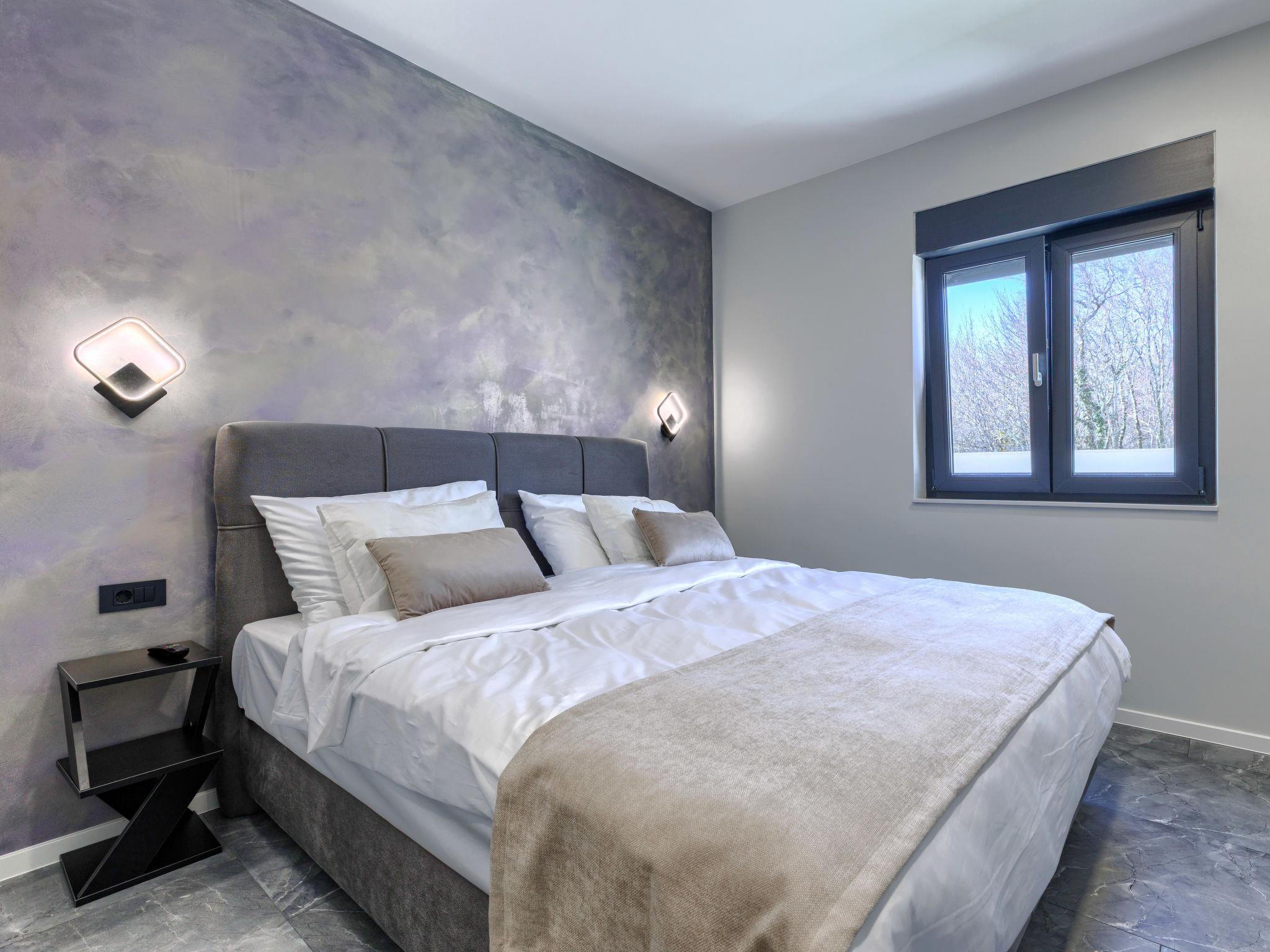 Modern villa "De Karlo", built in 2025. In the hamlet Ladici 9 km from the centre of Kanfanar, 26 km from the centre of Rovinj, 26 km from the sea. Private: property 908 m2 (fenced), swimming pool angular, heated (11 x 5 m, depth 140 cm, seasonal availability: 01.Mar. - 01.Dec.) with internal staircase and salt-electrolysis pool-cleaning system. Hot tub, pool house with fridge, shower and WC, table tennis, terrace (20 m2), garden furniture, barbecue. In the house: internet access, sauna, washing machine. Parking (for 4 cars) at the house on the premises. Shop 9 km, restaurant 5 km, bus stop 3 km, pebble beach 26 km. Groups of teenagers on request only. Swimming pool heated (extra). It is necessary to announce 7 days in advance if the pool heating is required.