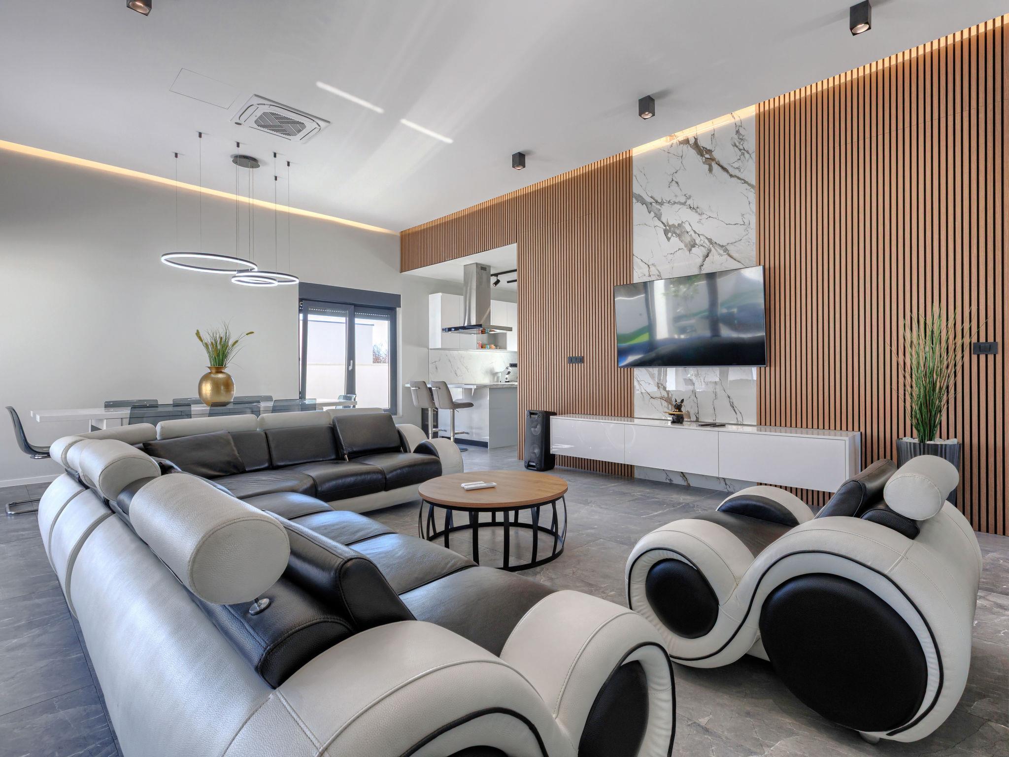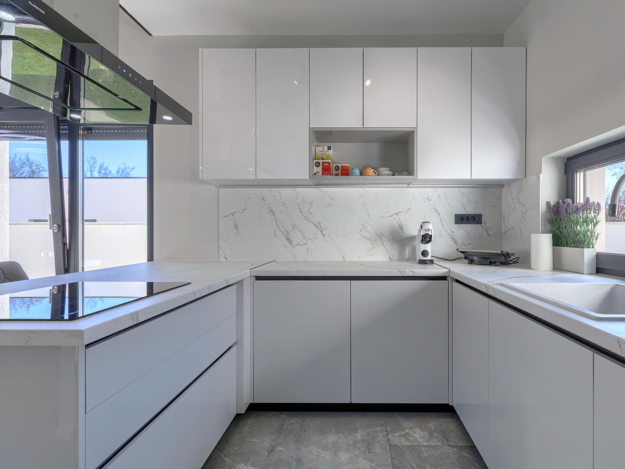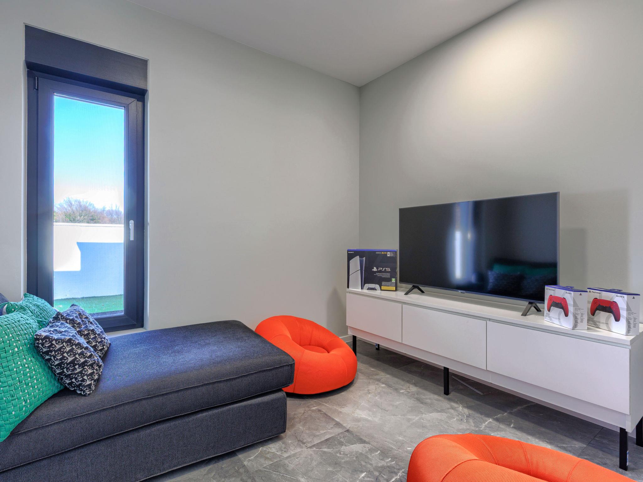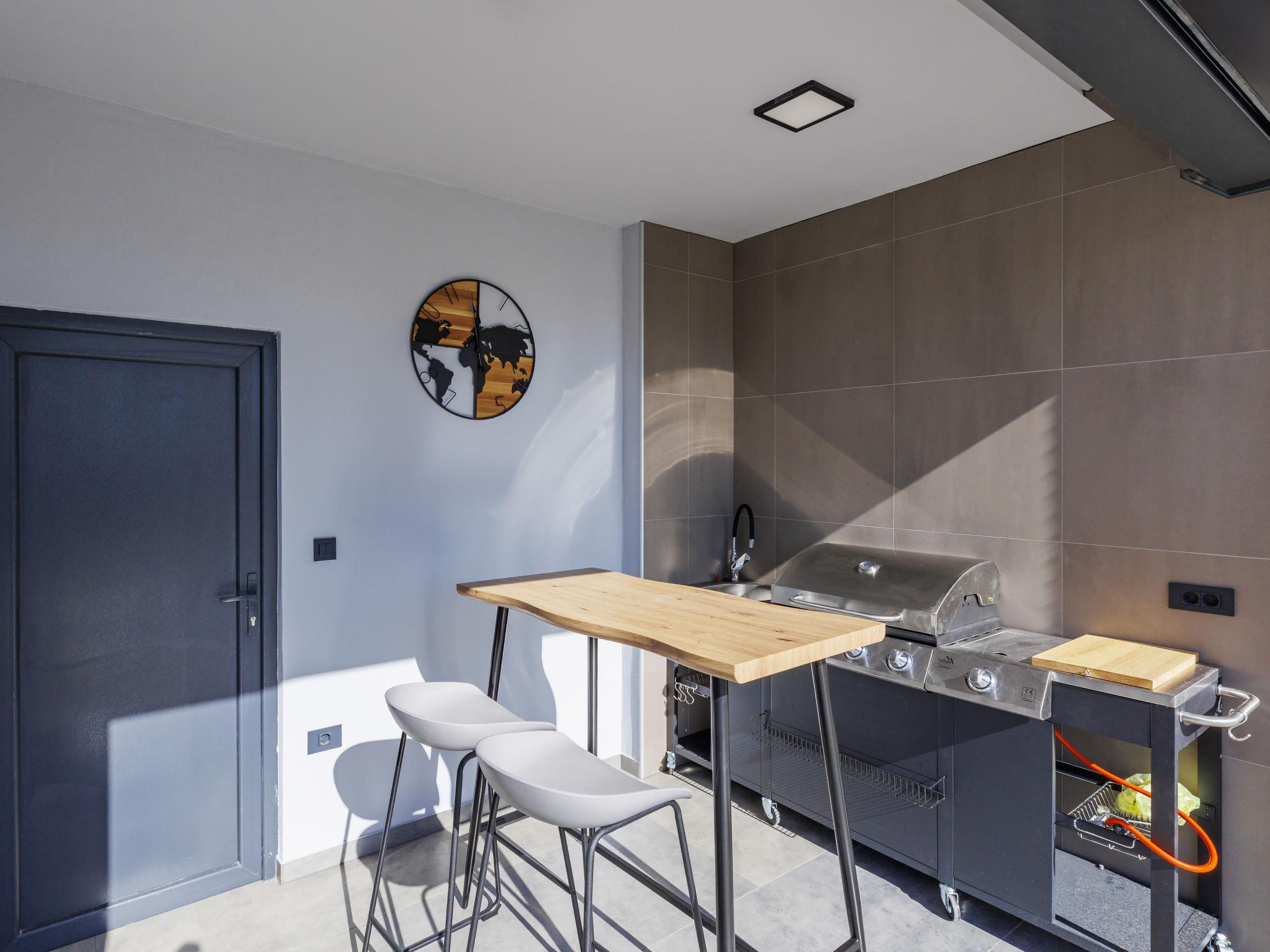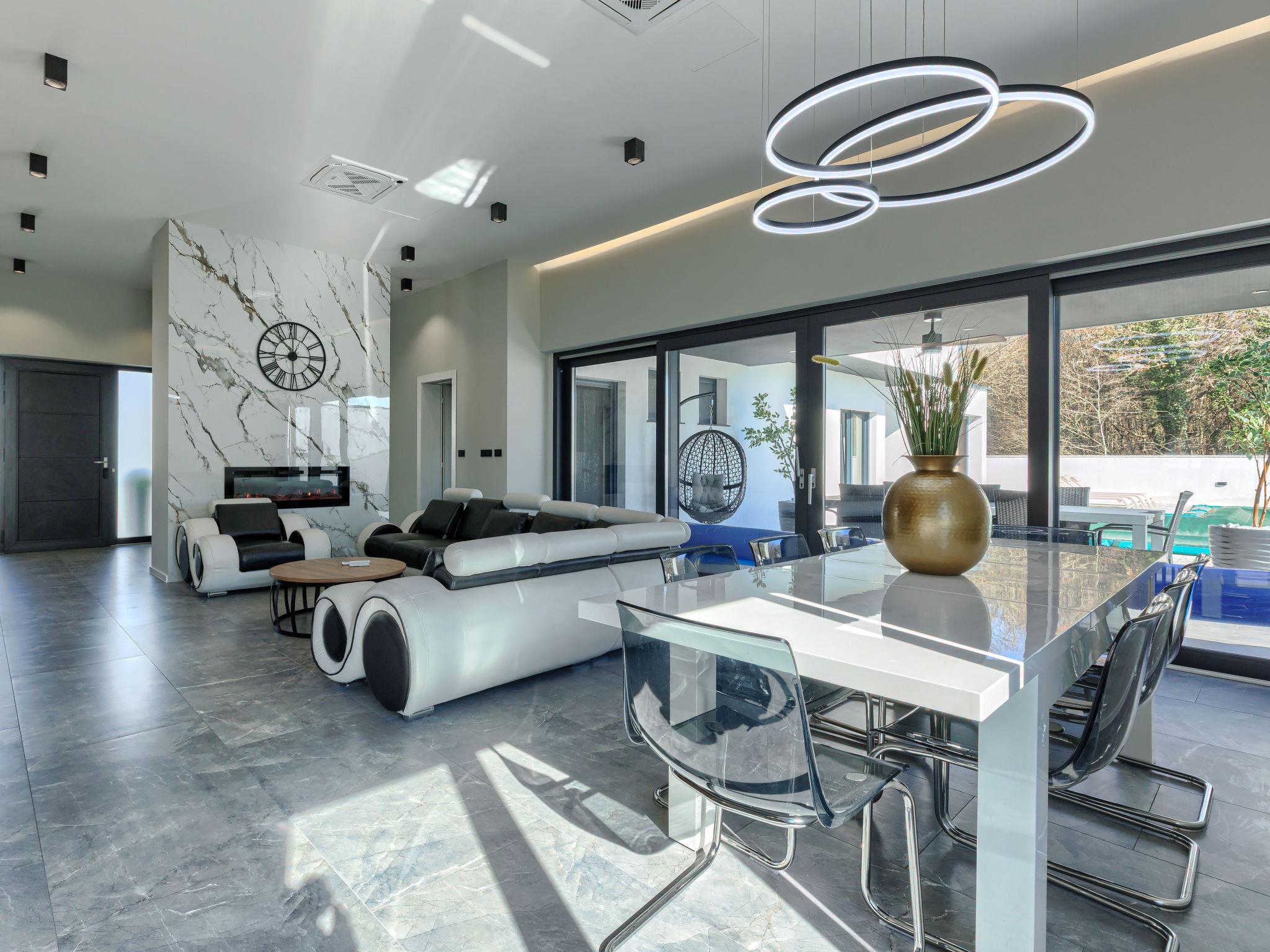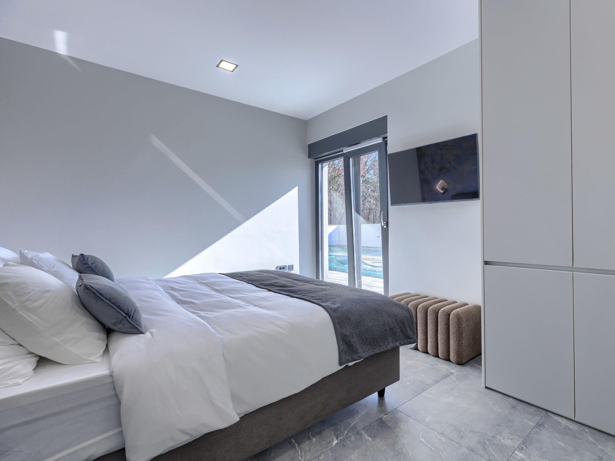 Modern villa "De Karlo", built in 2025. In the hamlet Ladici 9 km from the centre of Kanfanar, 26 km from the centre of Rovinj, 26 km from the sea. Private: property 908 m2 (fenced), swimming pool angular, heated (11 x 5 m, depth 140 cm, seasonal availability: 01.Mar. - 01.Dec.) with internal staircase and salt-electrolysis pool-cleaning system. Hot tub, pool house with fridge, shower and WC, table tennis, terrace (20 m2), garden furniture, barbecue. In the house: internet access, sauna, washing machine. Parking (for 4 cars) at the house on the premises. Shop 9 km, restaurant 5 km, bus stop 3 km, pebble beach 26 km. Groups of teenagers on request only. Swimming pool heated (extra). It is necessary to announce 7 days in advance if the pool heating is required.