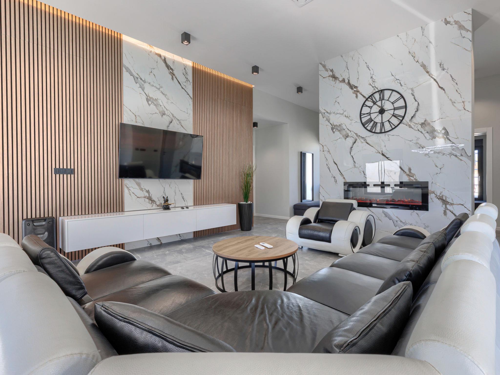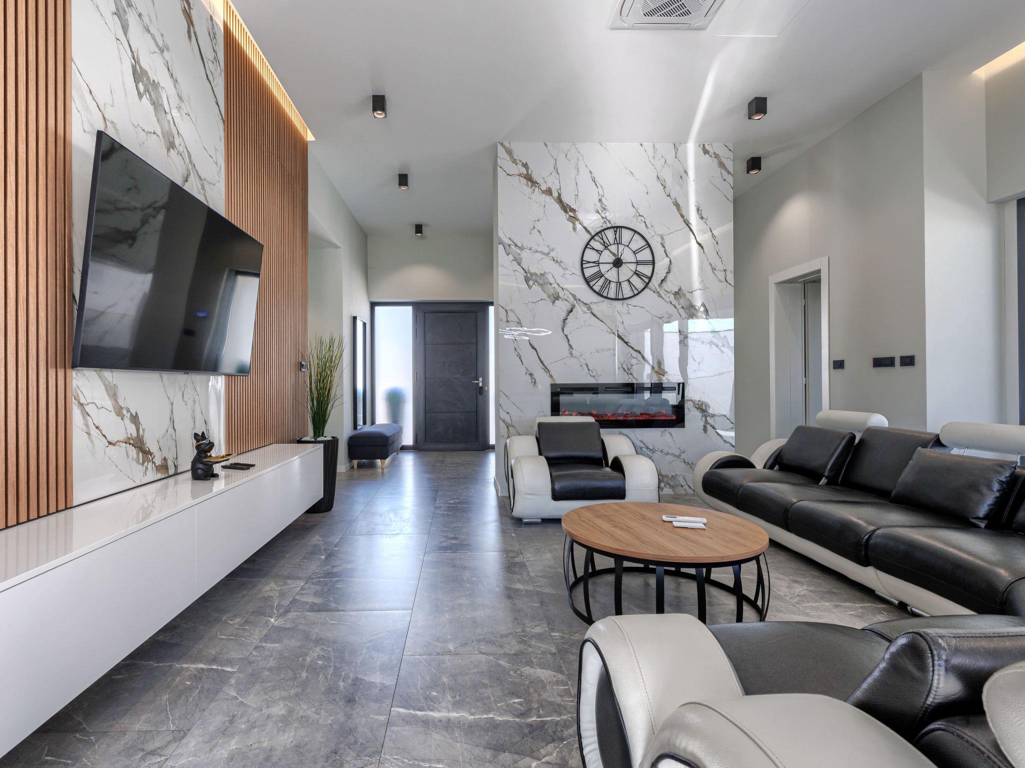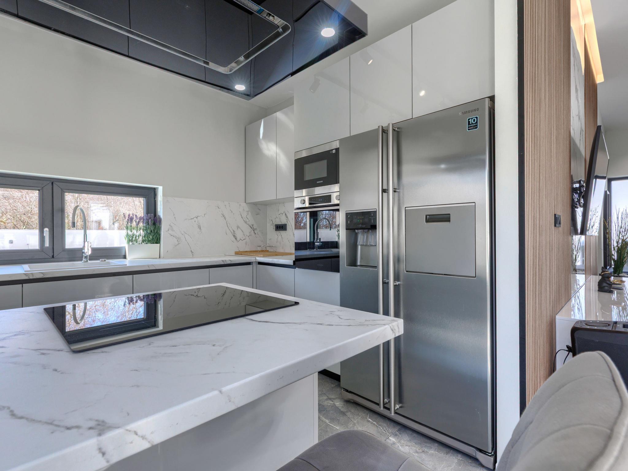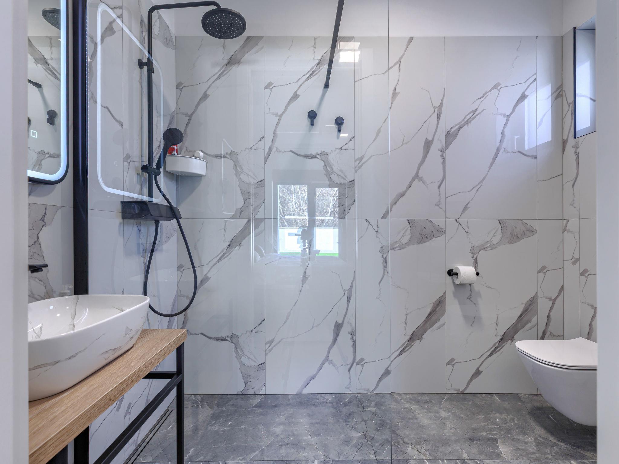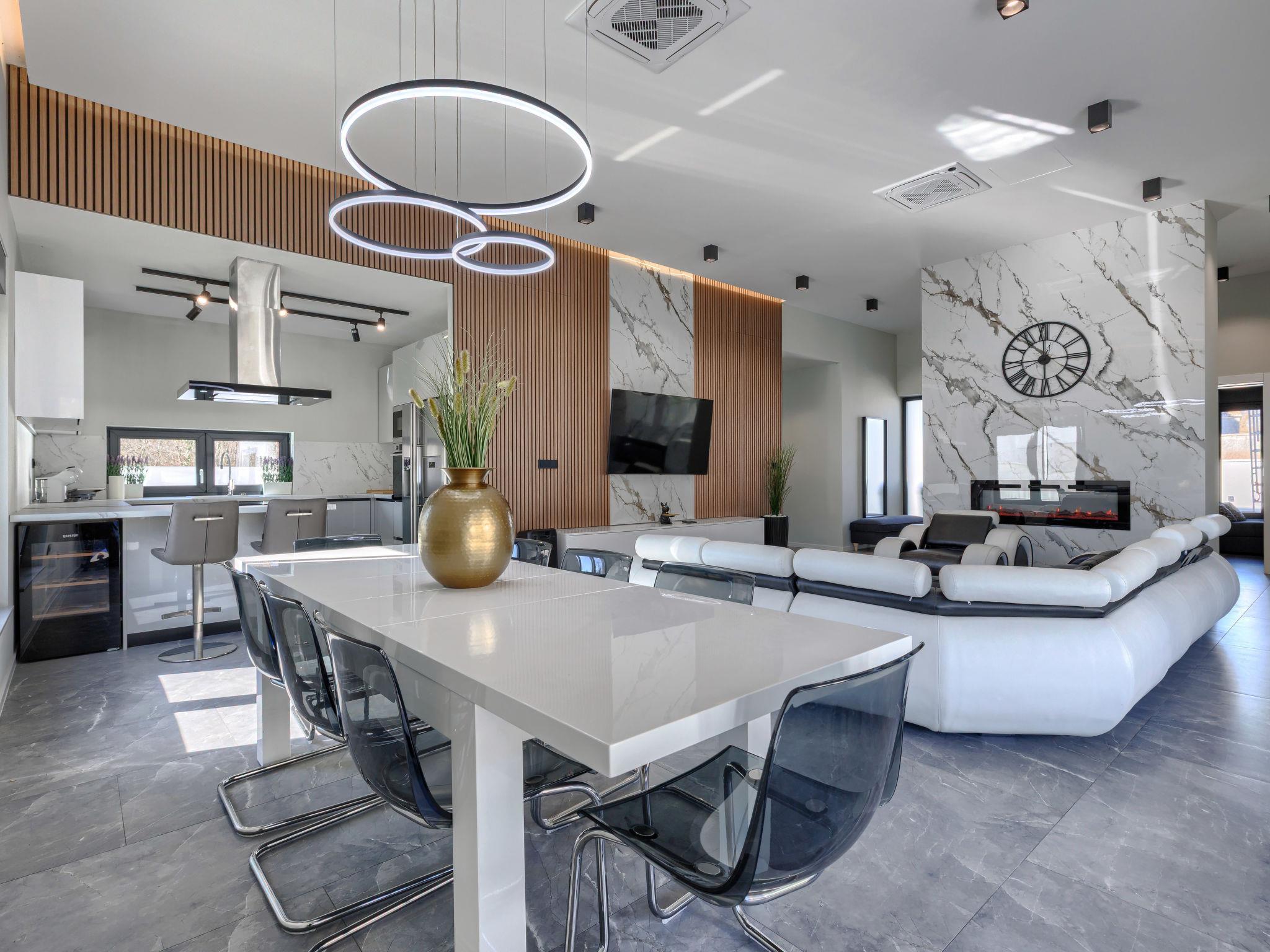 Modern villa "De Karlo", built in 2025. In the hamlet Ladici 9 km from the centre of Kanfanar, 26 km from the centre of Rovinj, 26 km from the sea. Private: property 908 m2 (fenced), swimming pool angular, heated (11 x 5 m, depth 140 cm, seasonal availability: 01.Mar. - 01.Dec.) with internal staircase and salt-electrolysis pool-cleaning system. Hot tub, pool house with fridge, shower and WC, table tennis, terrace (20 m2), garden furniture, barbecue. In the house: internet access, sauna, washing machine. Parking (for 4 cars) at the house on the premises. Shop 9 km, restaurant 5 km, bus stop 3 km, pebble beach 26 km. Groups of teenagers on request only. Swimming pool heated (extra). It is necessary to announce 7 days in advance if the pool heating is required.