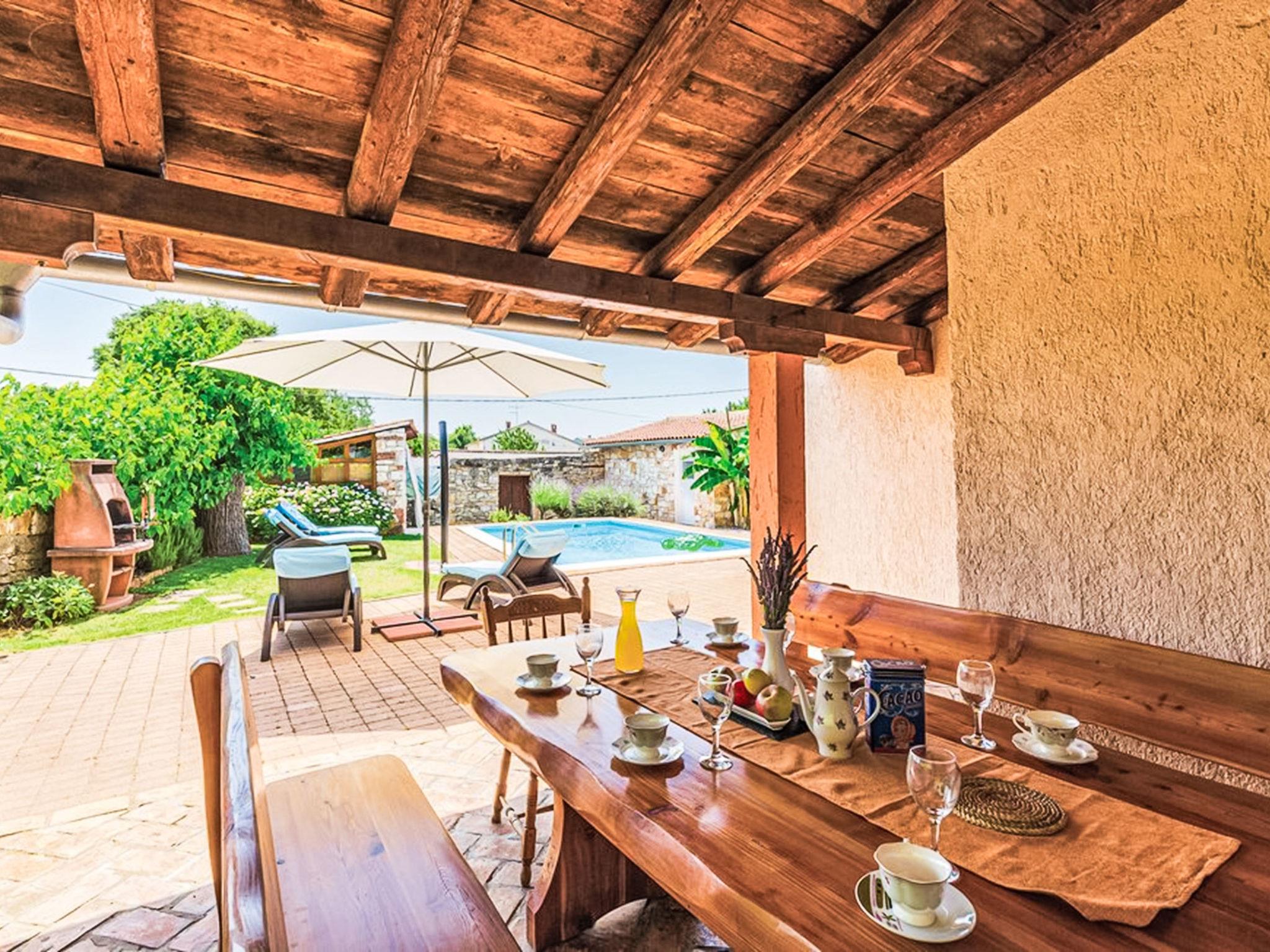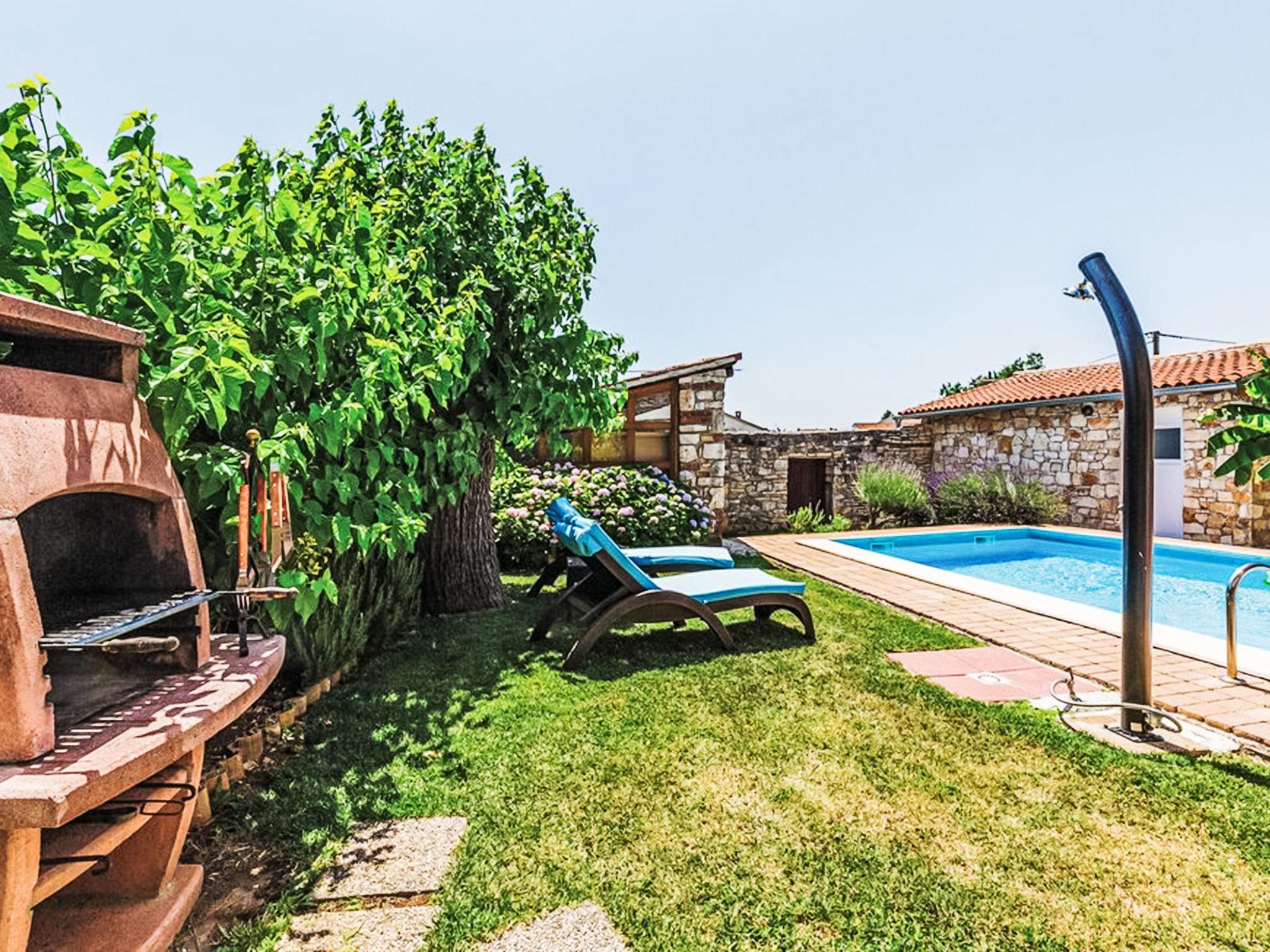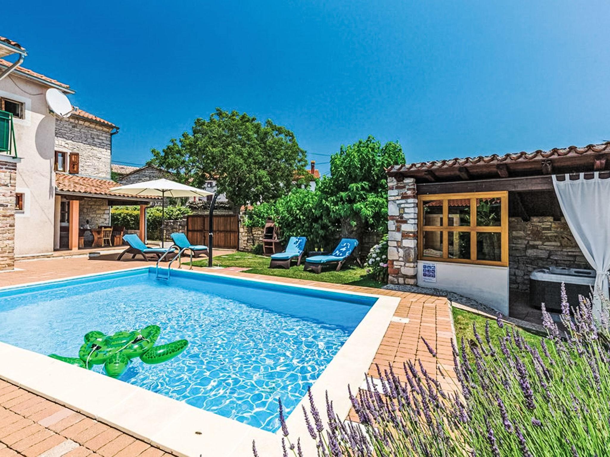 Rovinjsko Selo 6 km from Rovinj: Cosy semi-detached house "Matohanci", 3 storeys. In the hamlet Matohanci 4 km from the centre of Rovinjsko Selo, 7 km from the centre of Kanfanar, in a quiet, sunny position, 10 km from the sea. Private: property 300 m2 (fenced) with wildlife garden, swimming pool angular (7 x 4 m, depth 110 - 135 cm, seasonal availability: 01.May. - 30.Sep.). Outdoor shower, hot tub, terrace (12 m2), garden furniture, barbecue. In the house: internet access. Parking (for 2 cars) at the house. Supermarket 4 km, restaurant 50 m, bus stop 1 km, pebble beach 10 km, rocky beach 10 km. Walking paths from the house 50 m, cycle lane 100 m. Nearby attractions: Lim Bay 6 km. The owner does not accept any youth groups. Please note: the owner lives on the same property. Airfield 48 km from the property.