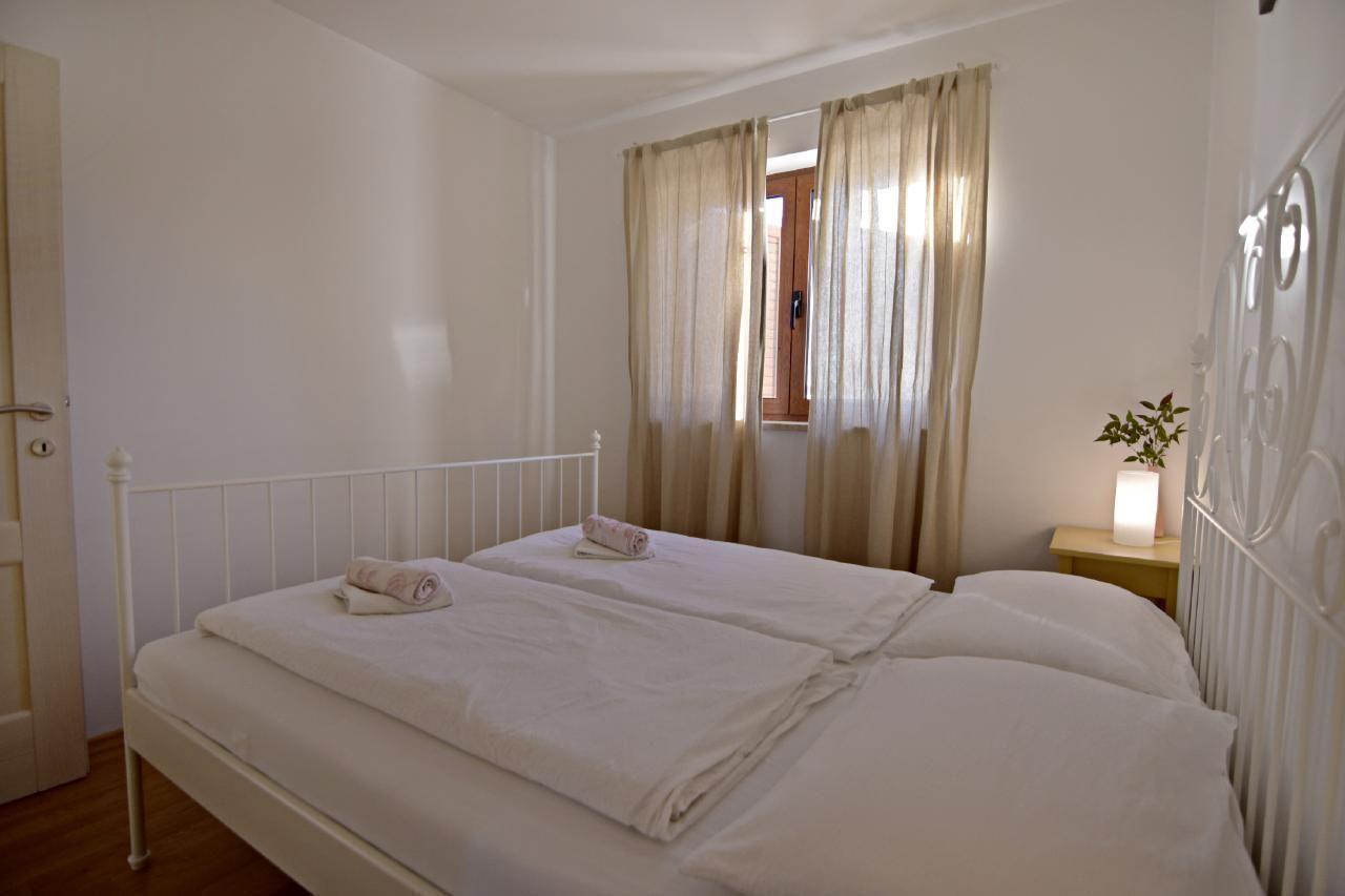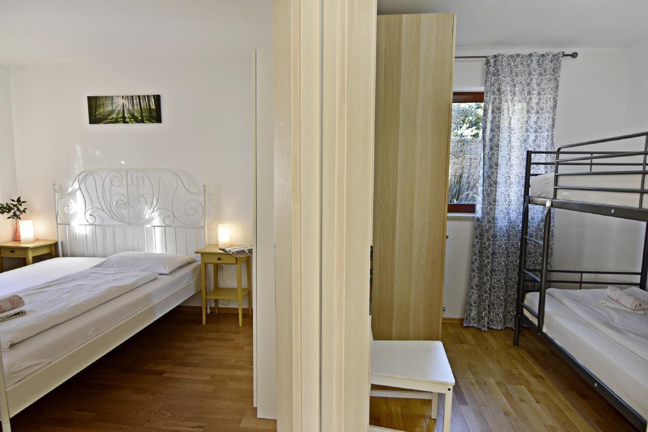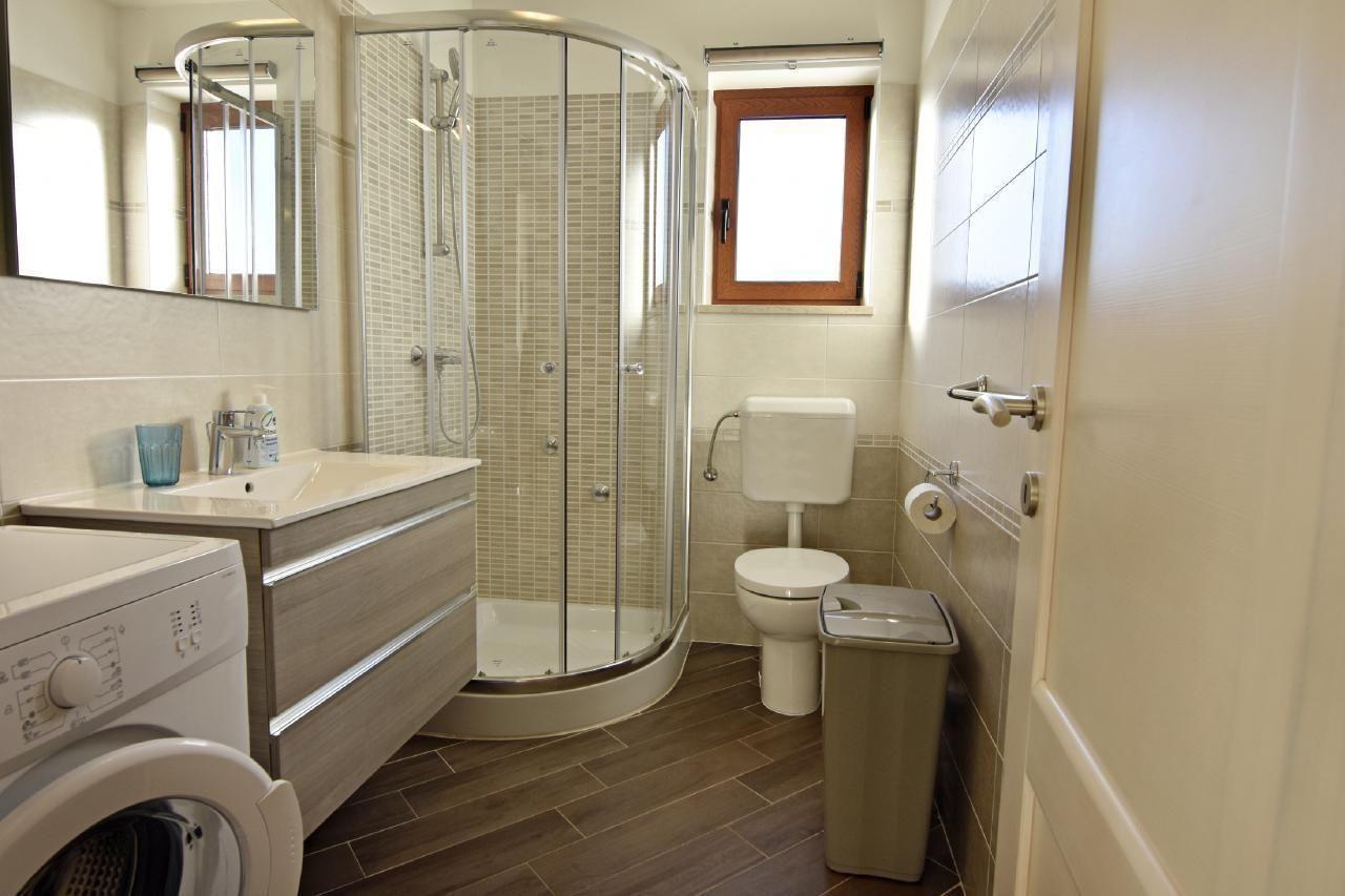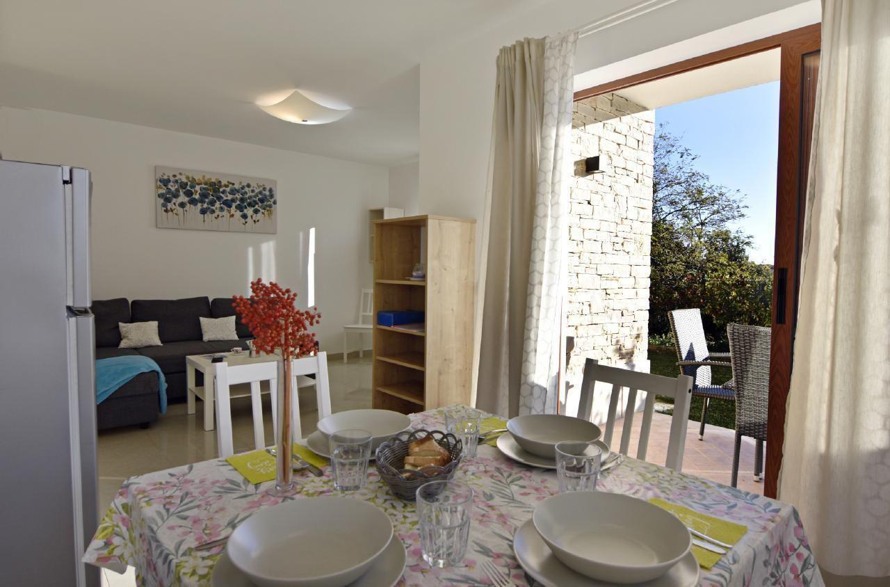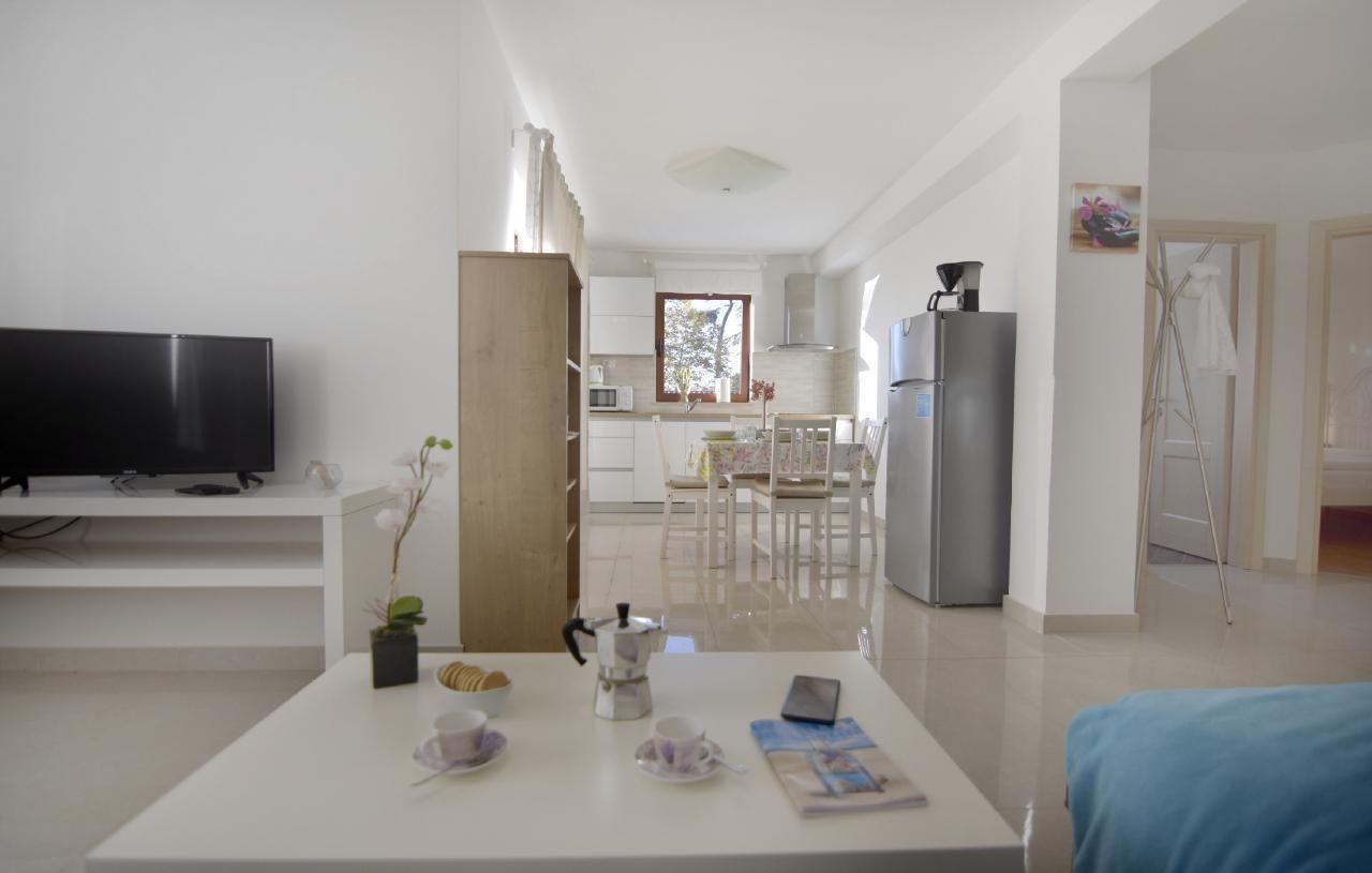 The flat is located on the ground floor of the house and has a bedroom with double bed (160 x 200), wardrobe, safe, a bedroom with bunk bed (2 x 80 x 200), wardrobe, in the living room the sofa bed (150 x 200), bed linen is provided (weekly change), flat screen satellite TV, coffee table, bathroom with shower, sink, washing machine, hairdryer, two towels per person for the bathroom are provided (weekly change), eat-in kitchen with dishwasher, microwave, 4 electric ceramic hobs, fridge with freezer compartment, kettle, coffee machine, dining table and chairs, free Wi-Fi, air conditioning, the kitchen leads onto the terrace (7 m 2) which is furnished with table and chairs A small private garden with views of the countryside. Ideal for enjoying coffee in the morning and admiring the surrounding nature or playing with the children.