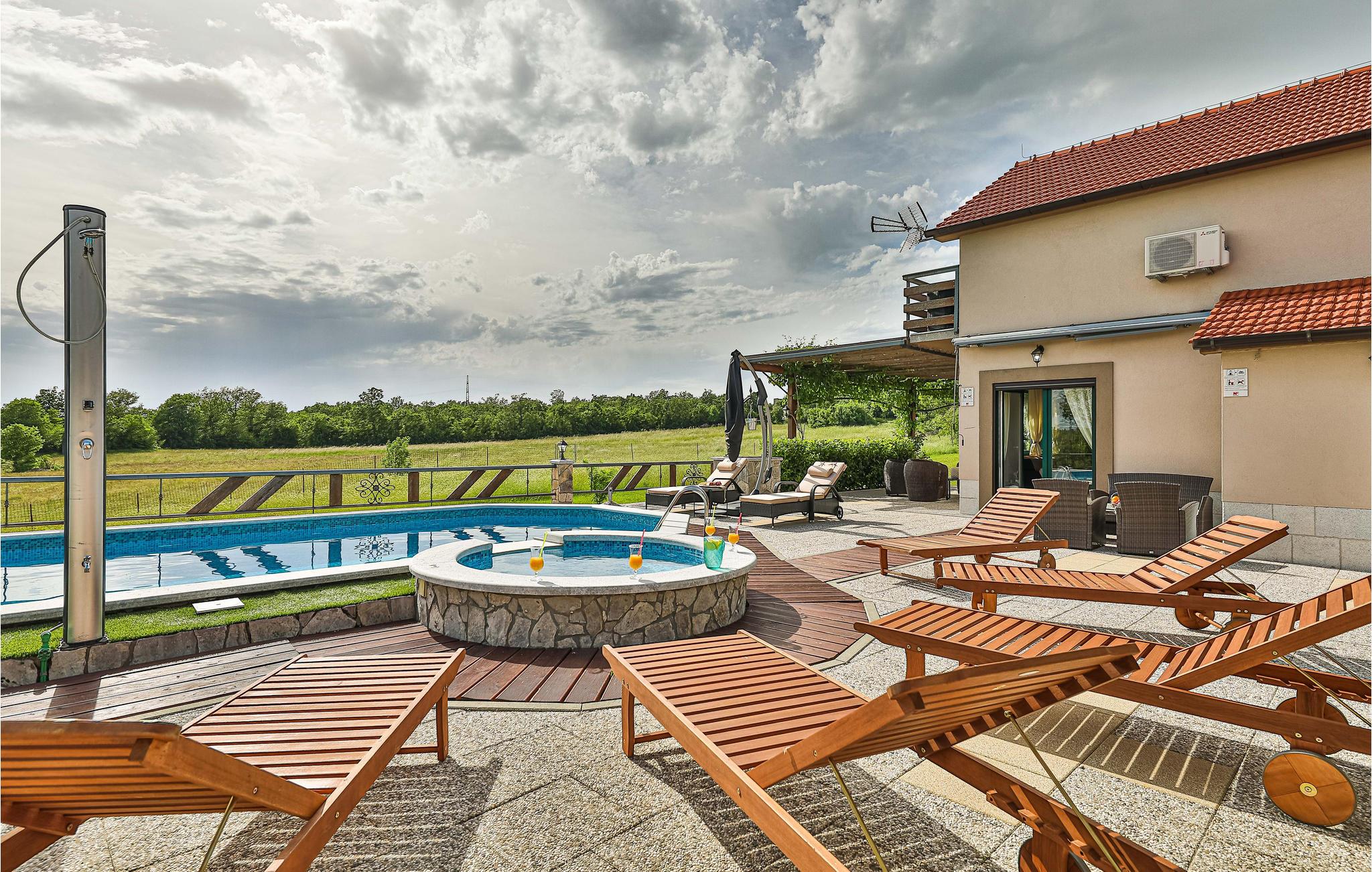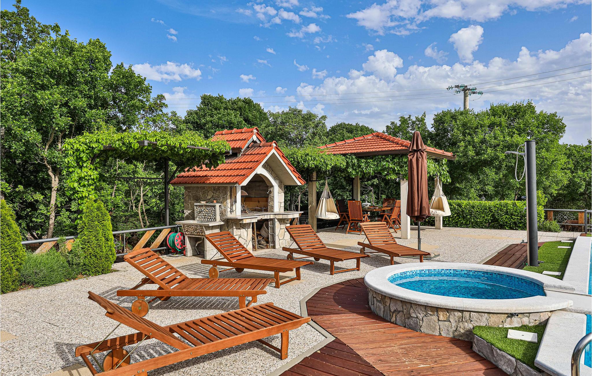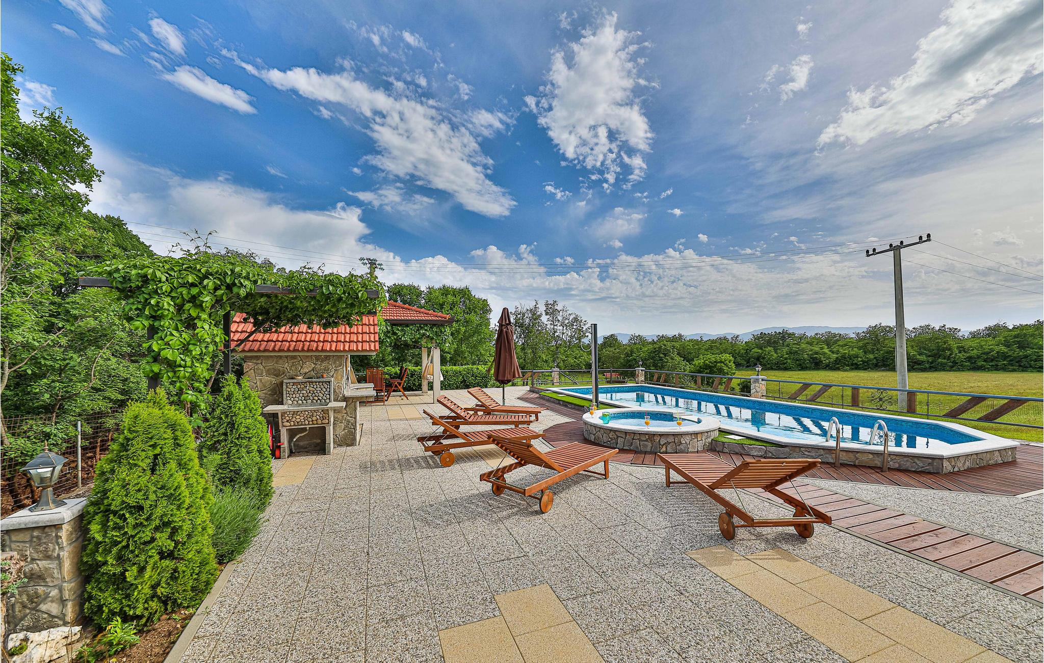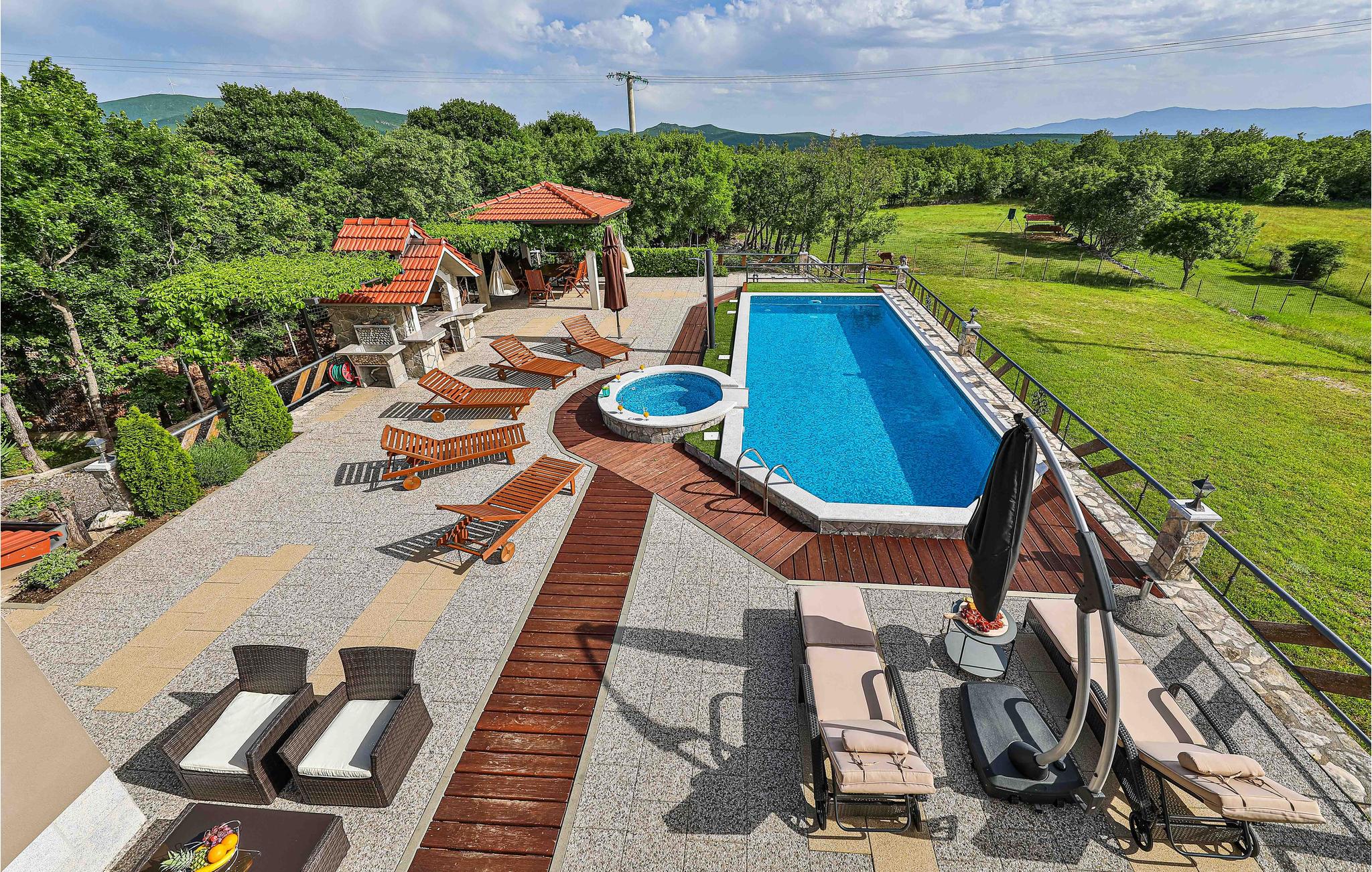 Dieses fantastische Ferienhaus mit Pool liegt auf einem ca. 26.000 m² großen Grundstück und neben vielen Ausstattungs-Highlights ist die absolute Besonderheit der wunderbare Blick auf die bergige Naturlandschaft. Hier verbringen Sie einen Urlaub im Grünen, wo Sie viel frische Luft tanken und Ihre Privatsphäre genießen können. Der Innenbereich besteht aus einer Wohnküche mit Essbereich und einem Badezimmer im Erdgeschoss, während im Obergeschoss drei Schlafzimmer und ein weiteres Badezimmer sind. Im gepflegten Garten erwartet Sie ein großer Pool, Whirlpool, Pavillon, Grillplatz sowie Kinderspielgeräte für die kleinen Gäste. Der Eigentümer bietet Führungen durch seinen eigenen Tierpark an.