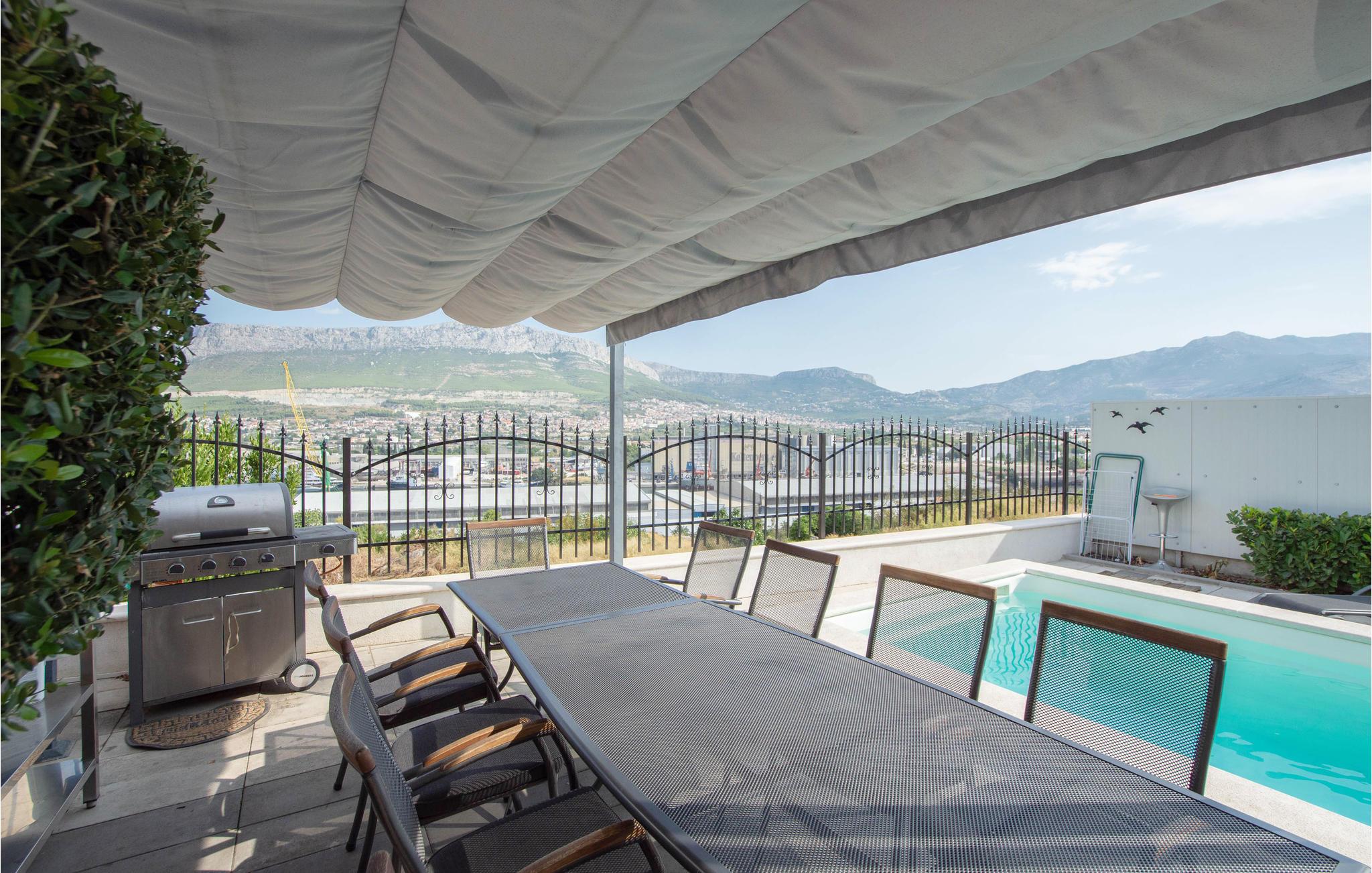 Freuen Sie sich auf einen besonders schönen Urlaub in diesem erstklassigen Ferienhaus in Split. Die gut ausgestatteten Zimmer sind stilvoll und modern eingerichtet. Das Haus liegt in schöner Lage mit Blick auf die bergige Umgebung der Stadt. Die teilweise überdachte Terrasse ist ein wunderbarer Ort für Ruhe und Erholung. Hier können Sie den großartigen Blick und die Mahlzeiten im Freien genießen. Entspannen Sie sich auf den Sonnenliegen bei einem eisgekühlten Getränk und springen Sie in den Pool, wenn Sie sich erfrischen möchten. Lassen Sie auf der Terrasse den Tag ausklingen, während Sie ein Glas Wein und das Lichtspiel der Sonne auf den Bergen genießen.