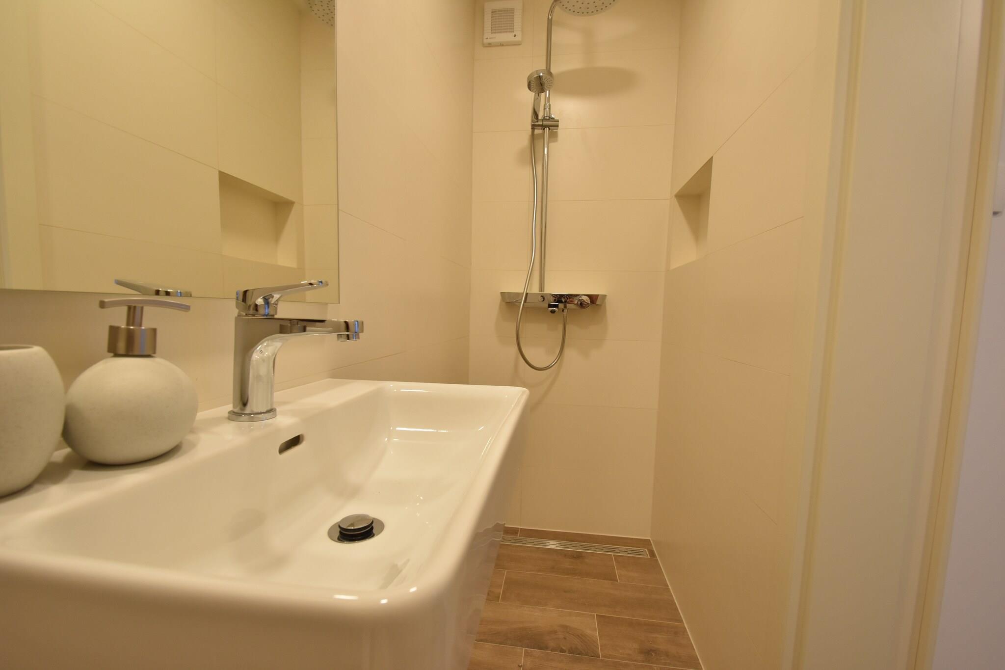 Ground floor: (Bedroom with bathroom(double bed(twin duvet), TV(flatscreen, satellite, dutch television channels, international television channels), shower, washbasin, toilet), terrace(private, fenced), garden furniture) Basement: (Living room(double sofa bed, TV(flatscreen, satellite, dutch television channels, international television channels), dining table(10 persons), fireplace, seating area, air conditioning), open kitchen(electric kettle, cooker(4 ring stoves, ceramic), hood, coffee machine(pads), oven, microwave, dishwasher, fridge-freezer), bathroom(shower, washbasin, toilet, washing machine)) garage, heating(electric), air conditioning, parking