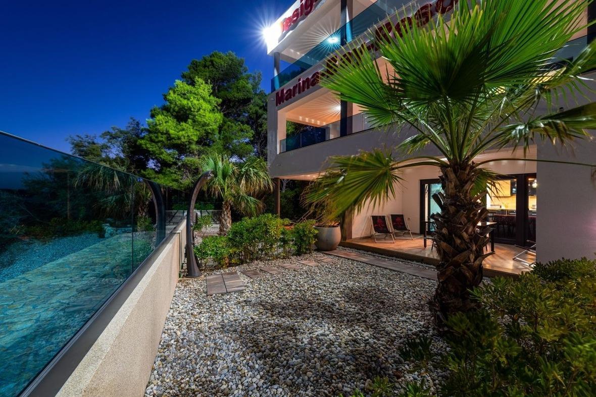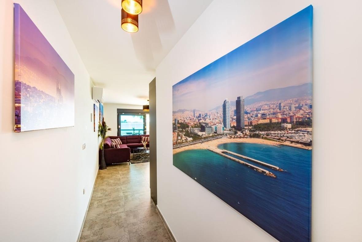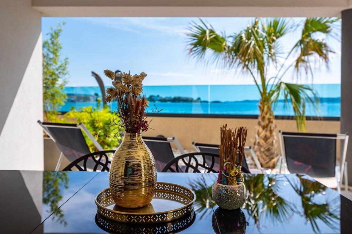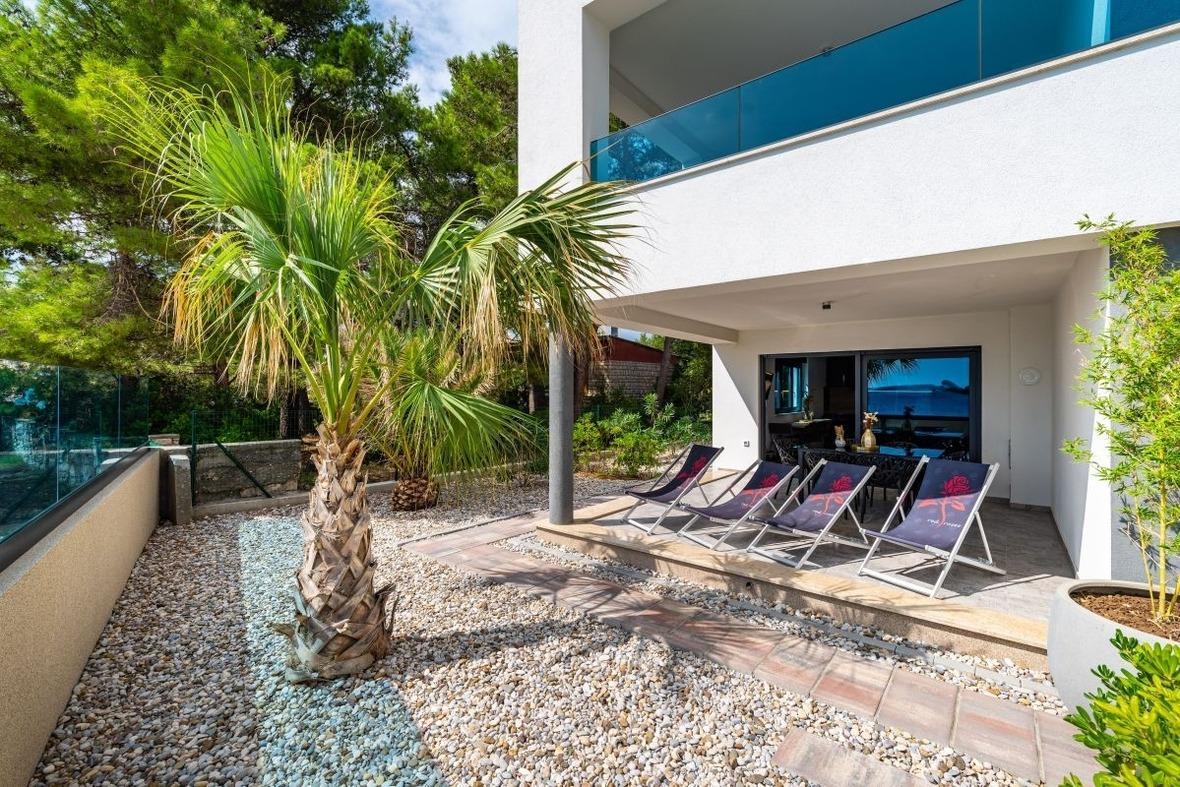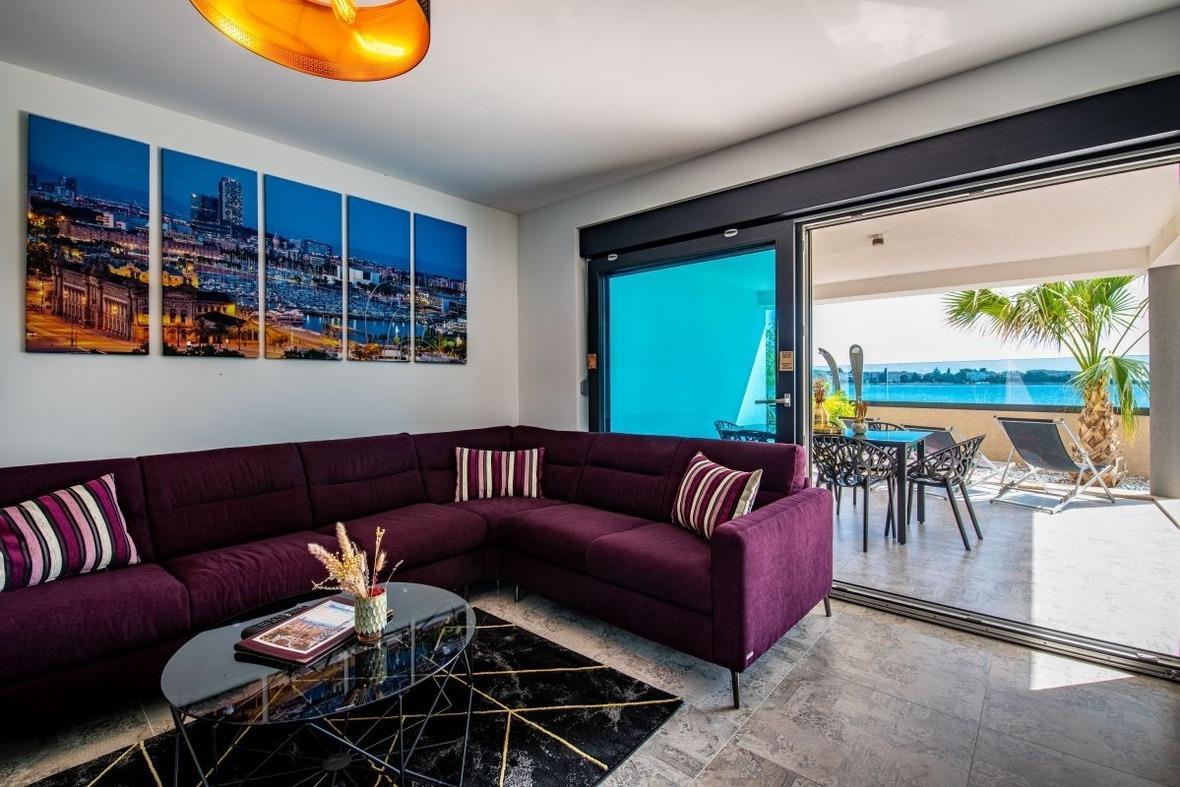 Designer Apartment mit Designerausstattung von Natuzzi, mit eigenem Garten direkt am Meer mit feinkörnigem Strand, welcher flach abfallend ist.