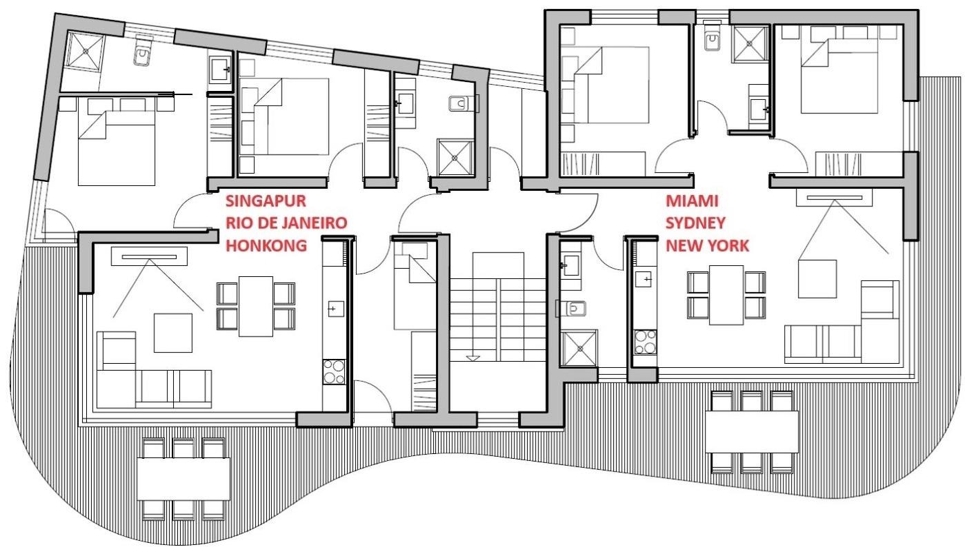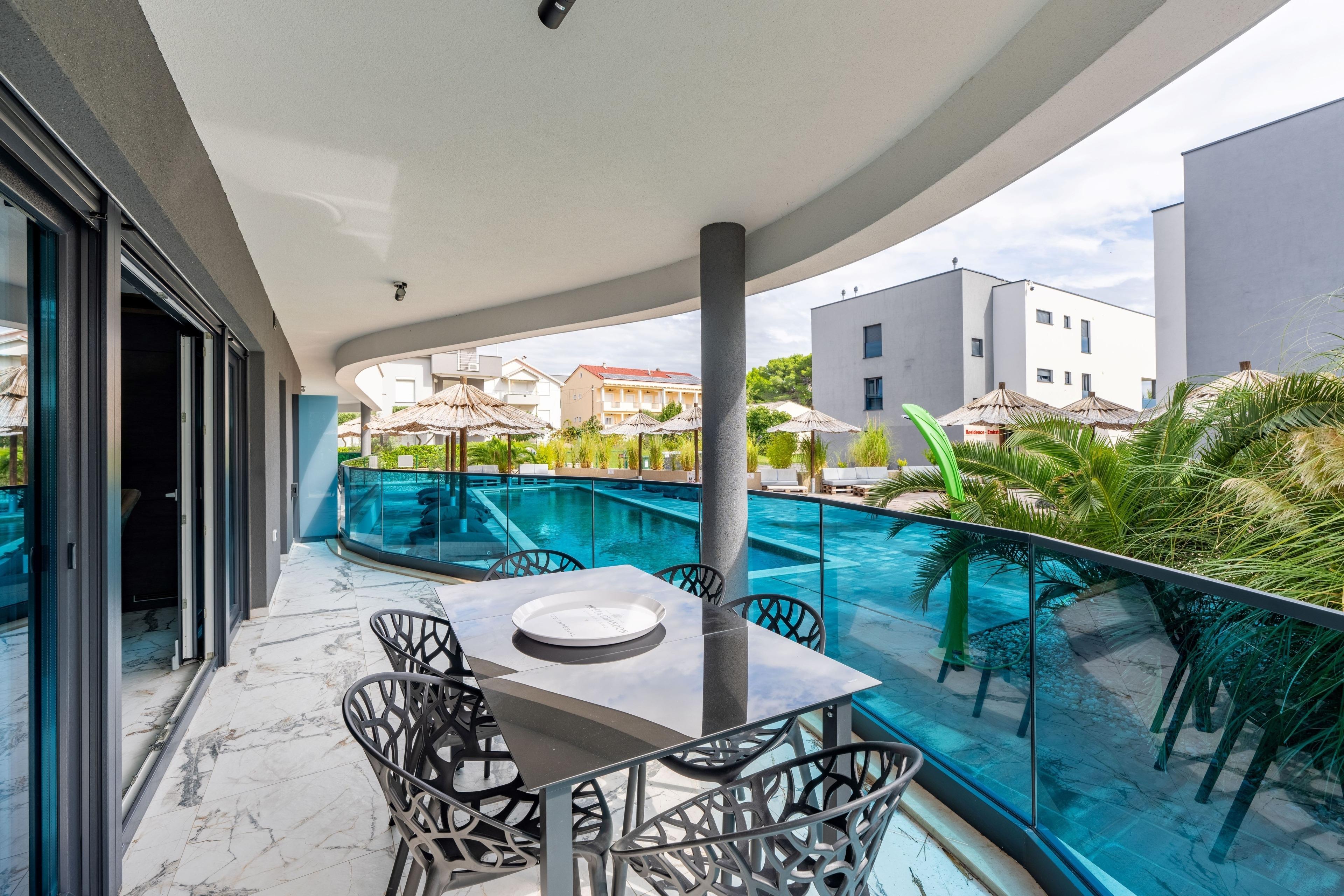 Designer Apartment mit Designerausstattung von Natuzzi, mit Terrasse direkt am Meer am feinkörnigem Strand, welcher flach abfallend ist.