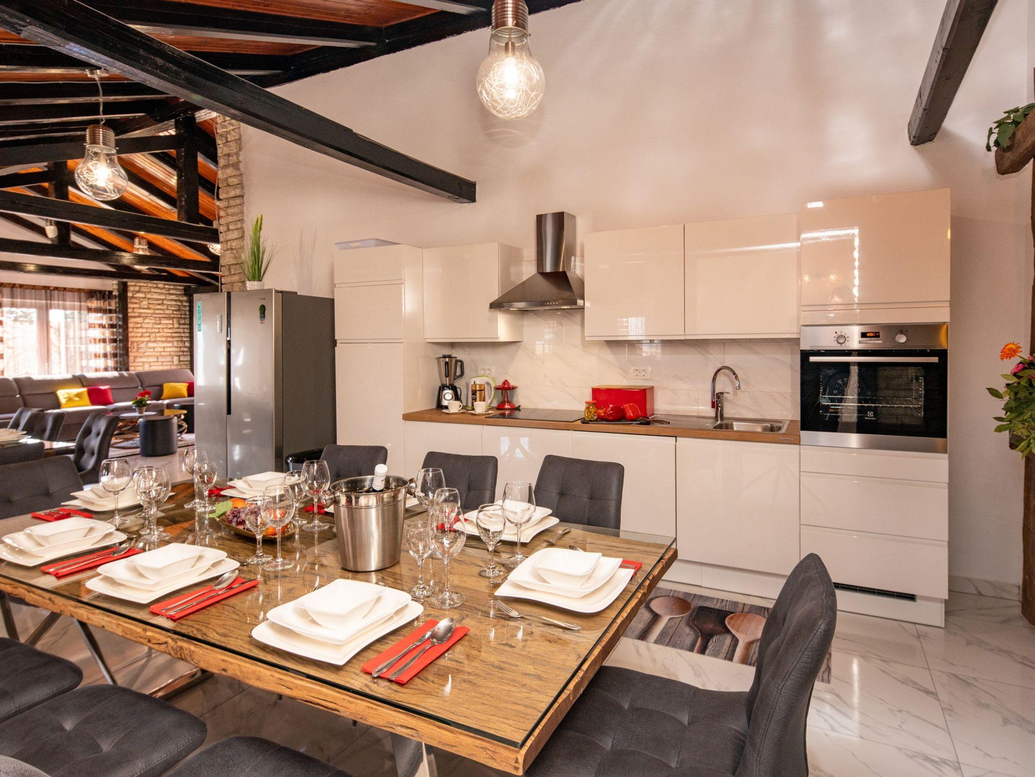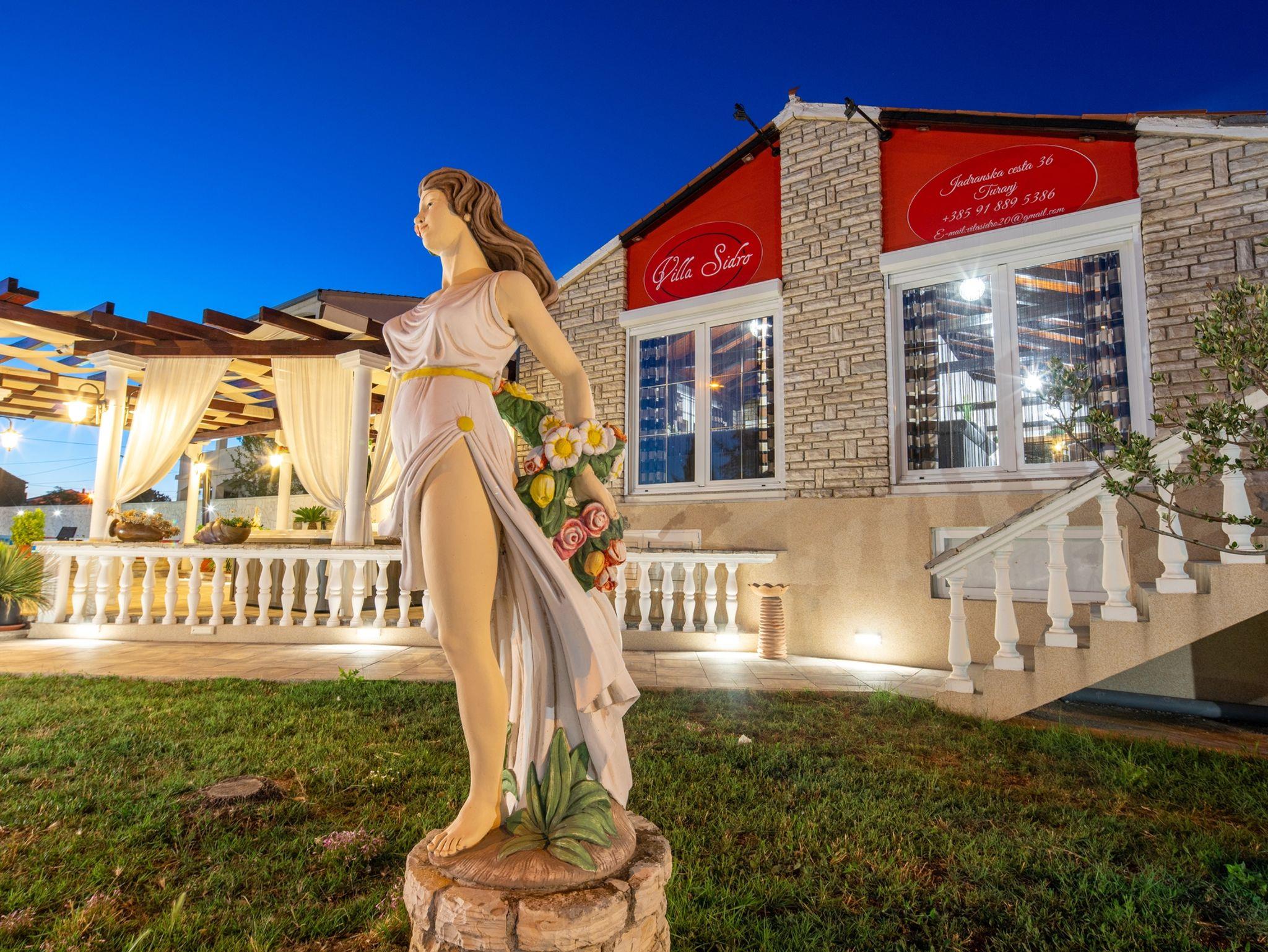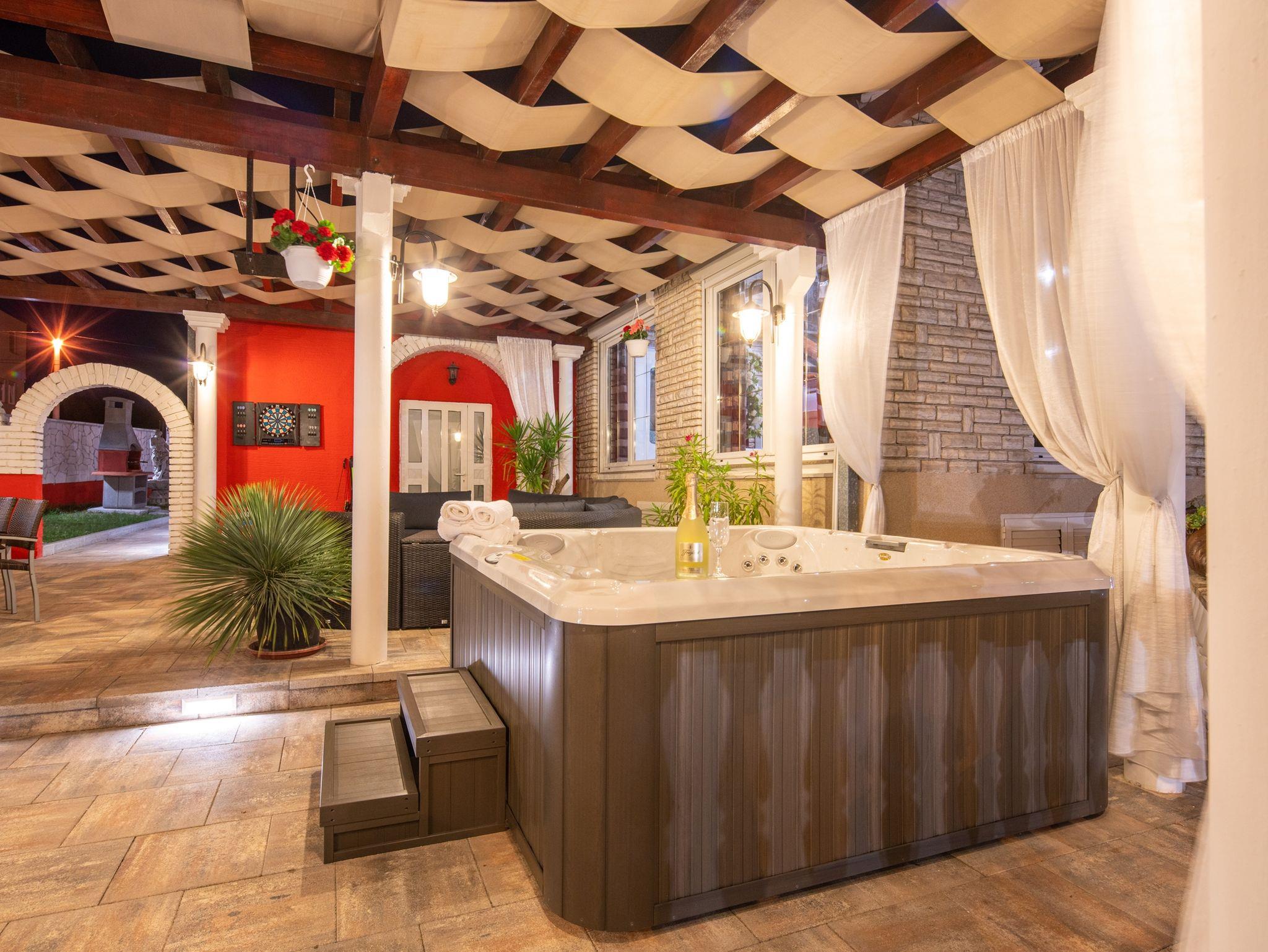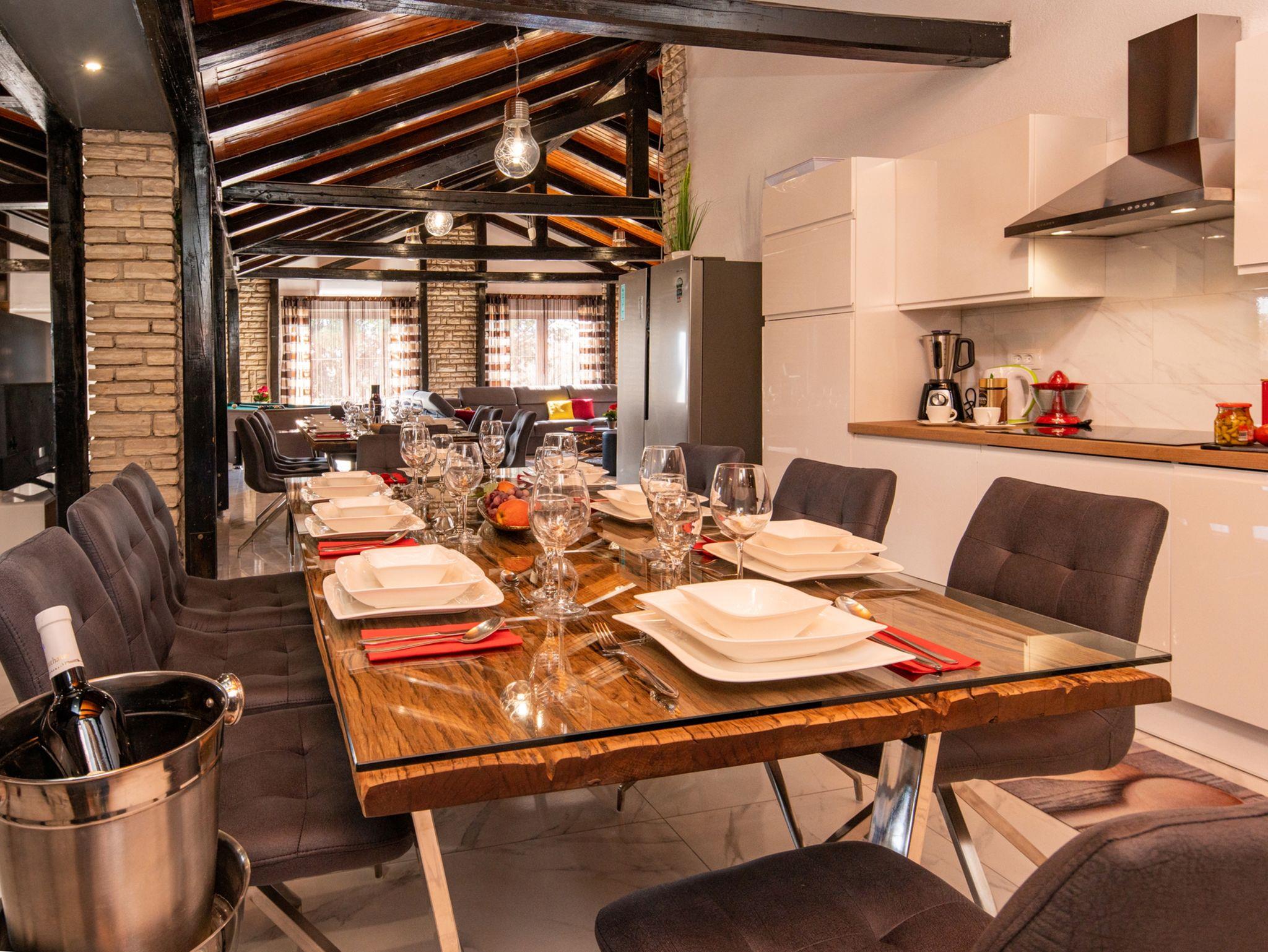 Haus bietet Platz für 16 Gäste. Die Betten sind in Schlafzimmern, die es 8 gibt, innerhalb einer Gesamtfläche von 289m2, angeordnet. Die Gäste haben eine eigene Terrasse zur Verfügung, auf der sie in warmen Sommernächten genießen können. Für vollen Genuss und Entspannung gibt es einen privaten Grill für Gäste dieser Unterkunft. Während ihres Aufenthalts können sich Gäste im privaten Schwimmbad entspannen. IM PREIS INBEGRIFFEN: Kurtaxe, Endreinigung, Klimatisierung, Pool, Parkplatz, Internet, Kinderbett, Bügeleisen, Bügelbrett, Föhn. Die Verfügbarkeit zusätzlicher Dienstleistungen in Ihrem reservierten Termin und die Preise derselben (falls nicht aufgeführt) müssen im Voraus überprüft werden. Zusätzliche Dienstleistungen die in der Zahlungsaufforderung nicht aufgeführt sind werden direkt beim Vermieter bezahlt, angenommen der Gast nutzt auch diese.