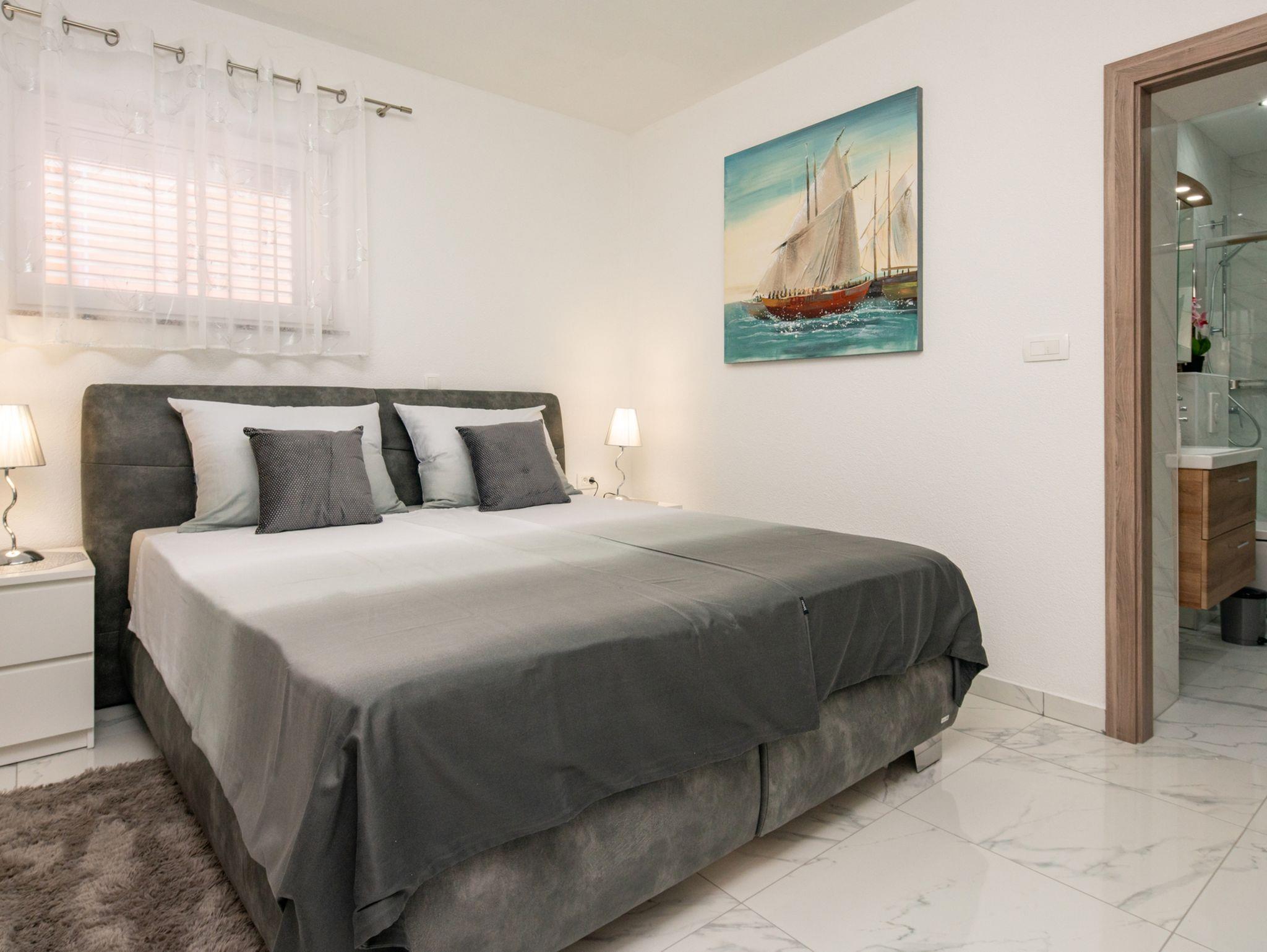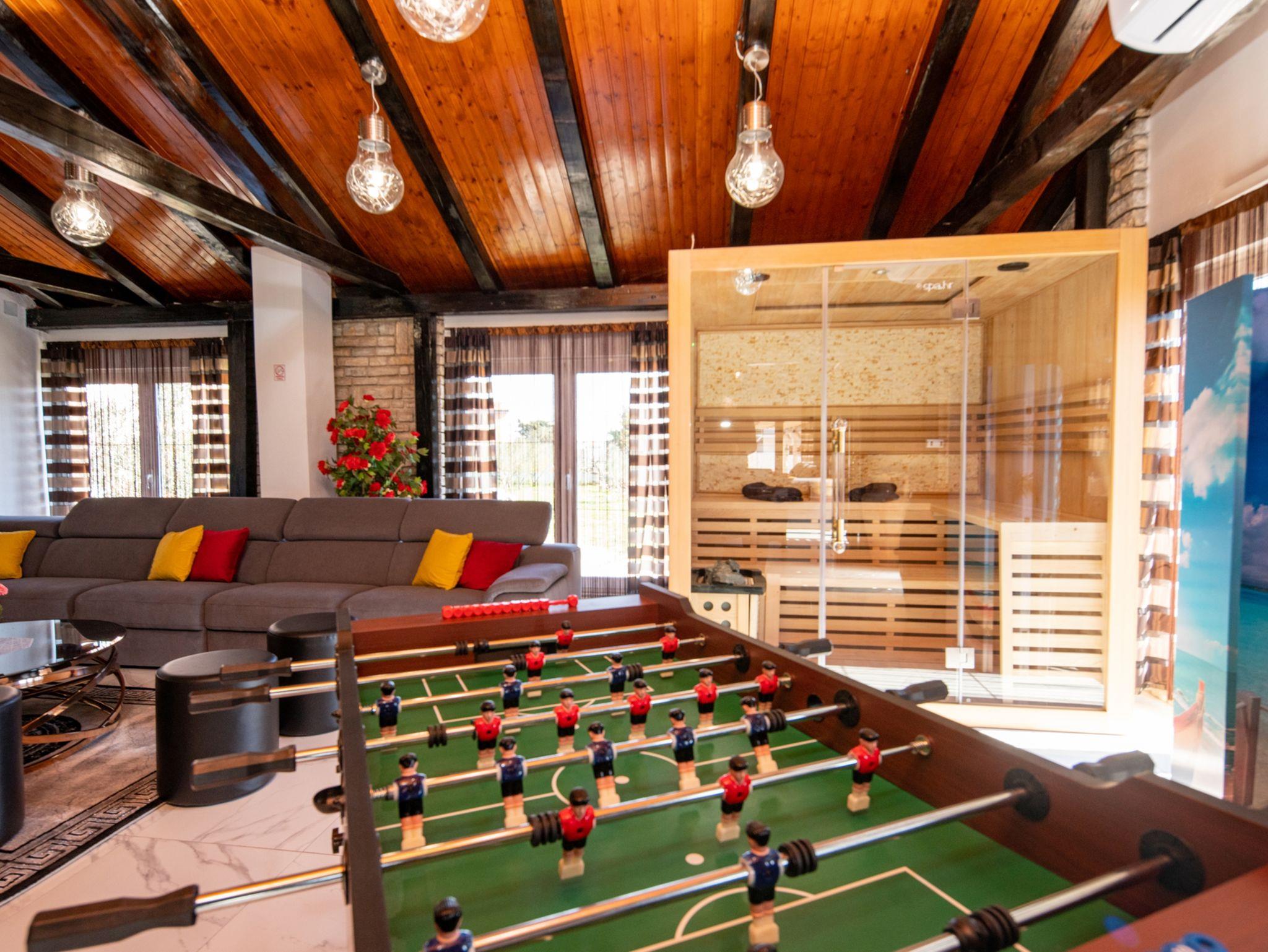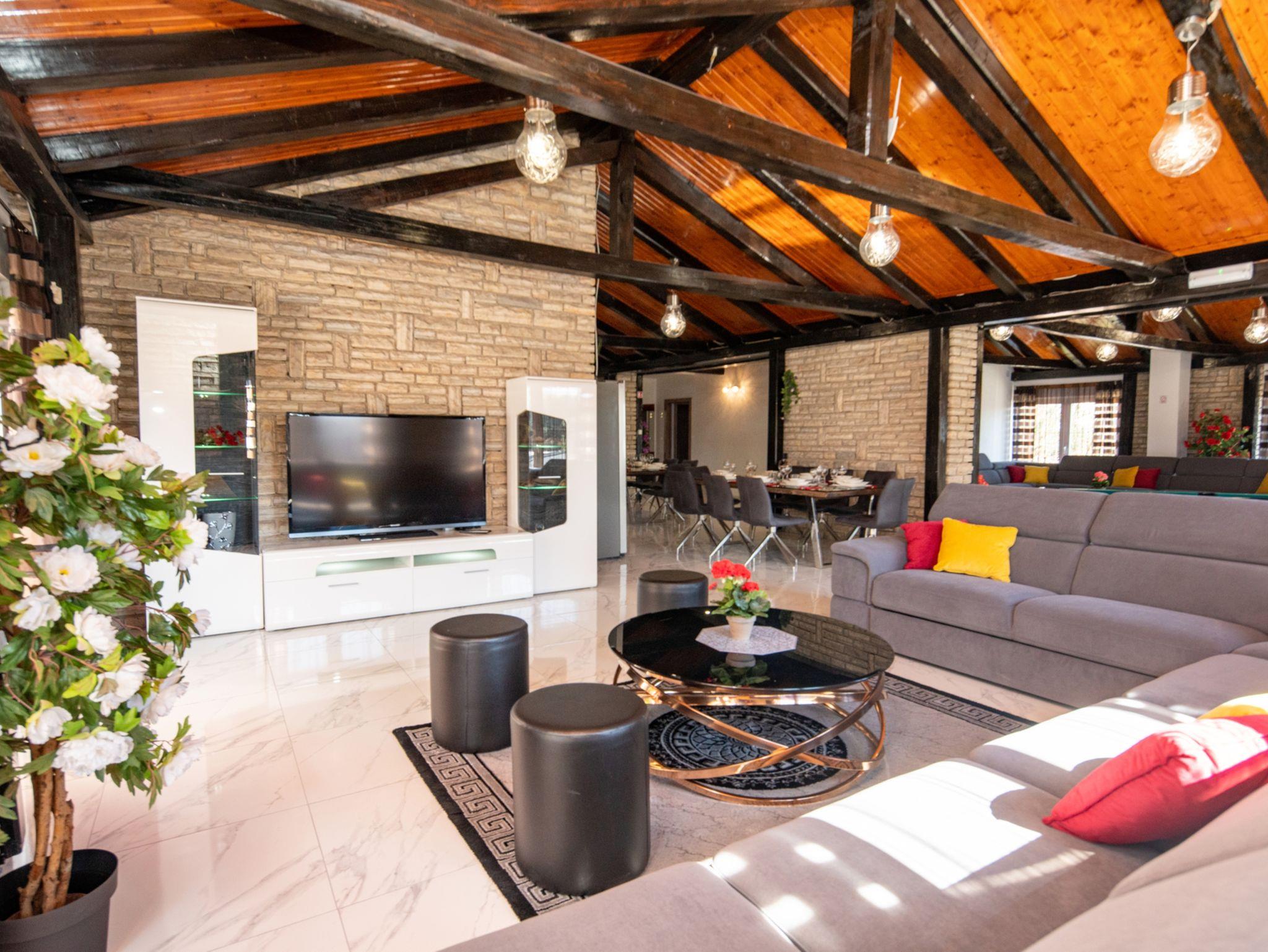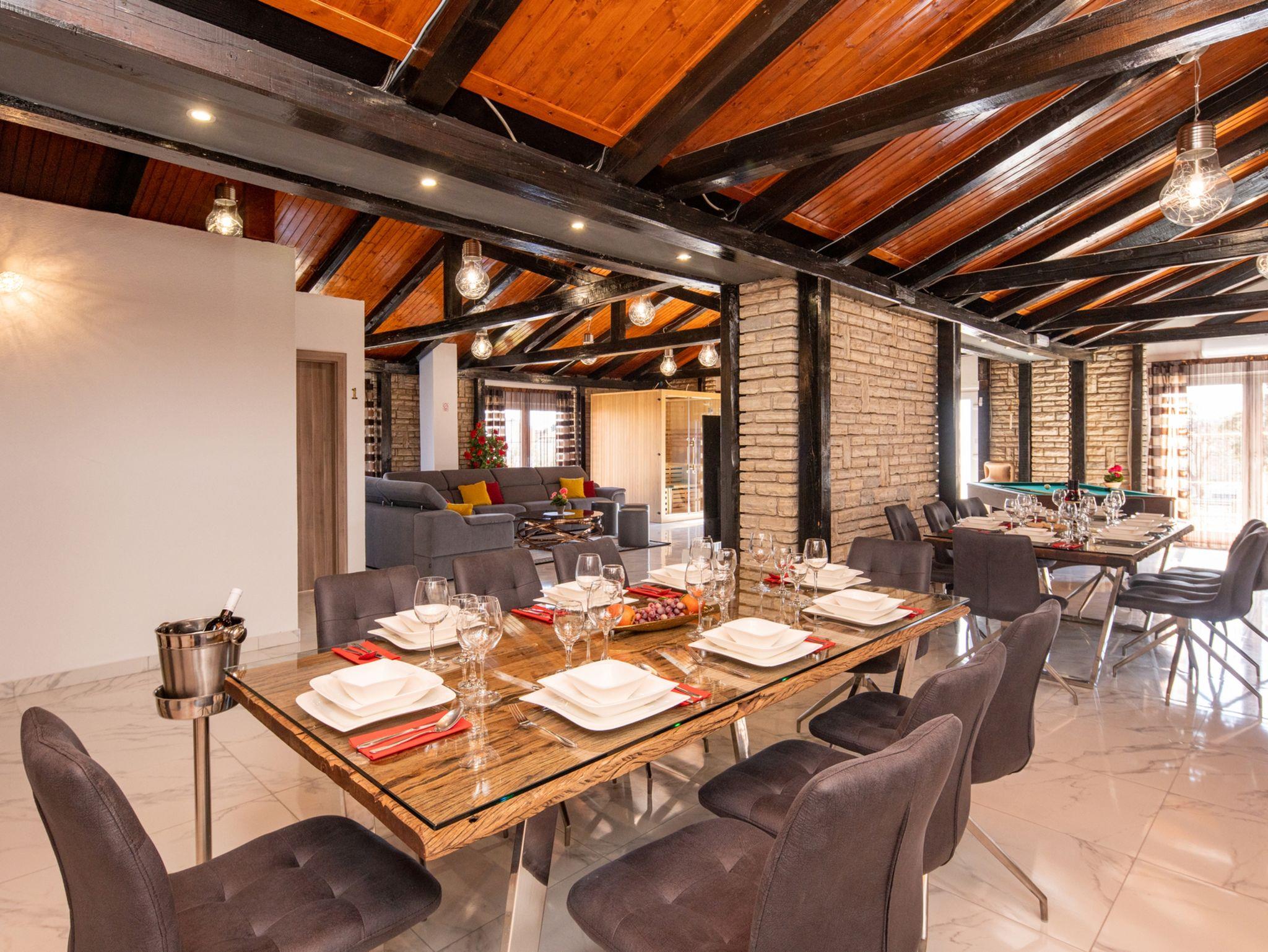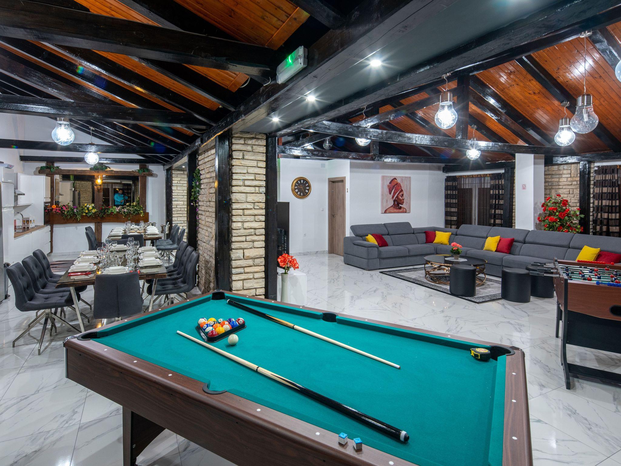 Haus bietet Platz für 16 Gäste. Die Betten sind in Schlafzimmern, die es 8 gibt, innerhalb einer Gesamtfläche von 289m2, angeordnet. Die Gäste haben eine eigene Terrasse zur Verfügung, auf der sie in warmen Sommernächten genießen können. Für vollen Genuss und Entspannung gibt es einen privaten Grill für Gäste dieser Unterkunft. Während ihres Aufenthalts können sich Gäste im privaten Schwimmbad entspannen. IM PREIS INBEGRIFFEN: Kurtaxe, Endreinigung, Klimatisierung, Pool, Parkplatz, Internet, Kinderbett, Bügeleisen, Bügelbrett, Föhn. Die Verfügbarkeit zusätzlicher Dienstleistungen in Ihrem reservierten Termin und die Preise derselben (falls nicht aufgeführt) müssen im Voraus überprüft werden. Zusätzliche Dienstleistungen die in der Zahlungsaufforderung nicht aufgeführt sind werden direkt beim Vermieter bezahlt, angenommen der Gast nutzt auch diese.