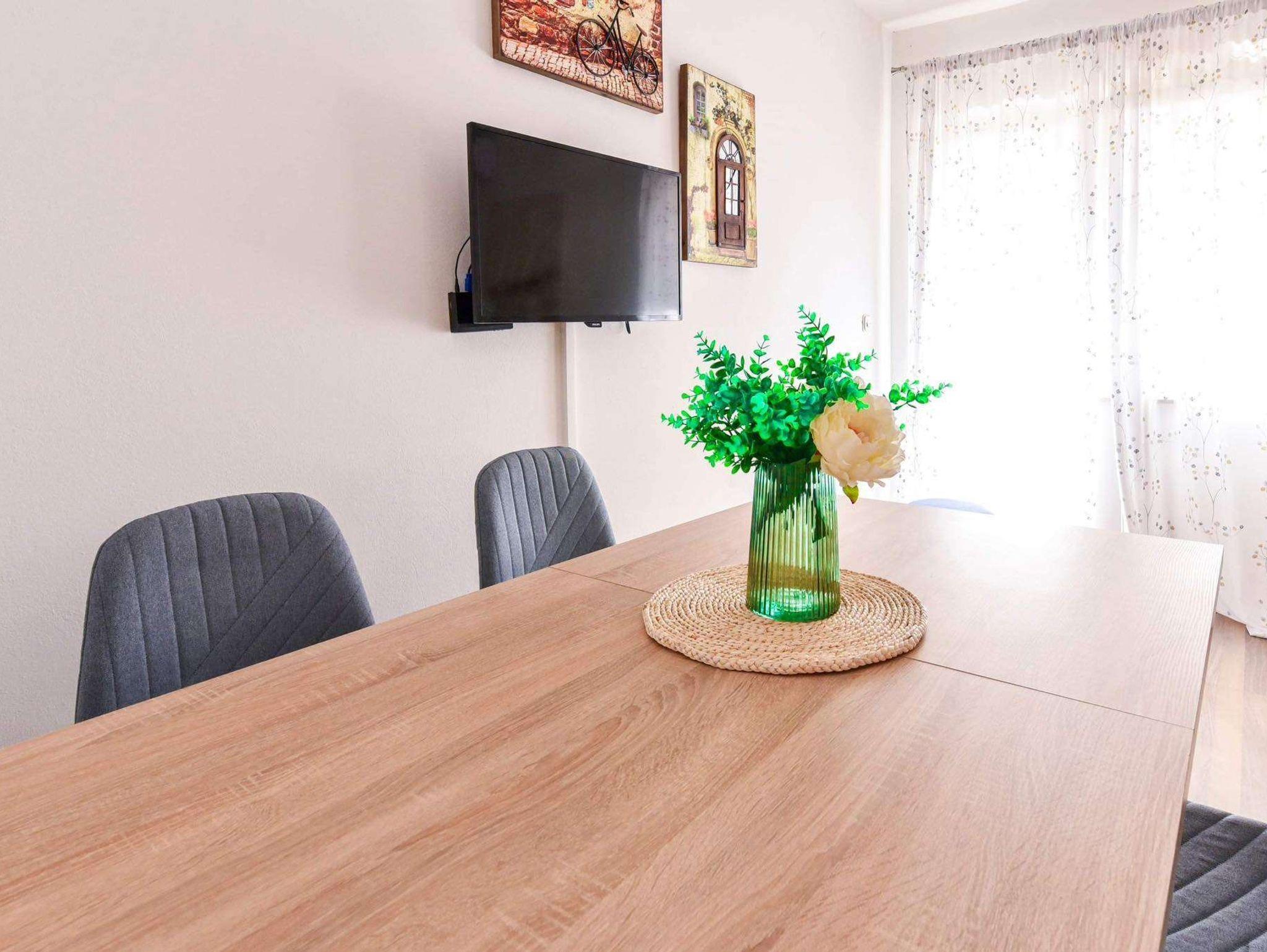 Ferienwohnung bietet Platz für 4 Gäste. Die Betten sind in Schlafzimmern, die es 1 gibt, und in Wohnzimmer, innerhalb einer Gesamtfläche von 38m2, angeordnet. Die Gäste haben eine eigene Terrasse zur Verfügung, auf der sie in warmen Sommernächten genießen können. Das Apartment bietet Meerblick. Es ist erlaubt, Speisen auf dem Gemeinschafts-Grill vorzubereiten. IM PREIS INBEGRIFFEN: Kurtaxe, Endreinigung, Klimatisierung, Parkplatz, Internet, Kinderbett, Bügeleisen, Bügelbrett. VERBINDLICHE ZUSÄTZLICHE KOSTEN: Aufzahlung für Kurzaufenthalte (prozentualer Zuschlag pro Nächtigungsanzahl: 30% - 1, 20% - 2, 10% - 3). Die Verfügbarkeit zusätzlicher Dienstleistungen in Ihrem reservierten Termin und die Preise derselben (falls nicht aufgeführt) müssen im Voraus überprüft werden. Zusätzliche Dienstleistungen die in der Zahlungsaufforderung nicht aufgeführt sind werden direkt beim Vermieter bezahlt, angenommen der Gast nutzt auch diese. Ermäßigung auf den Grundpreis: Gratistag 14=13 (bei einem Aufenthalt von 14 Tagen oder mehr erhalten Sie einen Gratistag für den Aufenthalt bis 31.12.26).