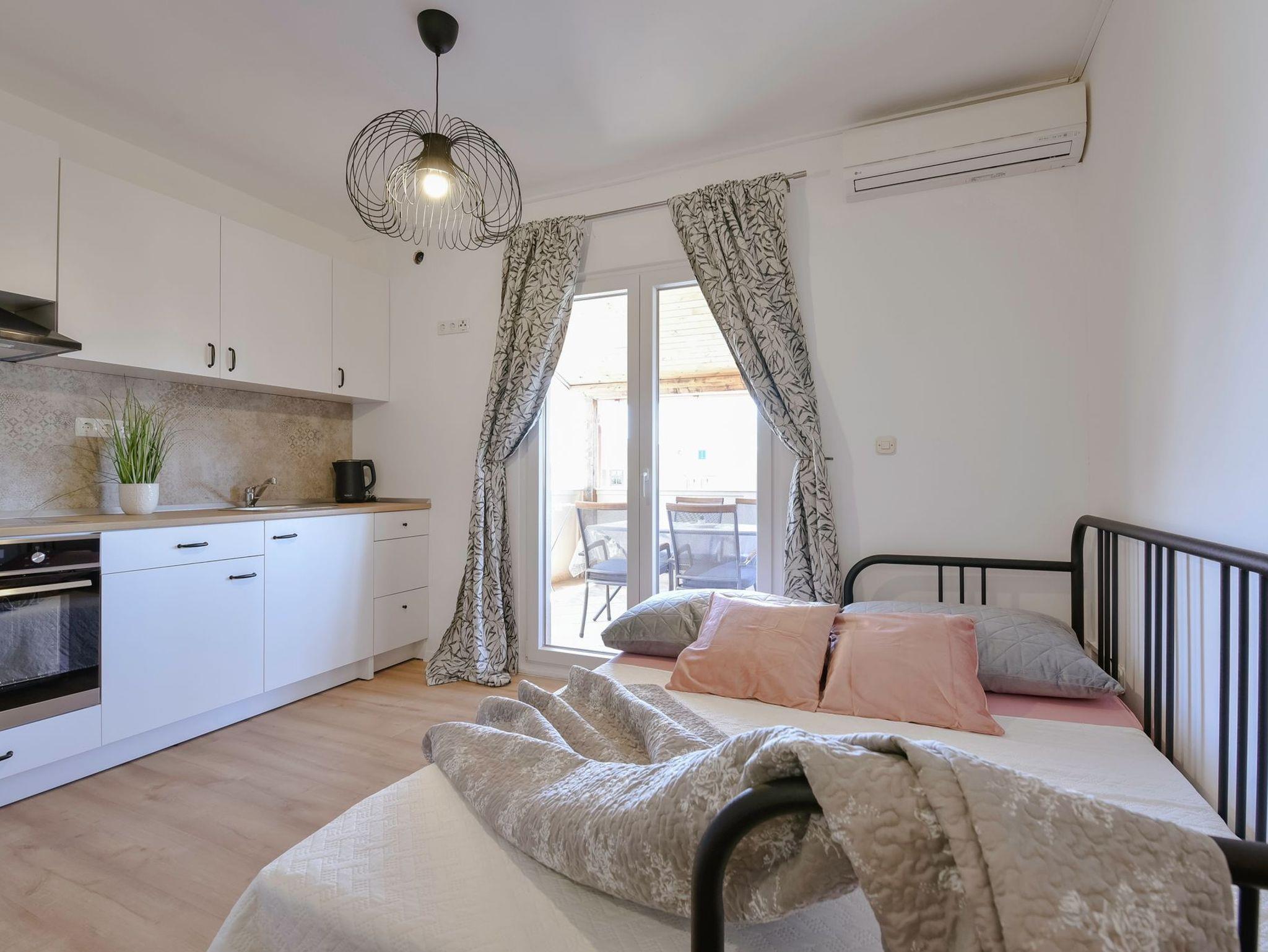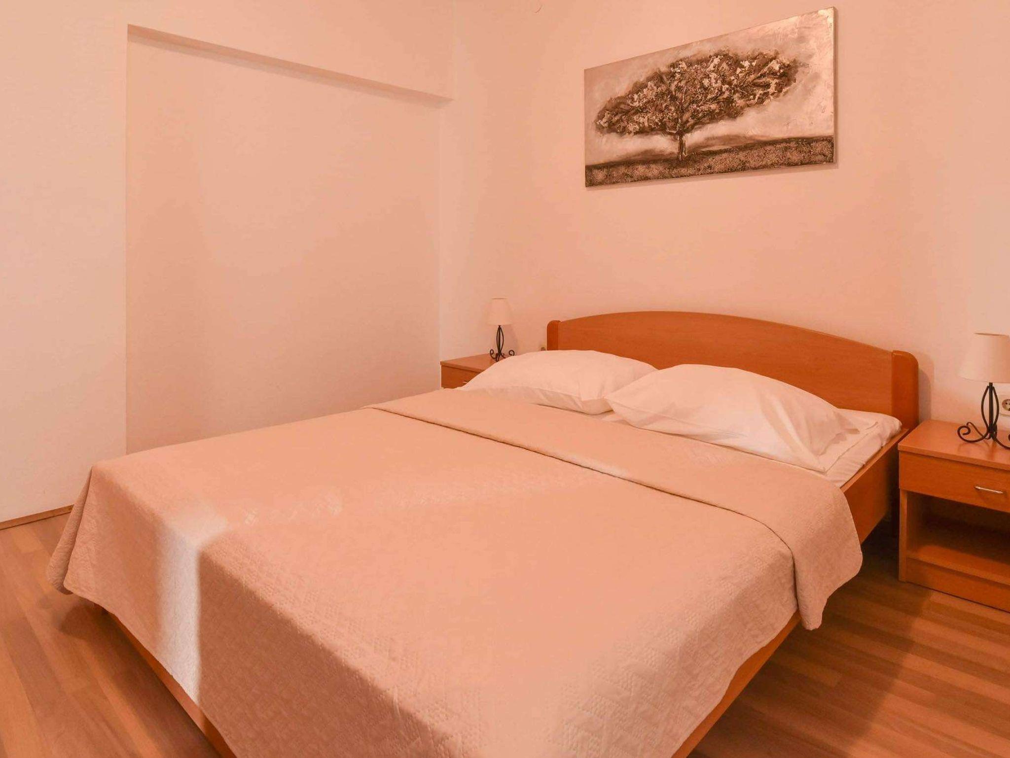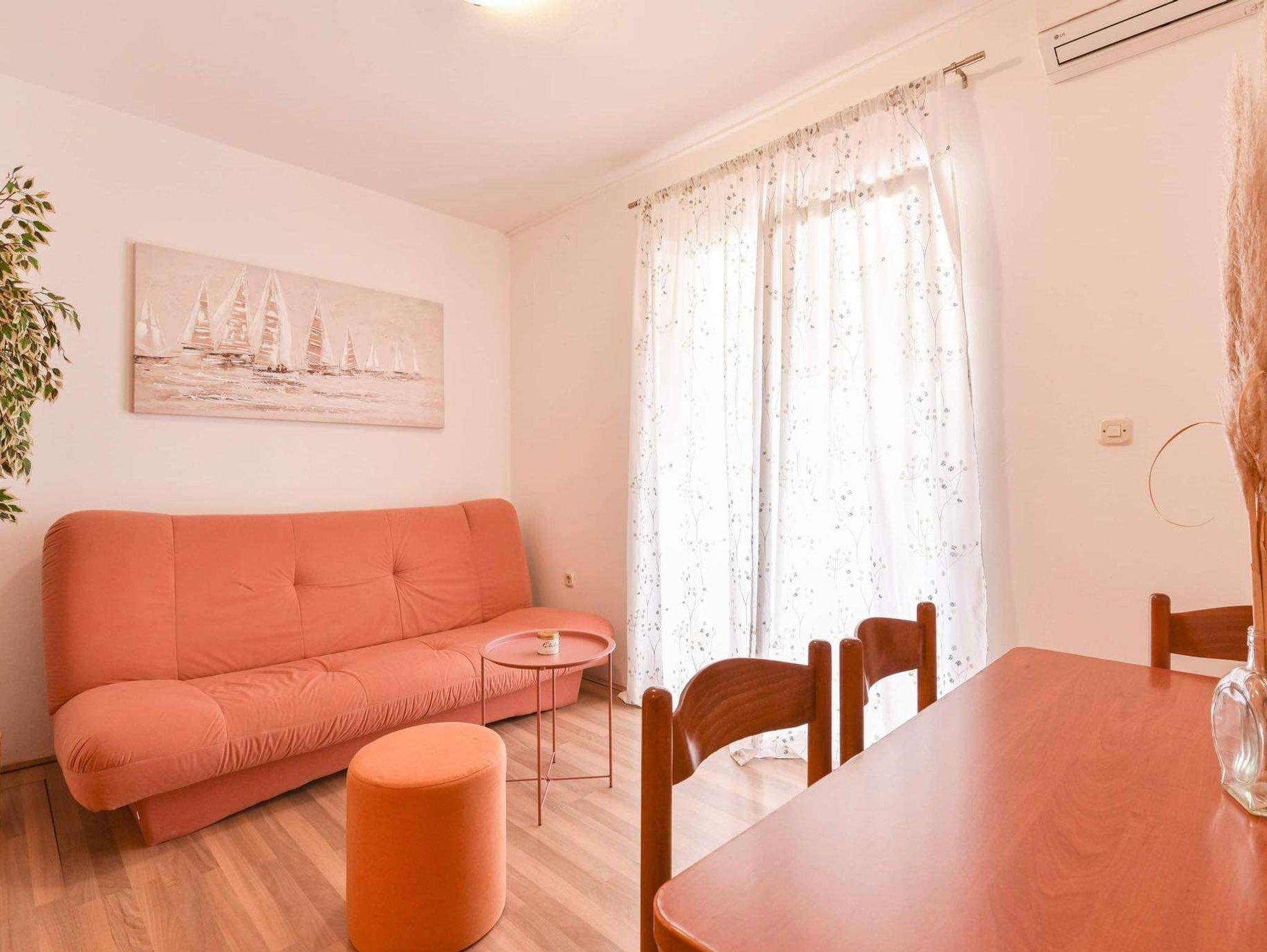 Ferienwohnung bietet Platz für 5 Gäste. Die Betten sind in Schlafzimmern, die es 1 gibt, und in Wohnzimmer, innerhalb einer Gesamtfläche von 35m2, angeordnet. Die Gäste haben eine eigene Terrasse zur Verfügung, auf der sie in warmen Sommernächten genießen können. Das Apartment bietet Meerblick. Es ist erlaubt, Speisen auf dem Gemeinschafts-Grill vorzubereiten. IM PREIS INBEGRIFFEN: Kurtaxe, Endreinigung, Klimatisierung, Parkplatz, Internet, Kinderbett, Bügeleisen, Bügelbrett. VERBINDLICHE ZUSÄTZLICHE KOSTEN: Aufzahlung für Kurzaufenthalte (prozentualer Zuschlag pro Nächtigungsanzahl: 30% - 1, 20% - 2, 10% - 3). Die Verfügbarkeit zusätzlicher Dienstleistungen in Ihrem reservierten Termin und die Preise derselben (falls nicht aufgeführt) müssen im Voraus überprüft werden. Zusätzliche Dienstleistungen die in der Zahlungsaufforderung nicht aufgeführt sind werden direkt beim Vermieter bezahlt, angenommen der Gast nutzt auch diese. Ermäßigung auf den Grundpreis: Gratistag 14=13 (bei einem Aufenthalt von 14 Tagen oder mehr erhalten Sie einen Gratistag für den Aufenthalt bis 31.12.26).