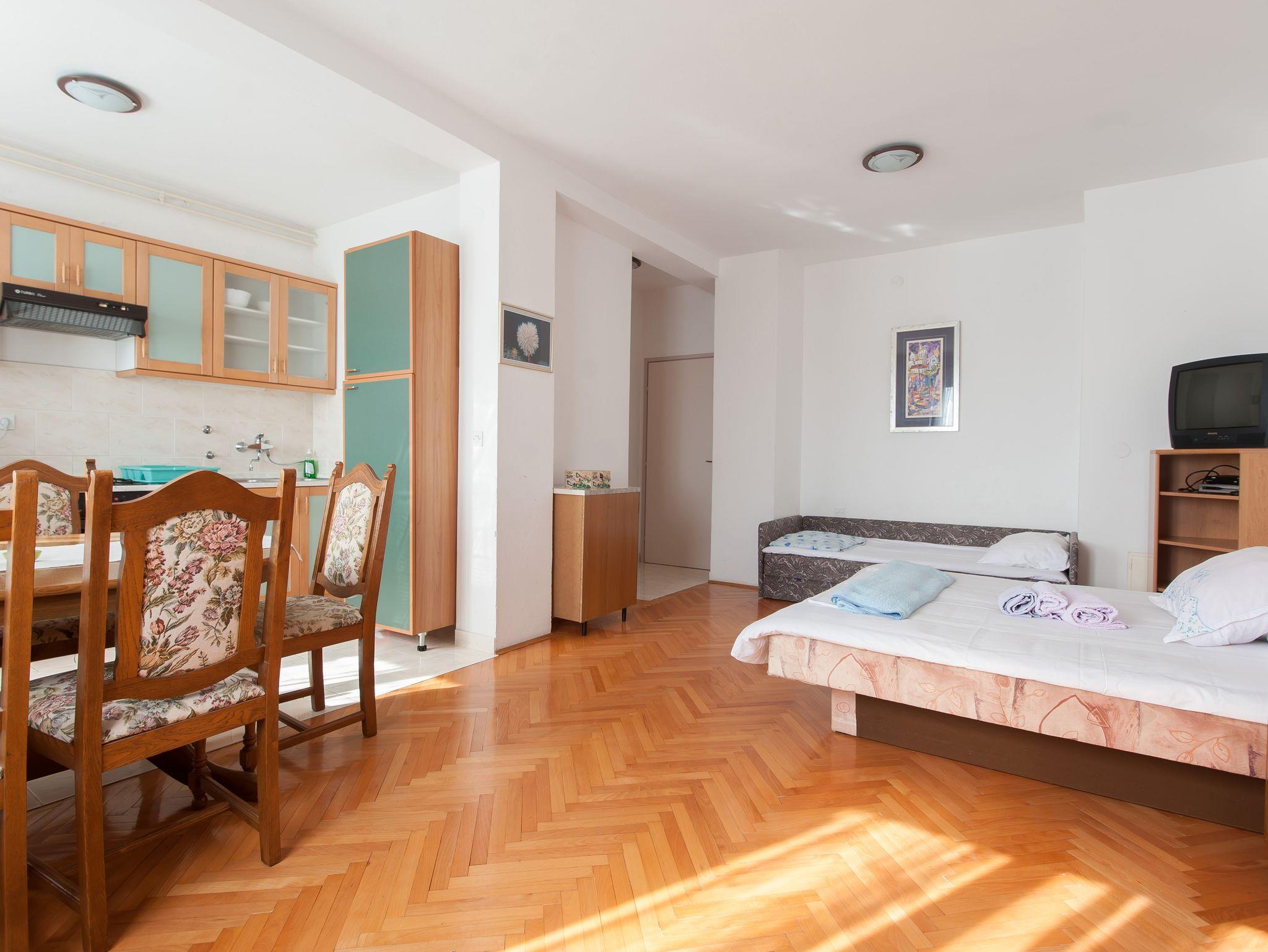 Studio bietet Platz für 3 Gäste. Die Betten sind in Schlafzimmern, die es 1 gibt, innerhalb einer Gesamtfläche von 30m2, angeordnet. Es ist erlaubt, Speisen auf dem Gemeinschafts-Grill vorzubereiten. Die reservierte Unterkunftseinheit hat keinen Balkon und keine Terrasse. IM PREIS INBEGRIFFEN: Kurtaxe, Endreinigung, Klimatisierung, Zentralheizung, Parkplatz, Internet, Zusatzbett, Bügeleisen, Bügelbrett, Föhn, Sonnenschirm. VERBINDLICHE ZUSÄTZLICHE KOSTEN: Aufzahlung für Kurzaufenthalte (prozentualer Zuschlag pro Nächtigungsanzahl: 30% - 1, 20% - 2, 10% - 3). Die Verfügbarkeit zusätzlicher Dienstleistungen in Ihrem reservierten Termin und die Preise derselben (falls nicht aufgeführt) müssen im Voraus überprüft werden. Zusätzliche Dienstleistungen die in der Zahlungsaufforderung nicht aufgeführt sind werden direkt beim Vermieter bezahlt, angenommen der Gast nutzt auch diese. Ermäßigung auf den Grundpreis: Gratistag 21=19 (bei einem Aufenthalt von 21 Tagen oder mehr erhalten Sie 2 Gratistage für den Aufenthalt bis 31.12.26).