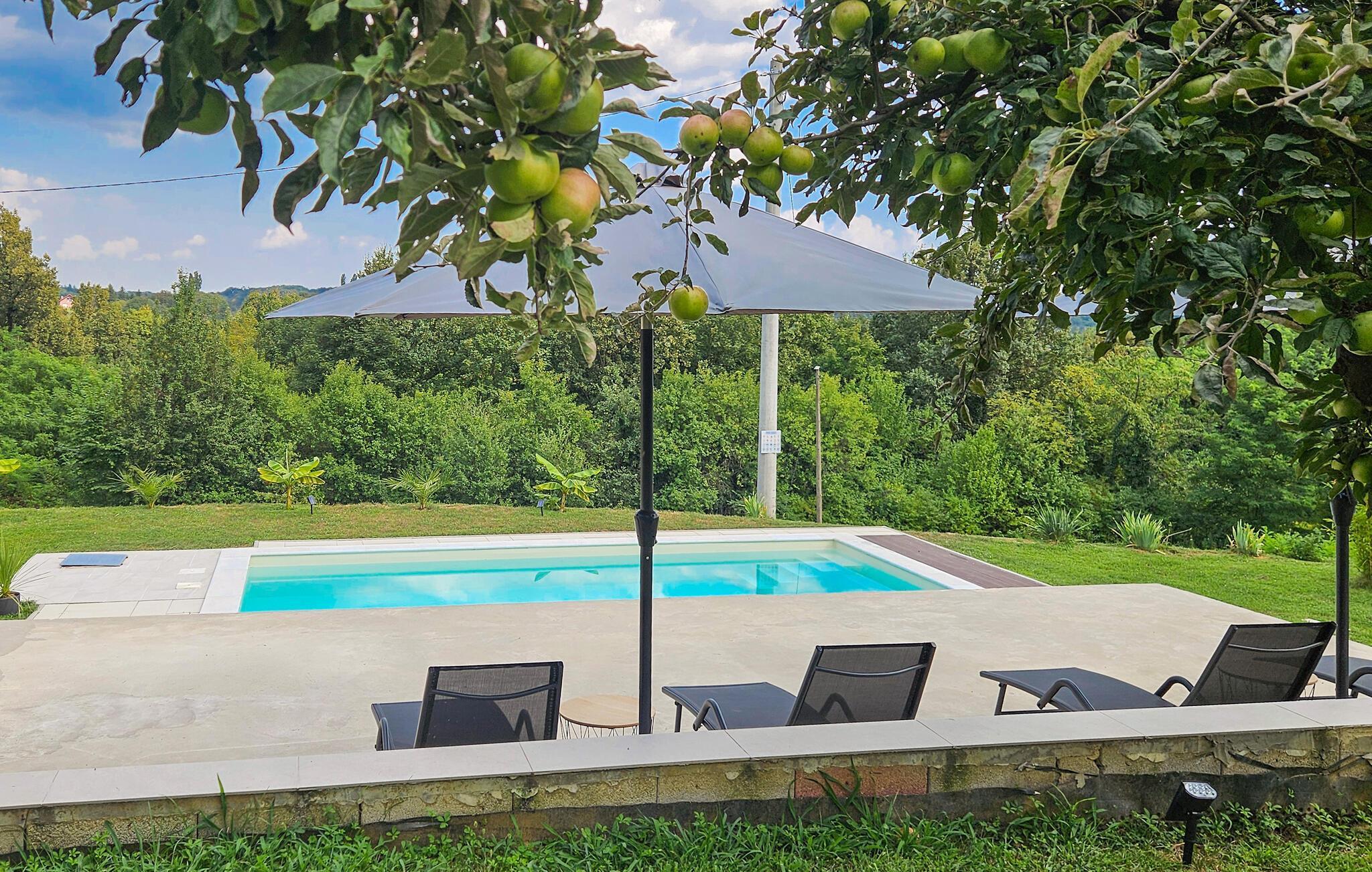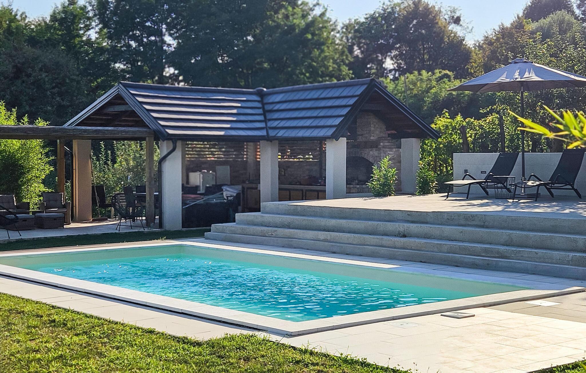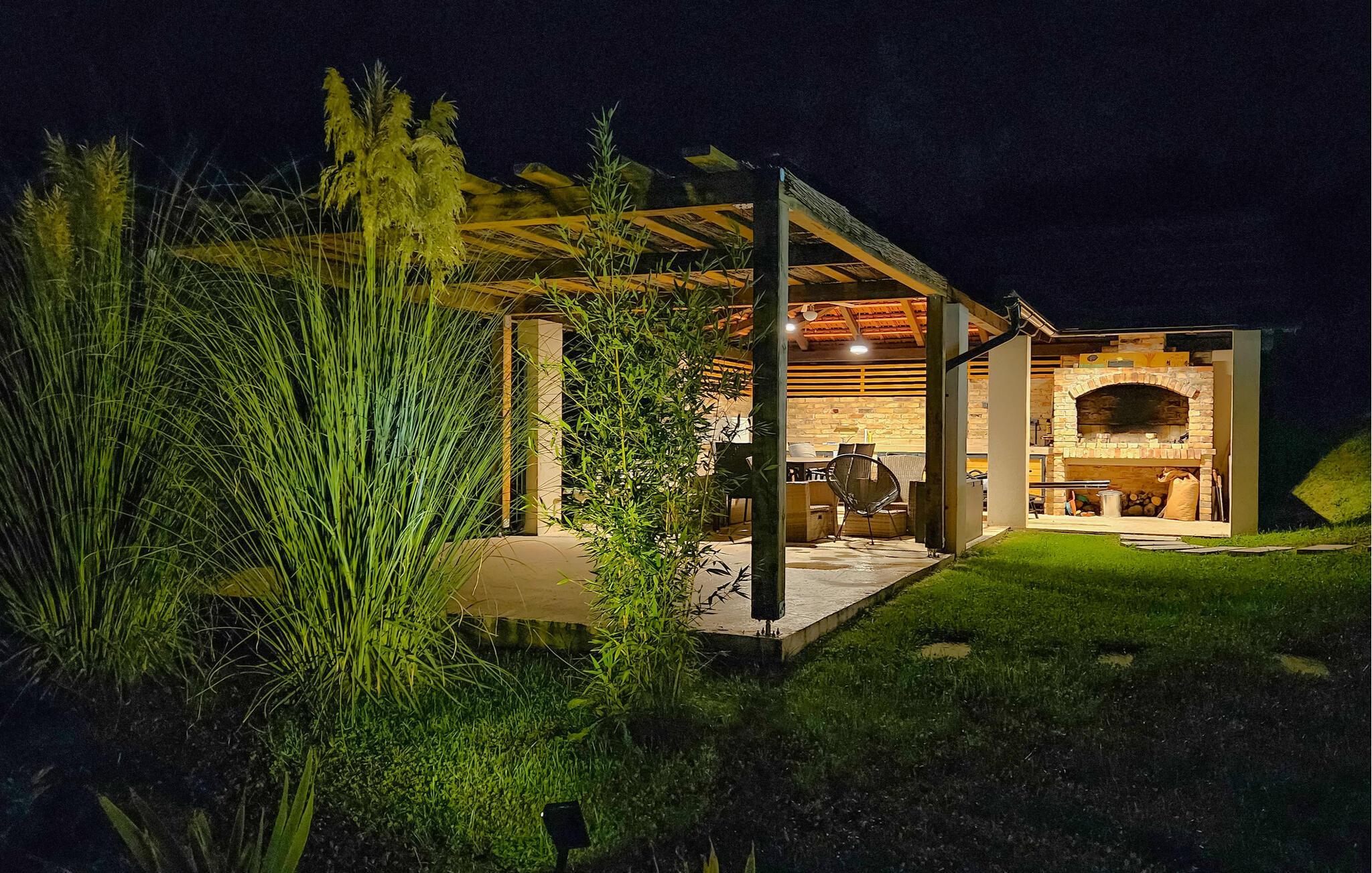 Der Außenbereich hält zahlreiche Highlights bereit. Genießen Sie ein Bad im Whirlpool und lassen Sie den Blick über das üppige Grün schweifen. Spazieren Sie barfuß von der eleganten Poolzone zur einladenden Sommerküche mit gemauertem Grill. Abends sorgt eine warme Beleuchtung für ein urgemütliches Ambiente.
