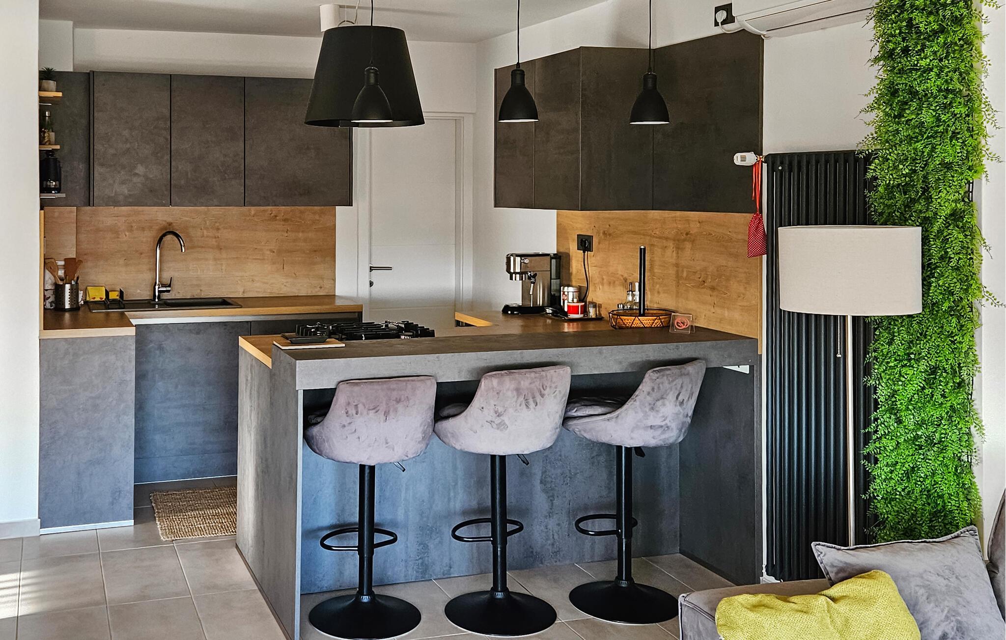 In diesem stilvoll eingerichteten Ferienhaus erwartet Sie ein moderner und komfortabler Innenbereich. Die offene Wohnküche mit dunklem Design lädt zum gemeinsamen Schlemmen ein. Direkt daneben kann es sich die ganze Familie auf der bequemen Sofalandschaft gemütlich machen. Ein großer Flachbildfernseher und das großzügige Panoramafenster mit Blick ins Grüne schaffen ein behagliches Wohlfühlambiente.