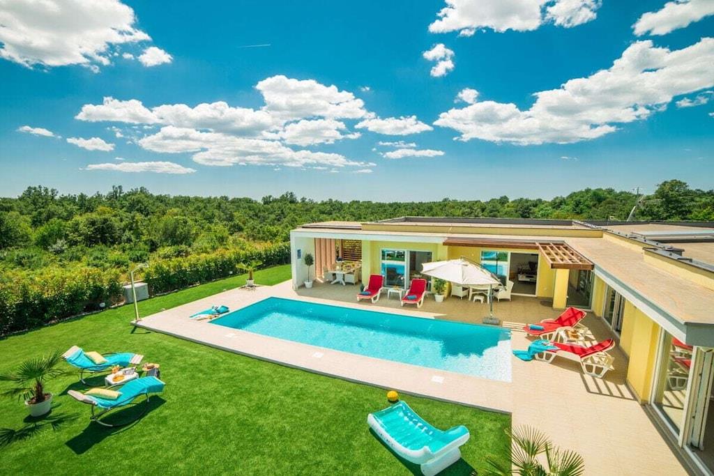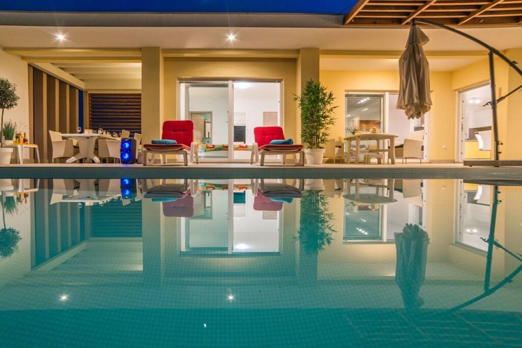 Dieses herrliche Urlaubsdomizil für sechs Personen bietet Ruhe und Erholung. Kombinierter Wohn-/Essbereich, gemütliche Couch/Rundecke, großer Sat-TV, DVD-Player mit reichhaltiger Auswahl an Filmen, Playstation, Internet, Wlan. 3 Schlafzimmer mit Doppelbett, Schrank, TV und Klima, 4 Badezimmer mit WC und Dusche. Highlight des 960 m² großen Grundstücks ist natürlich das Herzstück, der rund 33 m² große, beheizbare Swimmingpool. Daneben bietet sich die rund 70 m² große Terrasse (ca. 30 m² überdacht) zum Verweilen und gemeinsamen Grillen an. Sonstiges: Bettwäsche und Handtücher, Safe, Bügelbrett und -eisen, Kinderhochstuhl & Kinderbett Klima im Preis inklusive, Haustiere nur auf Anfrage