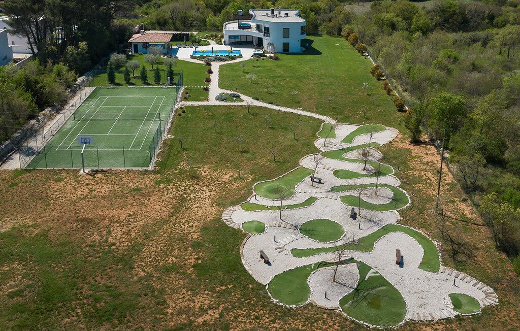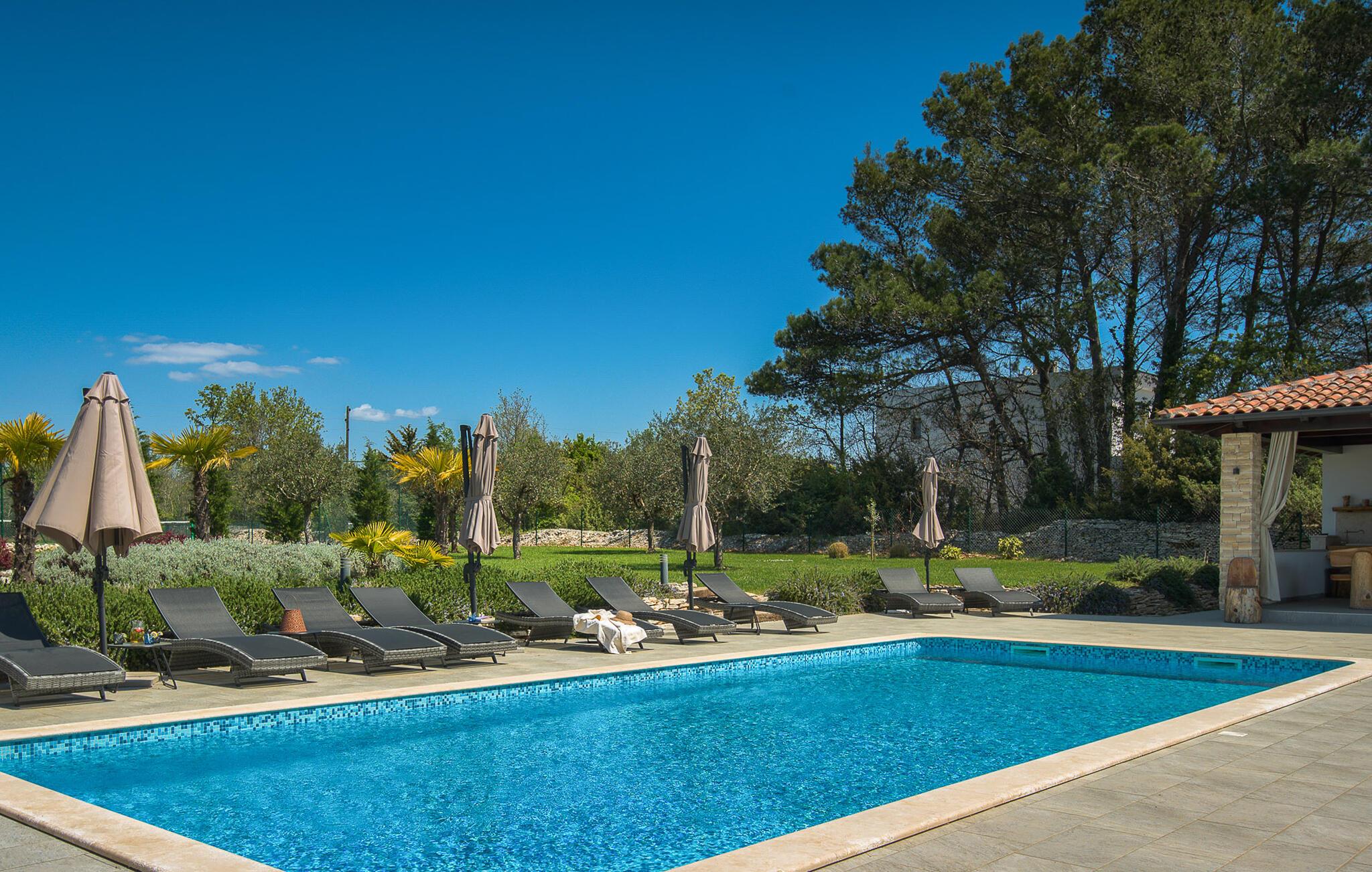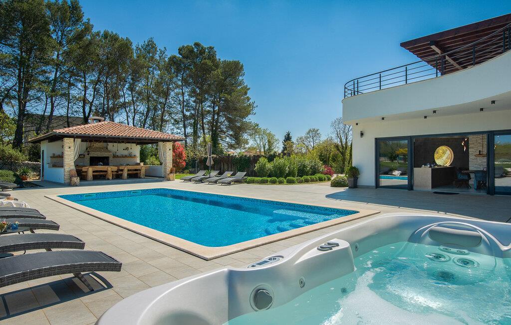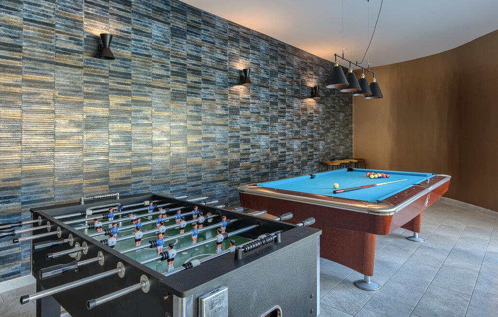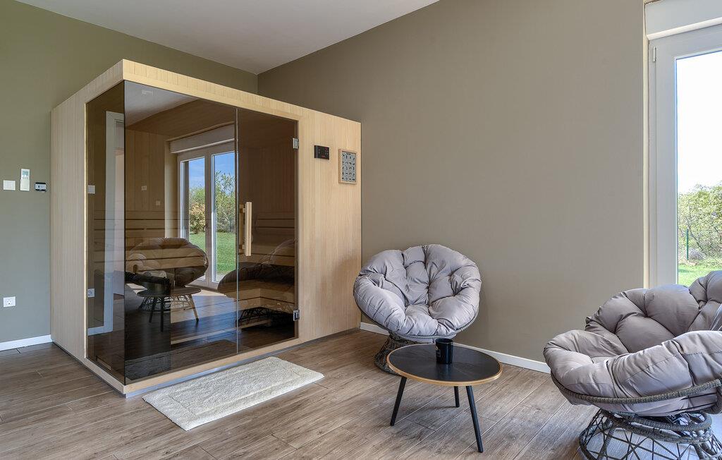 Diese luxuriöse Villa in Jursici ist ideal für Familien oder Gruppen, die in Ihrem Urlaub Entspannung und Unterhaltung suchen. Genießen Sie die vielen Annehmlichkeiten des Hauses. Starten Sie Ihren Tag mit einem Blick vom Balkon im ersten Stock auf die weite, grüne Landschaft. Entspannen Sie sich anschließend in der Sauna oder spielen Sie eine Partie Tischfußball oder Poolbillard. Für aktive Gäste stehen moderne Fitnessgeräte zur Verfügung, sodass Sie auch im Urlaub fit bleiben können. Speisen können Sie gemeinsam am langen Esstisch neben der großzügigen Küche oder draußen auf der überdachten Terrasse mit dem gemauerten Grill.