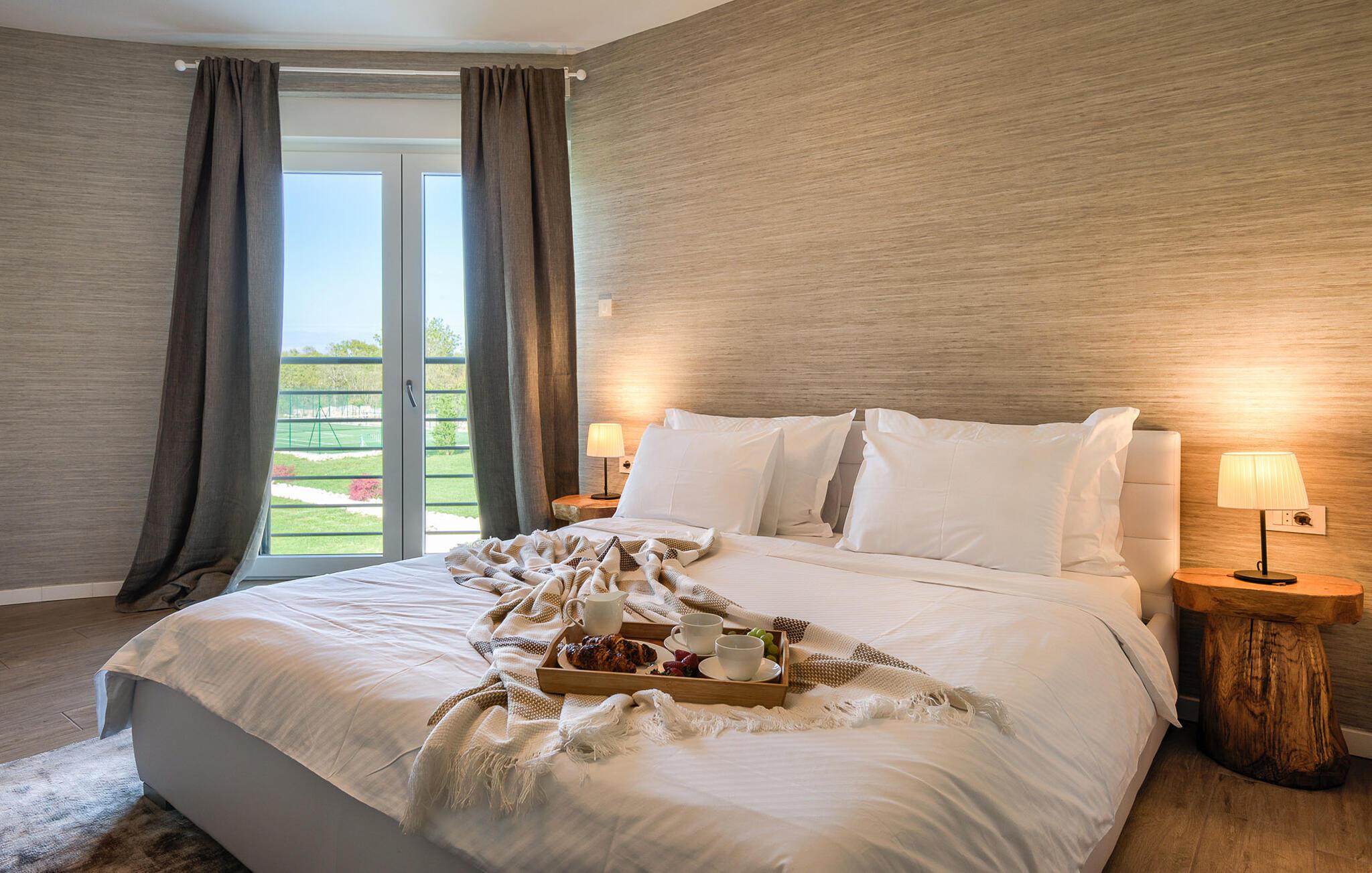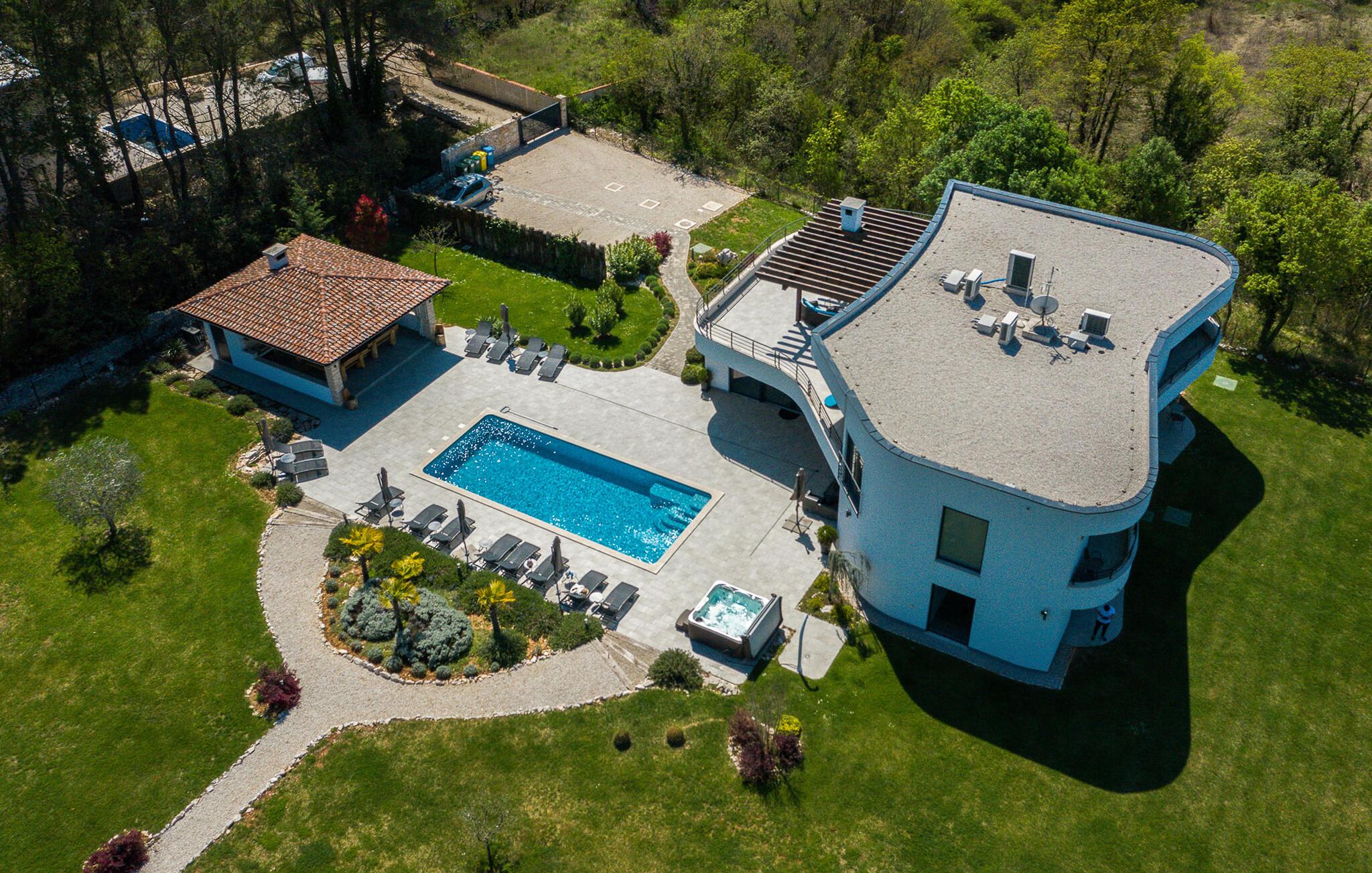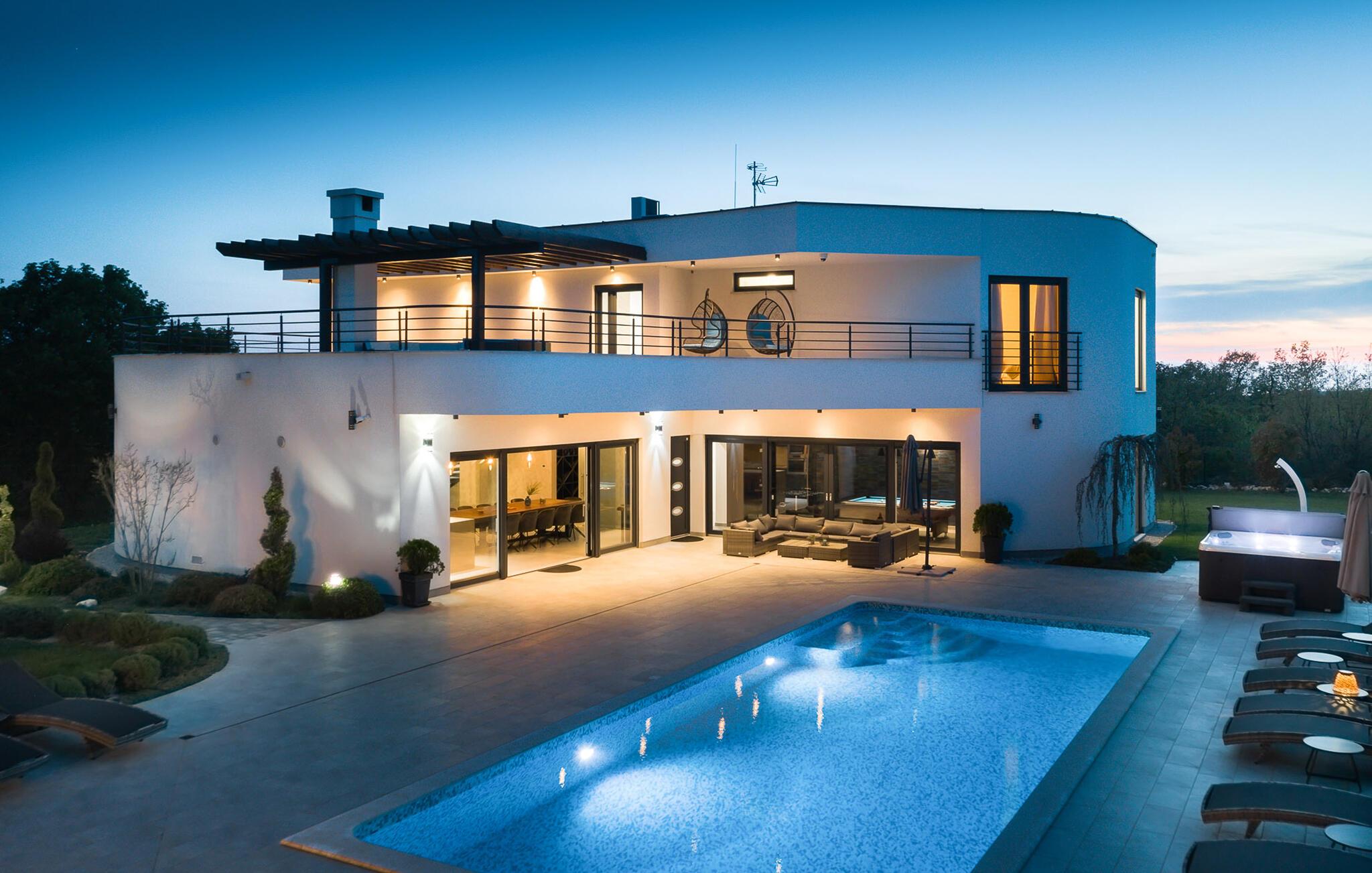 Diese luxuriöse Villa in Jursici ist ideal für Familien oder Gruppen, die in Ihrem Urlaub Entspannung und Unterhaltung suchen. Genießen Sie die vielen Annehmlichkeiten des Hauses. Starten Sie Ihren Tag mit einem Blick vom Balkon im ersten Stock auf die weite, grüne Landschaft. Entspannen Sie sich anschließend in der Sauna oder spielen Sie eine Partie Tischfußball oder Poolbillard. Für aktive Gäste stehen moderne Fitnessgeräte zur Verfügung, sodass Sie auch im Urlaub fit bleiben können. Speisen können Sie gemeinsam am langen Esstisch neben der großzügigen Küche oder draußen auf der überdachten Terrasse mit dem gemauerten Grill.