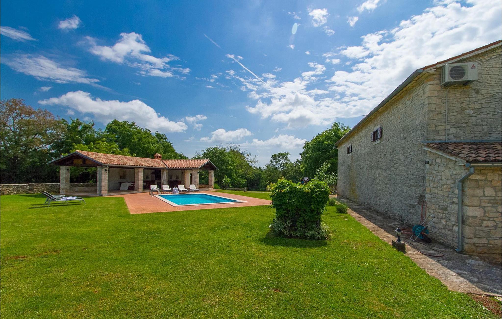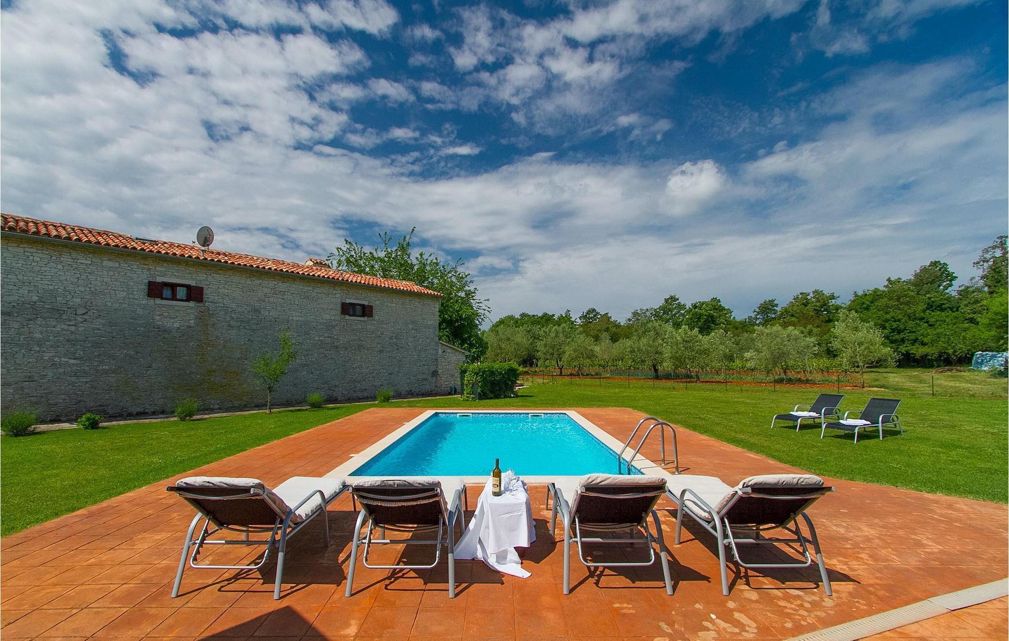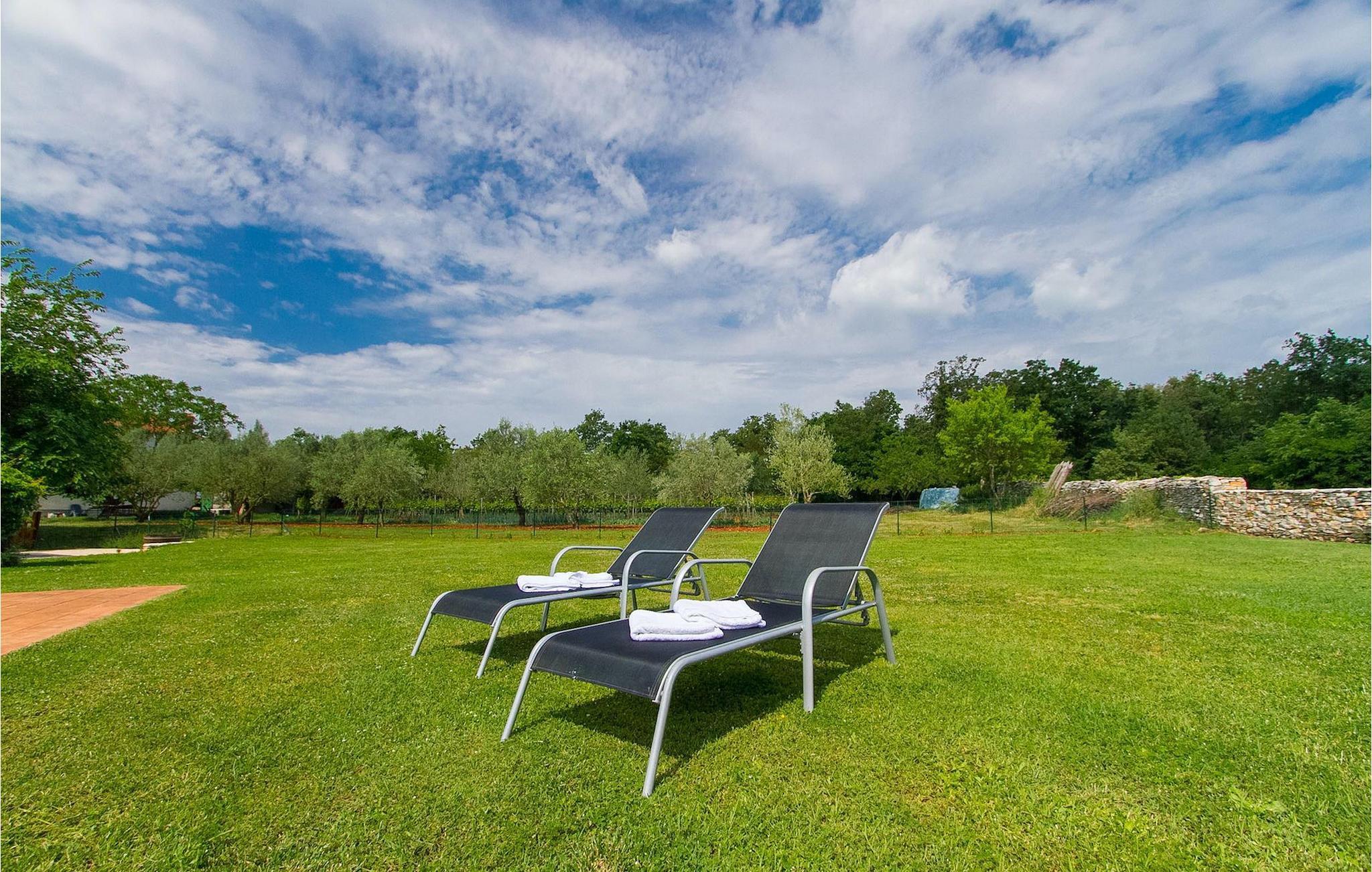 Der Außenbereich umfasst einen komplett eingezäunten großen grünen Garten mit Pool und Liegestühlen ideal zum Entspannen und Genießen in der heißen kroatischen Sonne.