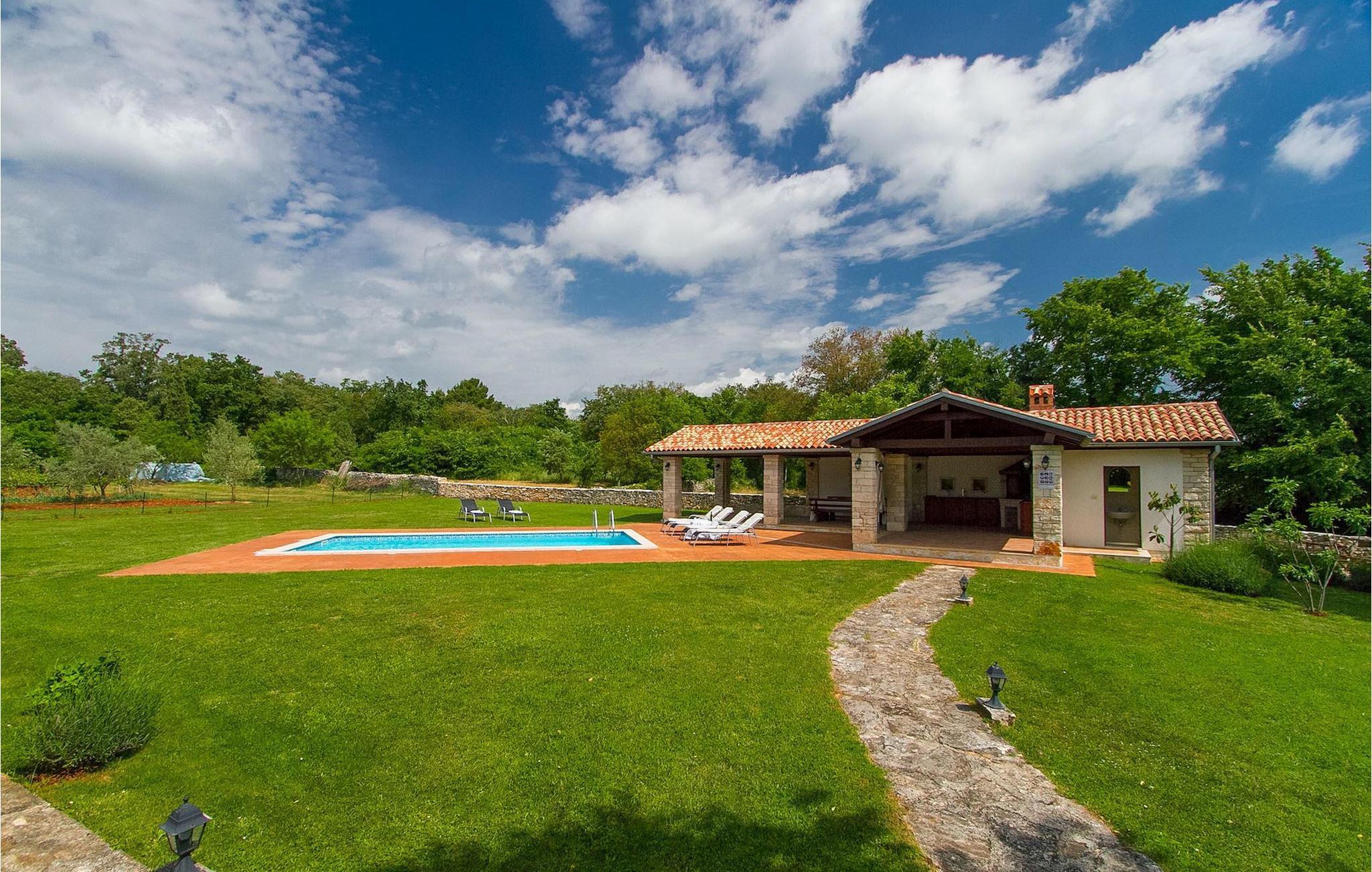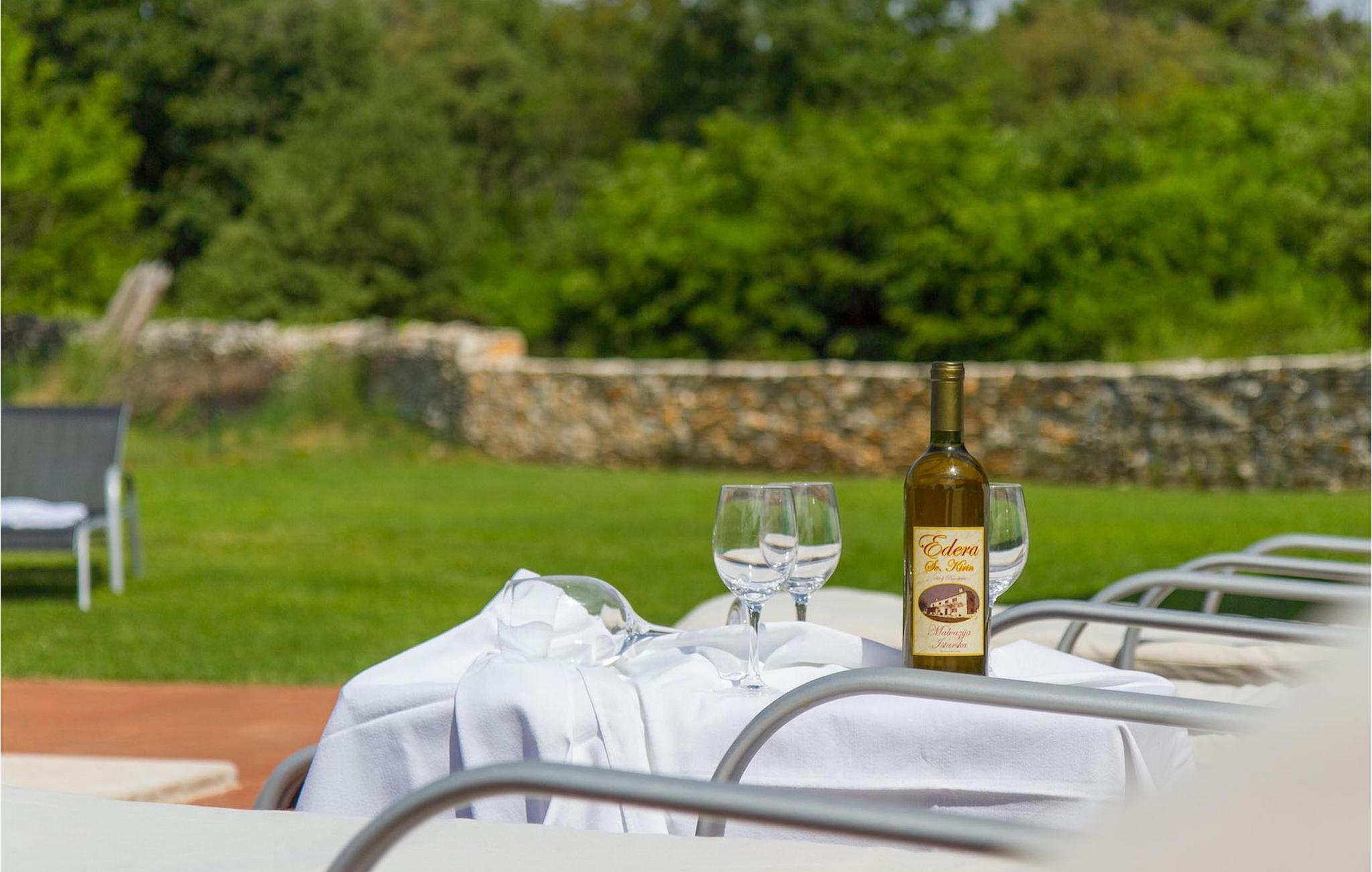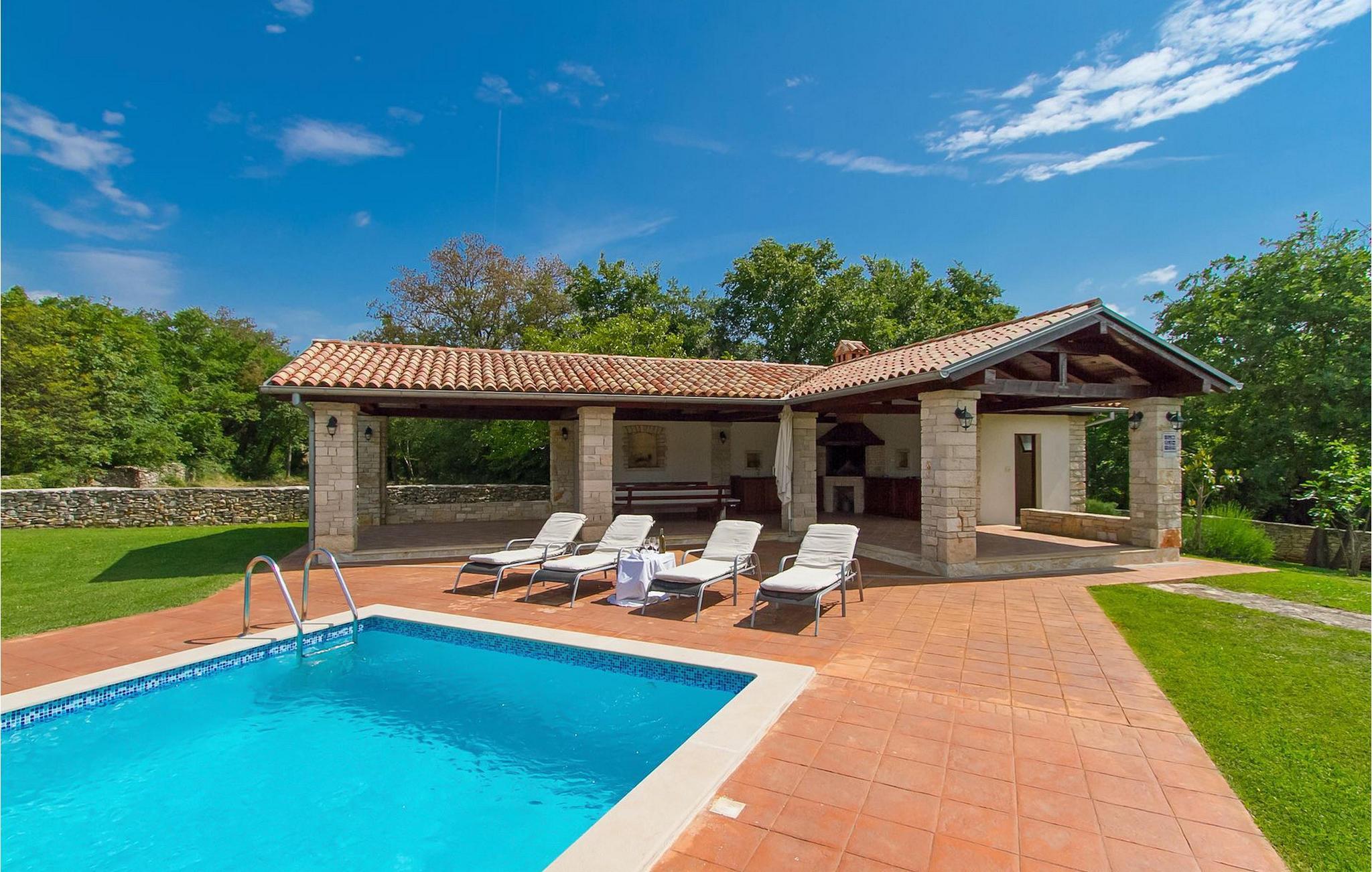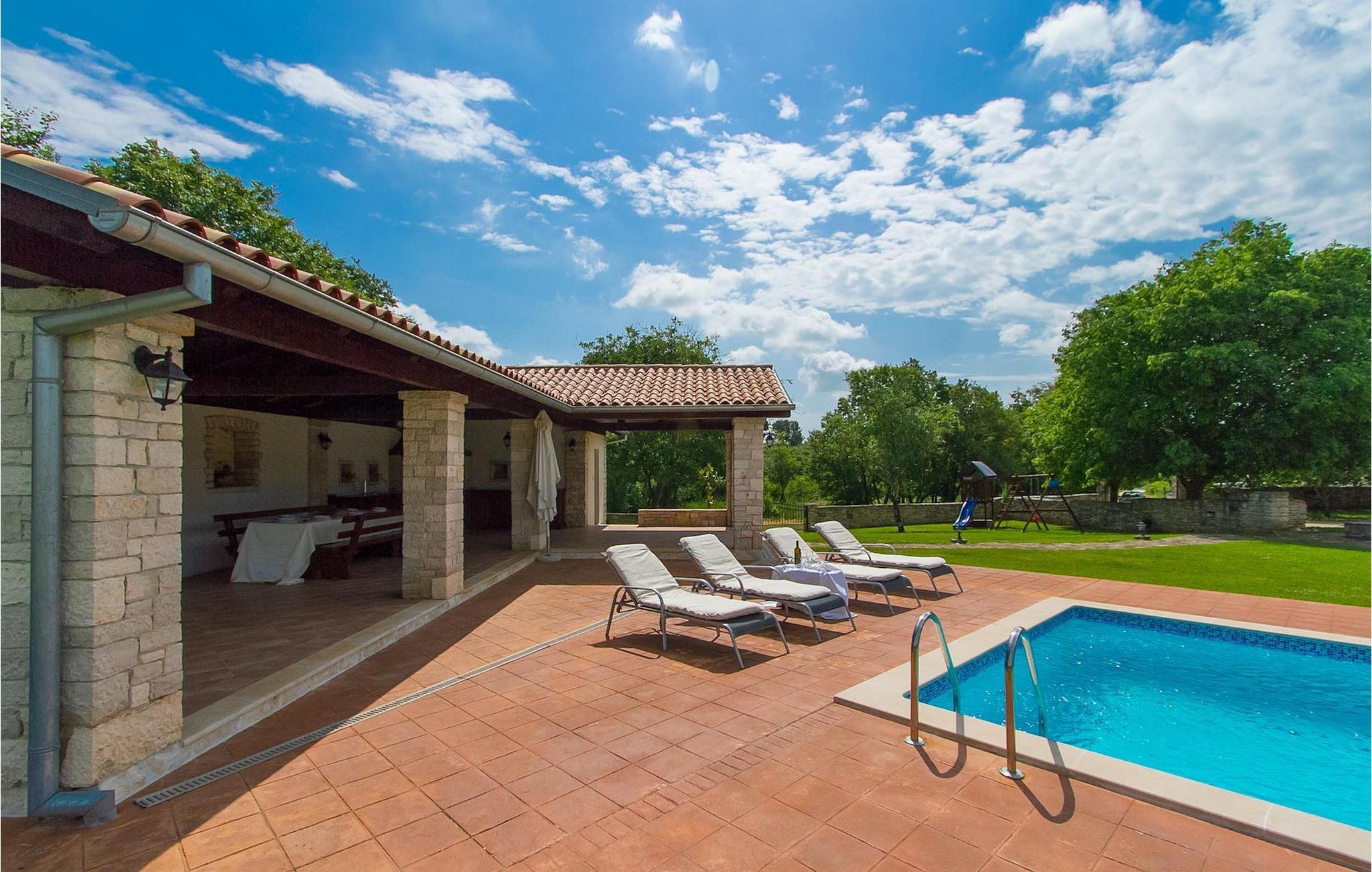 Der Außenbereich umfasst einen komplett eingezäunten großen grünen Garten mit Pool und Liegestühlen ideal zum Entspannen und Genießen in der heißen kroatischen Sonne.