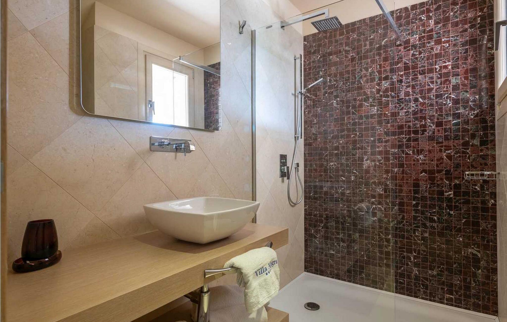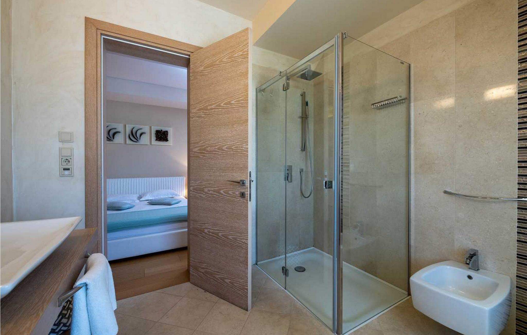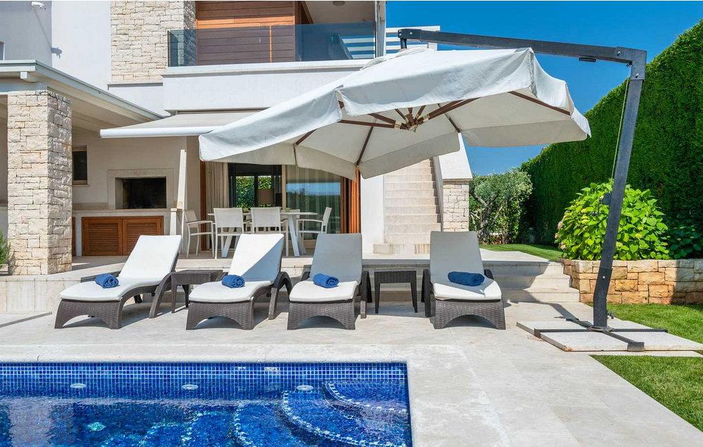 Die Villa befindet sich auf einem eigenen und geschlossenen 700 qm großen Grundstück mit gepflegtem Rasen, 35 qm großem Privatpool, überdachter Terrasse mit Sommerküche und Sitzgarnitur, sowie 1 offenes Parkplatz für 1 Fahrzeug und 1 Parkplatz in der Garage. Diese 2012 erbaute Villa bietet seinen Gästen, dank seiner hochwertigen Ausstattung, hohen Komfort. Für die Ausstattung des Interieurs wurden ausschließlich hochwertige Materialien verwandt – von den Natursteinböden der Küche und Treppen, über die erstklassigen Designerbäder, bis hin zu den Mahagoni Türen und Fenstern, wurde alles in diesem luxuriösen Haus dem Wohlbefinden der Gäste untergeordnet. Abgesehen davon, hat die Villa auch ein ausgeklügeltes Heiz-und Kühlsystem, das eine präzise Einstellung der Temperatur in jedem Zimmer ermöglicht, sowie die Intensität der Fußbodenheizung während der kälteren Perioden des Jahres. Das Haus ist mit noch einem identischen Haus (Doppelhaushälfte) verbunden, aber dank des von viel Grün umzäunten Gartens, wird den Gästen der Villa Allegra absolute Privatsphäre gewährleistet.