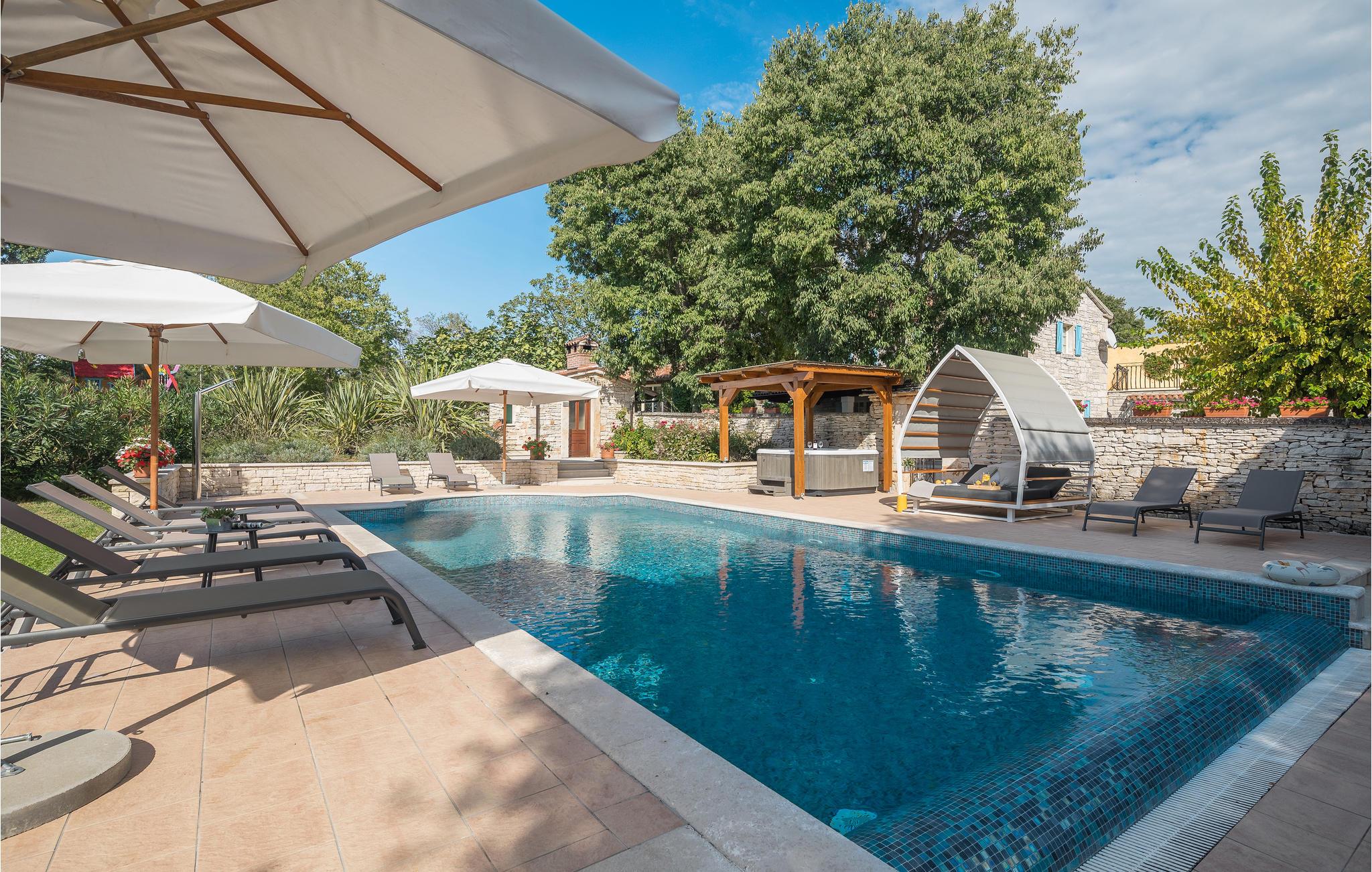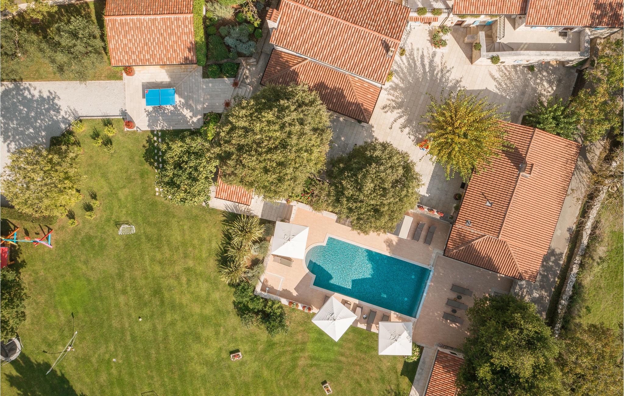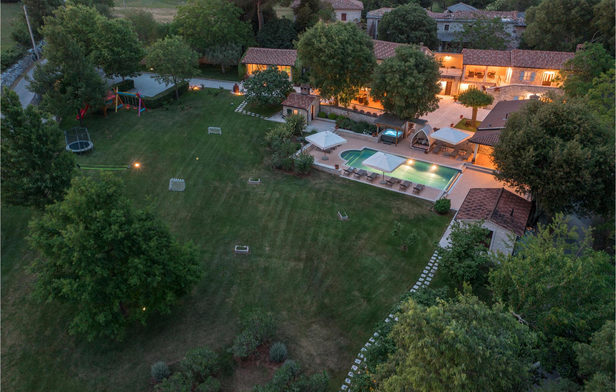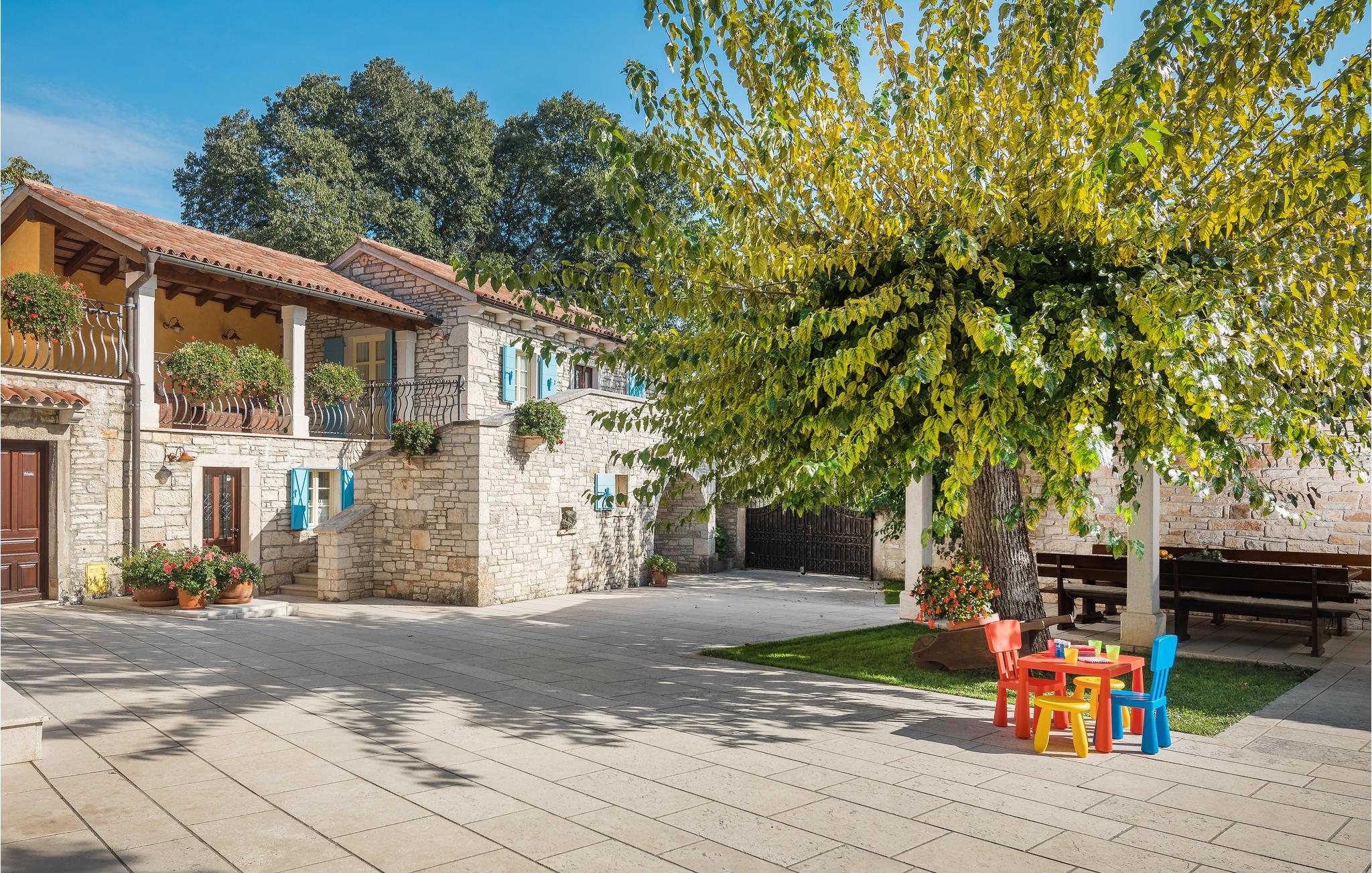 Dieses wunderschöne und exklusive Anwesen in guter Lage, unweit der mittelalterlichen Stadt Tinjan gelegen, lädt Sie zum Entspannen und Wohlfühlen ein. Auf dem 4000 m2 großen, gepflegten Grundstück befinden sich drei gut ausgestattete Wohneinheiten. Sie alle bestehen aus Wohnbereich und Küche, Schlafzimmern und Bad. Das Badezimmer Nr. 6 ist in einem separat Gebäude im Garten. Die Wohnungen verfügen darüber hinaus über einen gemeinsamen Außenpool, Sauna und Fitnessraum. 5 Fahrräder stehen zur Verfügung, womit die Gäste die schöne Gegend und andere Teile Istriens erkunden können. Das Anwesen ist fast 100 Jahre alt, wurde jedoch 2007 komplett renoviert und mit geschmackvollen und rustikalen Möbeln eingerichtet. Besuchen Sie Tinjan, die als Stadt des getrockneten Schinkens - Prsut bekannt ist. Diese Gegend können Sie sehr gut auf Wander- oder Radwegen erforschen, hier können Sie beides gleich gut, ausspannen oder einen Aktivurlaub verbringen. Wir empfehlen Ihnen die Weinstraßen der Region und die malerischen Kleinstädte im Inland und natürlich die berühmten Badestrände von Rabac und Opatija an der Ostküste zu besuchen. Besuchen Sie auch die Cave Baredine! Entdecken Sie die kleinen, mittelalterlichen Städte in der Gegend wie Motovun, wo Ende Juli das jährliche, internationale Filmfestival stattfindet oder Hum, die als die kleinste Stadt der Welt gilt. Fahren Sie entlang der Weinstraße und probieren Sie köstliche, lokal produzierte Weine und entdecken Sie, wie lecker Prsut, ein geräucherter Schinken, oder Trüffel schmecken, die in vielen Konobas angeboten werden.
