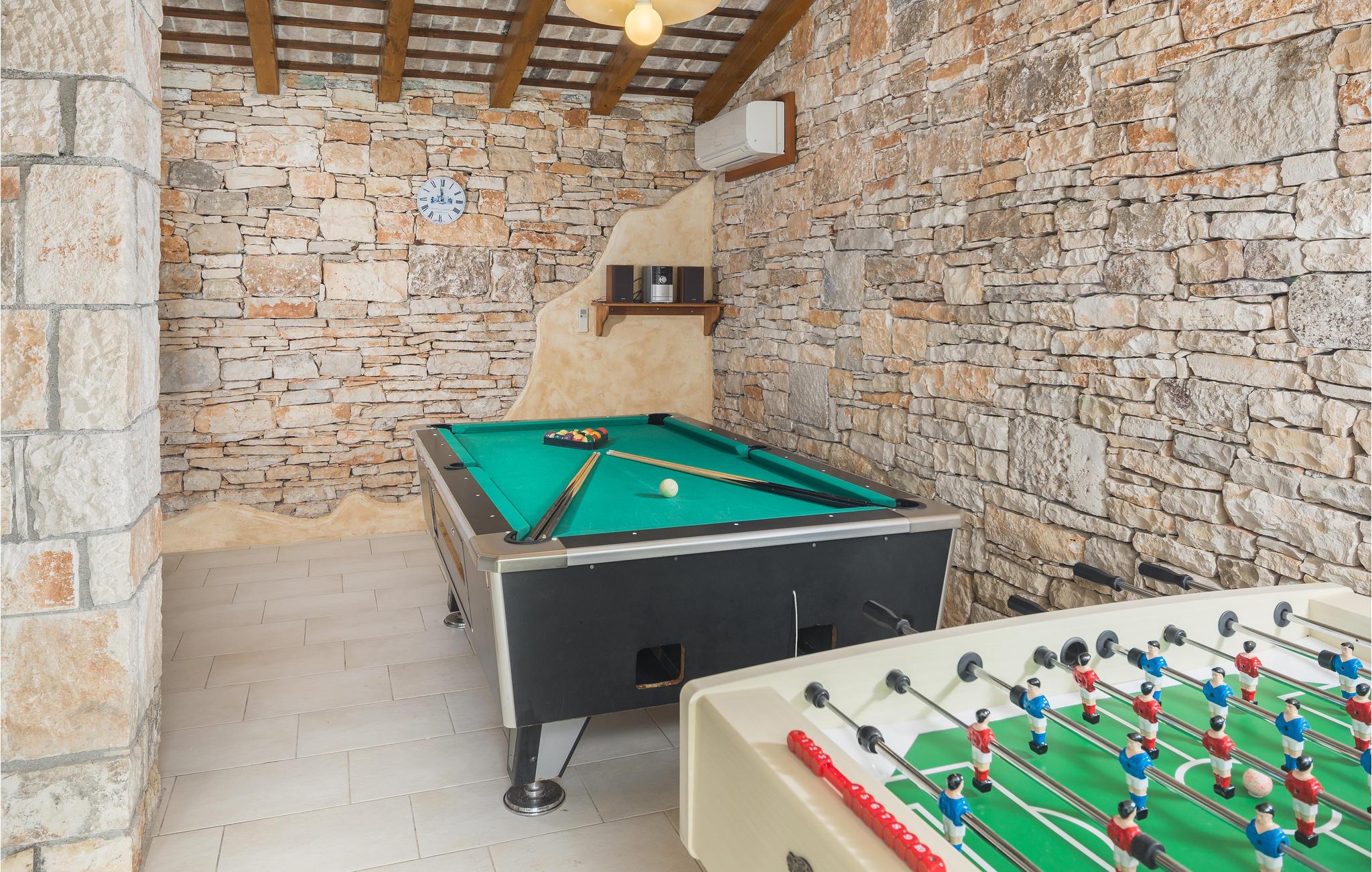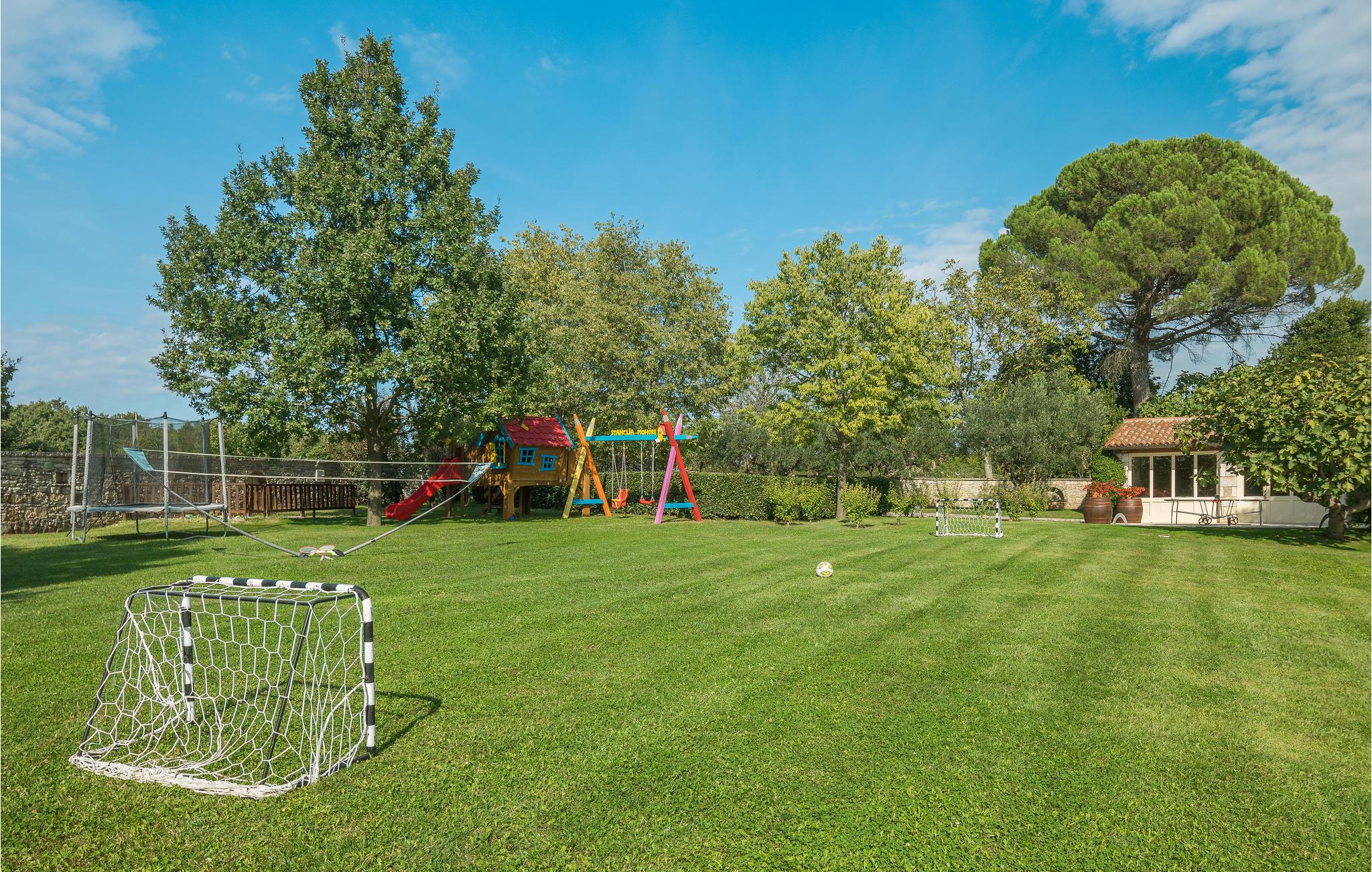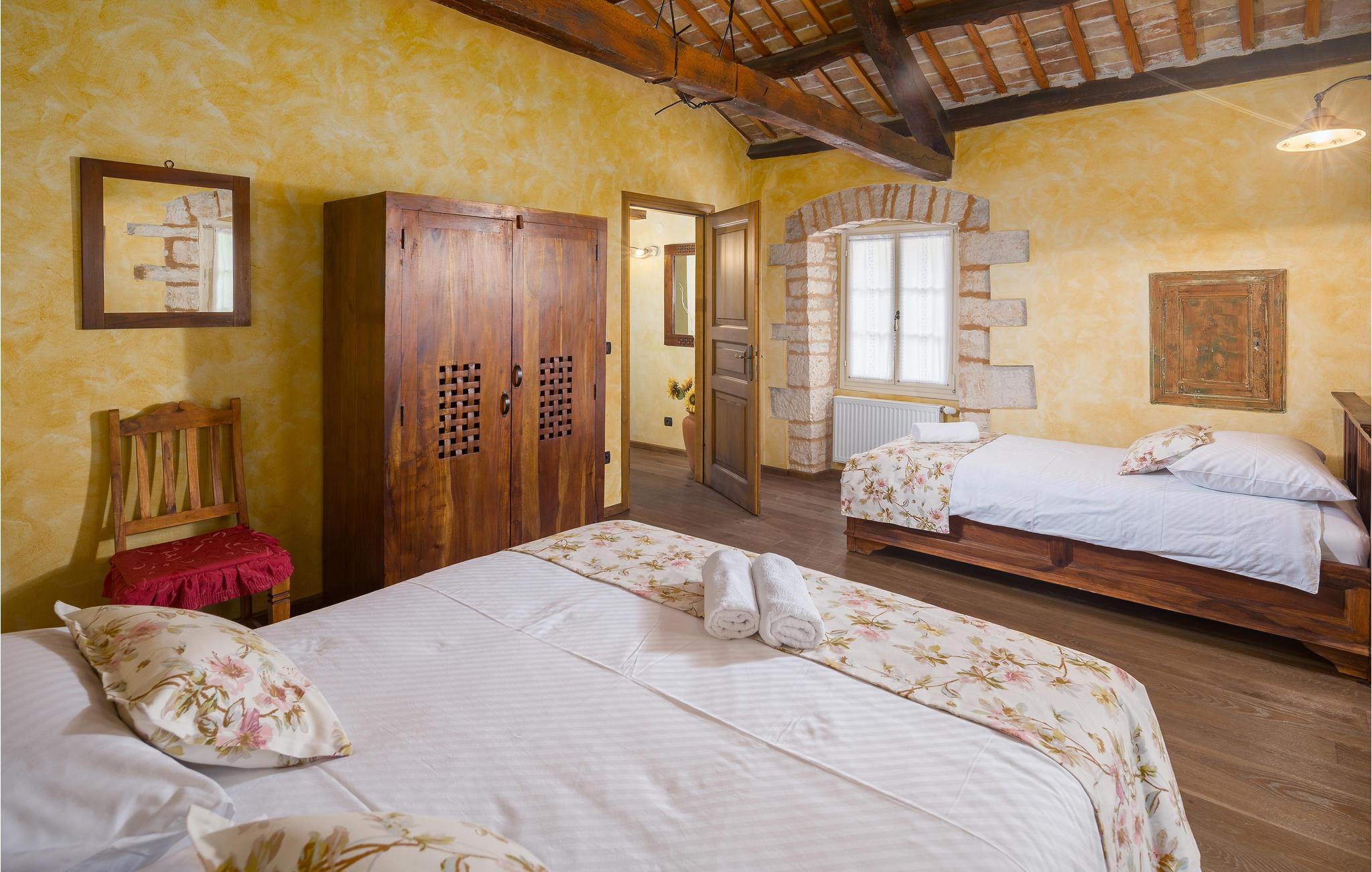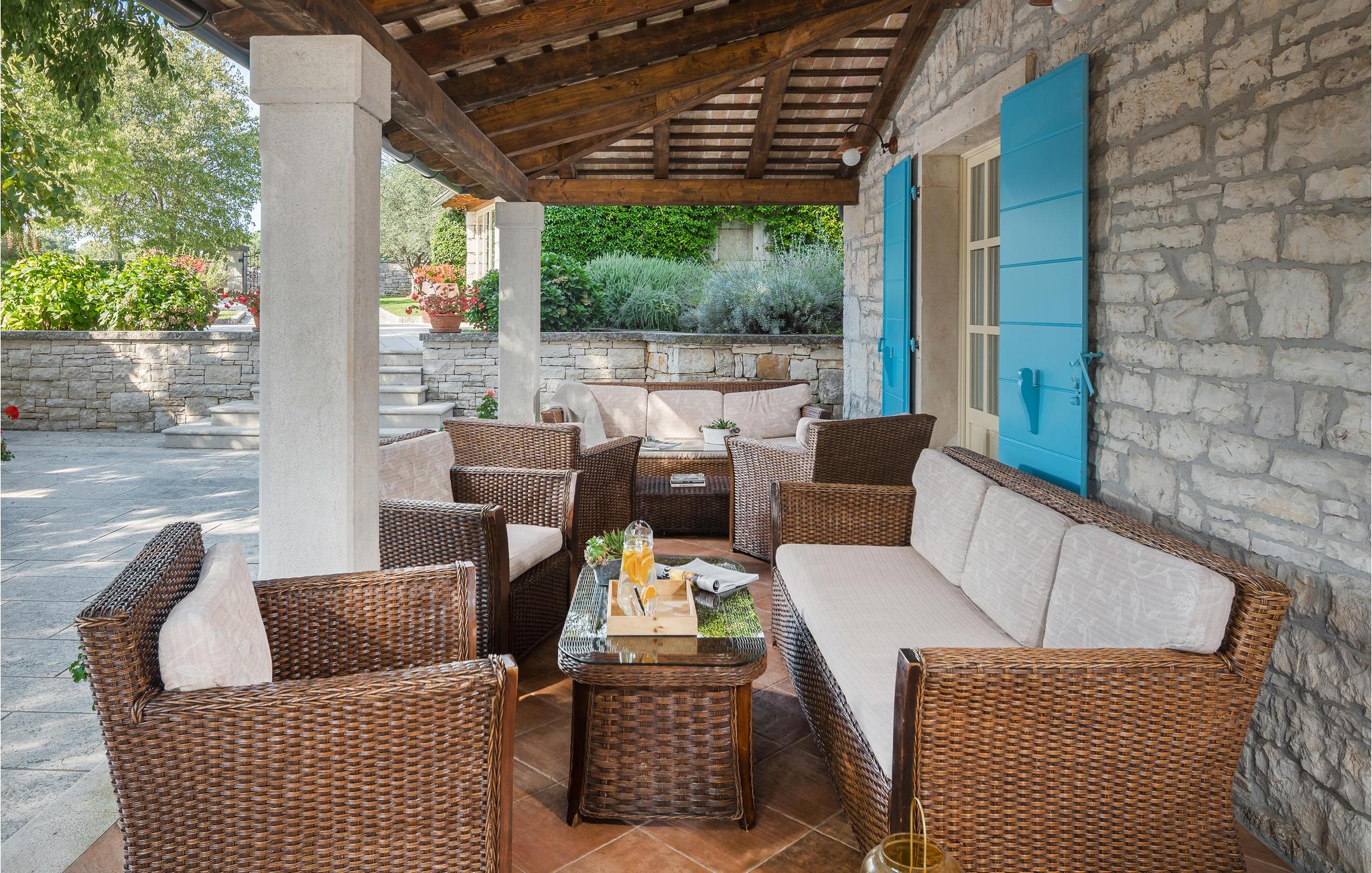 Dieses wunderschöne und exklusive Anwesen in guter Lage, unweit der mittelalterlichen Stadt Tinjan gelegen, lädt Sie zum Entspannen und Wohlfühlen ein. Auf dem 4000 m2 großen, gepflegten Grundstück befinden sich drei gut ausgestattete Wohneinheiten. Sie alle bestehen aus Wohnbereich und Küche, Schlafzimmern und Bad. Das Badezimmer Nr. 6 ist in einem separat Gebäude im Garten. Die Wohnungen verfügen darüber hinaus über einen gemeinsamen Außenpool, Sauna und Fitnessraum. 5 Fahrräder stehen zur Verfügung, womit die Gäste die schöne Gegend und andere Teile Istriens erkunden können. Das Anwesen ist fast 100 Jahre alt, wurde jedoch 2007 komplett renoviert und mit geschmackvollen und rustikalen Möbeln eingerichtet. Besuchen Sie Tinjan, die als Stadt des getrockneten Schinkens - Prsut bekannt ist. Diese Gegend können Sie sehr gut auf Wander- oder Radwegen erforschen, hier können Sie beides gleich gut, ausspannen oder einen Aktivurlaub verbringen. Wir empfehlen Ihnen die Weinstraßen der Region und die malerischen Kleinstädte im Inland und natürlich die berühmten Badestrände von Rabac und Opatija an der Ostküste zu besuchen. Besuchen Sie auch die Cave Baredine! Entdecken Sie die kleinen, mittelalterlichen Städte in der Gegend wie Motovun, wo Ende Juli das jährliche, internationale Filmfestival stattfindet oder Hum, die als die kleinste Stadt der Welt gilt. Fahren Sie entlang der Weinstraße und probieren Sie köstliche, lokal produzierte Weine und entdecken Sie, wie lecker Prsut, ein geräucherter Schinken, oder Trüffel schmecken, die in vielen Konobas angeboten werden.