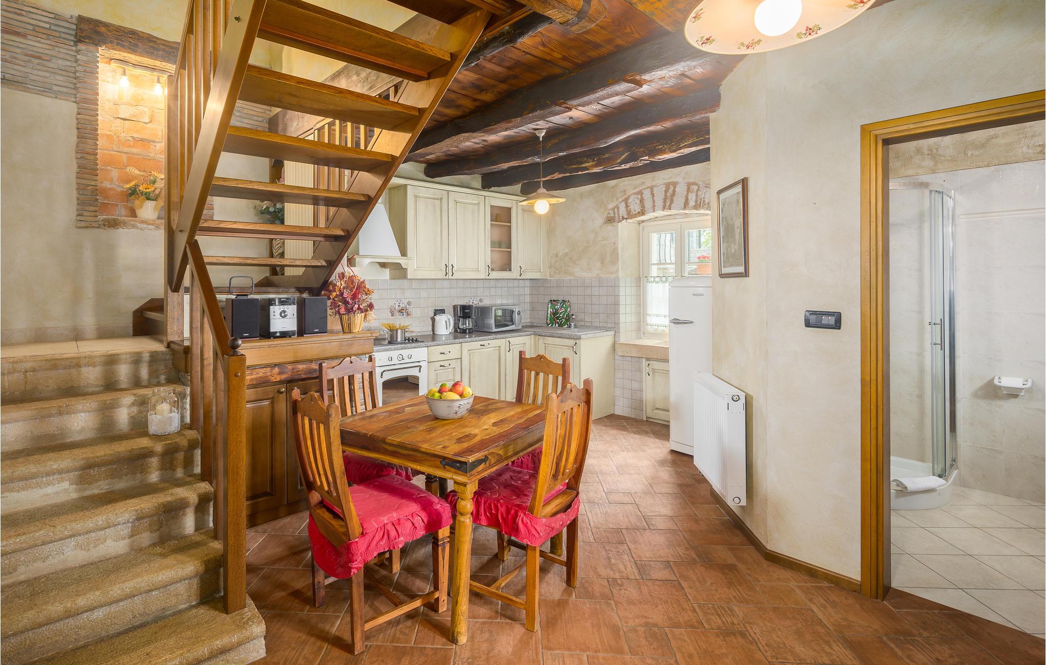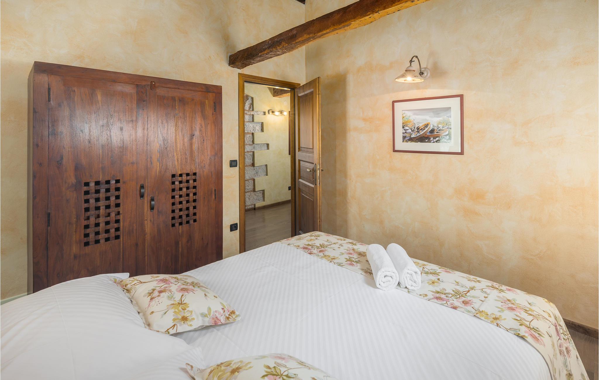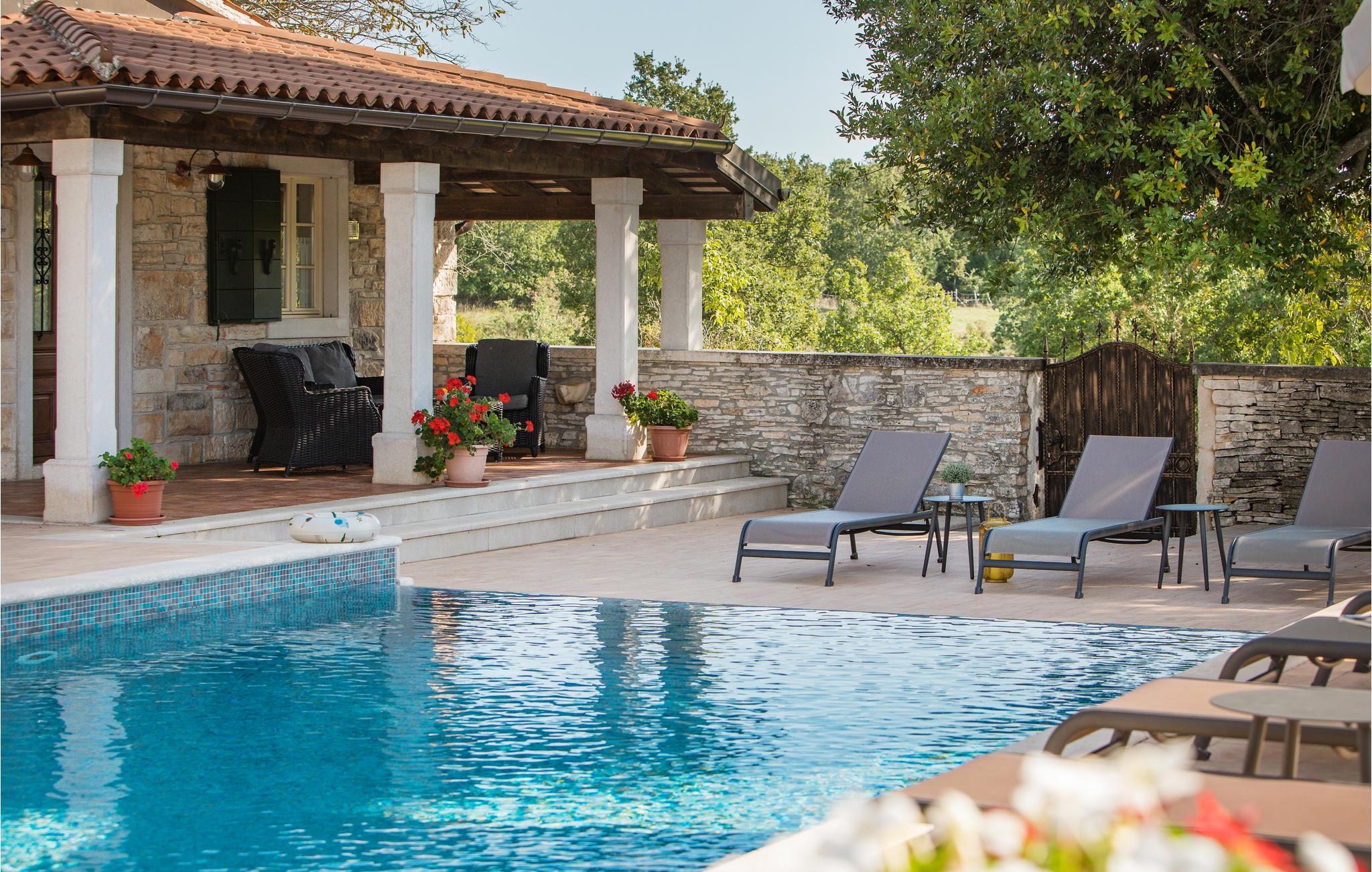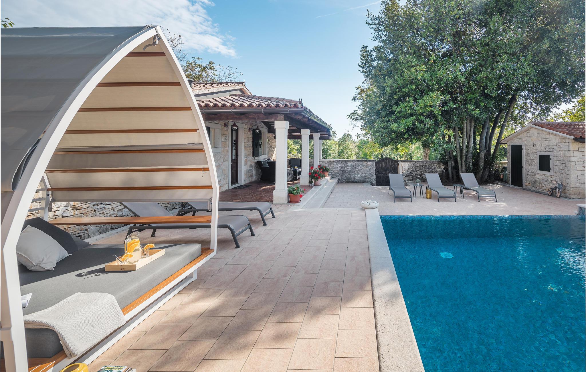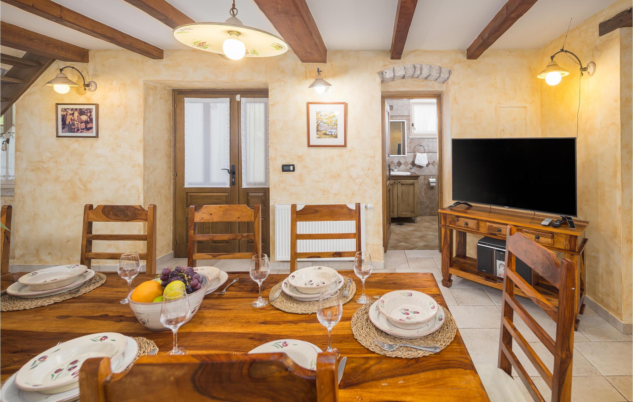 Dieses wunderschöne und exklusive Anwesen in guter Lage, unweit der mittelalterlichen Stadt Tinjan gelegen, lädt Sie zum Entspannen und Wohlfühlen ein. Auf dem 4000 m2 großen, gepflegten Grundstück befinden sich drei gut ausgestattete Wohneinheiten. Sie alle bestehen aus Wohnbereich und Küche, Schlafzimmern und Bad. Das Badezimmer Nr. 6 ist in einem separat Gebäude im Garten. Die Wohnungen verfügen darüber hinaus über einen gemeinsamen Außenpool, Sauna und Fitnessraum. 5 Fahrräder stehen zur Verfügung, womit die Gäste die schöne Gegend und andere Teile Istriens erkunden können. Das Anwesen ist fast 100 Jahre alt, wurde jedoch 2007 komplett renoviert und mit geschmackvollen und rustikalen Möbeln eingerichtet. Besuchen Sie Tinjan, die als Stadt des getrockneten Schinkens - Prsut bekannt ist. Diese Gegend können Sie sehr gut auf Wander- oder Radwegen erforschen, hier können Sie beides gleich gut, ausspannen oder einen Aktivurlaub verbringen. Wir empfehlen Ihnen die Weinstraßen der Region und die malerischen Kleinstädte im Inland und natürlich die berühmten Badestrände von Rabac und Opatija an der Ostküste zu besuchen. Besuchen Sie auch die Cave Baredine! Entdecken Sie die kleinen, mittelalterlichen Städte in der Gegend wie Motovun, wo Ende Juli das jährliche, internationale Filmfestival stattfindet oder Hum, die als die kleinste Stadt der Welt gilt. Fahren Sie entlang der Weinstraße und probieren Sie köstliche, lokal produzierte Weine und entdecken Sie, wie lecker Prsut, ein geräucherter Schinken, oder Trüffel schmecken, die in vielen Konobas angeboten werden.
