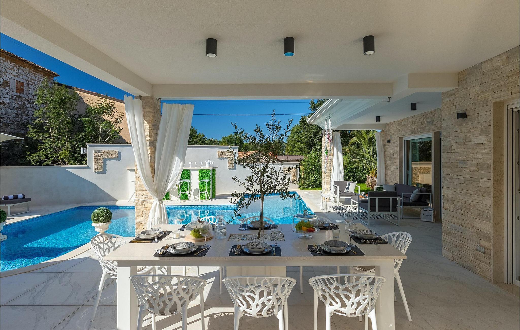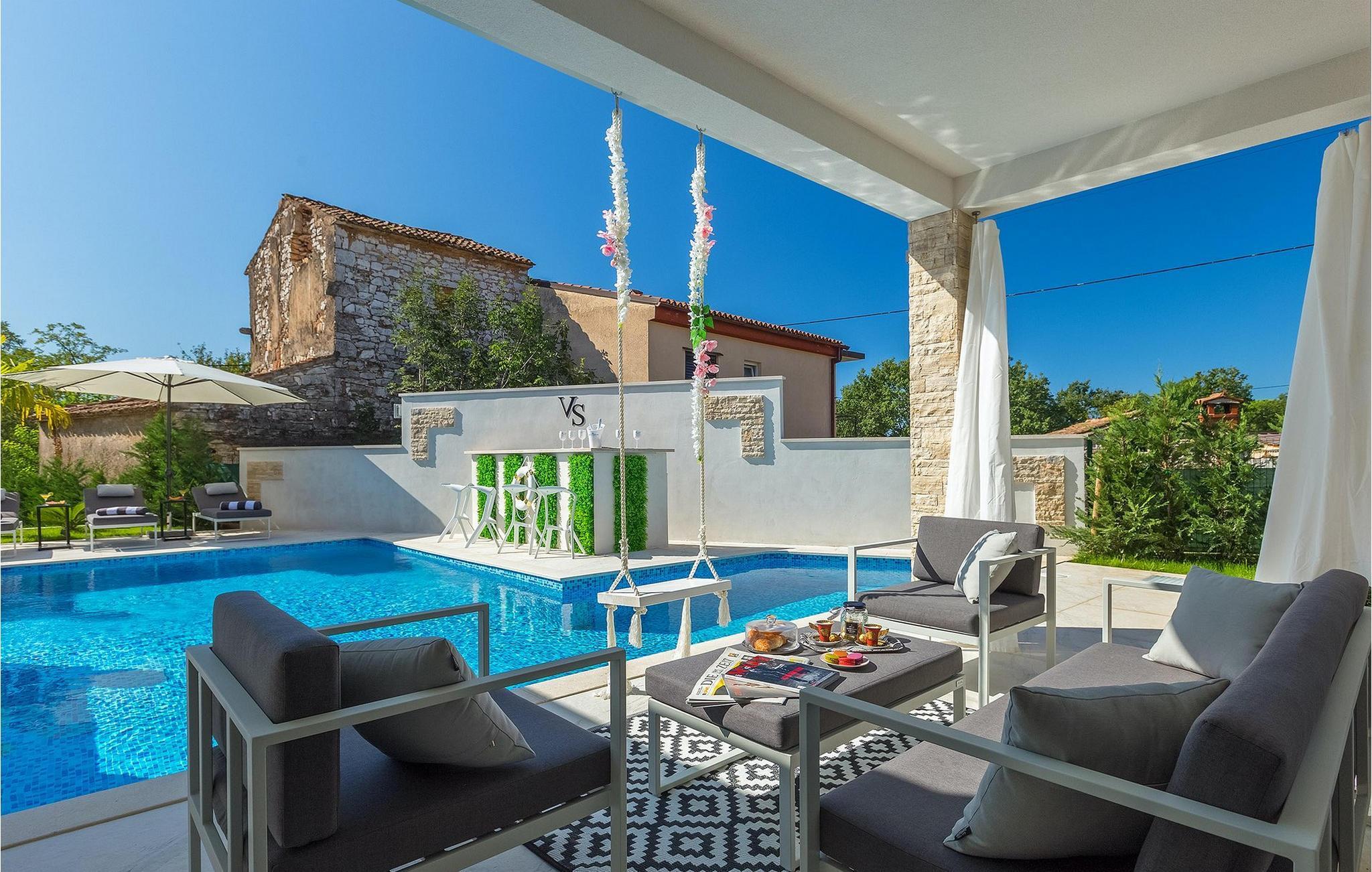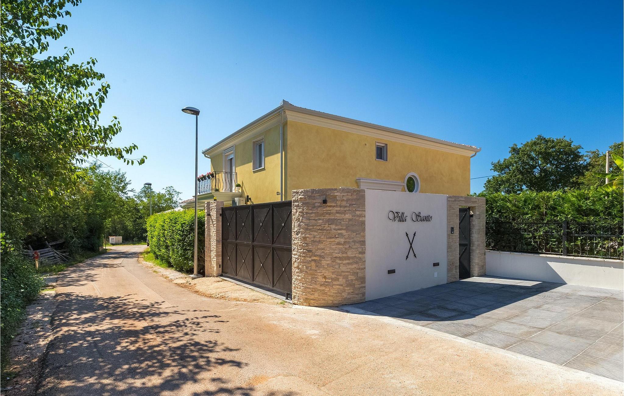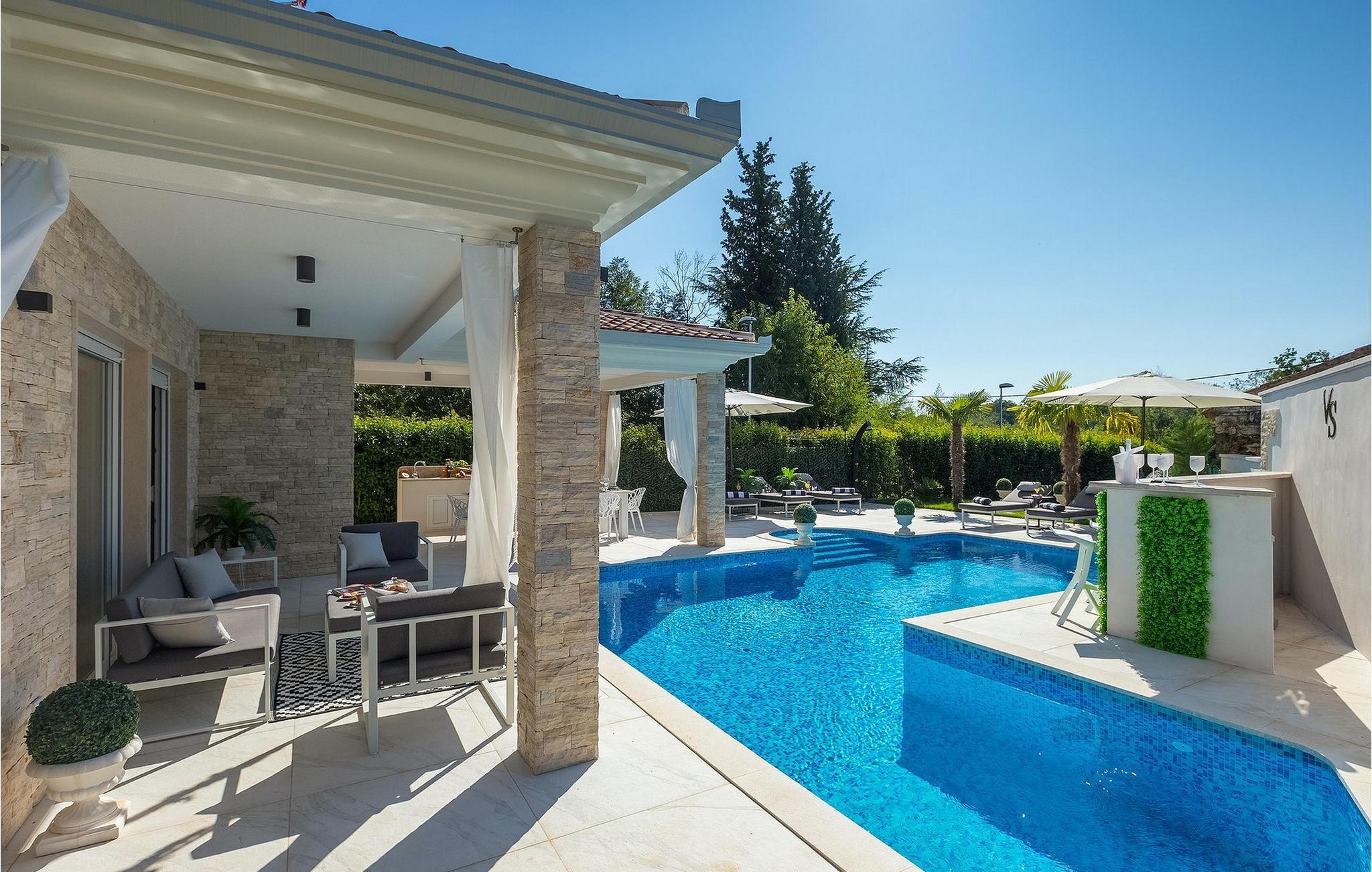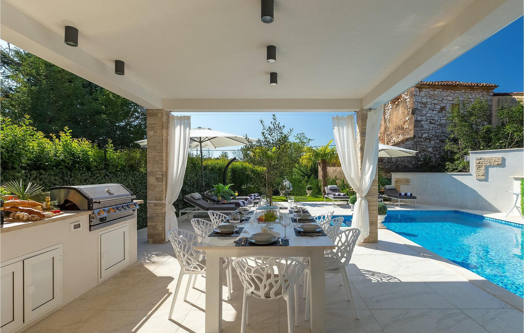 Betreten Sie die prächtige Villa Santo, die ideale Kombination aus traditionellem istrischen Stil und modernen Möbeln. Elegante und moderne Details sind das Hauptmerkmal dieser Villa in Kombination mit der Steinfassade. Das Besondere an der Villa Santo ist das private Kino im ersten Stock, in dem 6 Massagestühle, ein 75-Zoll-Fernseher und eine Popcornmaschine für echtes Filmvergnügen mit Familie und Freunden sind. Wir sind sicher, dass Sie viele unvergessliche Momente und Filmabende in diesem charmanten kleinen Kino verbringen werden. Das Innere der Villa Santo ist hinreißend und bietet Platz für insgesamt 8 Personen in einer wunderschönen Umgebung. Die Villa ist in zwei Etagen unterteilt, in denen moderne Details herrschen. Im Erdgeschoss der Villa befindet sich ein offener Raum, in dem sich ein Wohnzimmer, eine Küche mit Essbereich, ein Schlafzimmer und ein Badezimmer befinden. Im ersten Stock befinden sich 3 komfortable Schlafzimmer, 2 Badezimmer und das Kino. Atemberaubende Schlafzimmer bieten Ihnen Ruhe und Komfort unter schönen Baldahinen. Vom Wohnzimmer aus haben Sie einen Zugang zur Außenterrasse mit privatem Pool und Liegestühlen sowie einen Essbereich im Freien, in dem Sie in der Außenküche neben dem Pool grillen können. Erfrischen Sie sich an heißen Sommertagen im großen Pool und genießen Sie den Sommer in diesem magischen Klima. Wir sind sicher, dass die Villa Santo Ihnen in dieser göttlichen Residenz den Urlaub ermöglichen wird, den Sie verdienen. Ganz am Ende der Westkäste der istrischen Halbinsel liegt die prächtige Stadt Umag. Reiche Geschichte, kristallklares Meer und magische Strände schmücken diese Landschaft. Die Stadtmauer sowie die berühmte Brücke wurden im 10. Jahrhundert gebaut. Einer der ebenfalls berühmten Sehenswürdigkeiten ist die Kirche St. Rocha, die im Jahr 1507 nach der Pestepidemie gebaut wurde. Die Villa Santo liegt nur 9 Autominuten von der Stadt Umag entfernt. Sie können viele berühmten Sehenswürdigkeiten wie den berühmten Savudrija Leuchtturm besuchen der 20 Autominuten von der Villa entfernt ist. Fels- und Kiesstrände im Camp Finida liegen nur 1,2 km entfernt. Gastronomie Liebhaber werden vom Restaurants und Weinkellereien Angebot in der Umgebung begeistert sein. Wenn Sie Abendessen für Ihre Lieben vorbereiten möchten, finden Sie alle notwendigen Lebensmittel in Supermarketen und kleinen Geschäften im Umkreisvon von 2 km von der Villa.