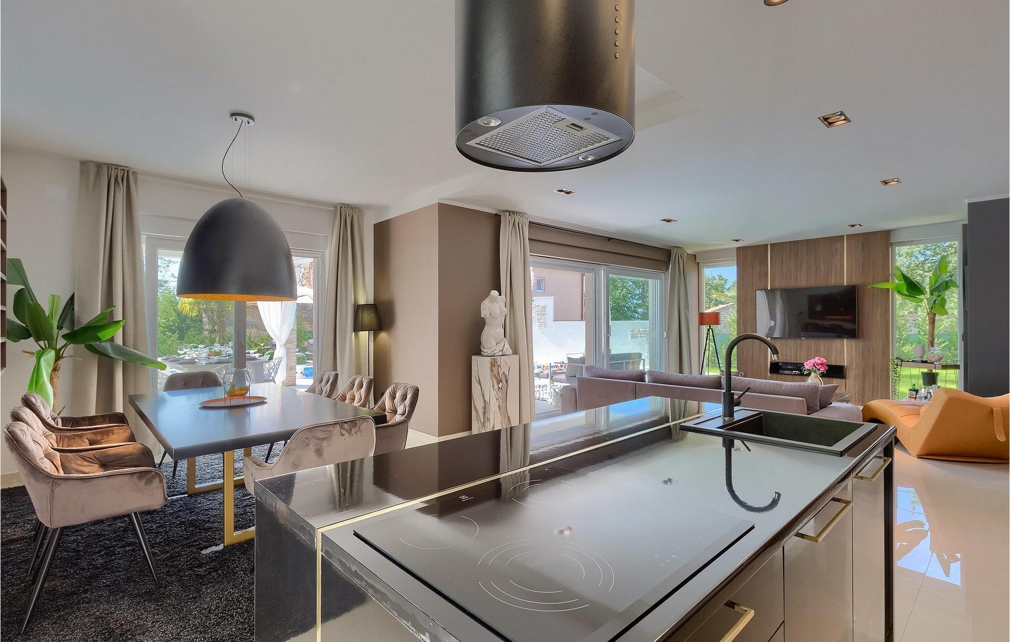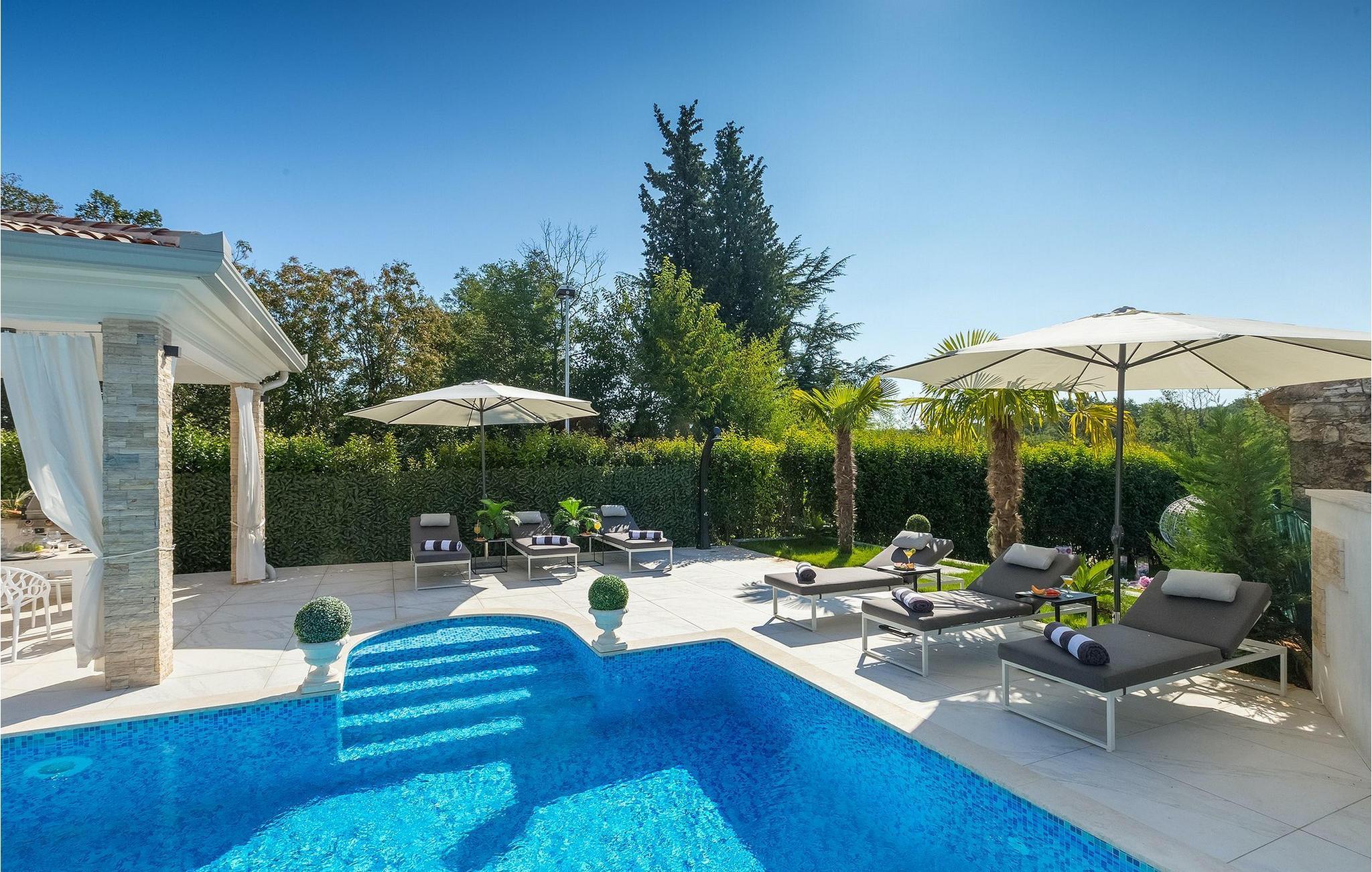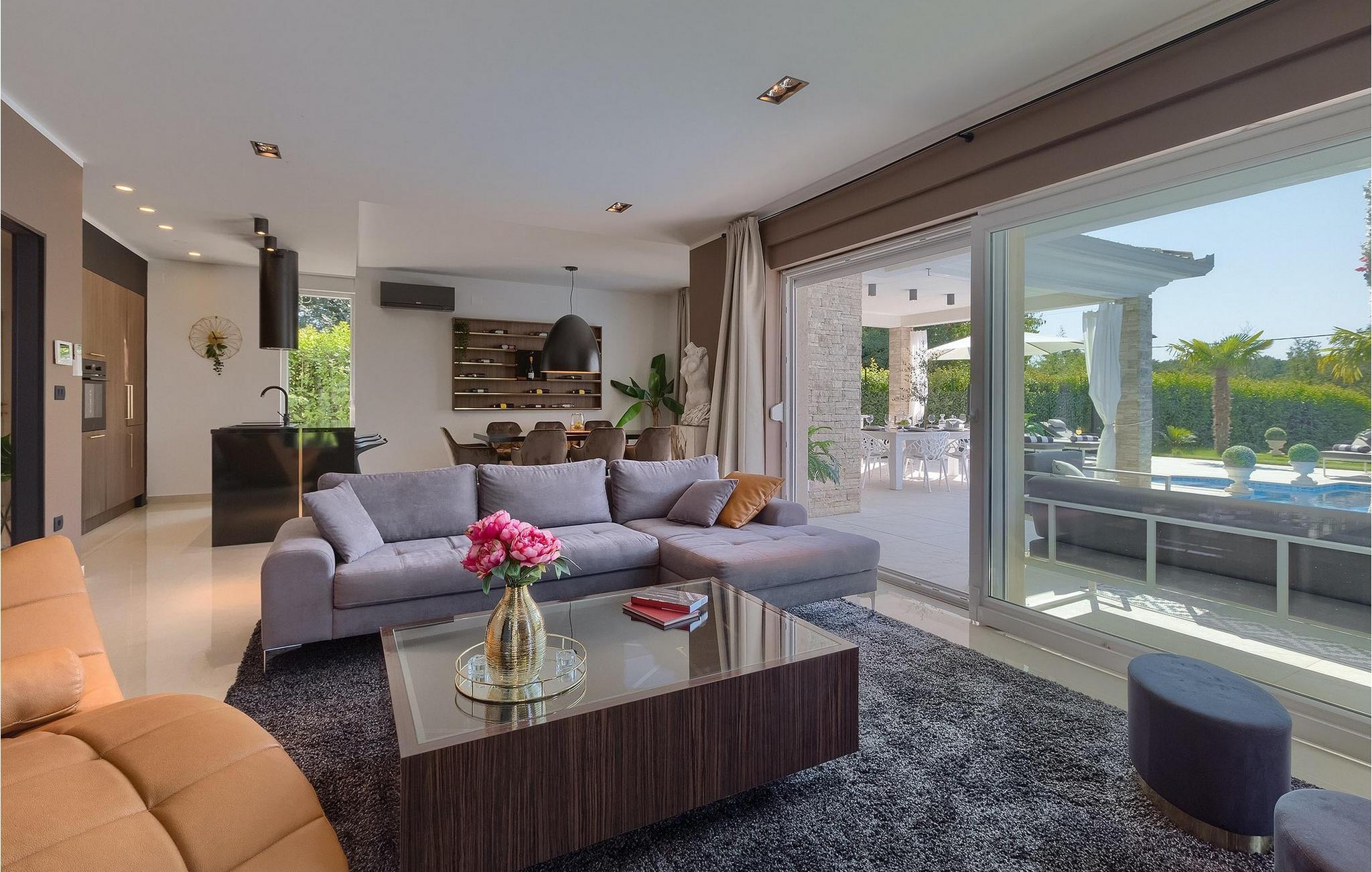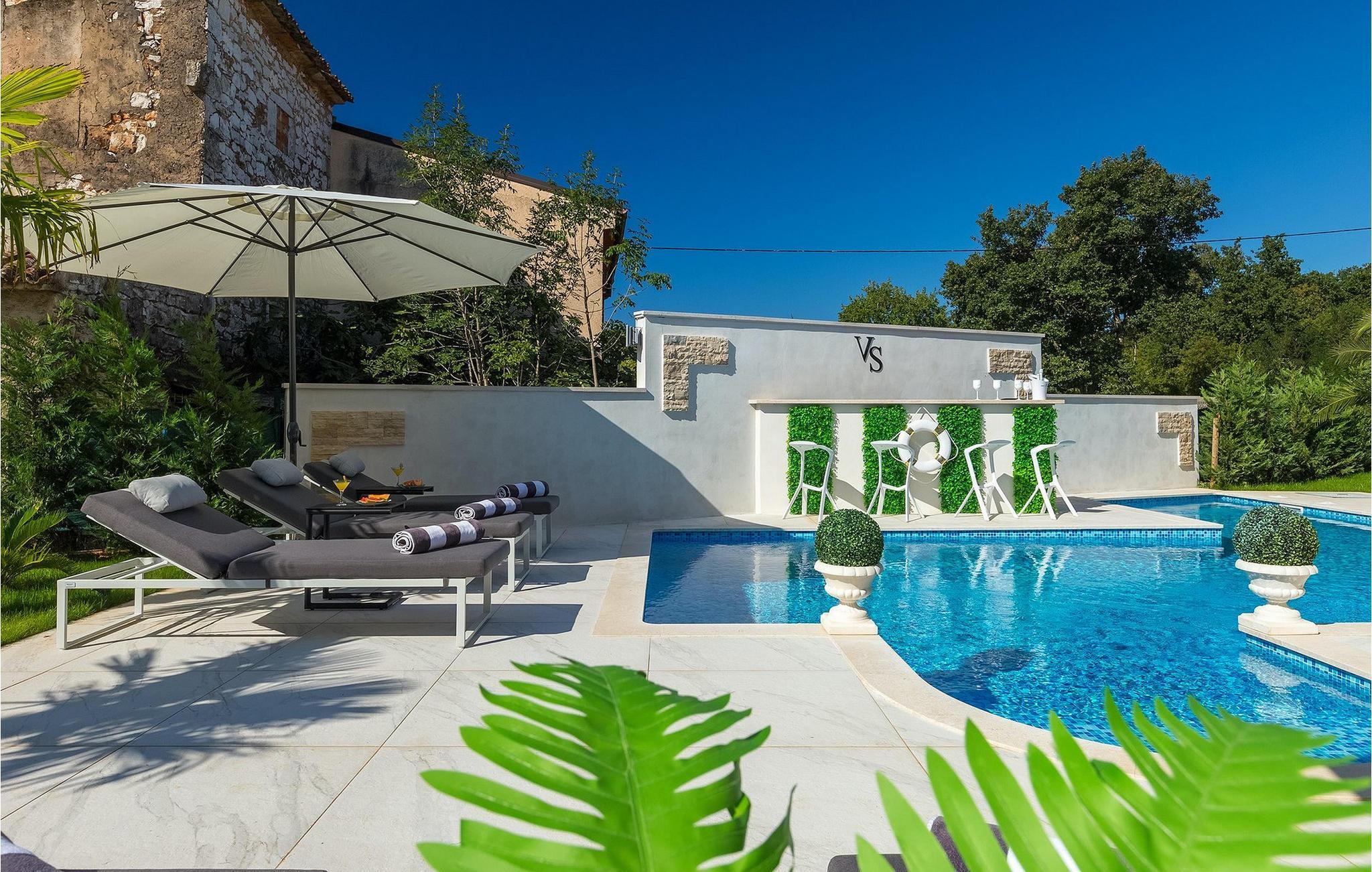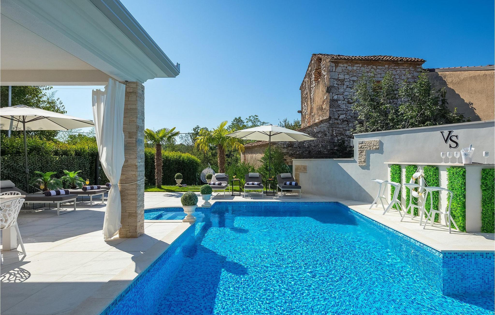 Betreten Sie die prächtige Villa Santo, die ideale Kombination aus traditionellem istrischen Stil und modernen Möbeln. Elegante und moderne Details sind das Hauptmerkmal dieser Villa in Kombination mit der Steinfassade. Das Besondere an der Villa Santo ist das private Kino im ersten Stock, in dem 6 Massagestühle, ein 75-Zoll-Fernseher und eine Popcornmaschine für echtes Filmvergnügen mit Familie und Freunden sind. Wir sind sicher, dass Sie viele unvergessliche Momente und Filmabende in diesem charmanten kleinen Kino verbringen werden. Das Innere der Villa Santo ist hinreißend und bietet Platz für insgesamt 8 Personen in einer wunderschönen Umgebung. Die Villa ist in zwei Etagen unterteilt, in denen moderne Details herrschen. Im Erdgeschoss der Villa befindet sich ein offener Raum, in dem sich ein Wohnzimmer, eine Küche mit Essbereich, ein Schlafzimmer und ein Badezimmer befinden. Im ersten Stock befinden sich 3 komfortable Schlafzimmer, 2 Badezimmer und das Kino. Atemberaubende Schlafzimmer bieten Ihnen Ruhe und Komfort unter schönen Baldahinen. Vom Wohnzimmer aus haben Sie einen Zugang zur Außenterrasse mit privatem Pool und Liegestühlen sowie einen Essbereich im Freien, in dem Sie in der Außenküche neben dem Pool grillen können. Erfrischen Sie sich an heißen Sommertagen im großen Pool und genießen Sie den Sommer in diesem magischen Klima. Wir sind sicher, dass die Villa Santo Ihnen in dieser göttlichen Residenz den Urlaub ermöglichen wird, den Sie verdienen. Ganz am Ende der Westkäste der istrischen Halbinsel liegt die prächtige Stadt Umag. Reiche Geschichte, kristallklares Meer und magische Strände schmücken diese Landschaft. Die Stadtmauer sowie die berühmte Brücke wurden im 10. Jahrhundert gebaut. Einer der ebenfalls berühmten Sehenswürdigkeiten ist die Kirche St. Rocha, die im Jahr 1507 nach der Pestepidemie gebaut wurde. Die Villa Santo liegt nur 9 Autominuten von der Stadt Umag entfernt. Sie können viele berühmten Sehenswürdigkeiten wie den berühmten Savudrija Leuchtturm besuchen der 20 Autominuten von der Villa entfernt ist. Fels- und Kiesstrände im Camp Finida liegen nur 1,2 km entfernt. Gastronomie Liebhaber werden vom Restaurants und Weinkellereien Angebot in der Umgebung begeistert sein. Wenn Sie Abendessen für Ihre Lieben vorbereiten möchten, finden Sie alle notwendigen Lebensmittel in Supermarketen und kleinen Geschäften im Umkreisvon von 2 km von der Villa.