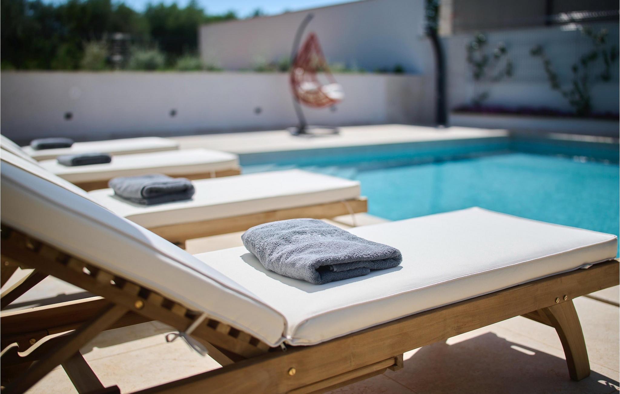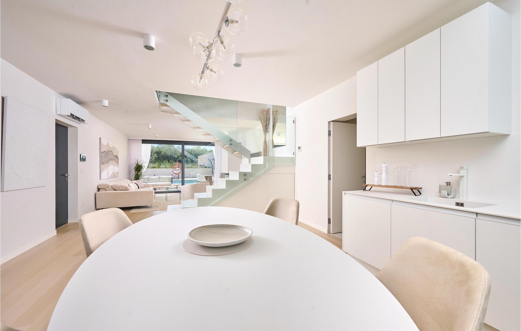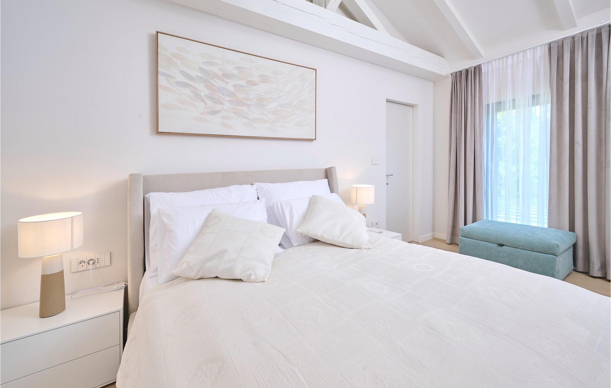 Beide Schlafzimmer befinden sich im ersten Stock. Die Schlafzimmer sind modern und komfortabel. Beide Zimmer verfügen über einen Fernseher und sind klimatisiert. Das Hauptschlafzimmer bietet ein Doppelbett, während das zweite Zimmer ein Doppelbett bietet, das in zwei Einzelbetten geteilt werden kann. Auf der gleichen Etage befindet sich auch ein Badezimmer. Im Erdgeschoss der Villa finden Sie ein helles, modern eingerichtetes Wohnzimmer mit Kamin und Fernseher sowie ein Essbereich und eine voll ausgestattete Küche, die in einem Open-Space-Konzept verbunden sind. Es gibt auch ein weiteres Badezimmer auf der Etage. Dieser Bereich ist klimatisiert und ideal für Ihren Urlaub. Der Garten der Villa bietet Ihnen verschiedene Orte zum Entspannen. An erster Stelle steht ein privater Pool mit Sonnenliegen. Für eine Pause vom Sonnenbaden und Schwimmen können Sie den schattigen Teil der Terrasse mit Relaxecke direkt neben dem Haus genießen. Im Garten finden Sie auch einen schattigen Essbereich mit Esstisch sowie einen Grill, wo Sie Ihre Kochkünste ausprobieren können.