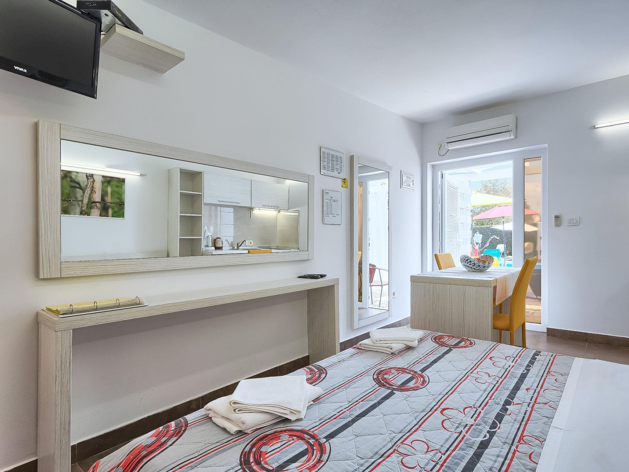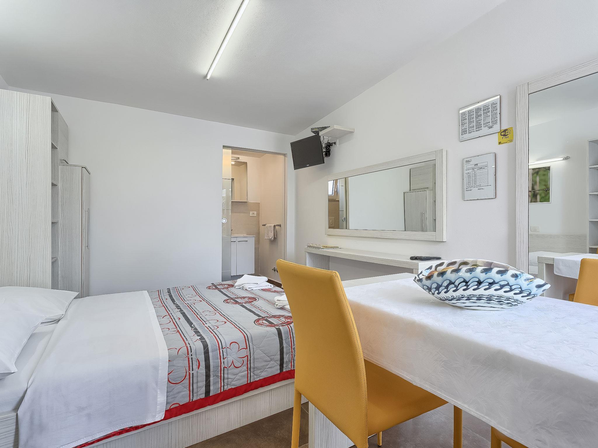 1-room apartment 18 m2, on the ground floor. Studio with 1 french bed (160 cm, length 200 cm), satellite TV (flat screen), air conditioning. Exit to the terrace, to the swimming pool. Open kitchen (2 ceramic glass hob hotplates, microwave) with dining table. Shower/WC. Terrace 6 m2, roofed. Terrace furniture. View of the swimming pool. Facilities: Internet (WiFi, free).