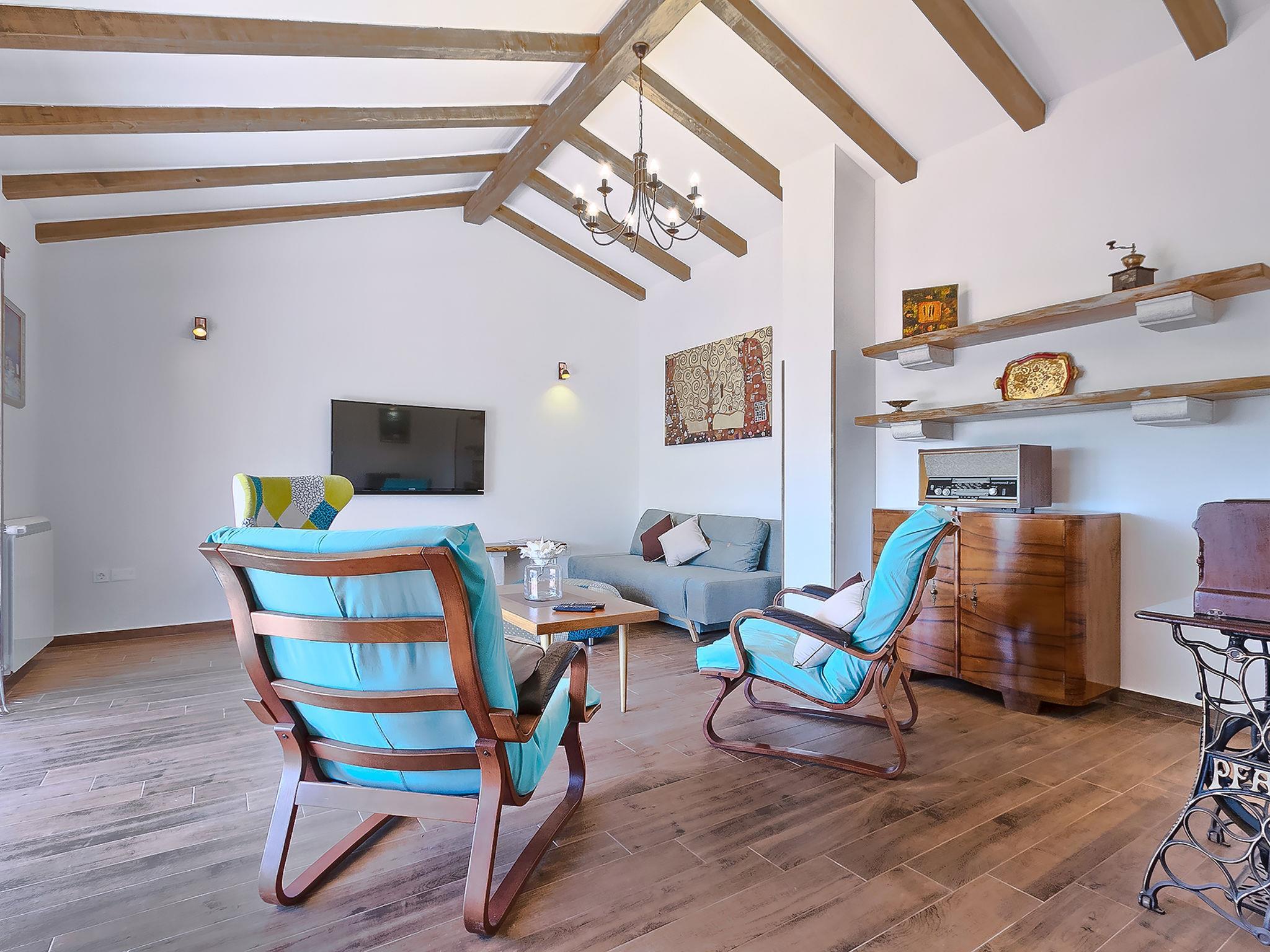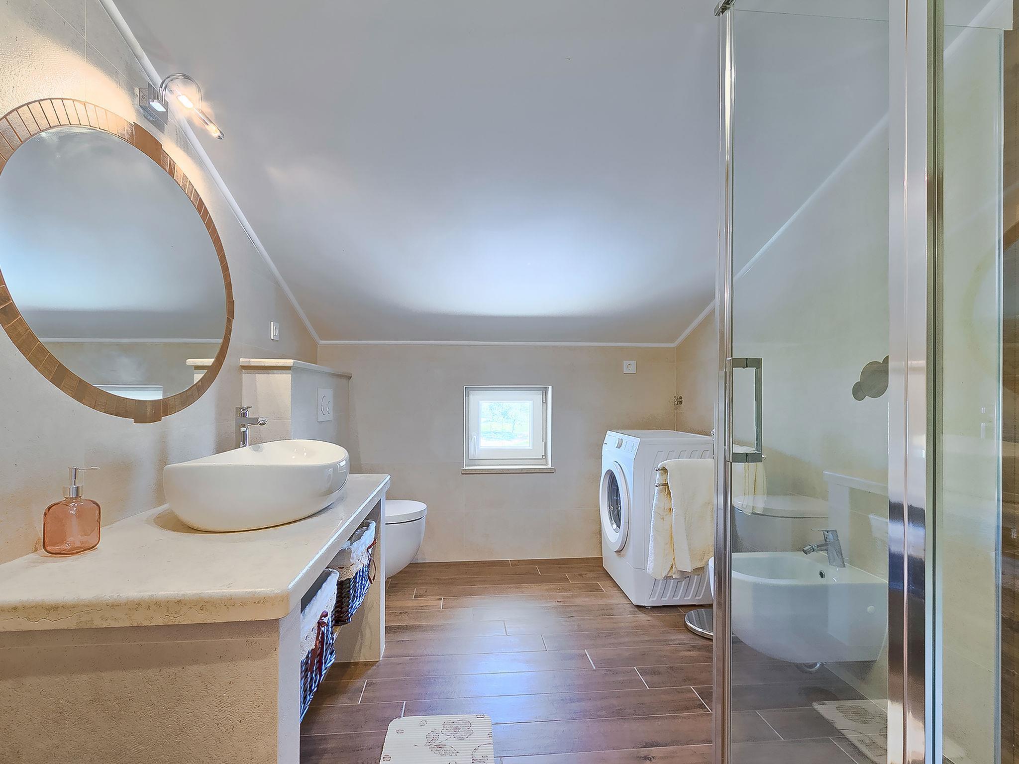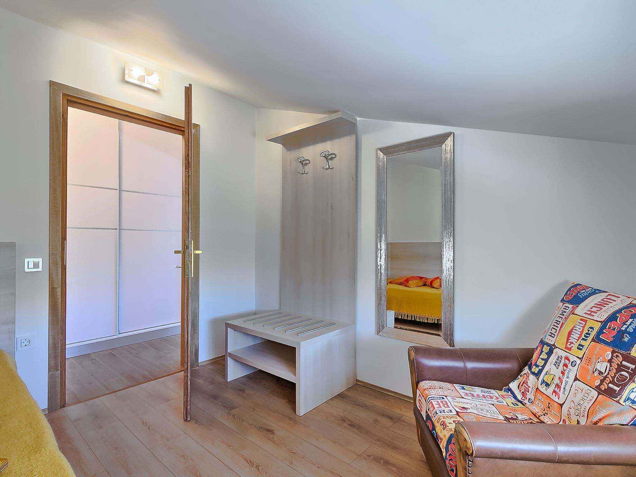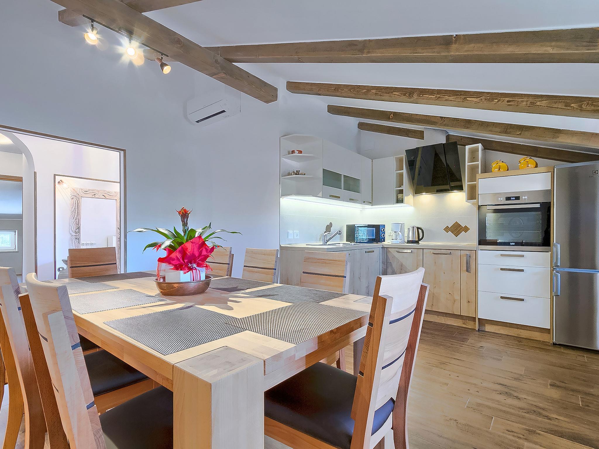 4-room apartment 124 m2, on the top floor. Living/dining room, with sloping ceilings, ceiling height 150 - 300 cm with 1 sofabed (160 cm, length 200 cm), satellite TV (flat screen), air conditioning. Exit to the terrace. 2 rooms with sloping ceilings, ceiling height 150 - 300 cm, each room with 1 french bed (160 cm, length 200 cm). 1 room with sloping ceilings, ceiling height 150 - 300 cm with 1 bed (90 cm, length 200 cm). With sloping ceilings, open kitchen (oven, dishwasher, 4 ceramic glass hob hotplates, microwave, freezer, electric coffee machine), ceiling height 150 - 300 cm. Shower/WC, shower/bidet/WC. Heating (extra). Terrace 20 m2. Terrace furniture, deck chairs. View of the swimming pool. Facilities: washing machine. Internet (WiFi, free). Please note: private entrance.