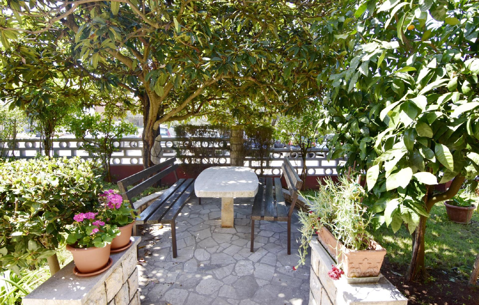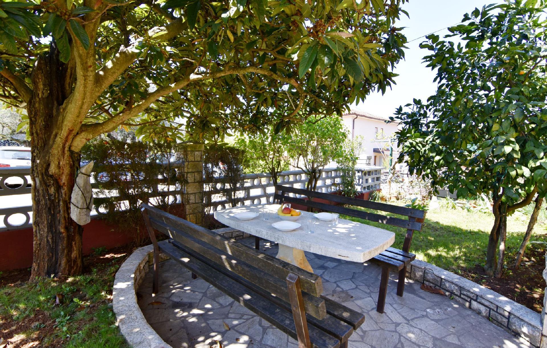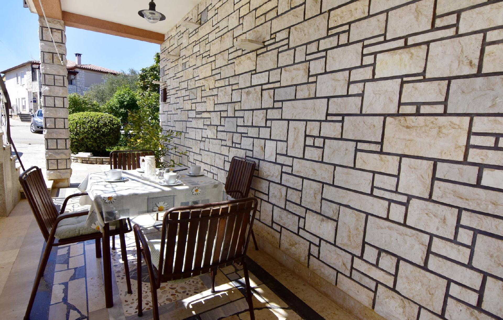 Outside, enjoy the idyllic covered terrace, furnished with a table and chairs, ideal for al fresco dining. The carefully tended garden invites you to linger and relax with an Istrian stone table and benches in the shade. A taverna with barbecue and dining area is located at the rear of the house for communal use - perfect for spending cosy evenings in good company.