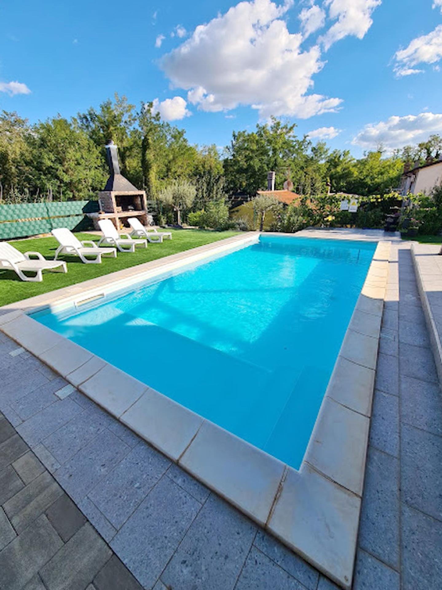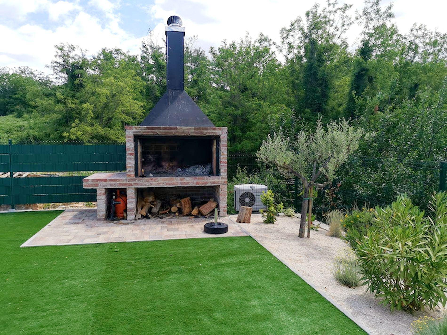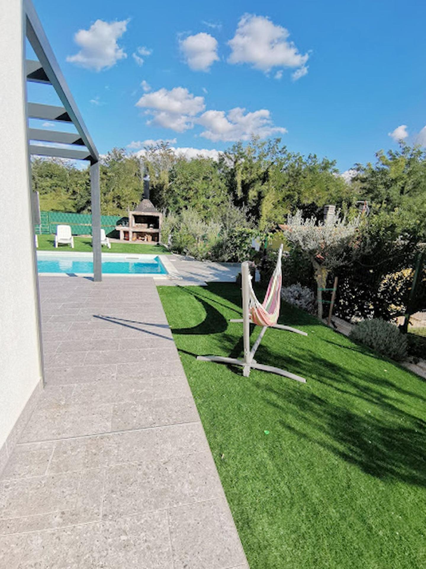 The idyllic setting continues outside: a spacious, covered terrace provides the perfect setting for morning breakfasts under the blue sky or evening socialising. The view of the well-tended garden, the private pool and the picturesque Istrian landscape makes every minute spent outdoors a pleasure. In addition, the nearby free car park facilitates your mobility during your stay.