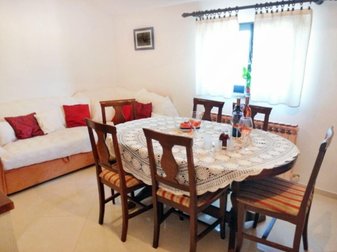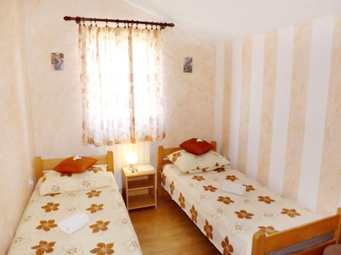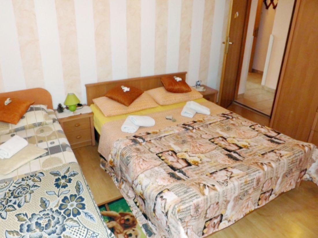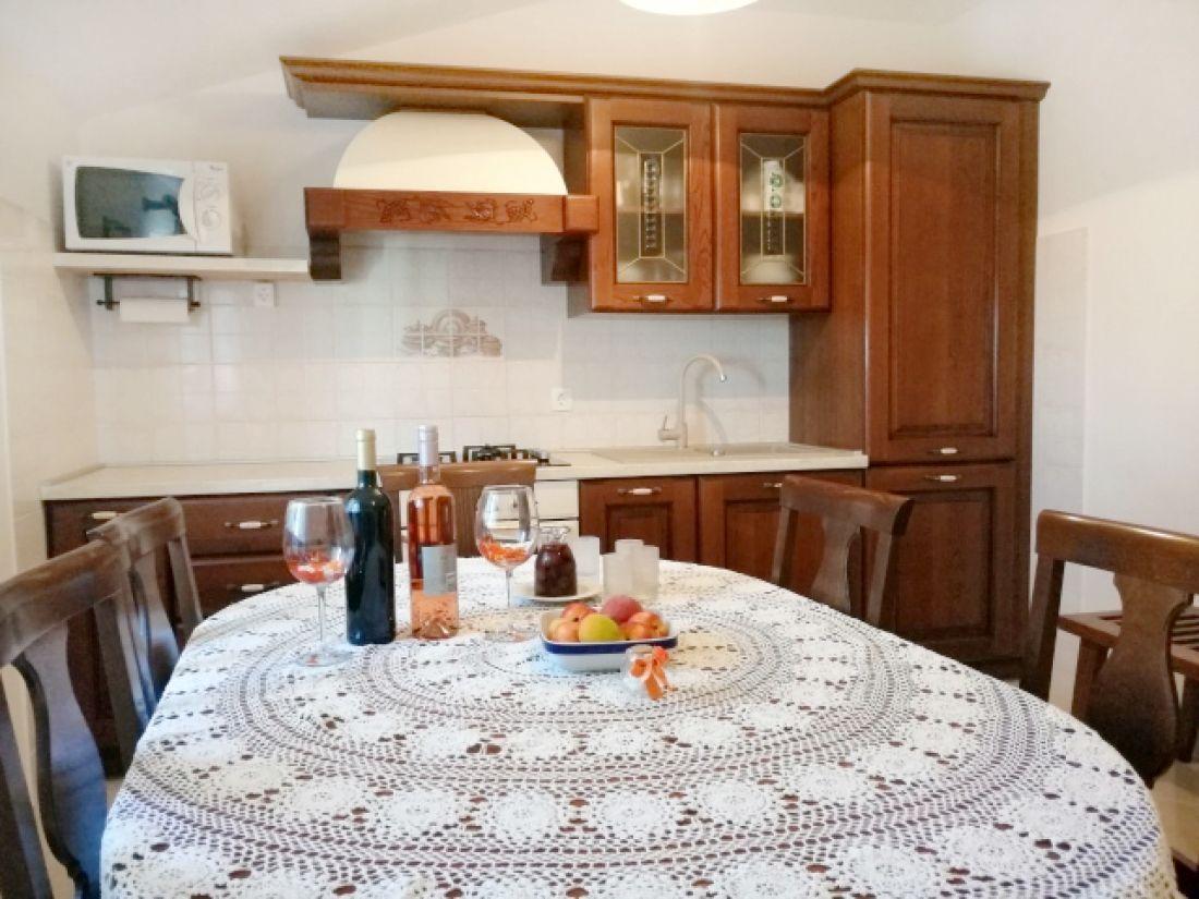 The flat has two bedrooms, one with a double bed and a single bed and the second with two single beds. The complete bathroom has a shower cubicle, washing machine, bidet, washbasin with mirror and hairdryer. The living area with kitchen is equipped with hob, microwave, filter coffee machine, kettle, fridge, dining table with chairs, sofa bed for two people, flat screen satellite TV, air conditioning and Wi-Fi connection - free Wi-Fi. The private terrace at the entrance is furnished with a table and chairs and a barbecue.