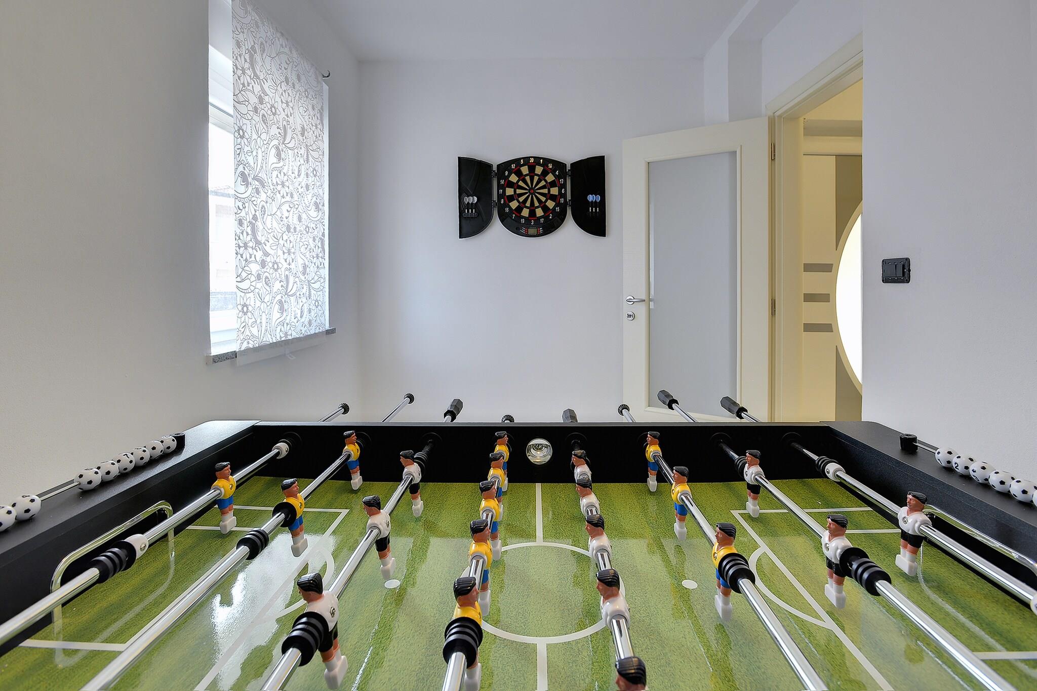 Ground floor: (Living room(TV(satellite), dining table, seating area, air conditioning), open kitchen(toaster, cooker(4 ring stoves), coffee machine, oven, dishwasher, fridge-freezer), bedroom(double bed(180 x 200 cm)), bathroom(shower, washbasin, toilet)) On the 1st floor: (bedroom(double bed(180 x 200 cm)), bedroom(2x single bed(90 x 200 cm)), bedroom(2x single bed(90 x 200 cm)), bathroom(shower, washbasin, toilet), balcony) shower(outside), terrace, garden(private, fenced), garden furniture, BBQ, parking, swimming pool(private, 7 x 4 m.), table football, darts, bicycles available, children's bed, ironing board, iron, hairdryer